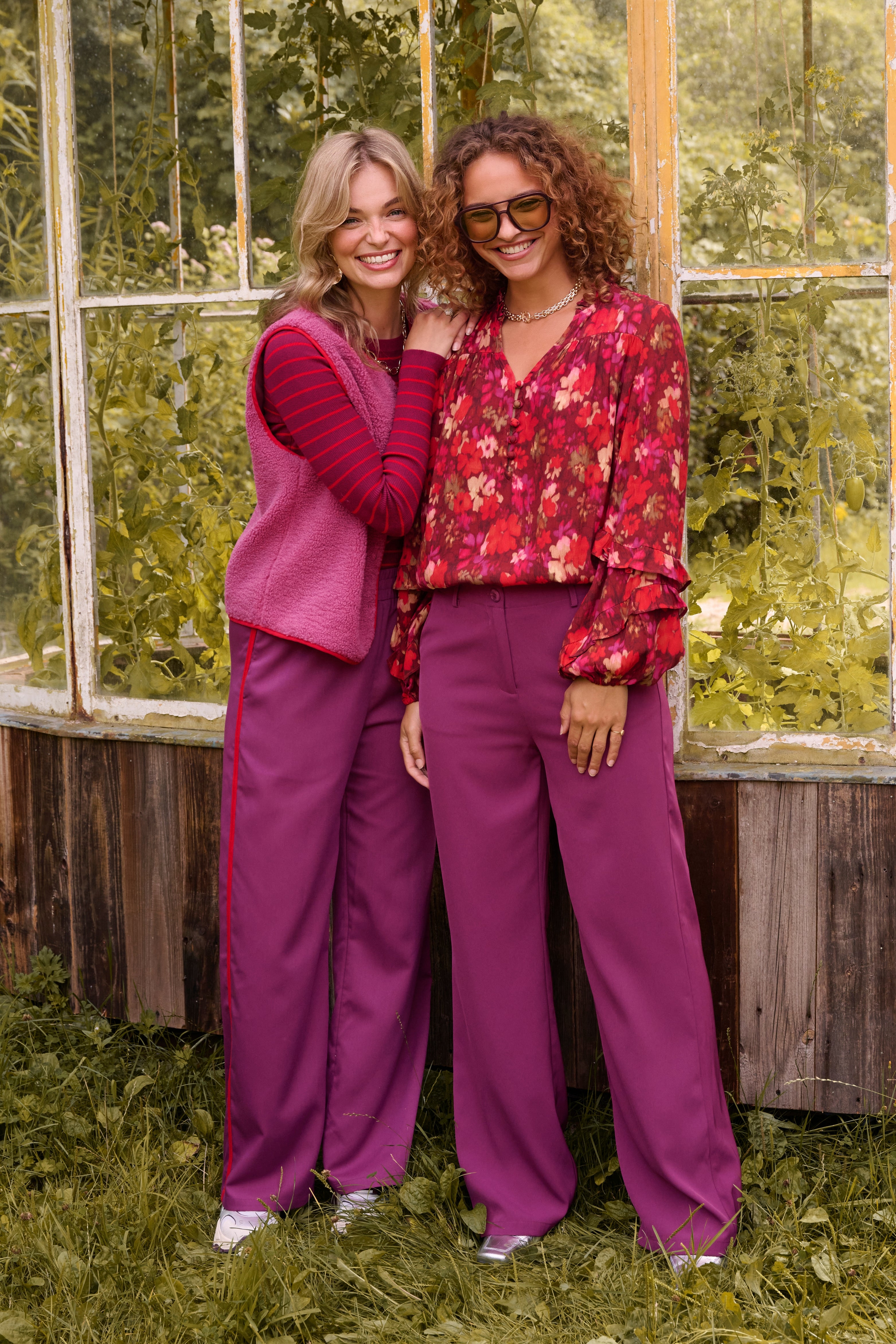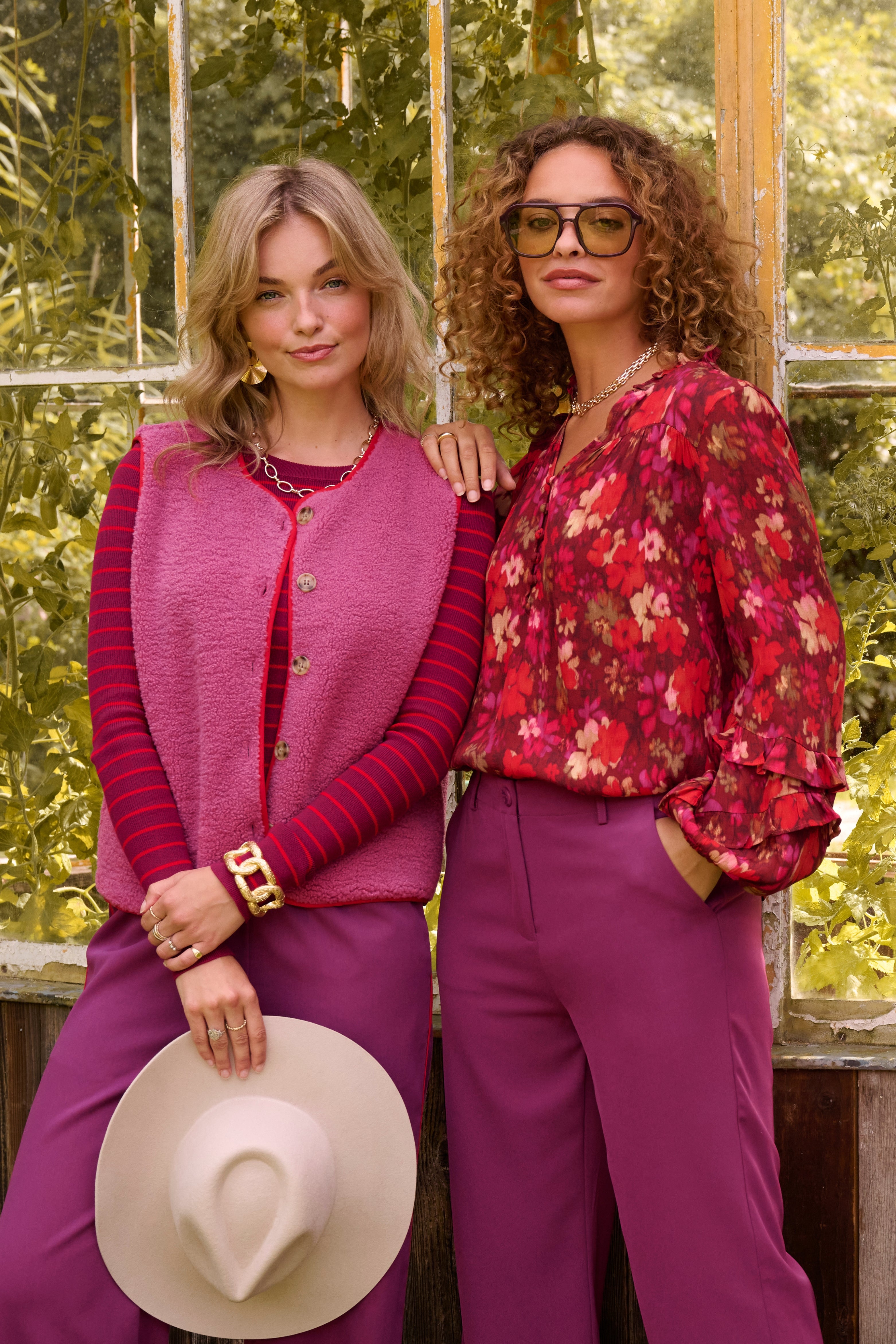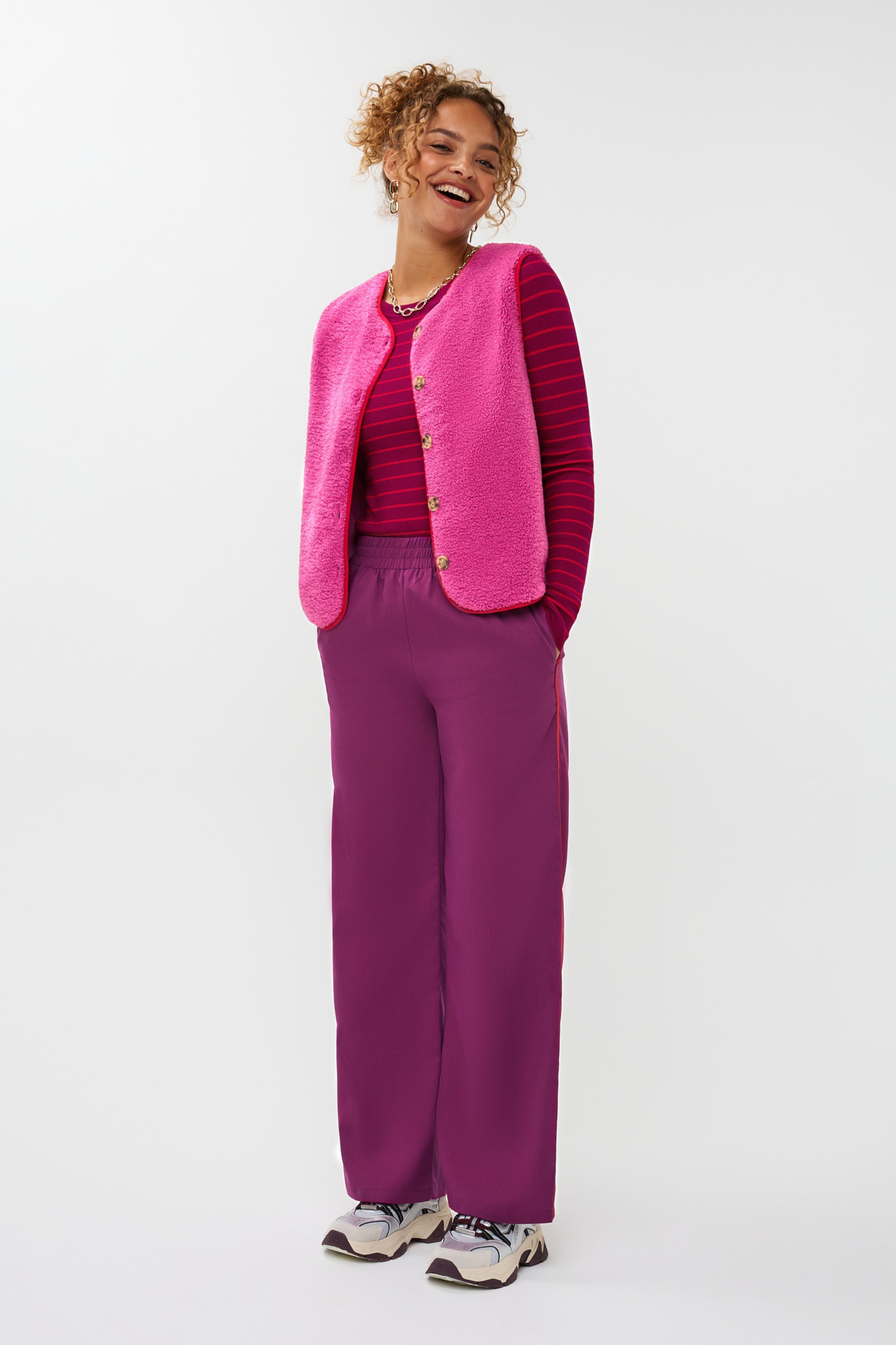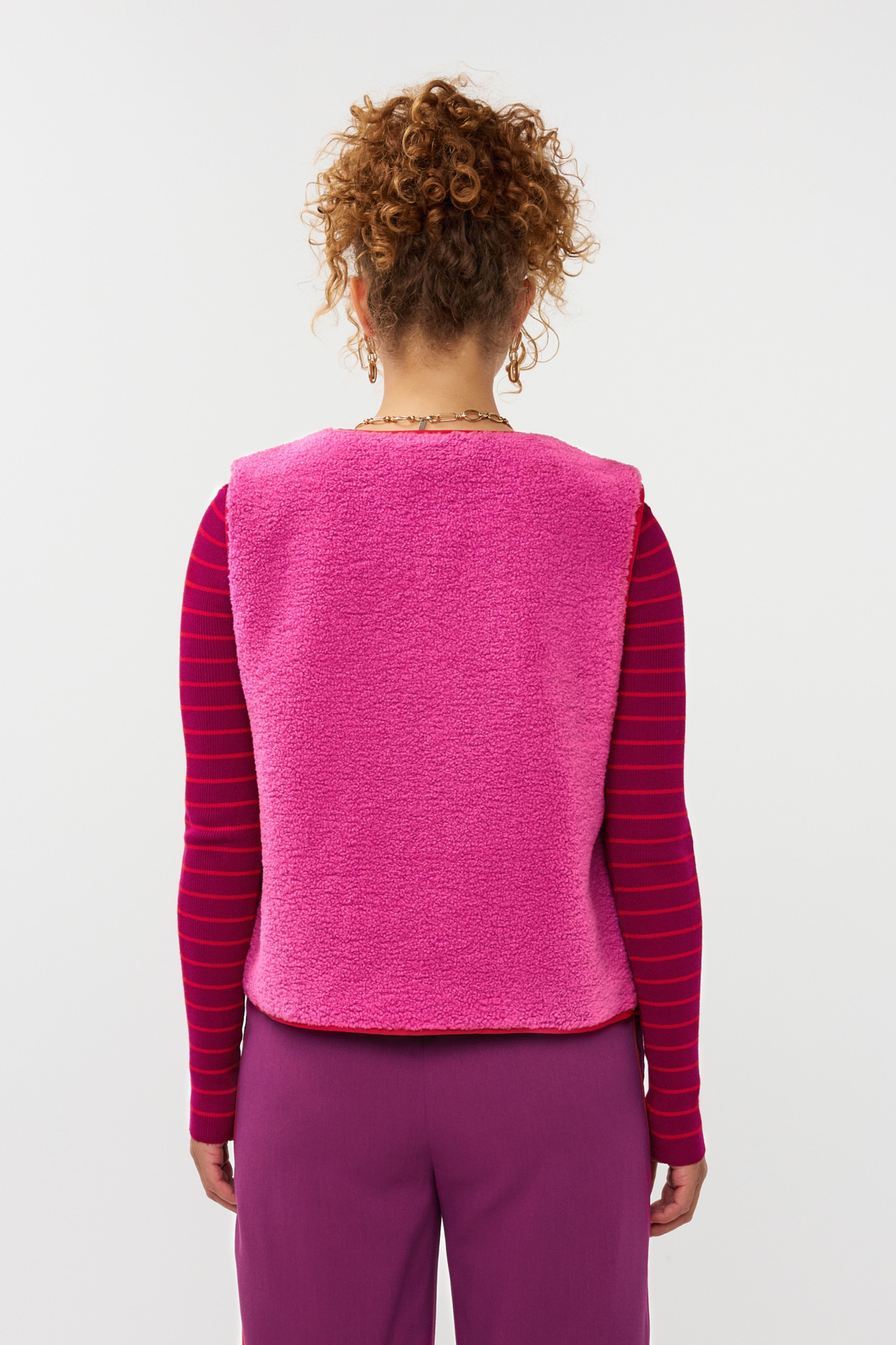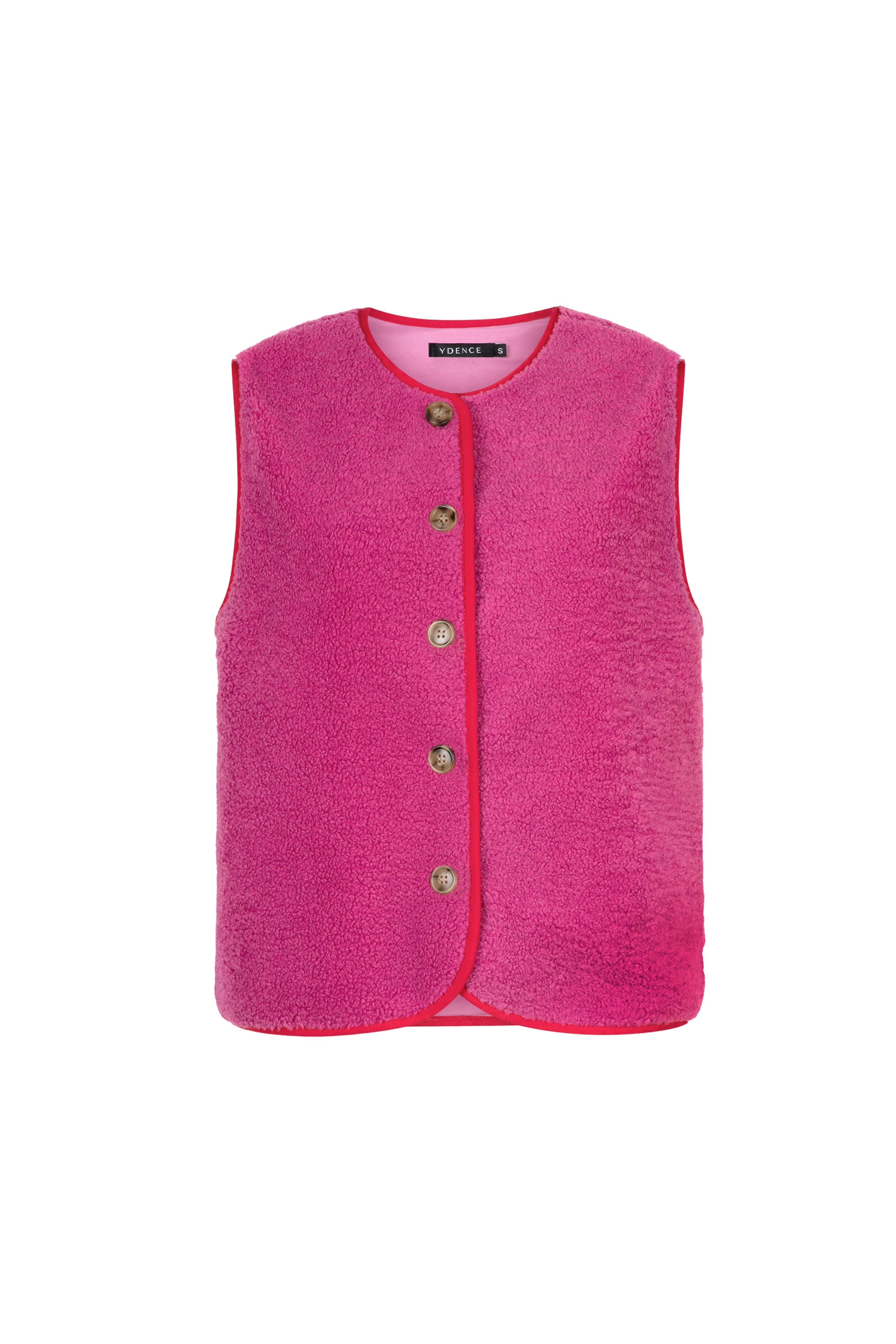 Het Gilet Puck Fuchsia Purple van Ydence is een zacht teddy gilet in een levendige paarse tint. Uitgevoerd met een ronde hals, contrasterende bies en knoopsluiting voor een speels, maar stijlvol effect. Perfect voor laagjeslooks en eenvoudig te combineren over jurken, blouses of truien.