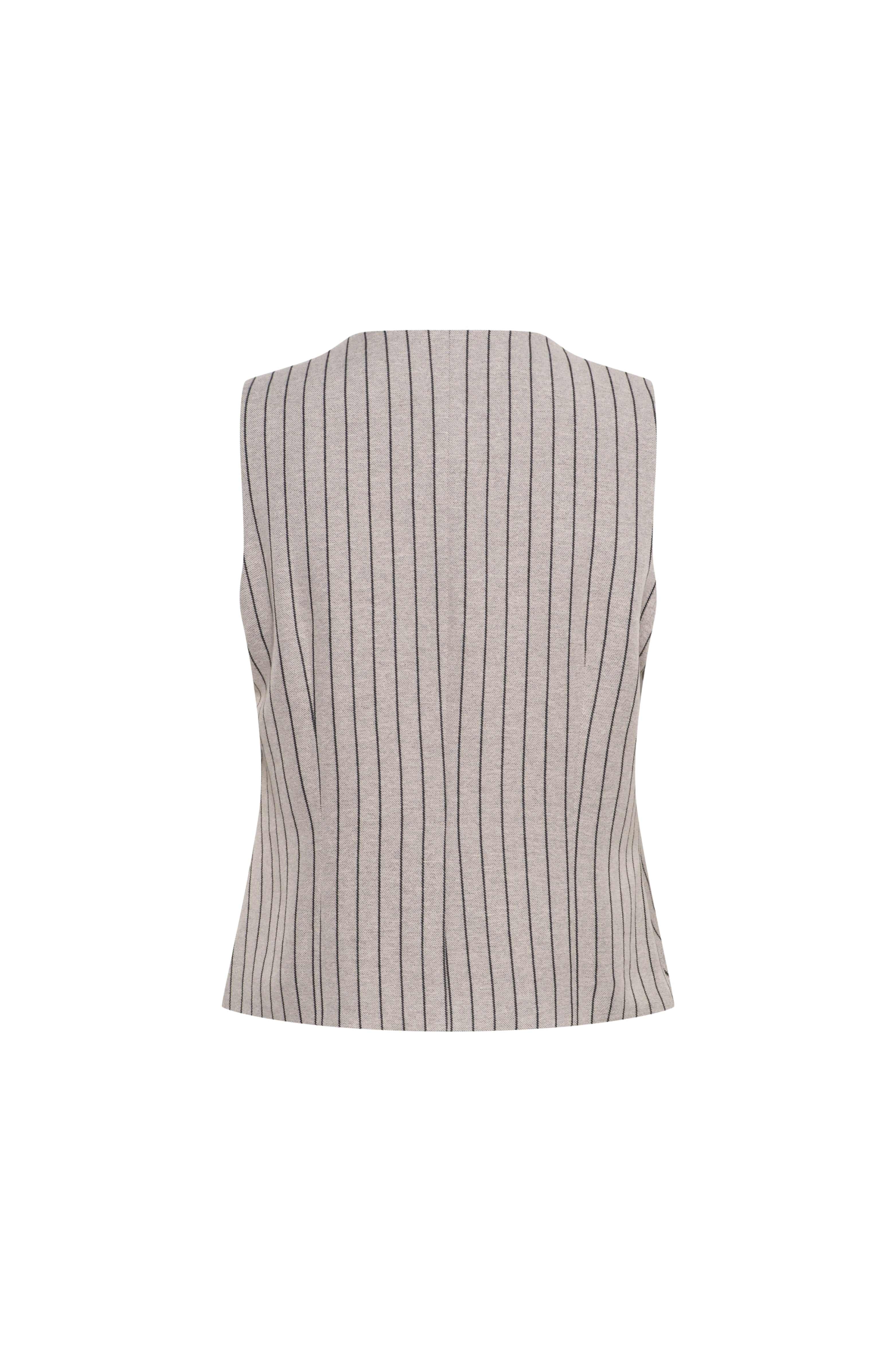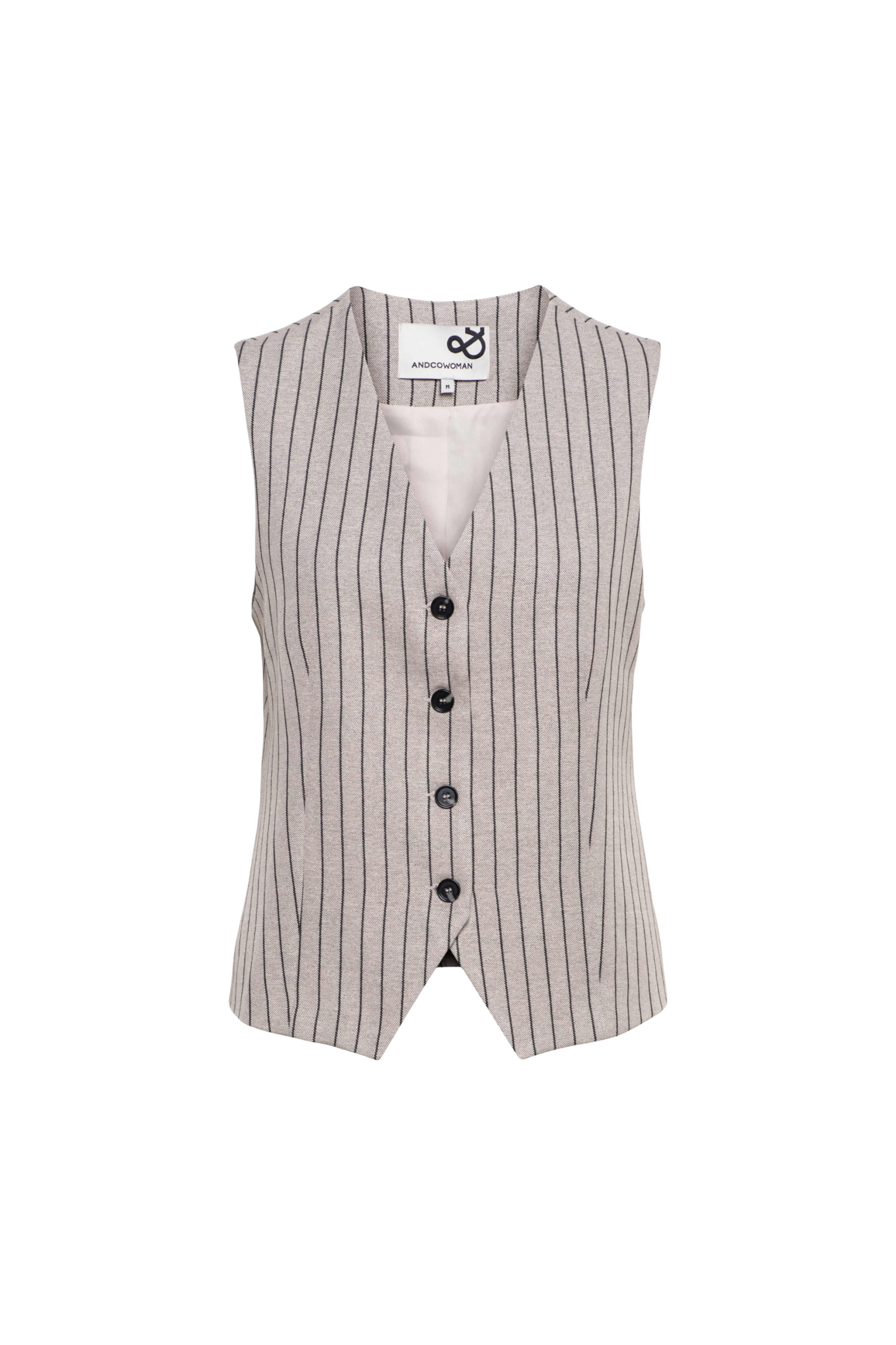 Het Gilet Shelly Sand Multi van &CoWoman is een tijdloos en stijlvol item met een verfijnde krijtstreep in zand- en zwarttinten. De klassieke V-hals, knoopsluiting en getailleerde pasvorm geven een elegante en moderne uitstraling. Perfect om los te dragen of als onderdeel van een gelaagde look voor een trendy twist.