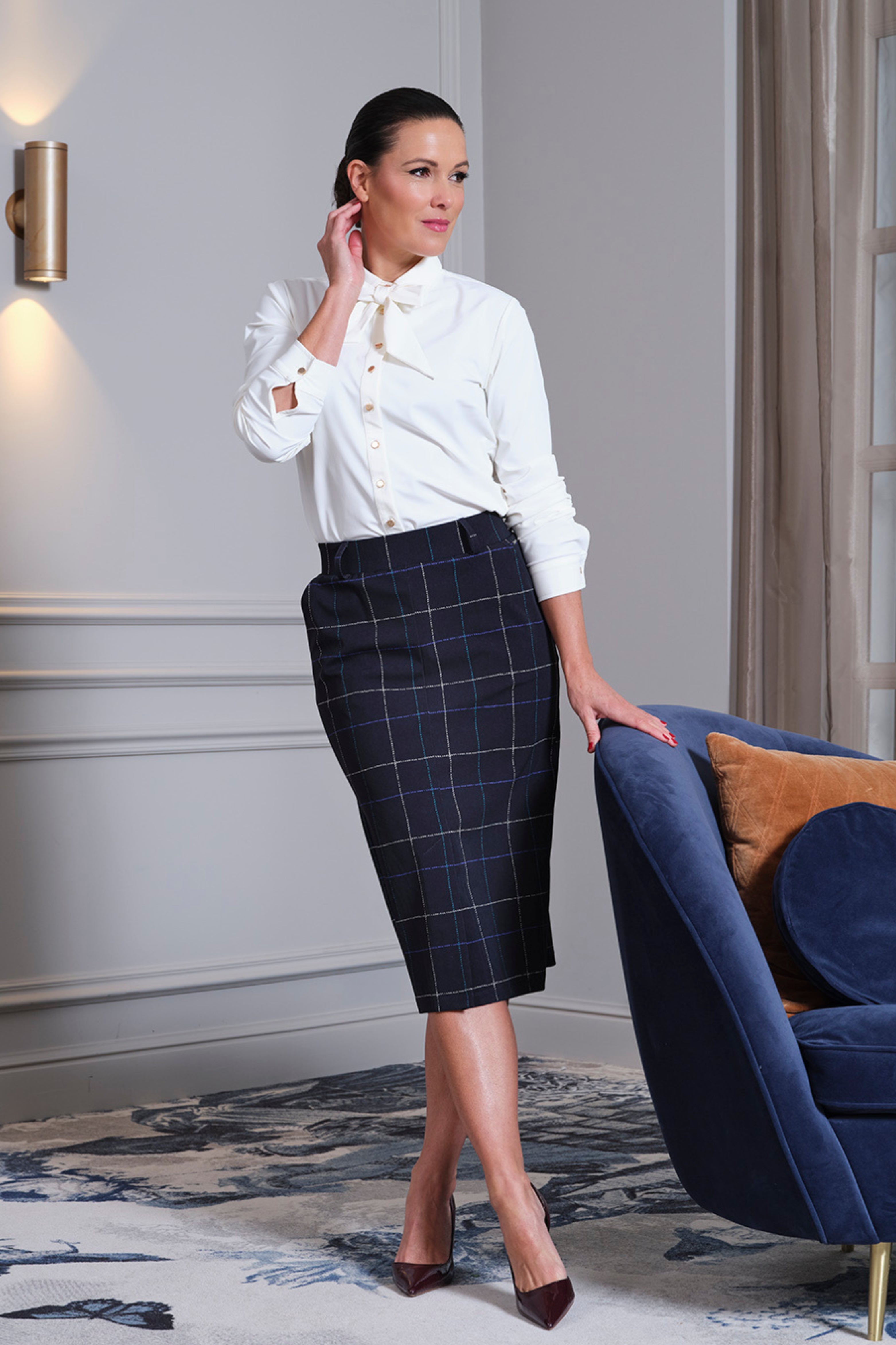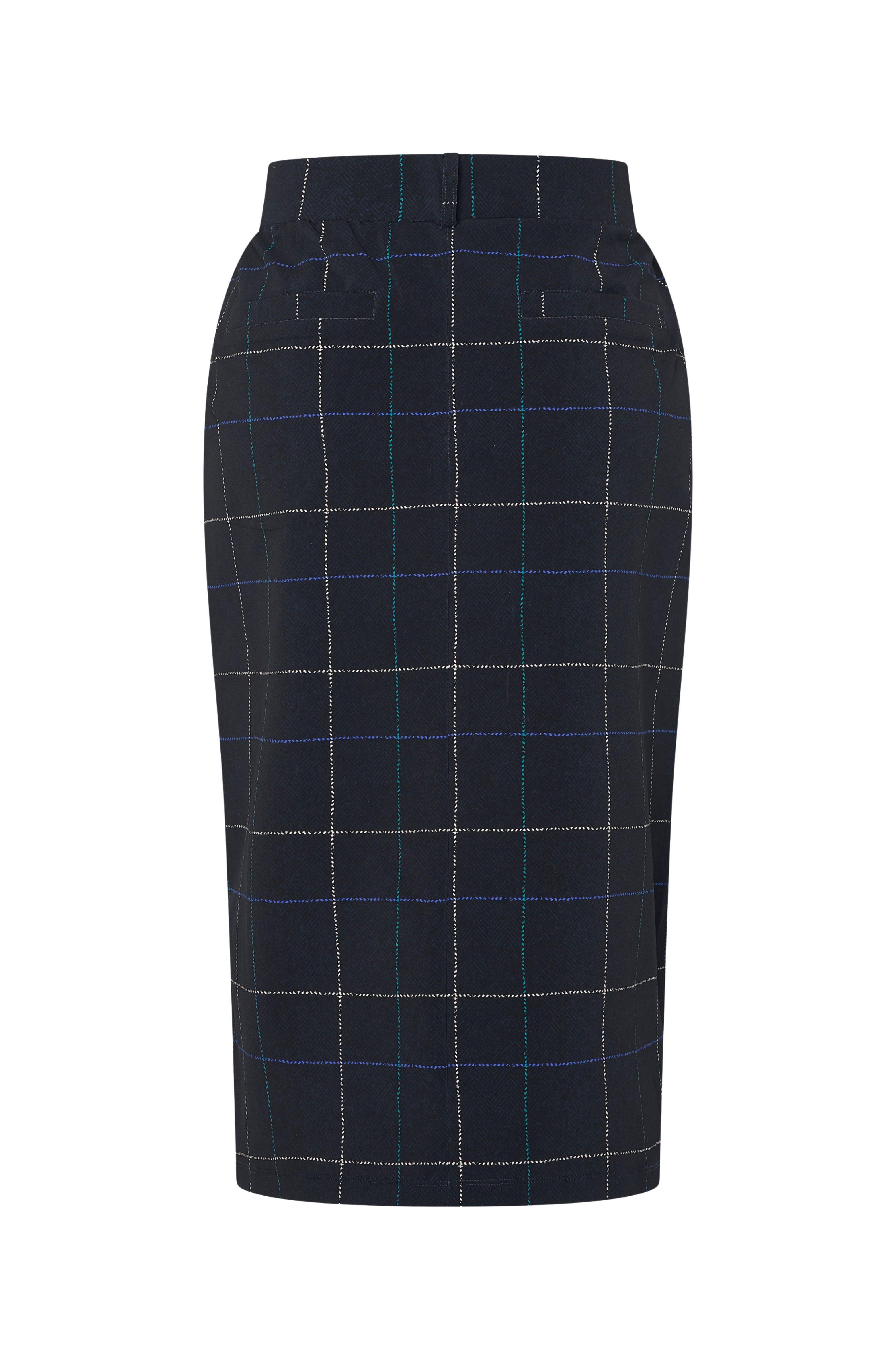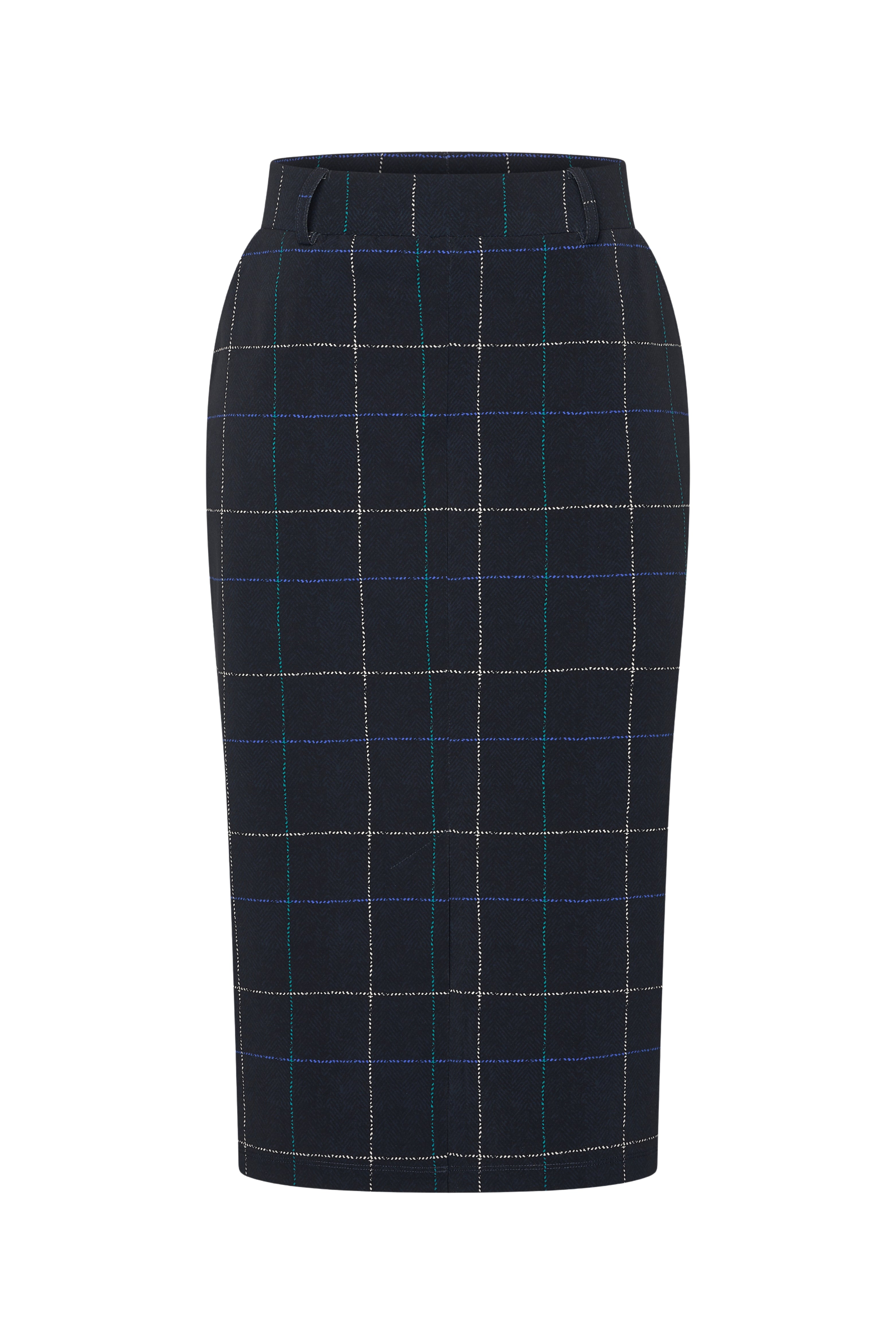De Heavy Travel Rok Herringbone Print Dark Blue Petrol van Mi Piace is een comfortabele kokerrok in stevige stretch, ideaal voor elke dag. Ruitprint met subtiele visgraat en vormvaste kwaliteit. Perfect voor kantoor en city-chic looks.