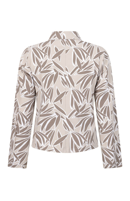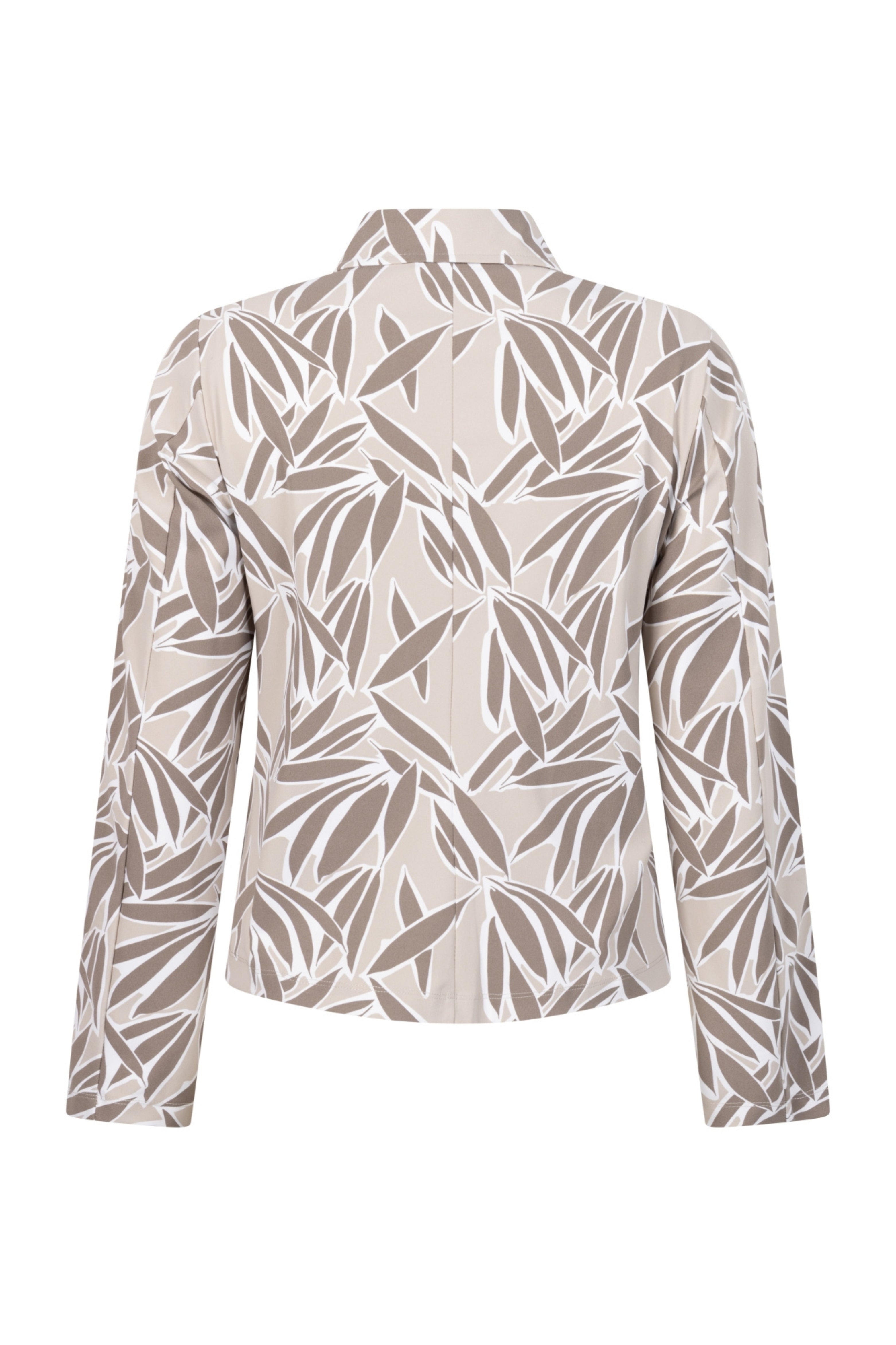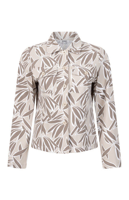 Elegant jack met moderne sand-taupe bladprint, knoopsluiting en borstzakken. Comfortabel en veelzijdig voor een stijlvolle casual-chique look!