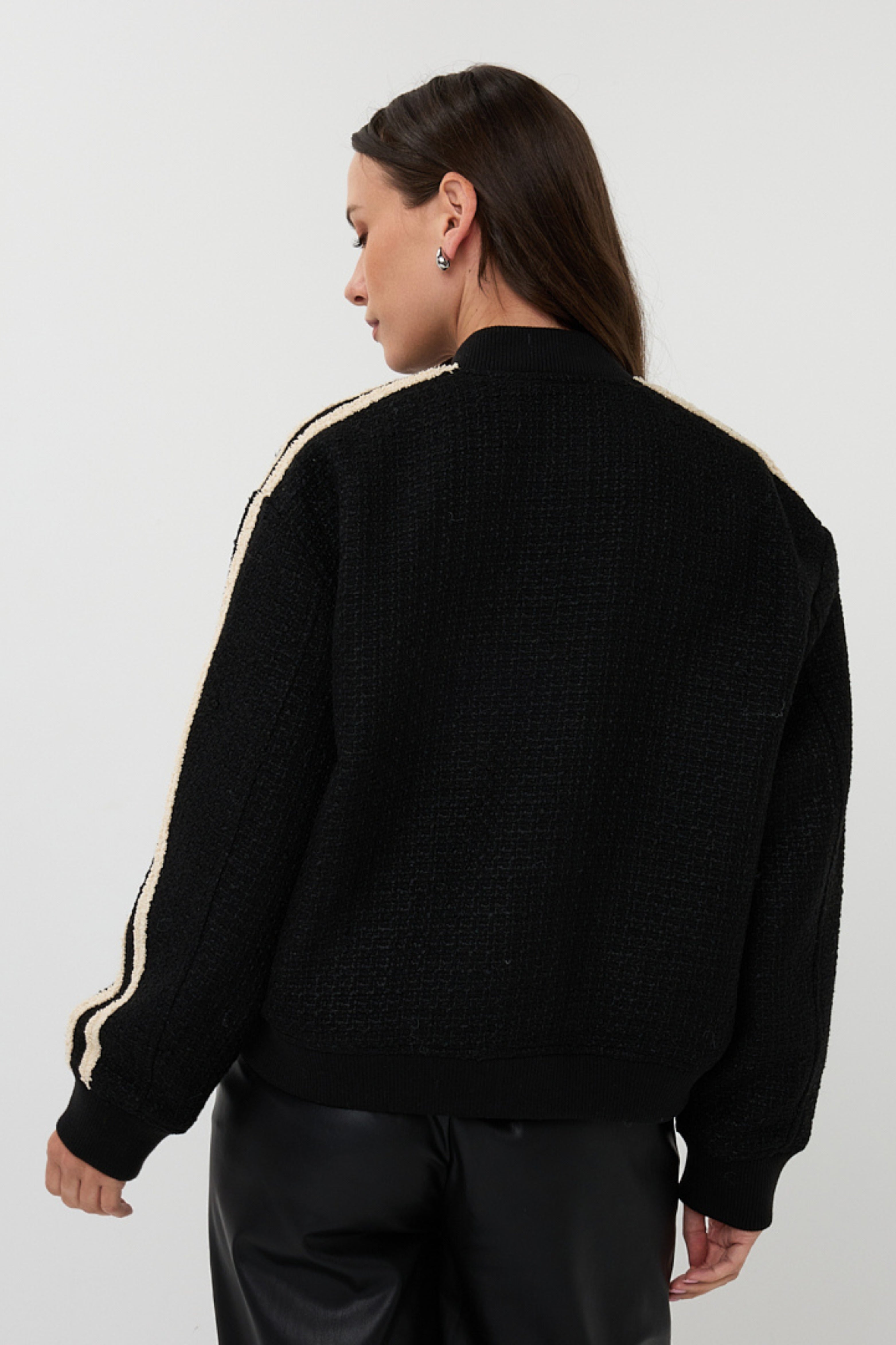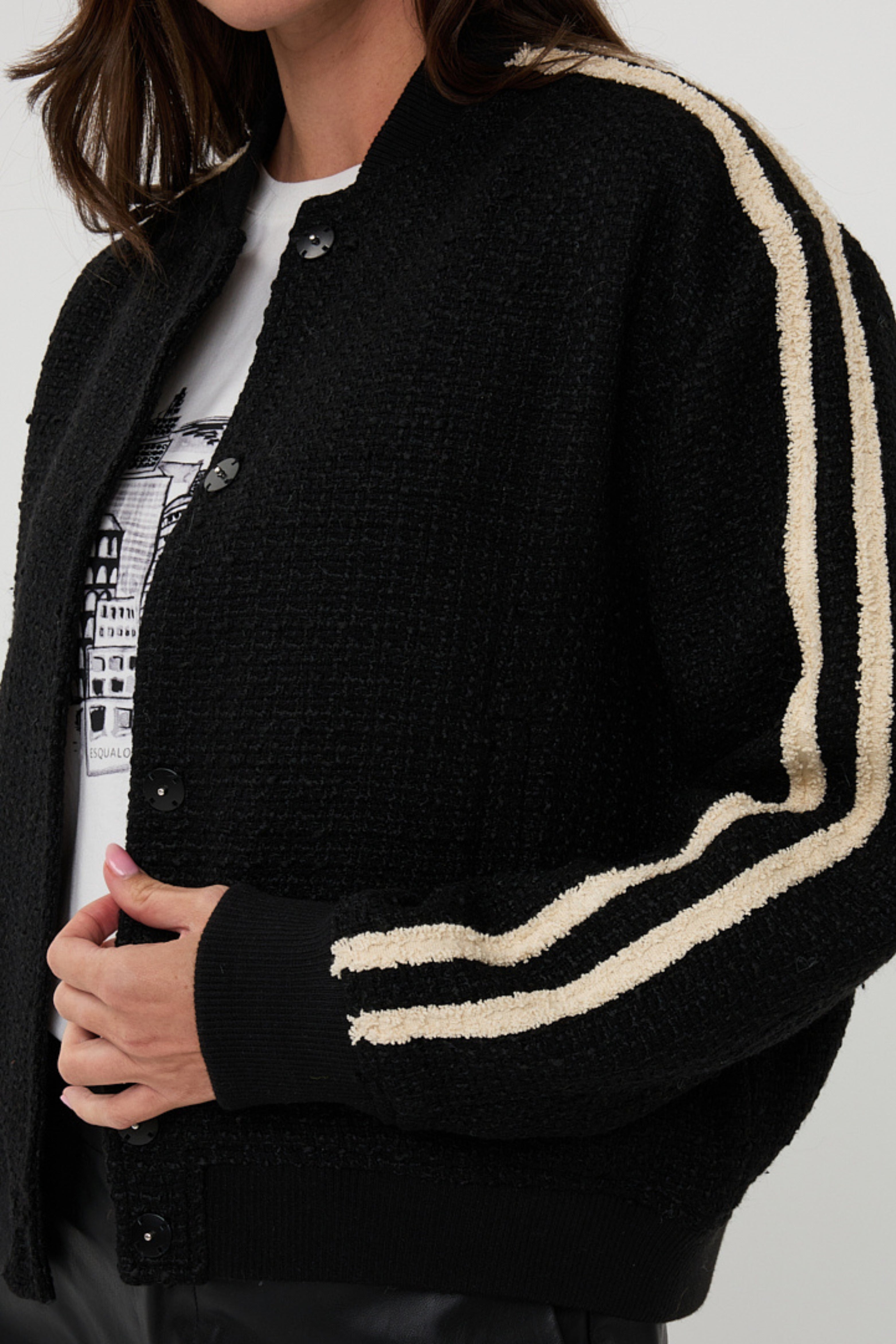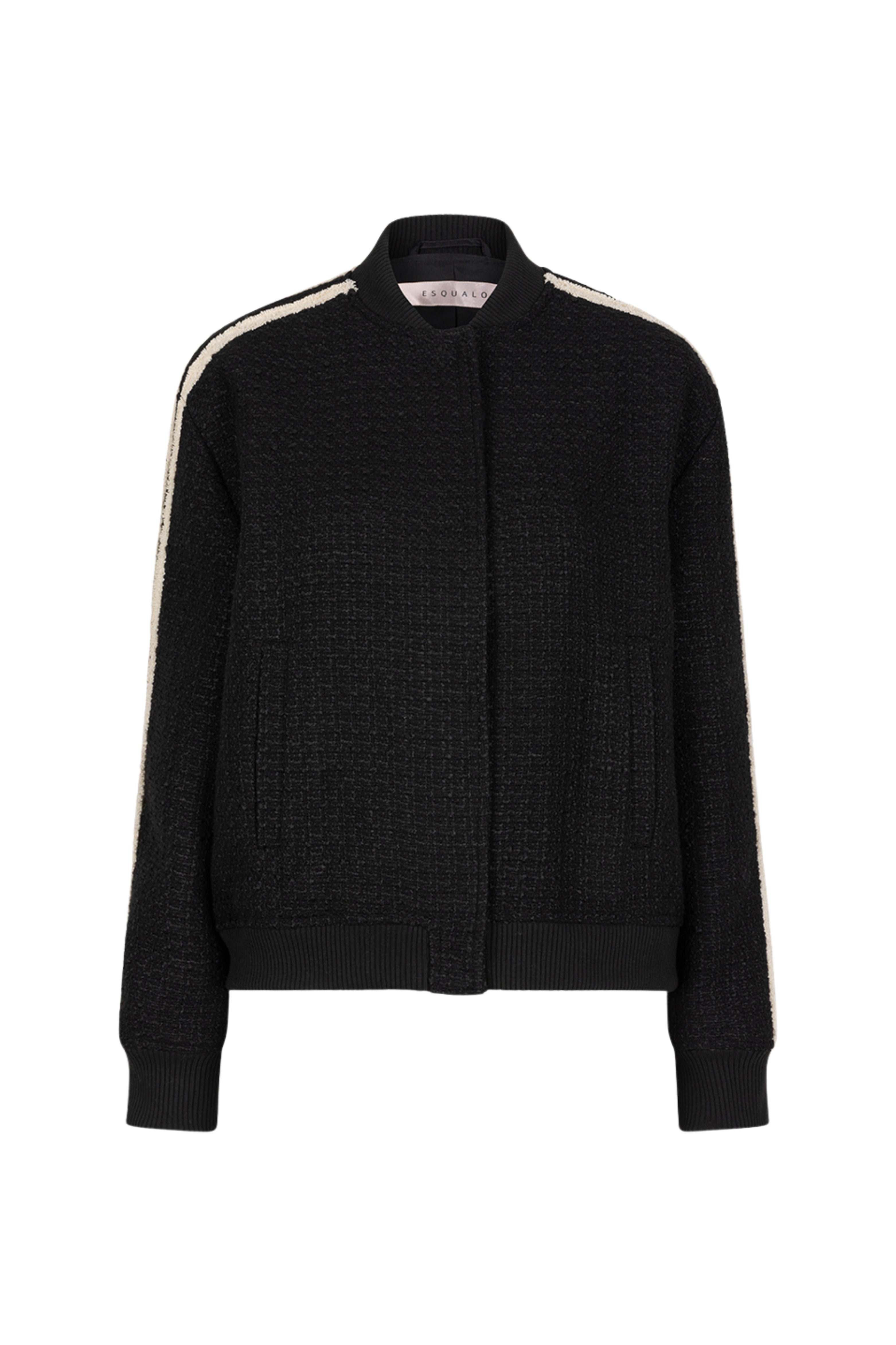 Jacket Bomber Black van EsQualo combineert sportieve details met een stijlvolle uitstraling. De structuur en contrasterende strepen op de mouwen geven dit jasje een moderne, eigentijdse look.