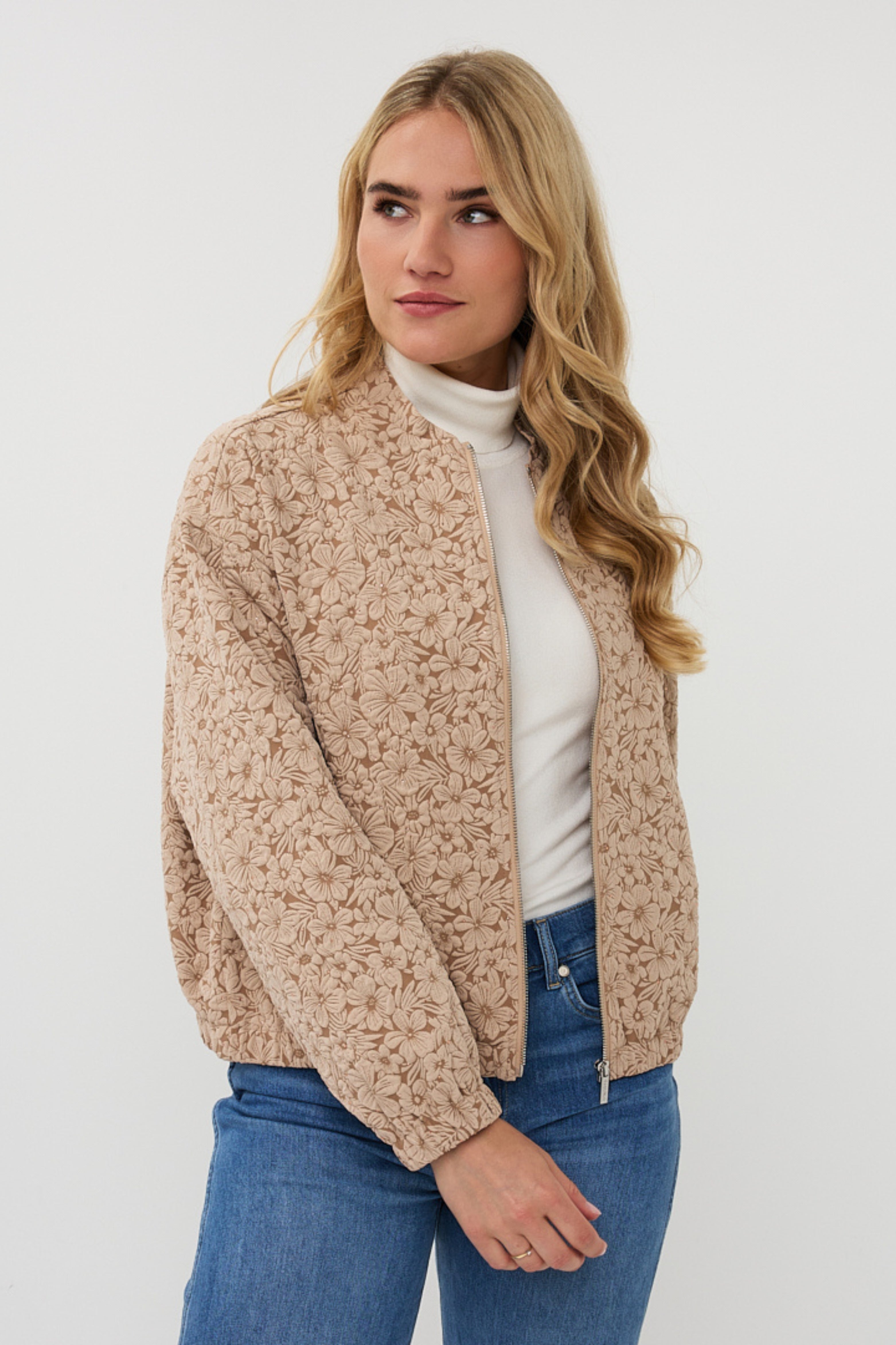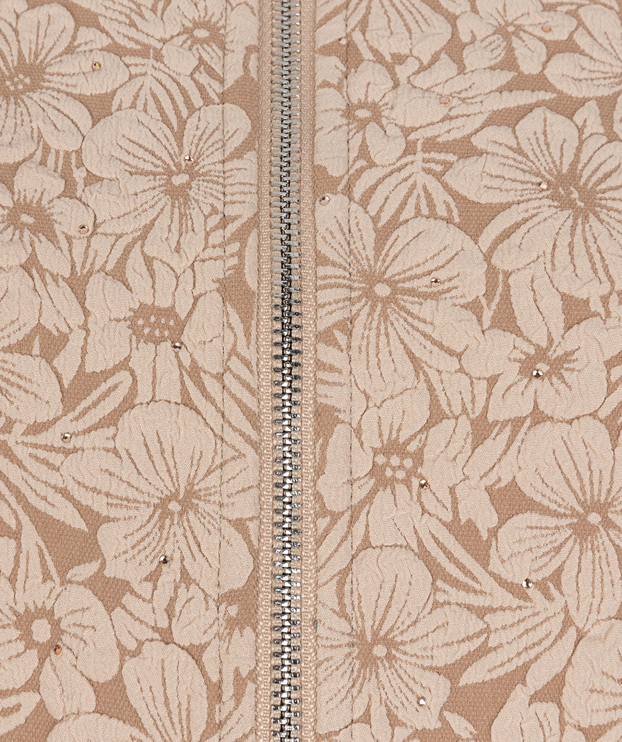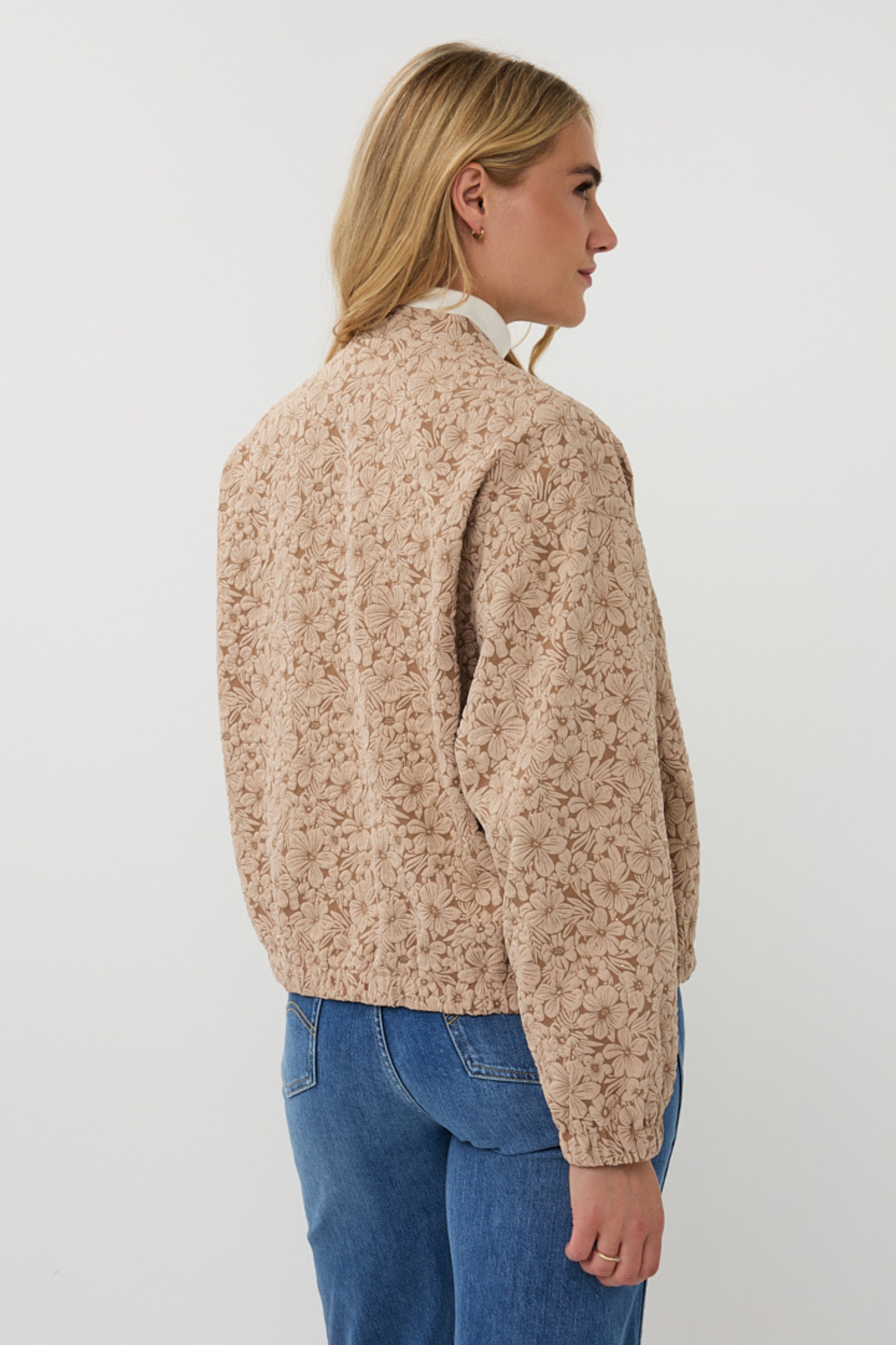 Vrouwelijk, zacht en stijlvol: deze bomberjack met 3D-bloemenstructuur in zandkleur is een must-have. De subtiele florale textuur geeft een luxe uitstraling. Perfect voor een elegante, casual look met een unieke twist.