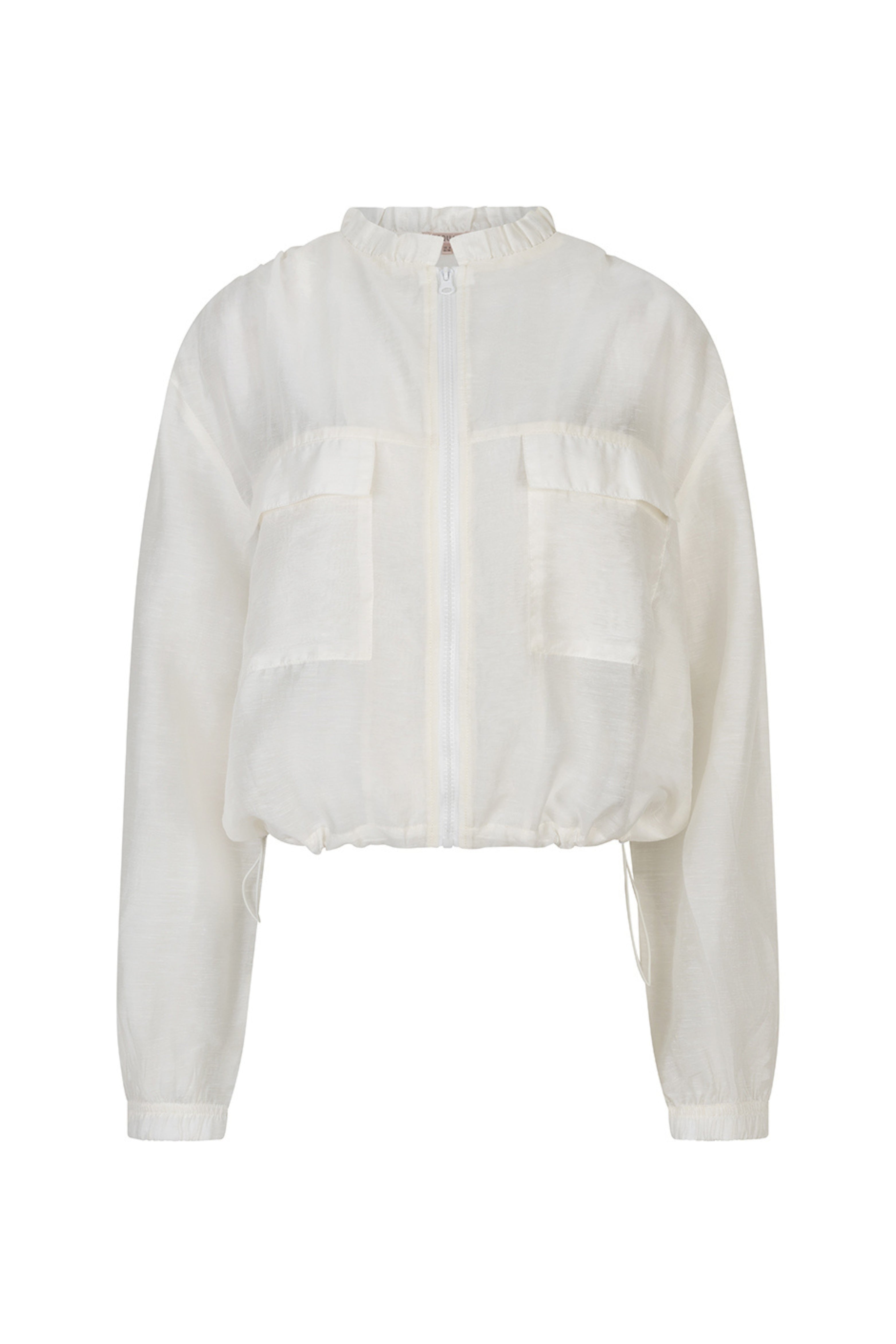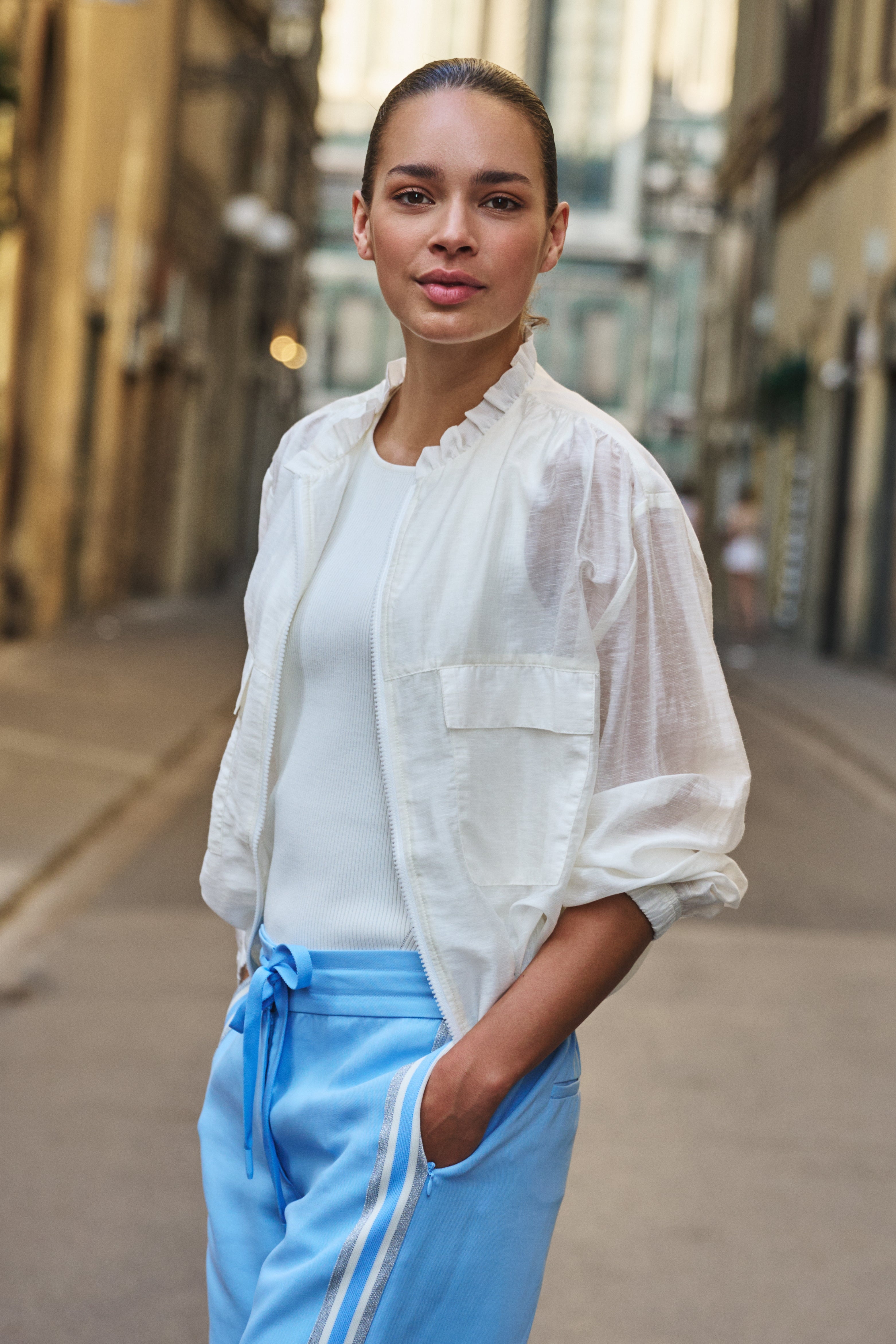 De Jacket Bomber Offwhite van Esqualo is een licht, luchtig bomberjack met hoge ronde hals en lange mouwen. Ritssluiting en verstelbaar koord in de zoom voor een vrouwelijk cropped silhouet. Perfect voor lente- en zomerlagen.