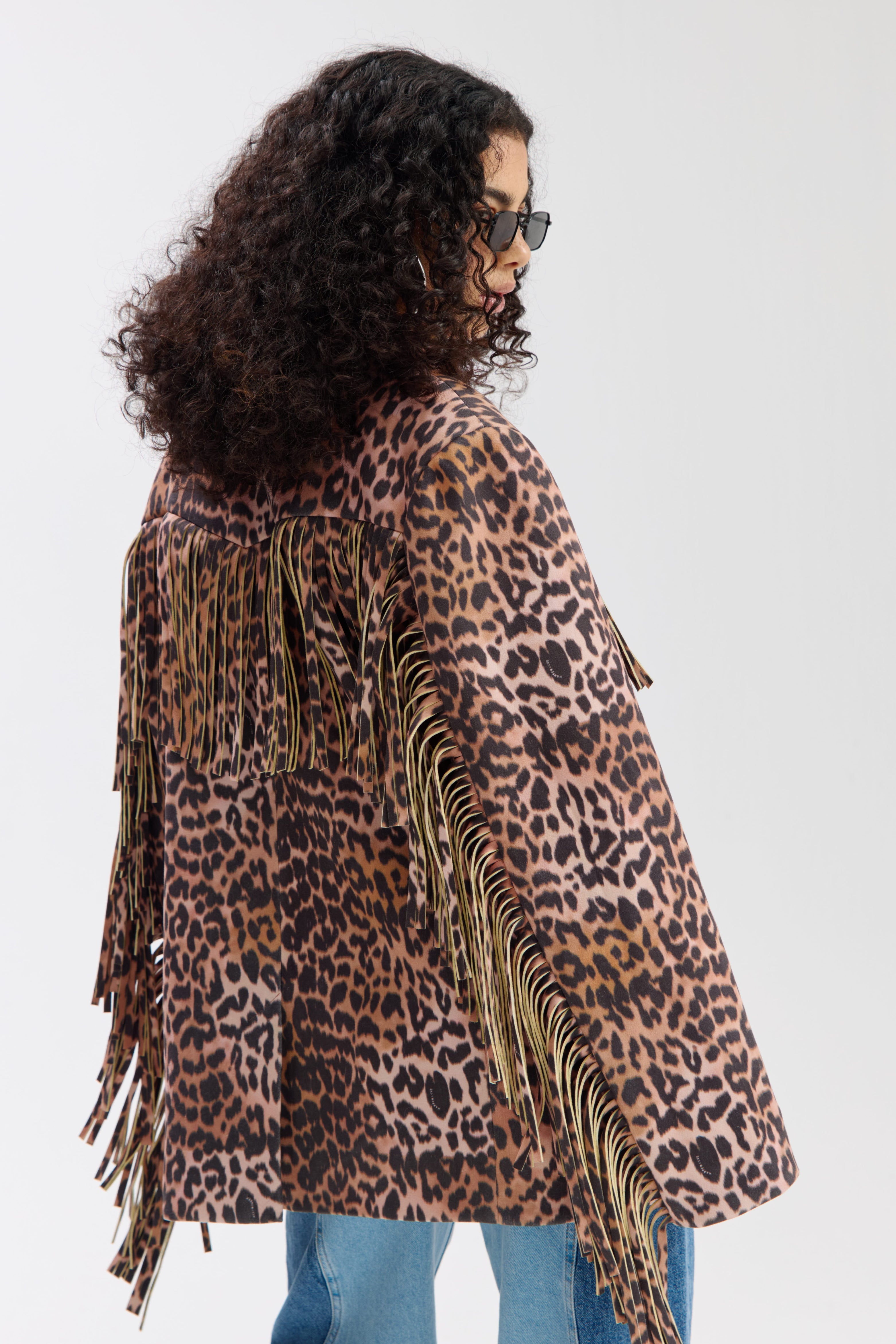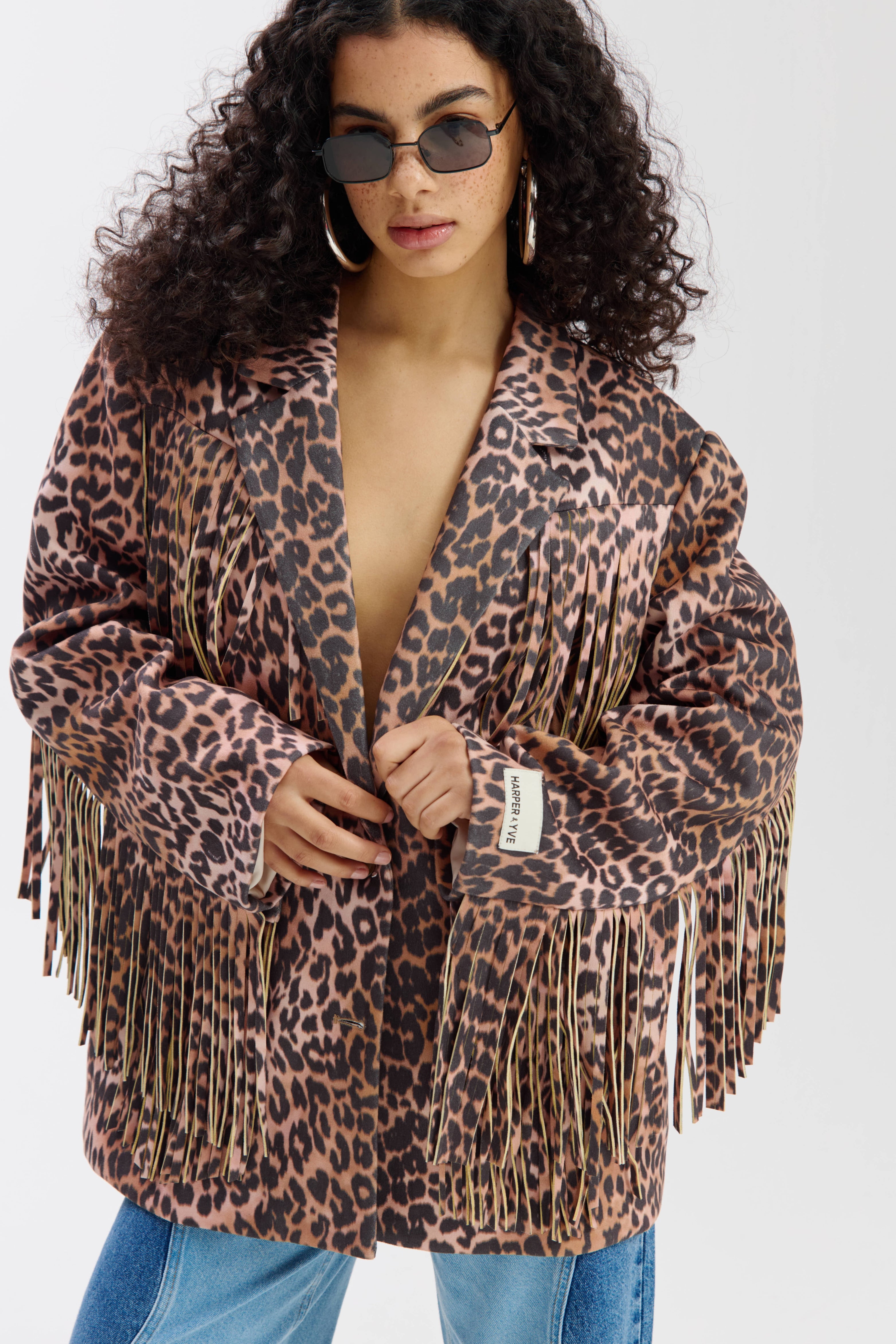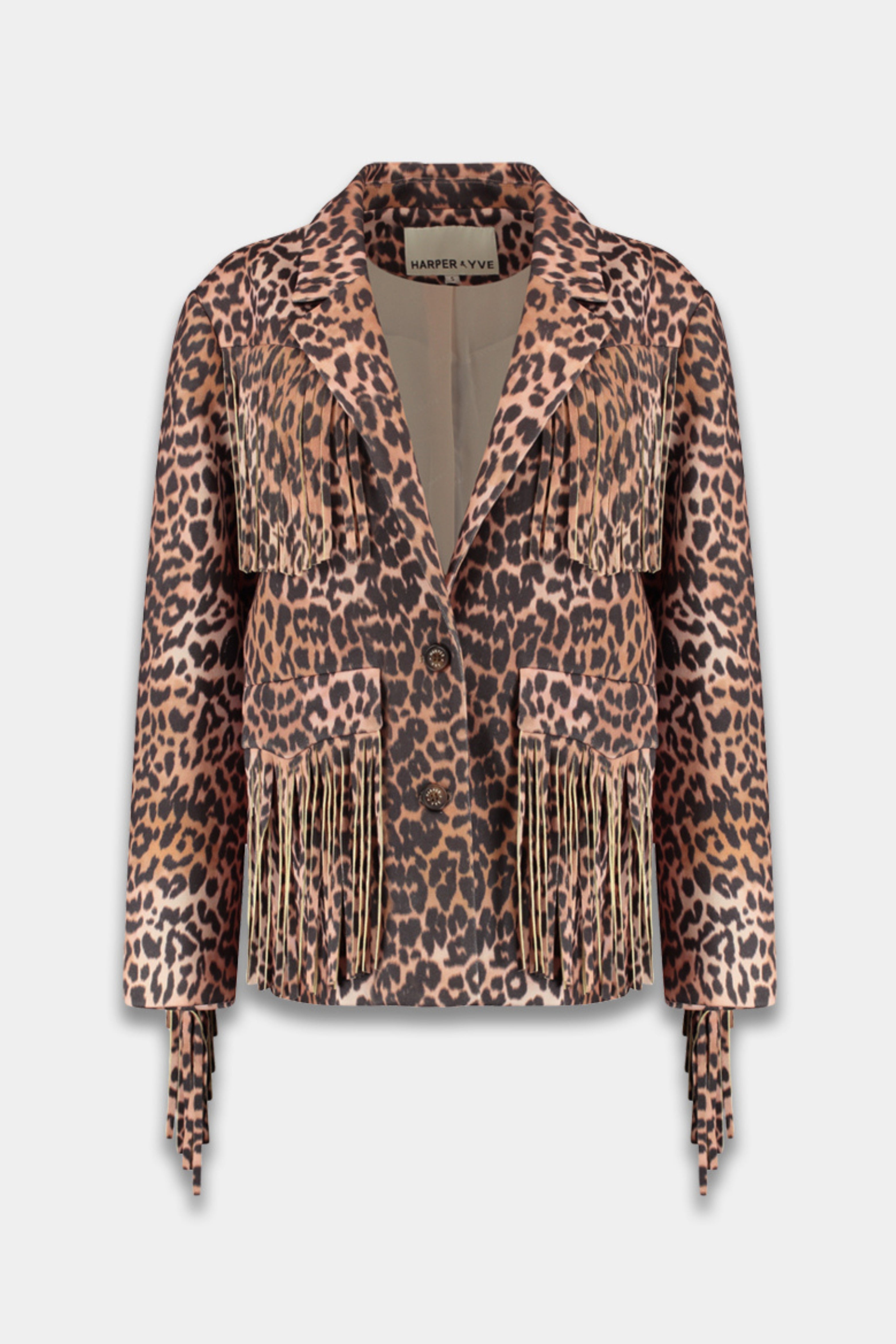 De Jacket Casey Lexie Leopard van Harper & Yve is een opvallend jasje met leopardprint en speelse franjes langs borst, rug en mouwen. De stoere details en opvallende print geven het item een modieuze uitstraling.