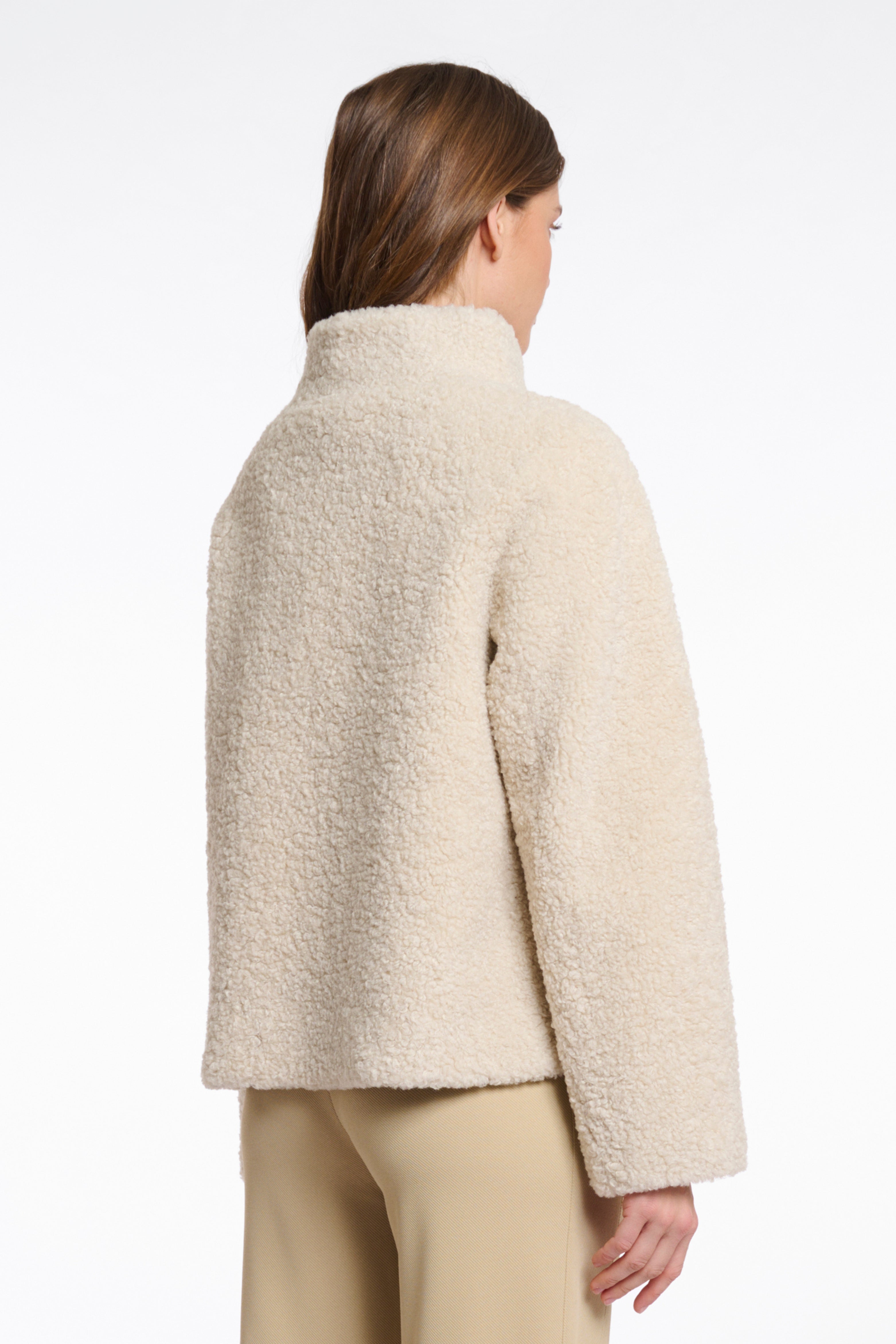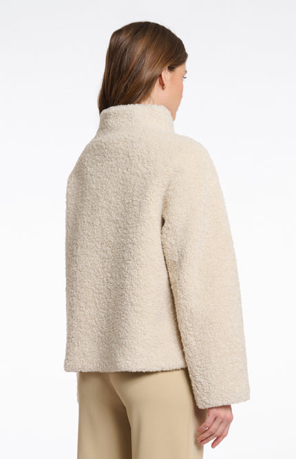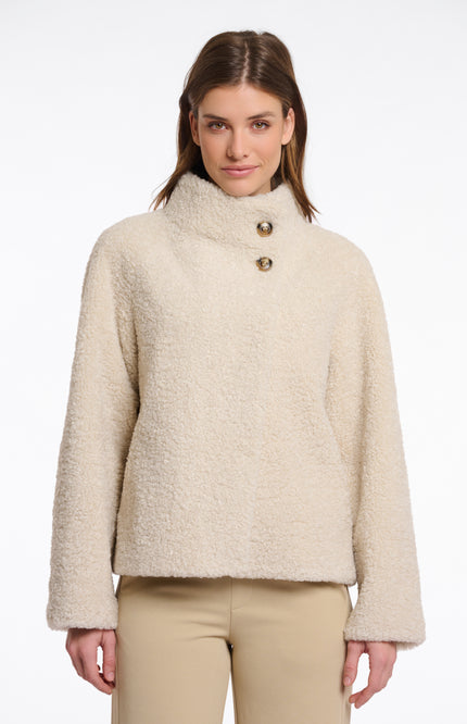 Jacket Denu van Rino & Pelle in de kleur Birch is een warme teddy jas met een hoge kraag en asymmetrische knoopsluiting. De rechte pasvorm en zachte textuur maken het een comfortabel en stijlvol must-have item voor de koudere dagen.