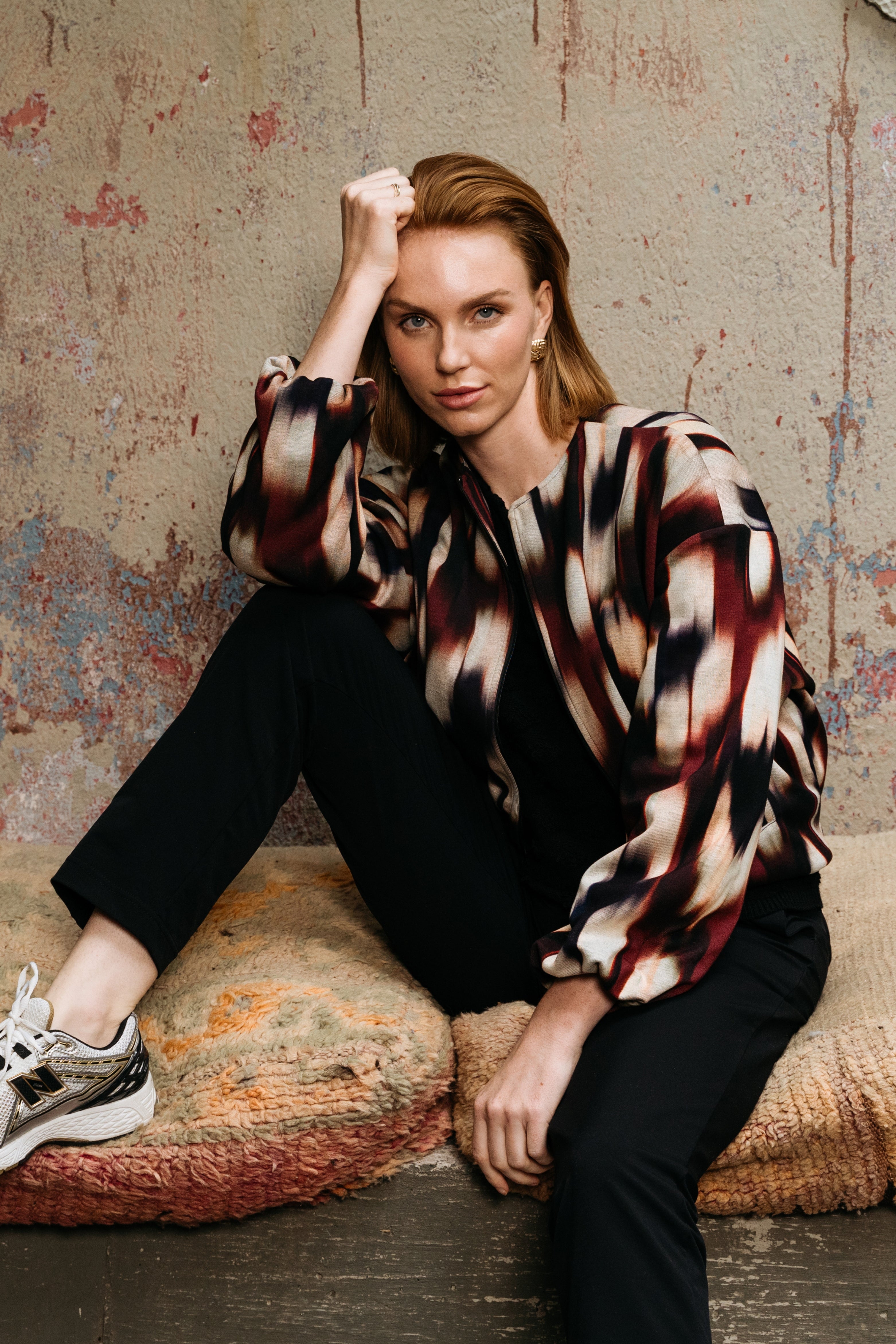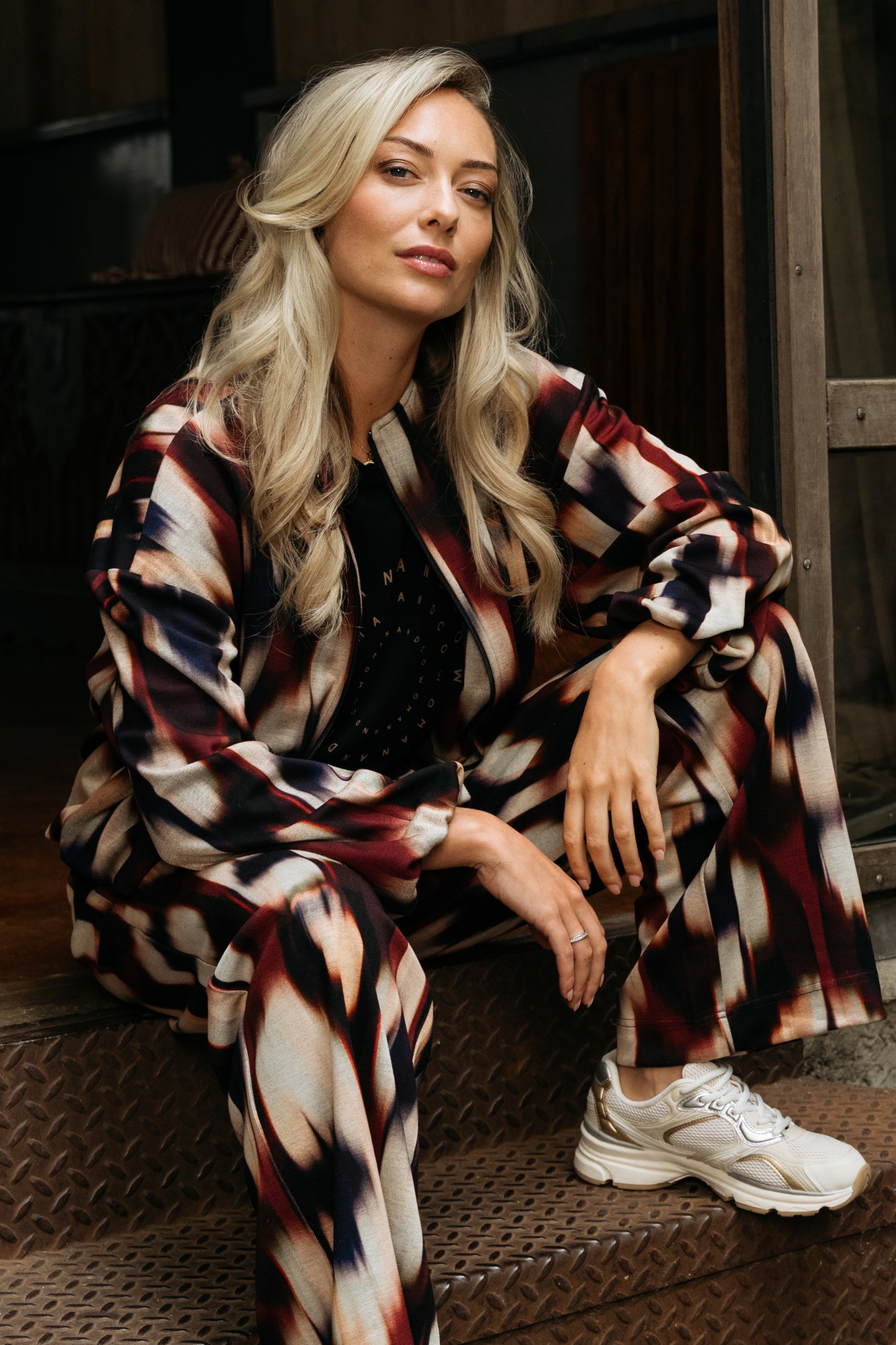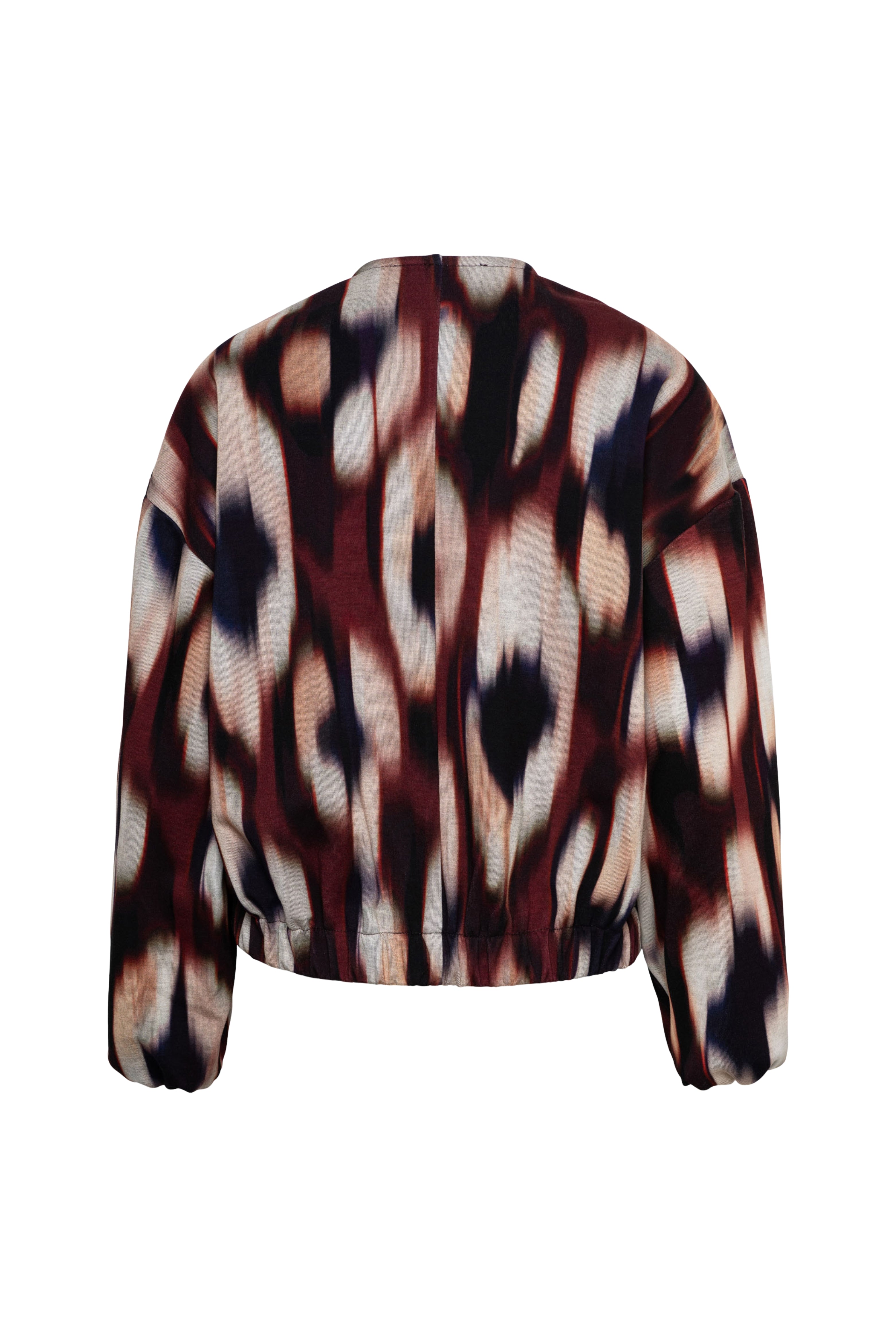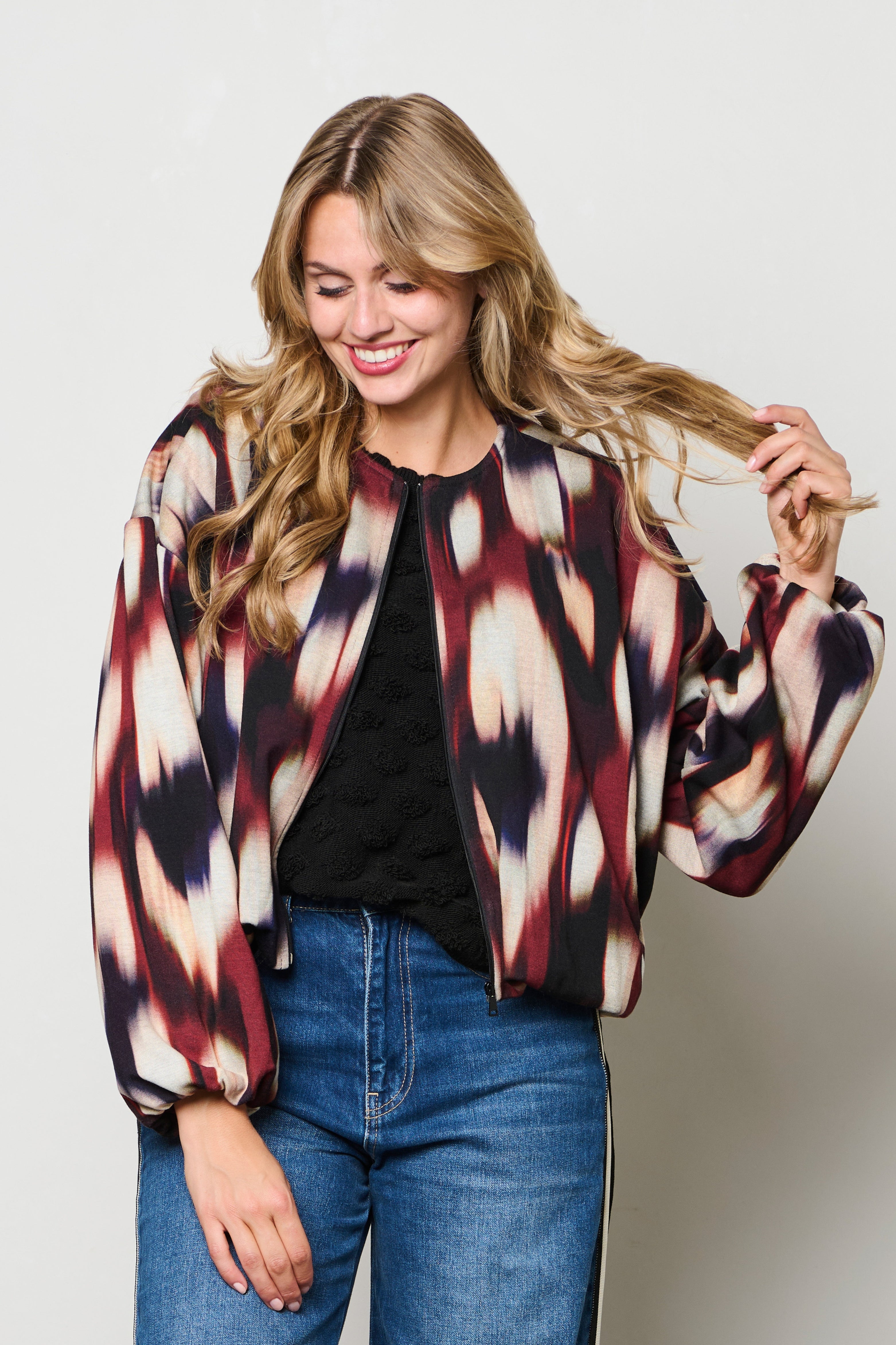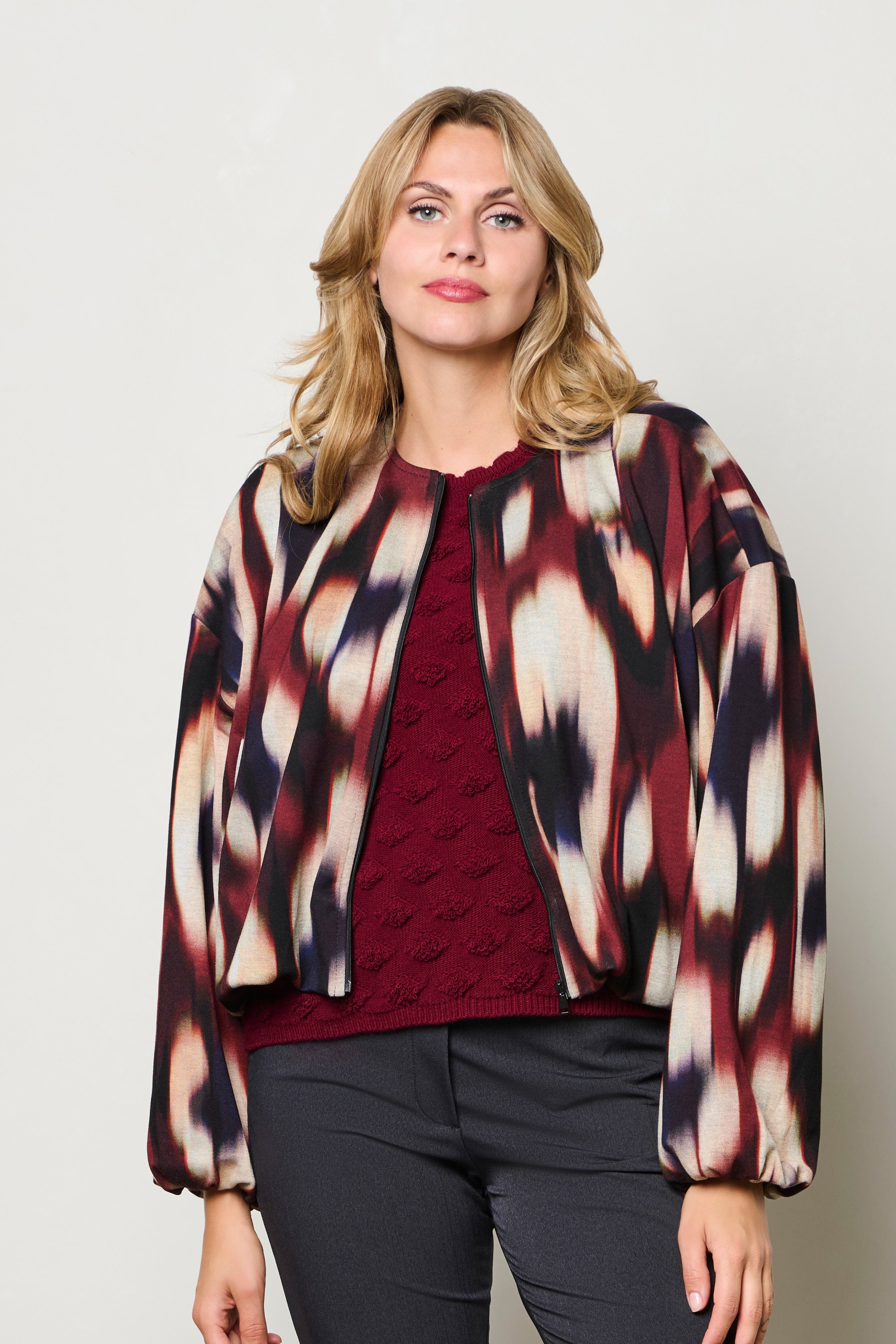 Het Jacket Diede Faded Big Wine Red Multi van &Co Woman is een stijlvol bomberjack met een artistieke print. Dankzij de soepele stof en elastische boorden is dit jasje perfect voor een casual én geklede look.