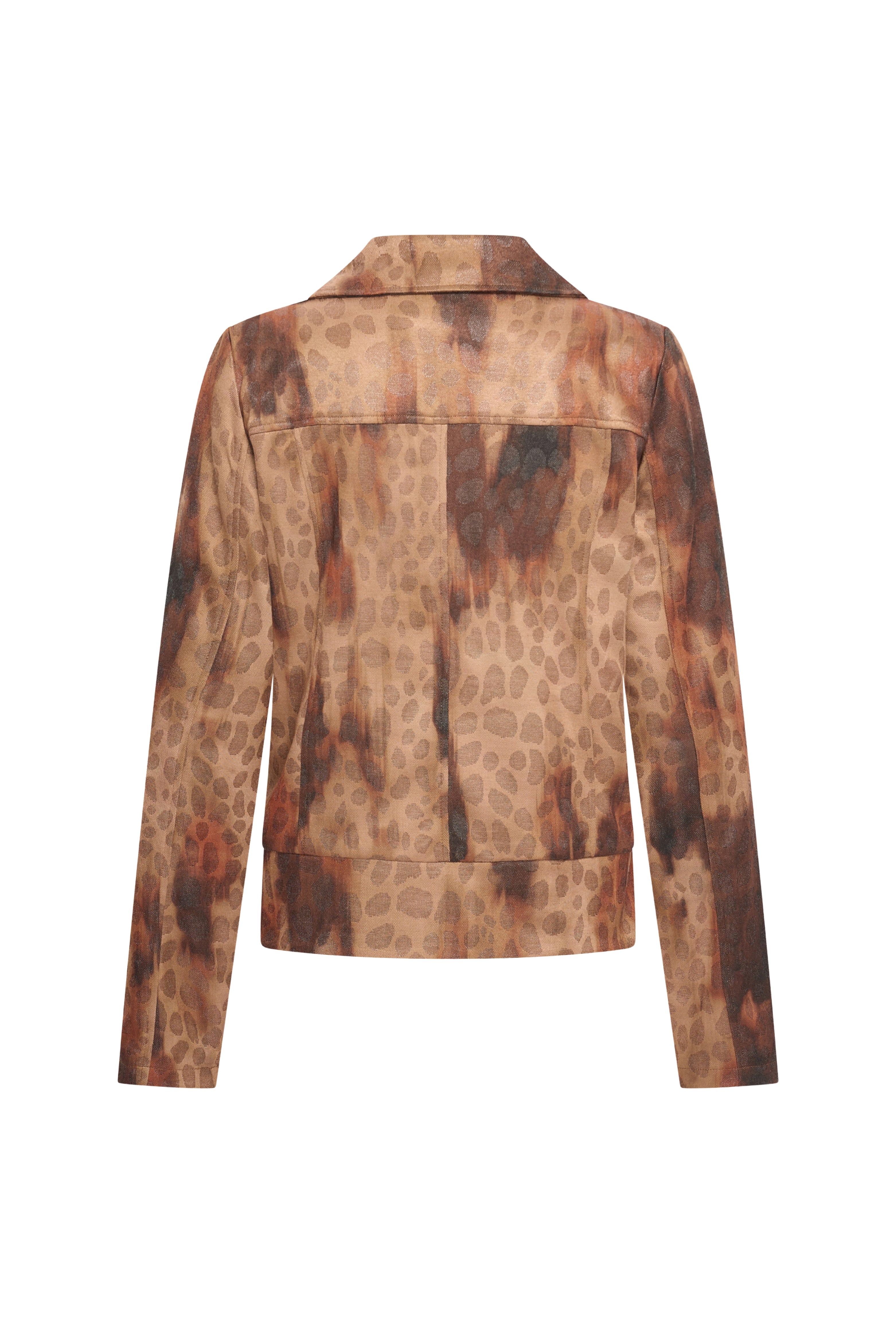 Jacket Faded Leopard Caramel van Mi Piace is een stoere korte jas in comfortabele travelstof. De faded leopardprint in warme caramel tinten geeft een trendy en unieke uitstraling. Voorzien van een asymmetrische rits en reverskraag.