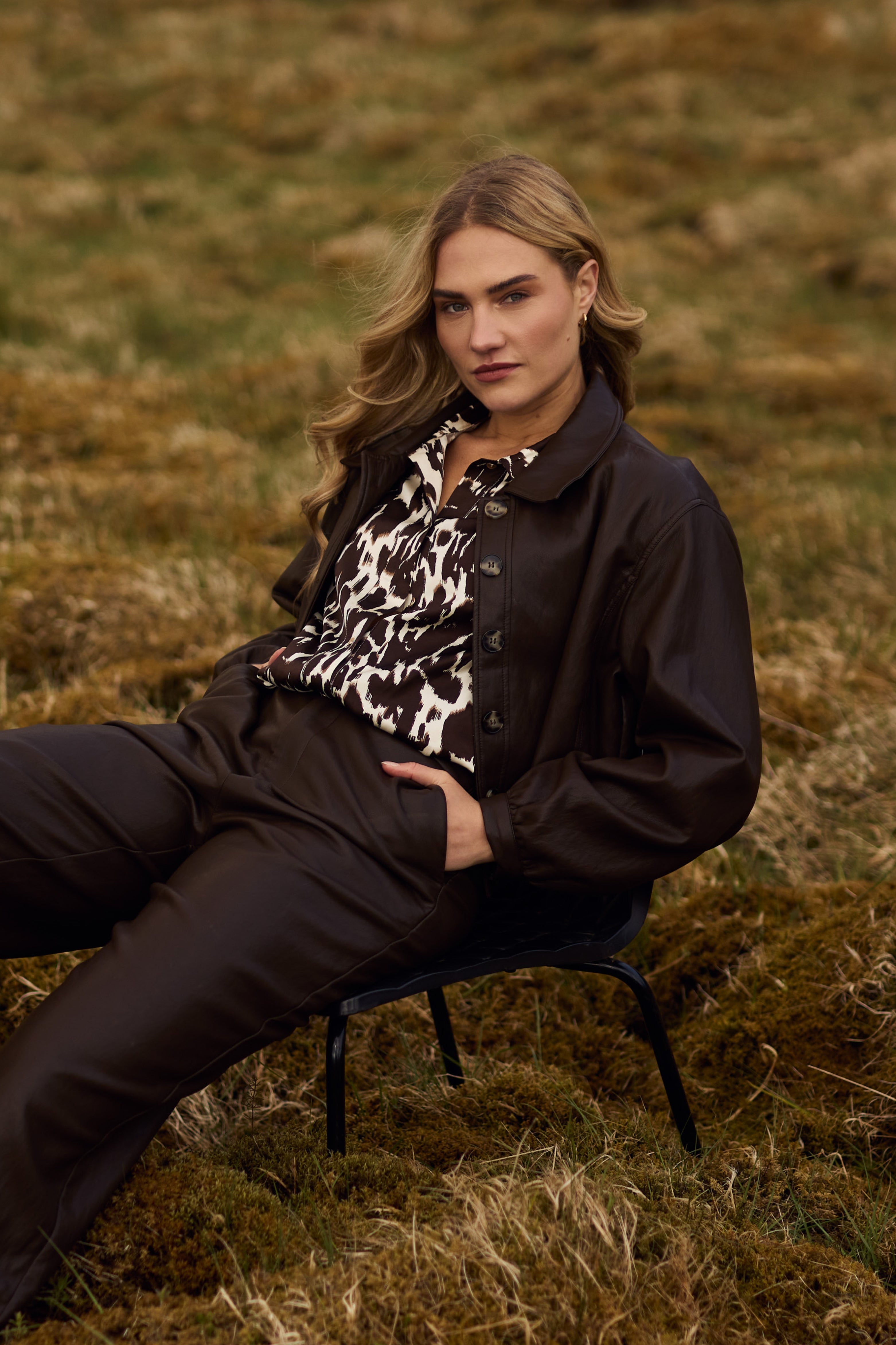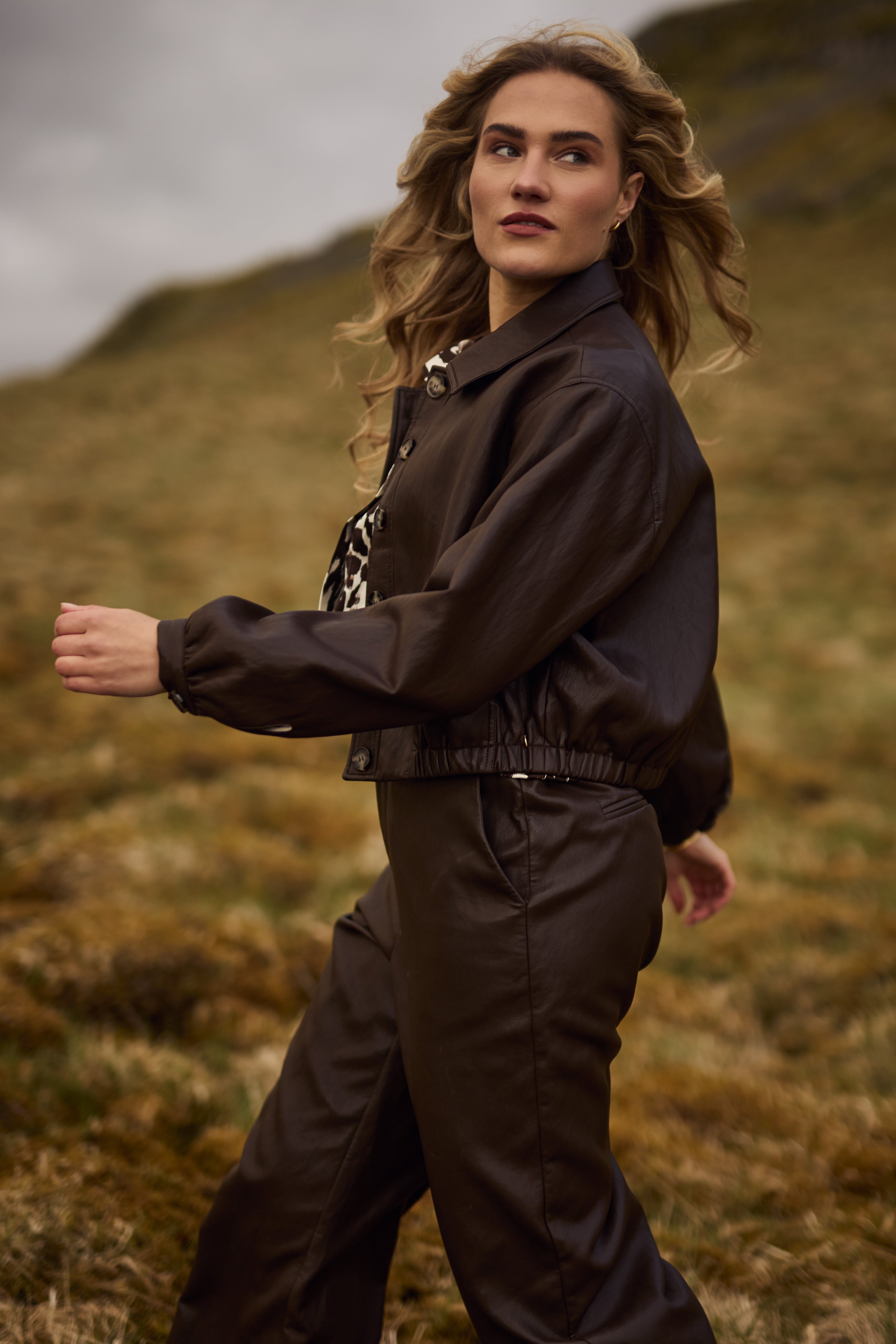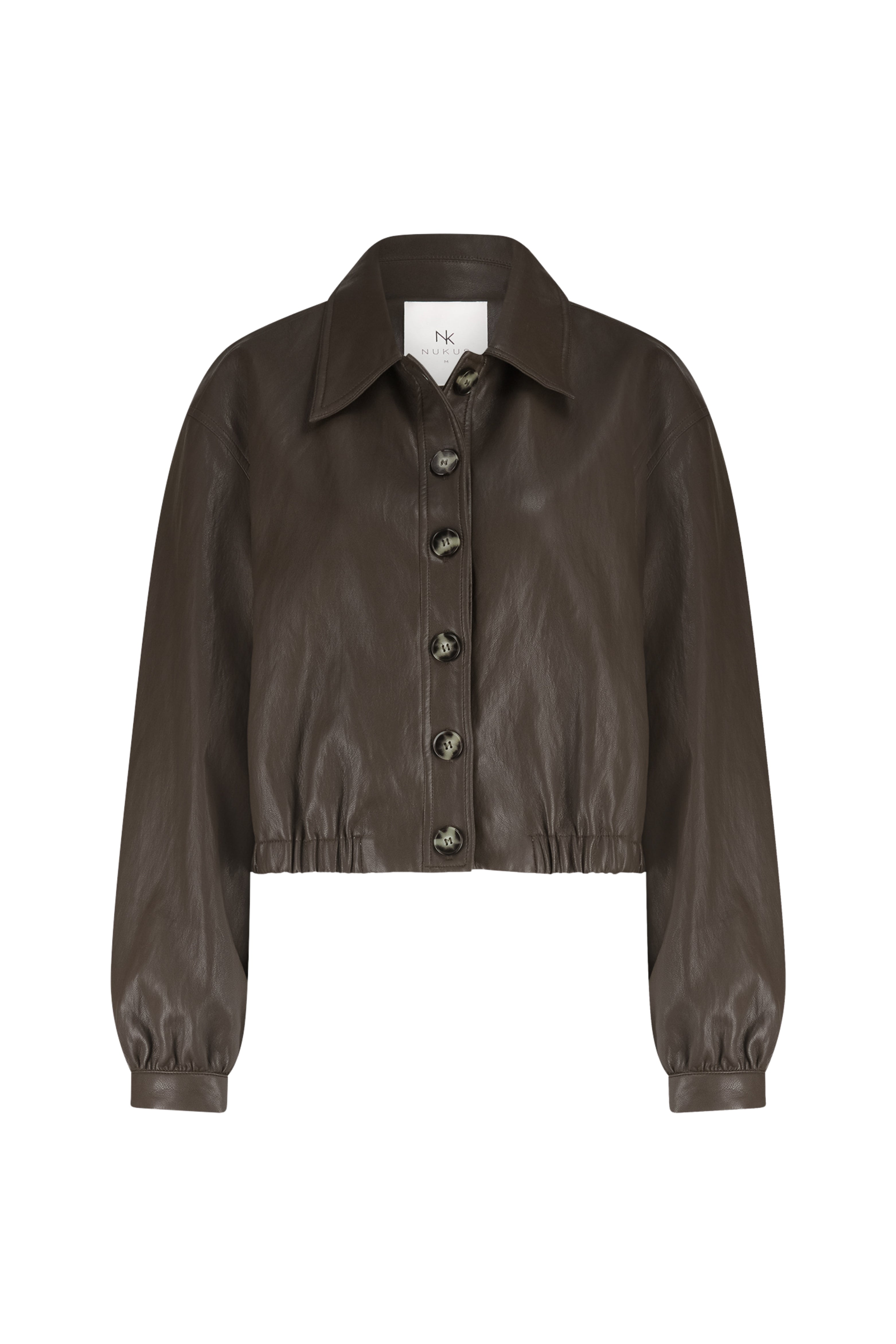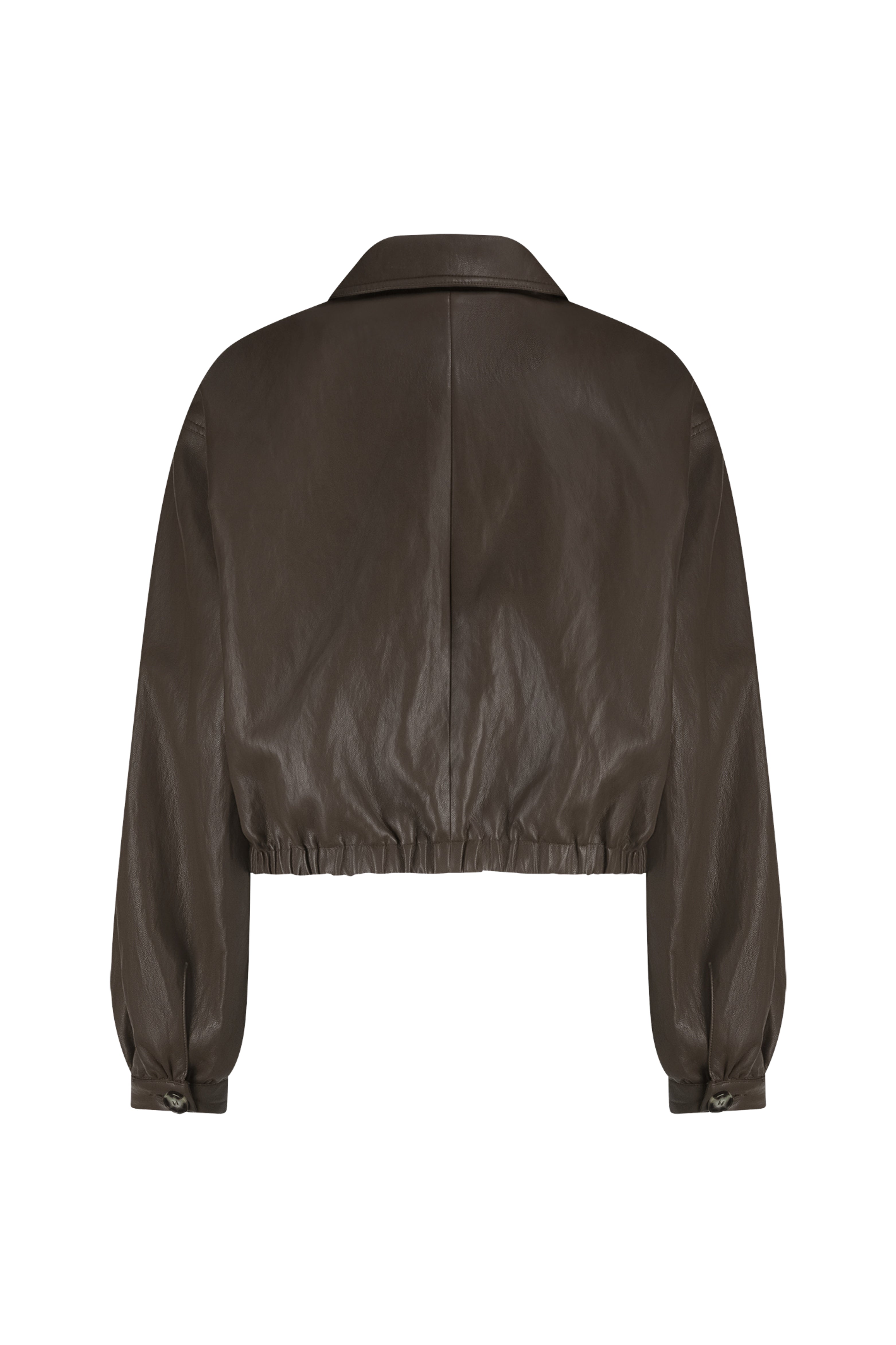 Jacket Fiene Dark Chocolate van Nukus is een stijlvol kort jack in een leather look. Het model heeft een klassieke kraag, knoopsluiting en elastische tailleband voor een moderne, vrouwelijke fit. Een veelzijdige must-have die elke outfit een stoere, chique touch geeft.
