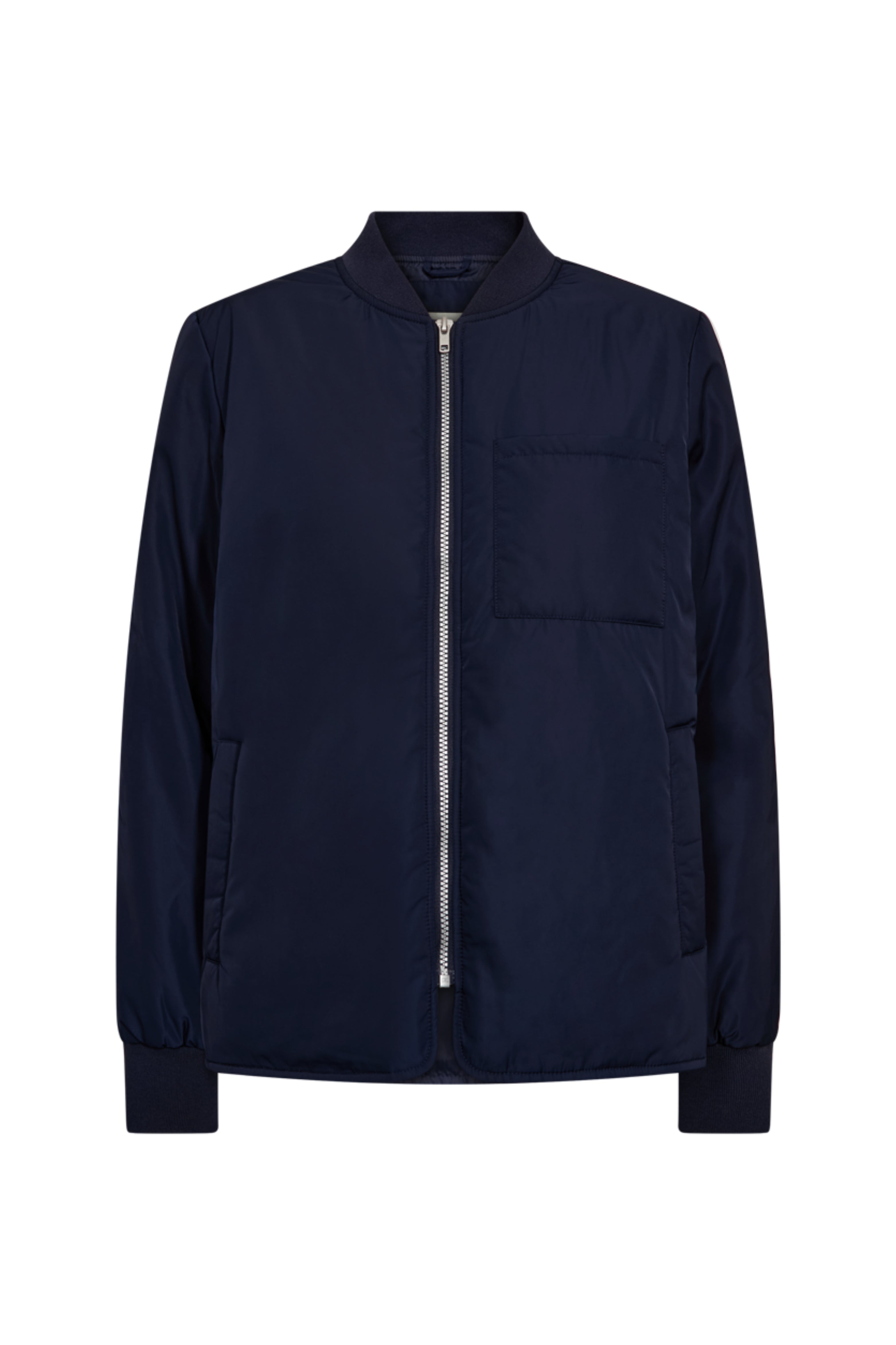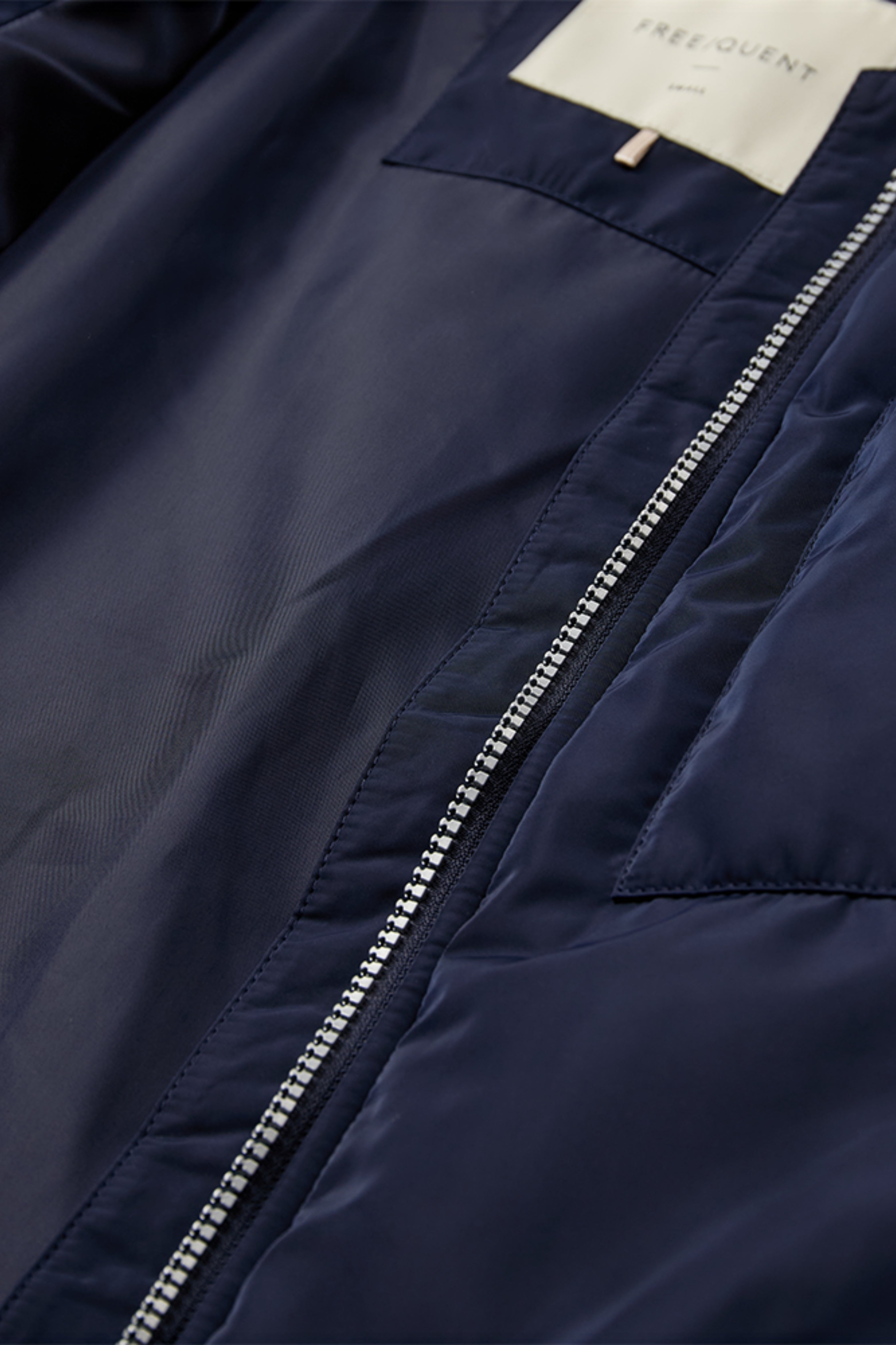 De Jacket Fqparma Navy Blazer van Freequent is een sportieve, licht gewatteerde bomber met een clean silhouet. Met ritssluiting, geribde boorden en borstzak. Perfect voor het voorjaar en frisse dagen.