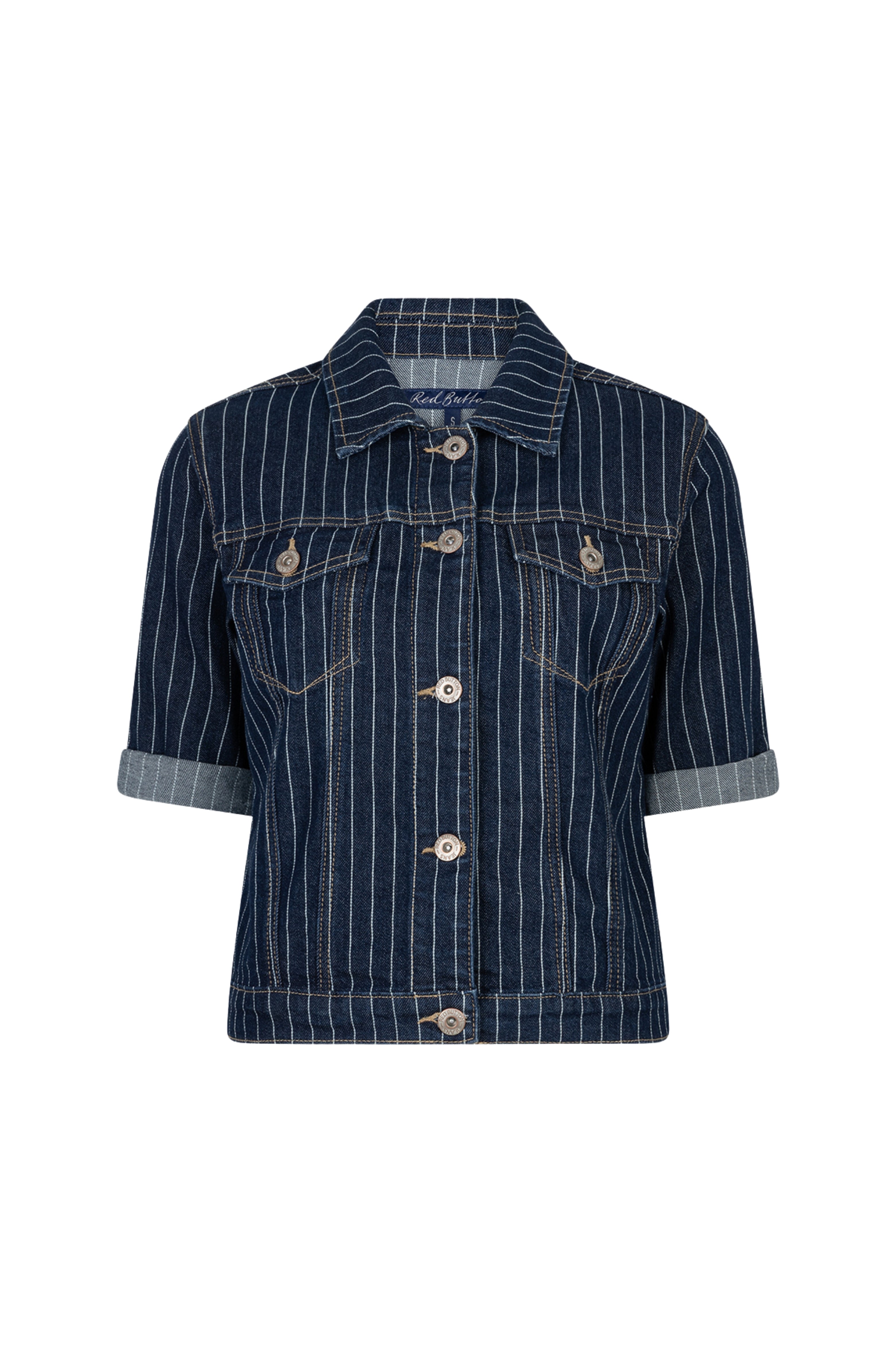 Het Jacket Jackie Short Sleeve Denim Stripe Rinse van Red Button is een eigentijds denim jasje met fijne pinstripes. De korte mouwen en diepe rinse wassing geven het jasje een frisse, moderne uitstraling die perfect past bij zowel casual als geklede looks.