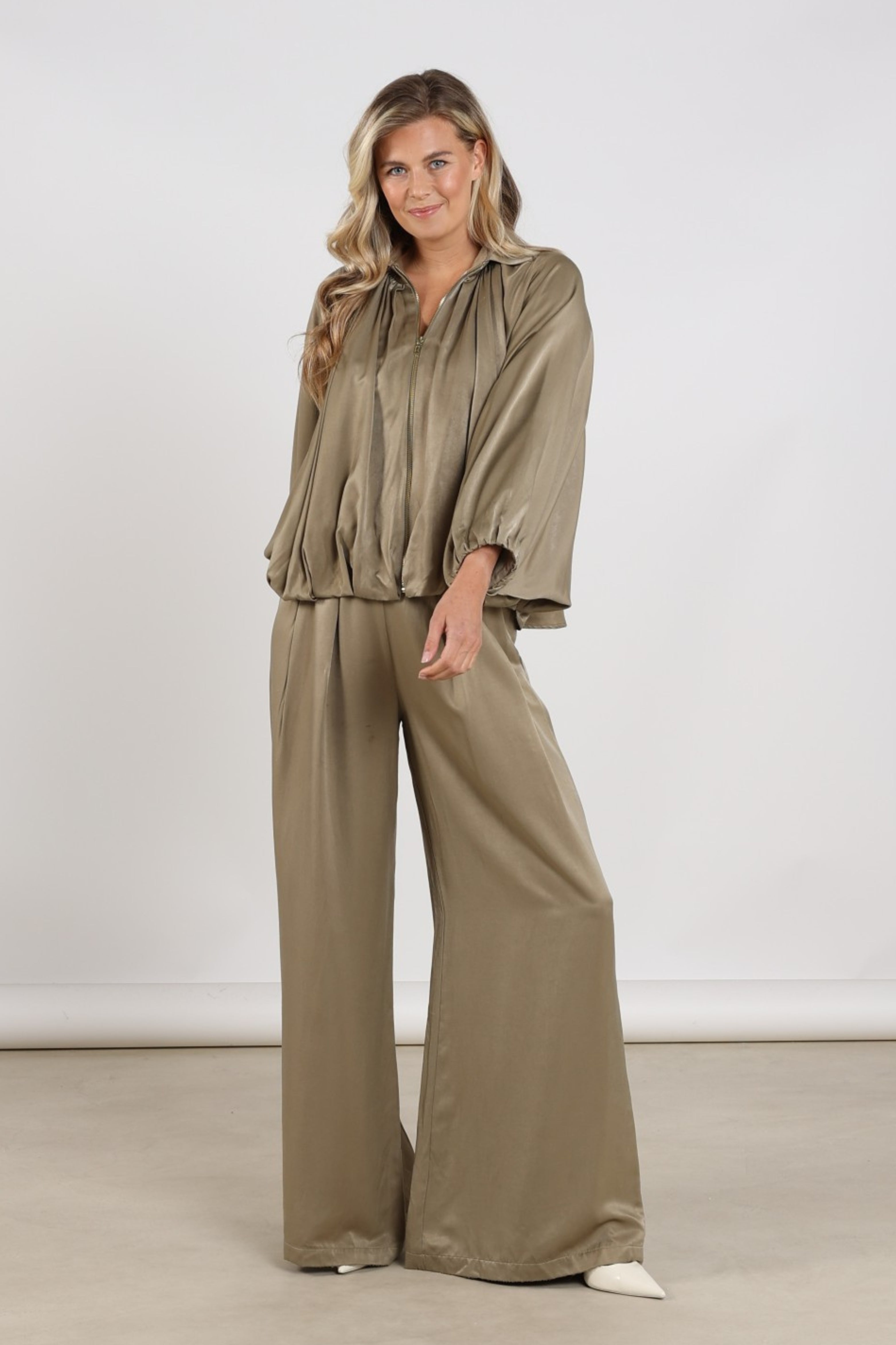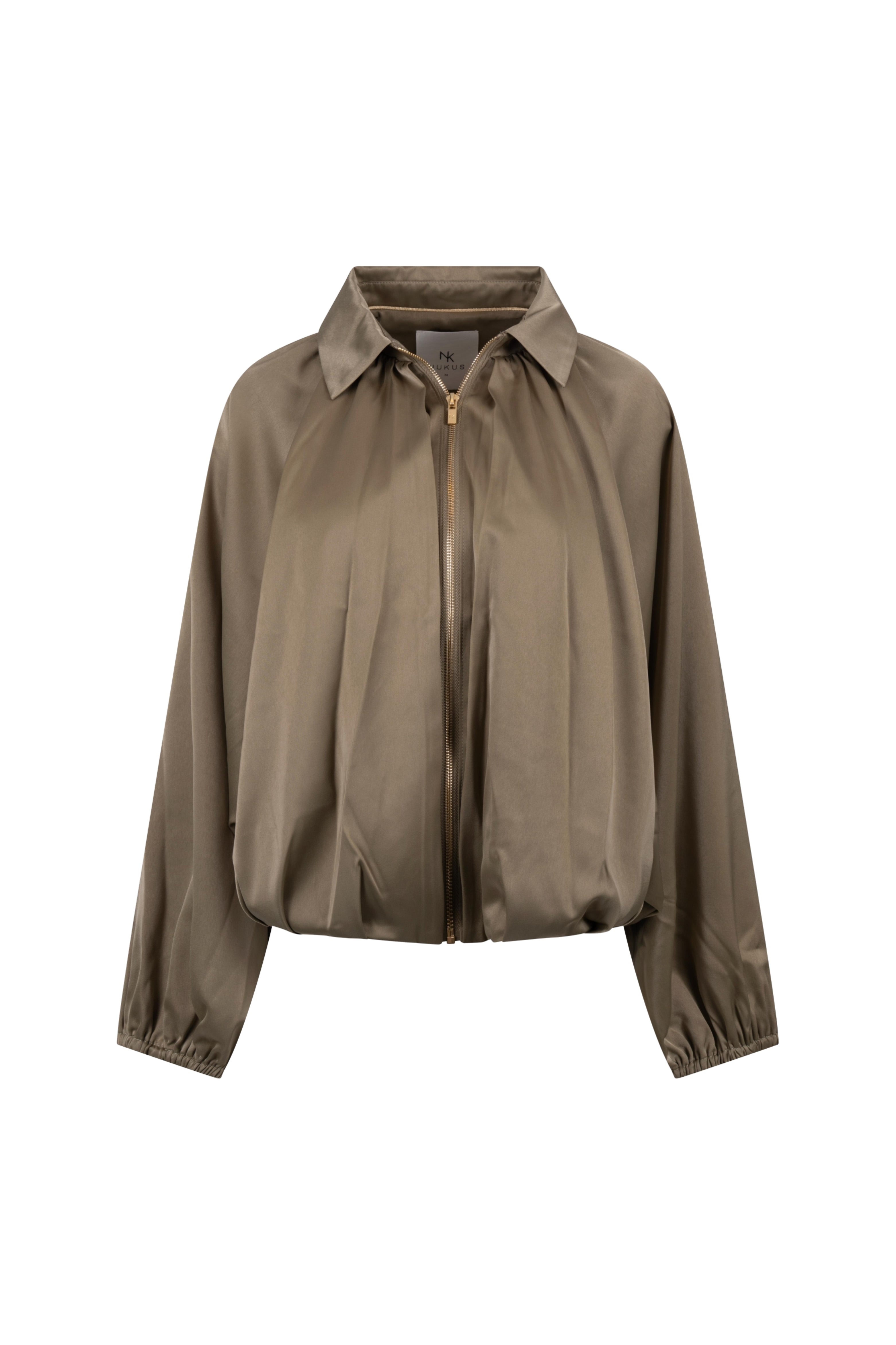 De Jacket Jolijn Army van Nukus is een elegante vest met klassieke kraag. De soepele, glanzende stof en ritssluiting met elastische zoom geven een comfortabele, luxe look. Perfect voor zowel dagelijks gebruik als een avondje uit.