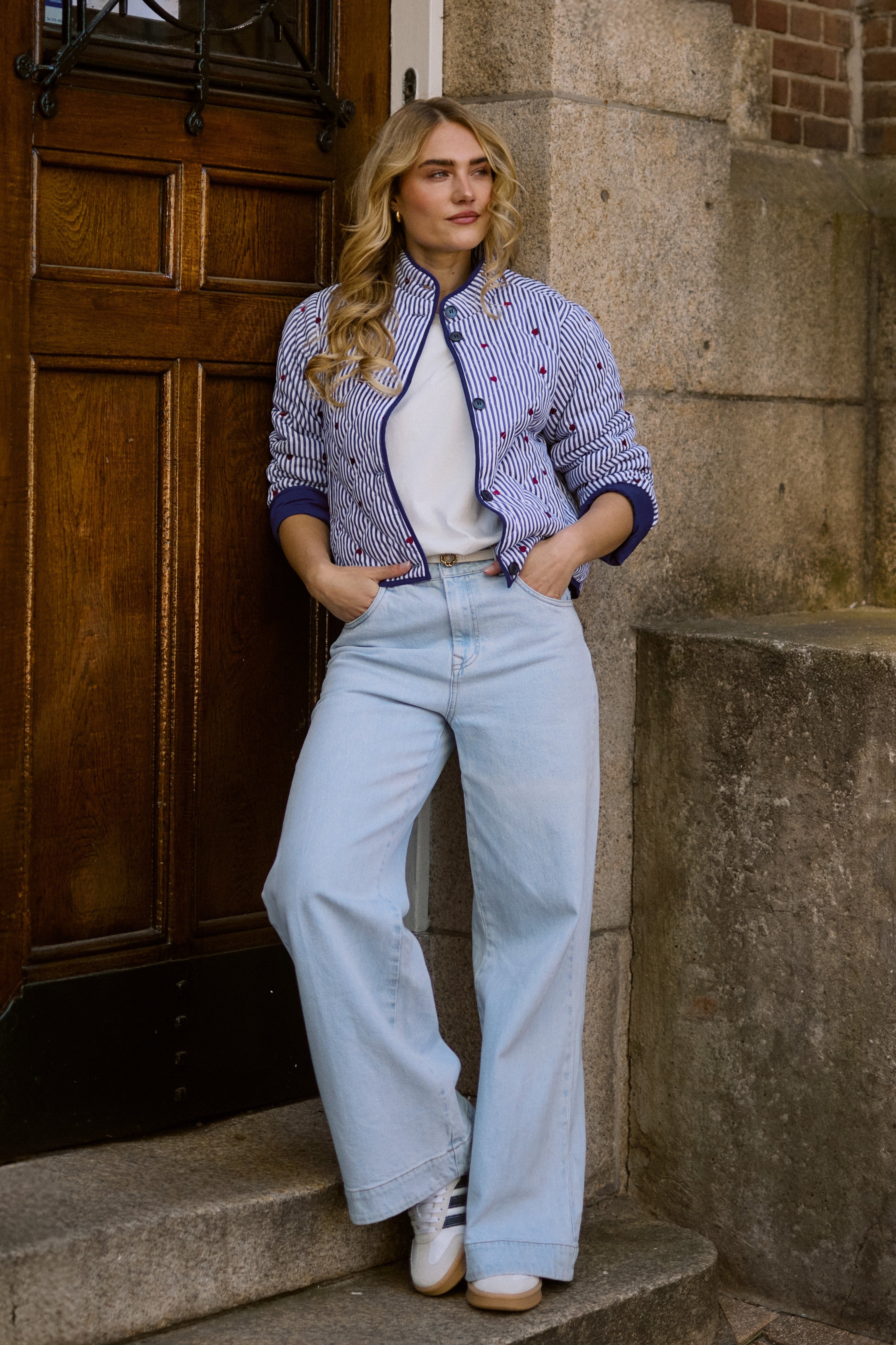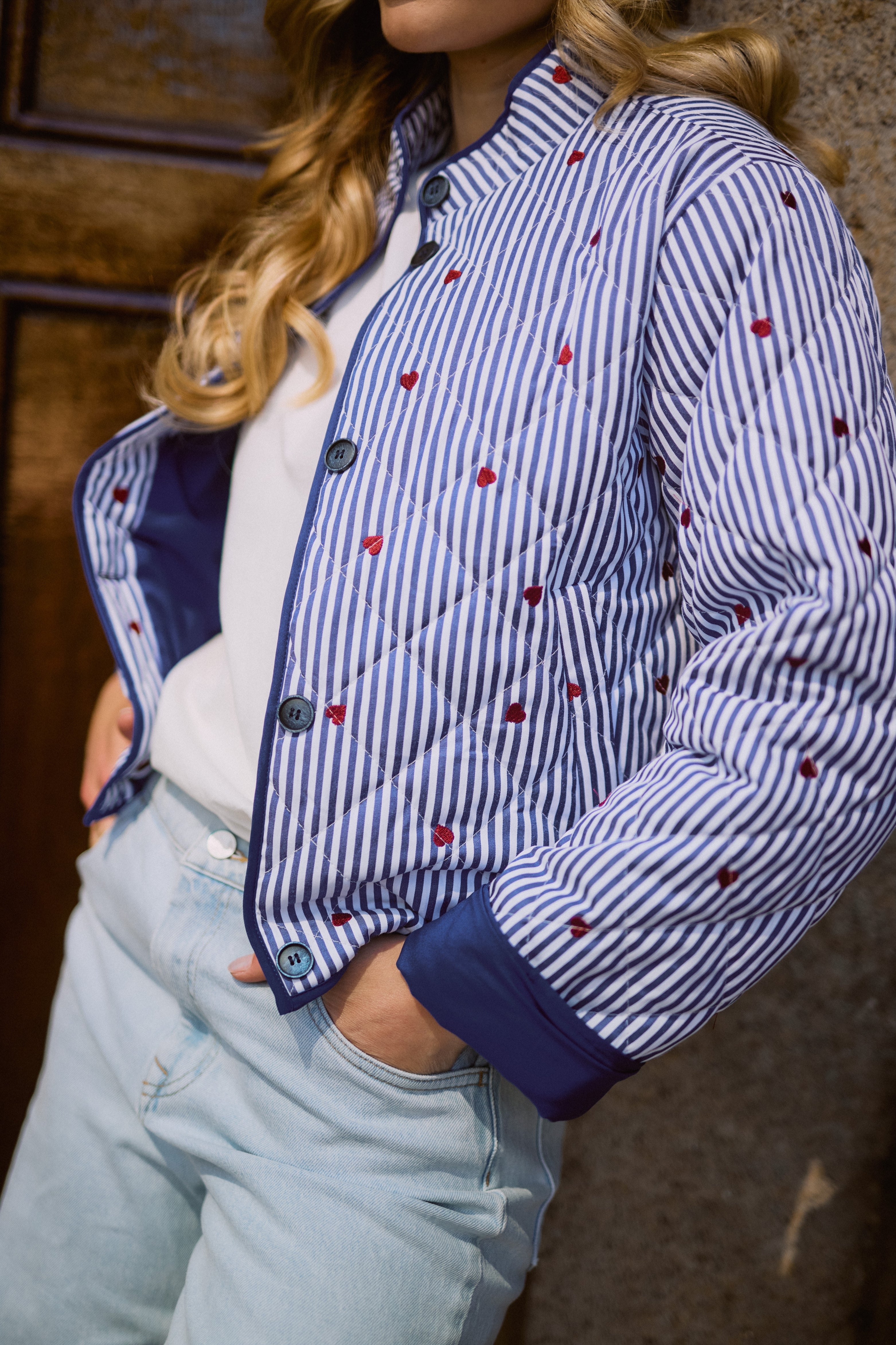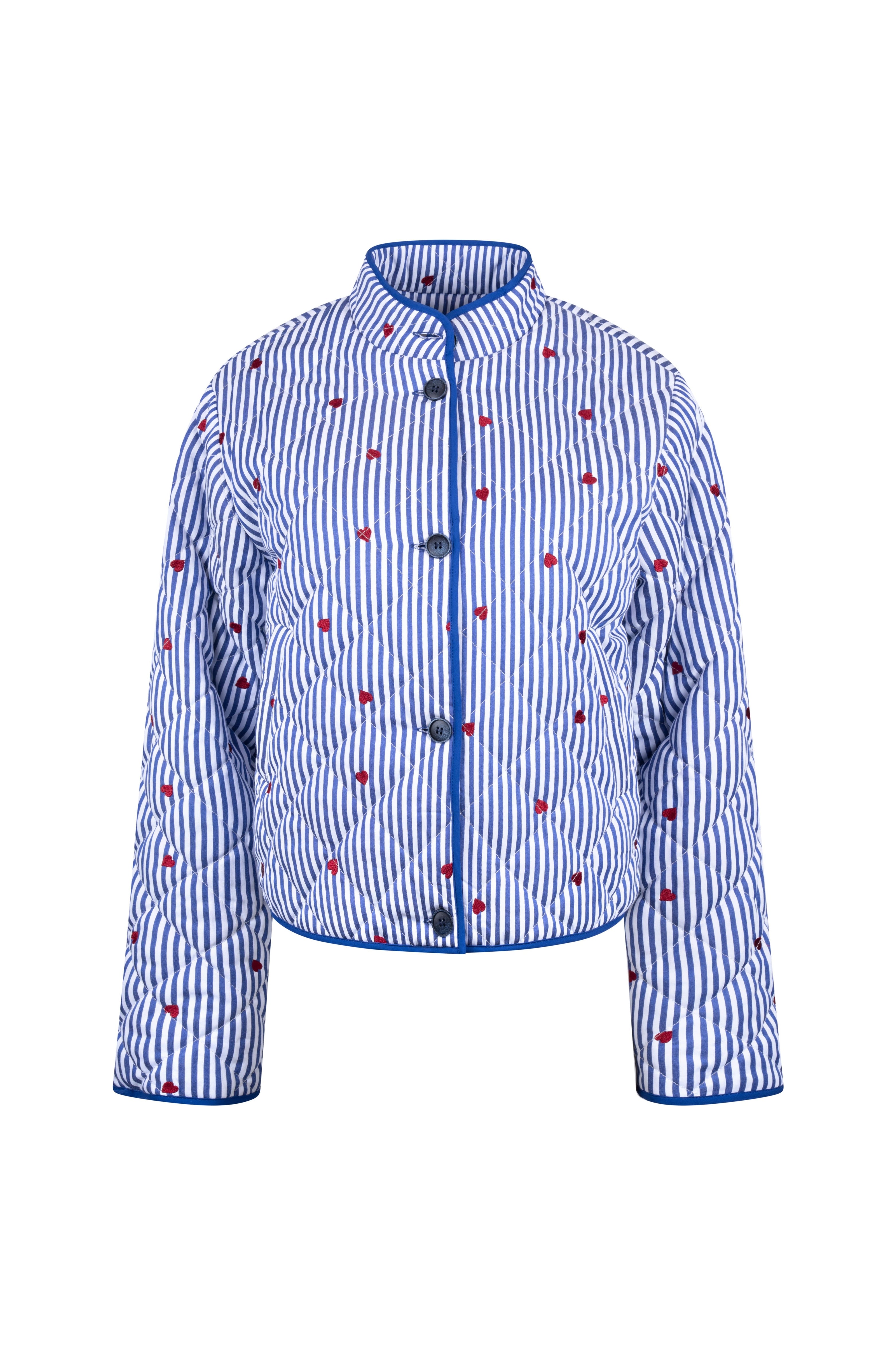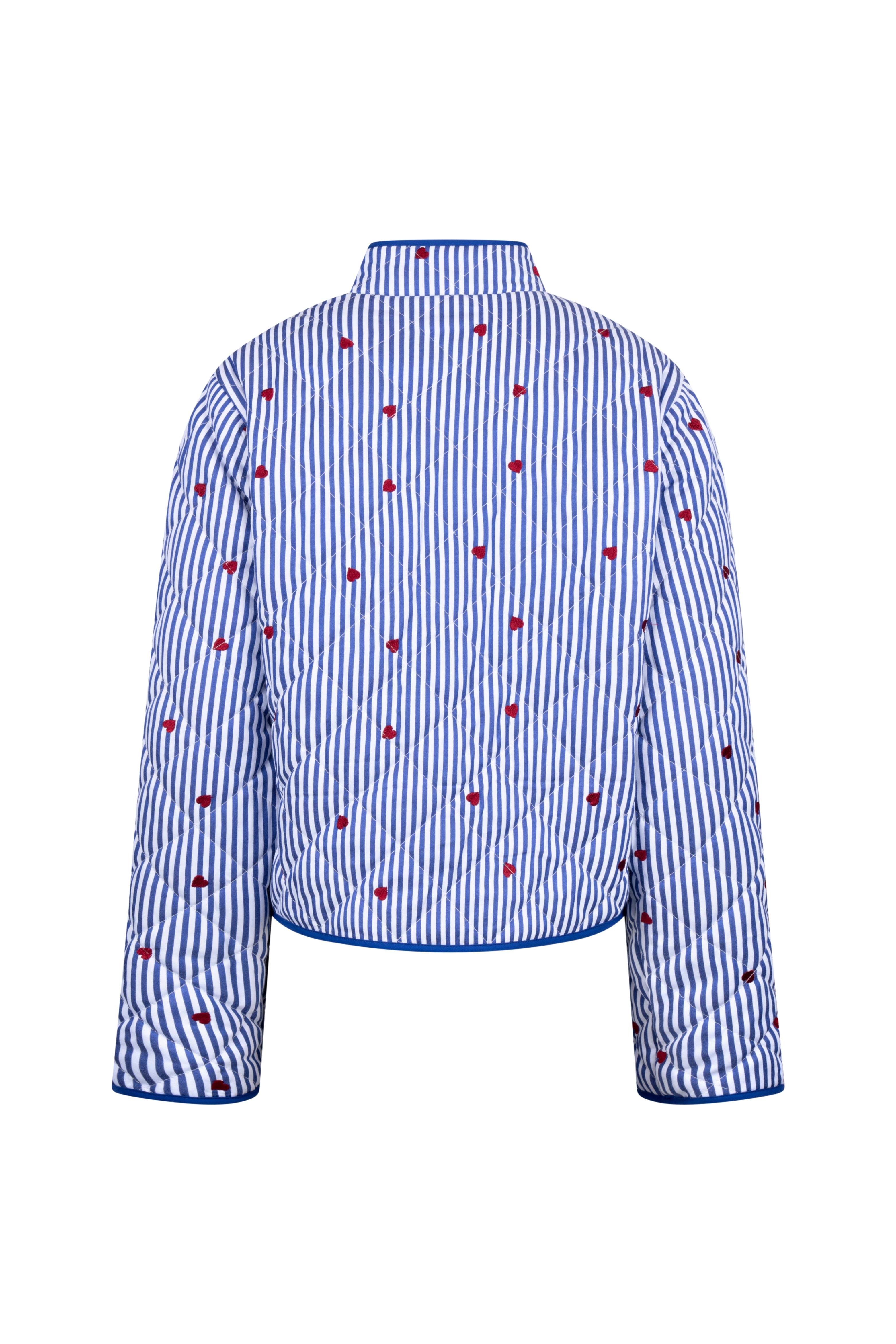 De Jacket June Offwhite Navy van Nukus is een speelse blazer/jack met hoge ronde hals. Gewatteerde stof met streepdessin en geborduurde hartjes biedt lichte warmte en een preppy look. Perfect voor casual dagen.
