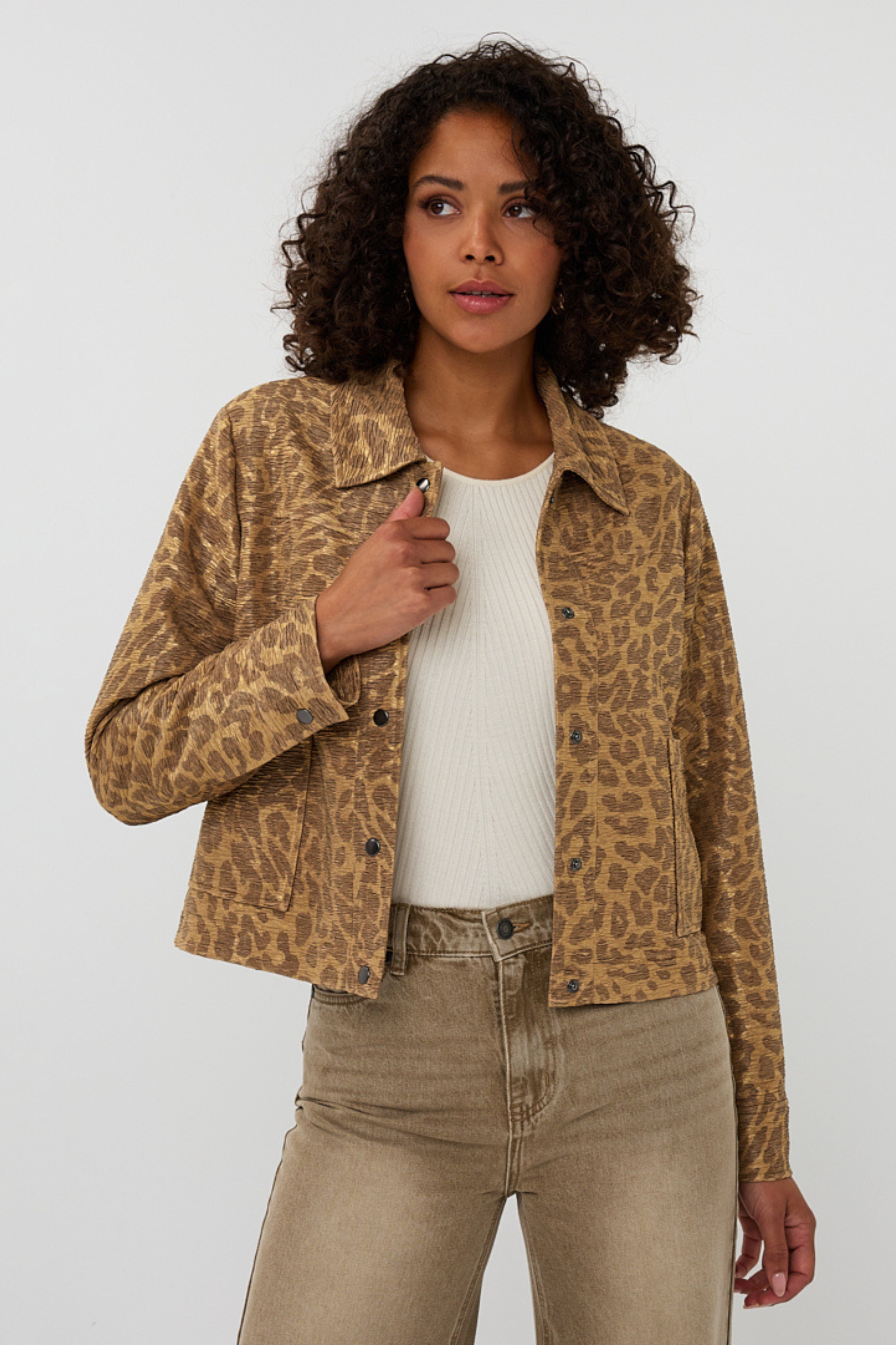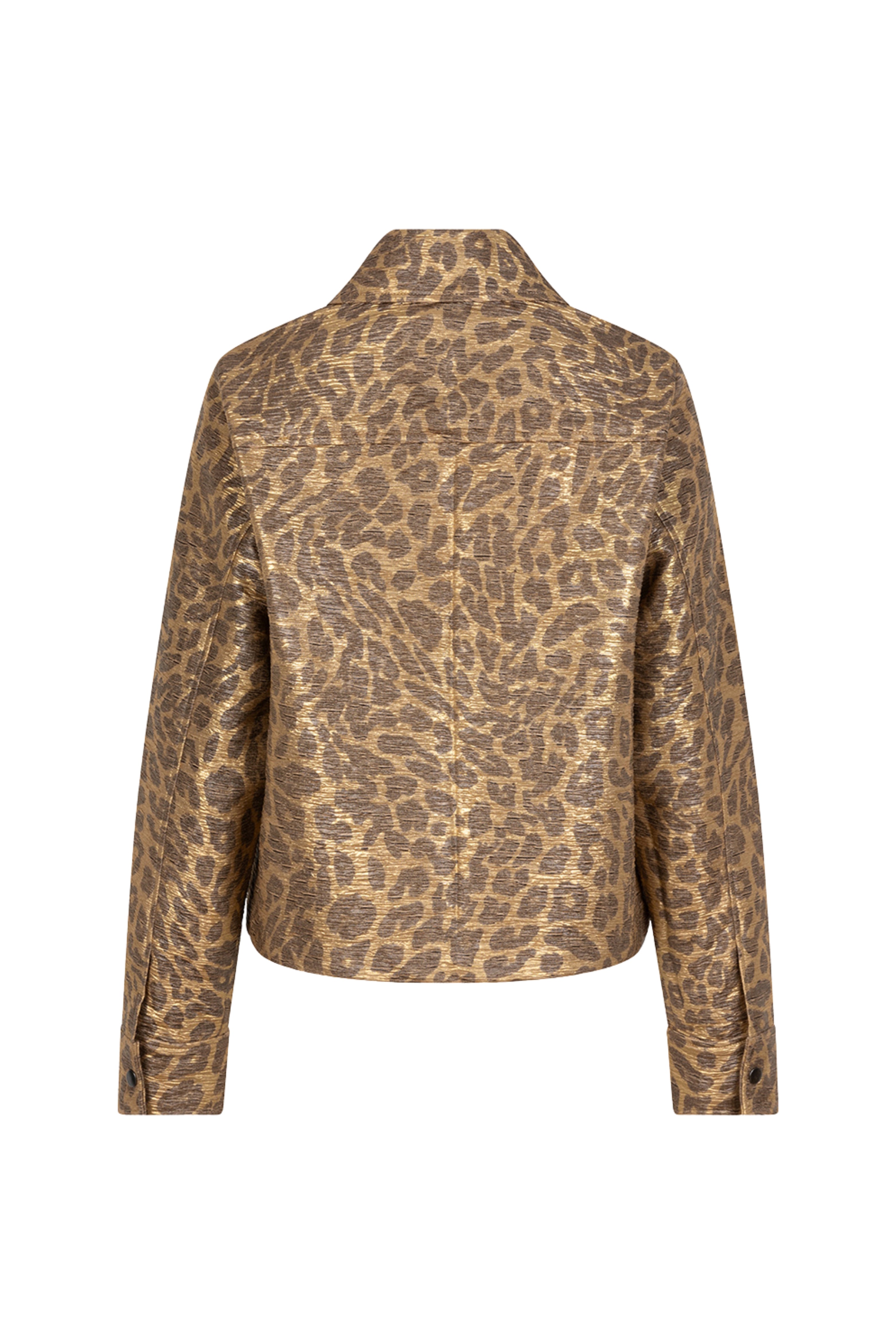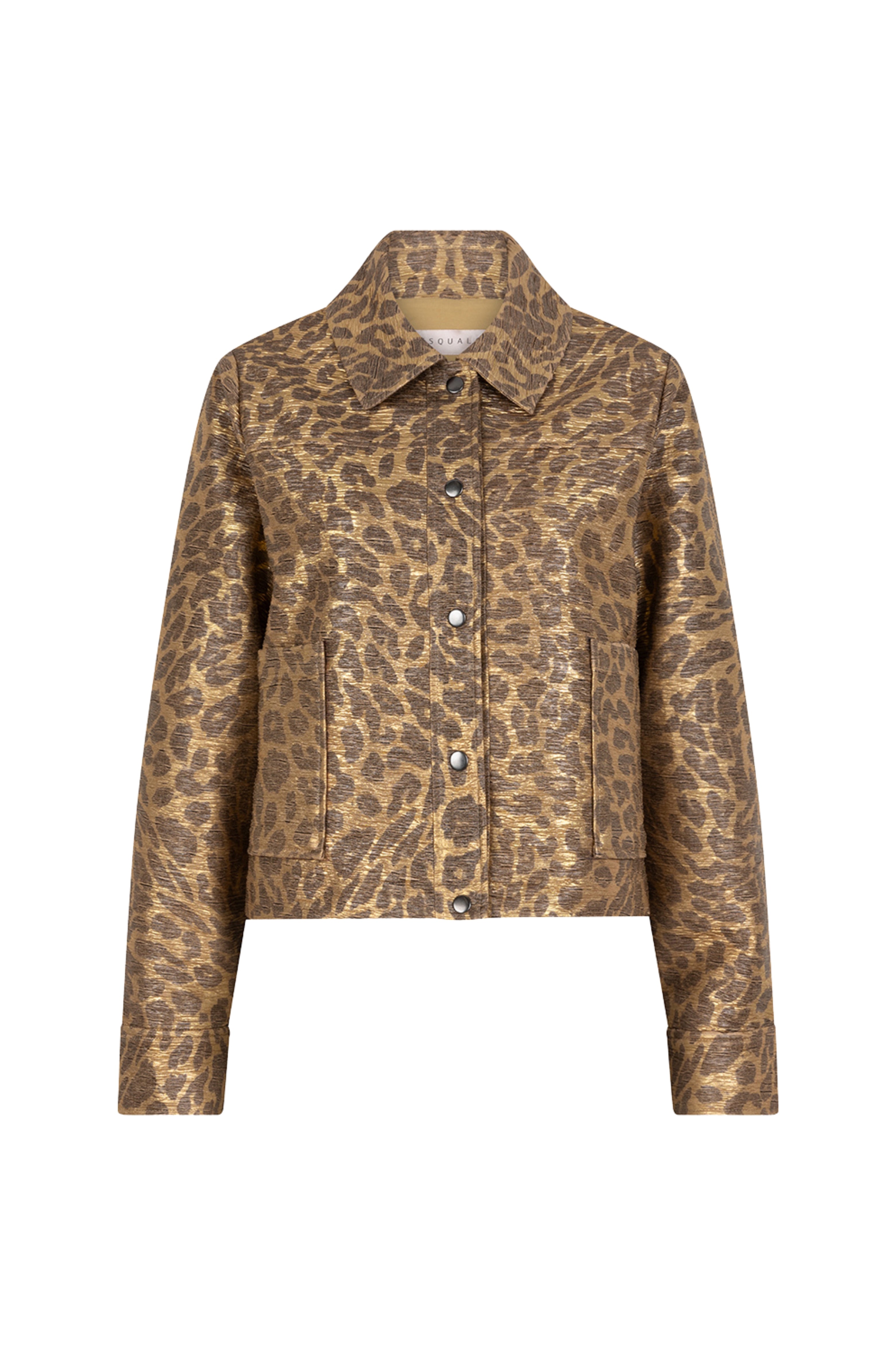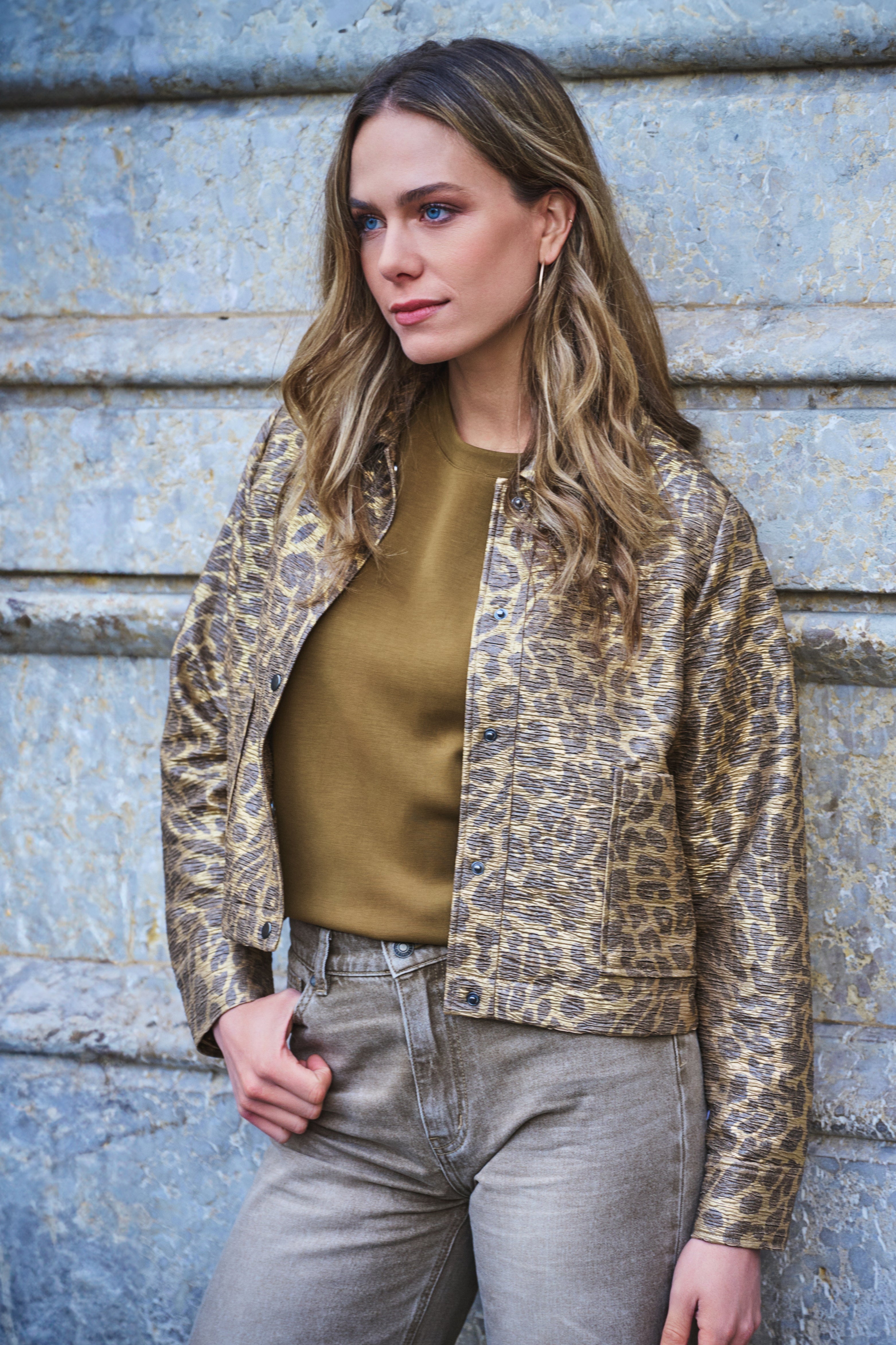 Jacket Leopard Golden Olive van EsQualo is een opvallend jasje met metallic leopardprint. Het korte model met kraag en drukknoopsluiting geeft je outfit een stoere en stijlvolle twist.