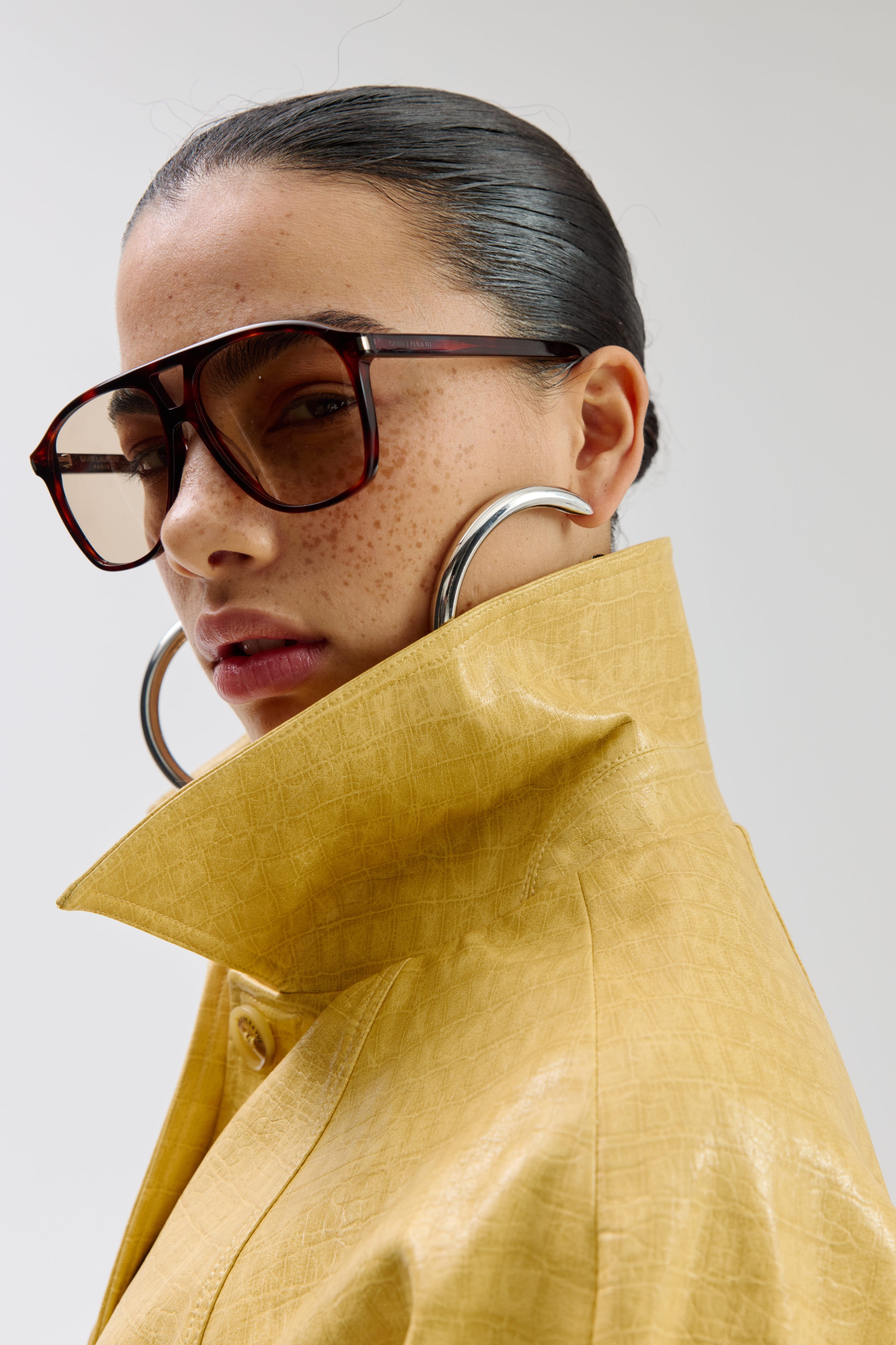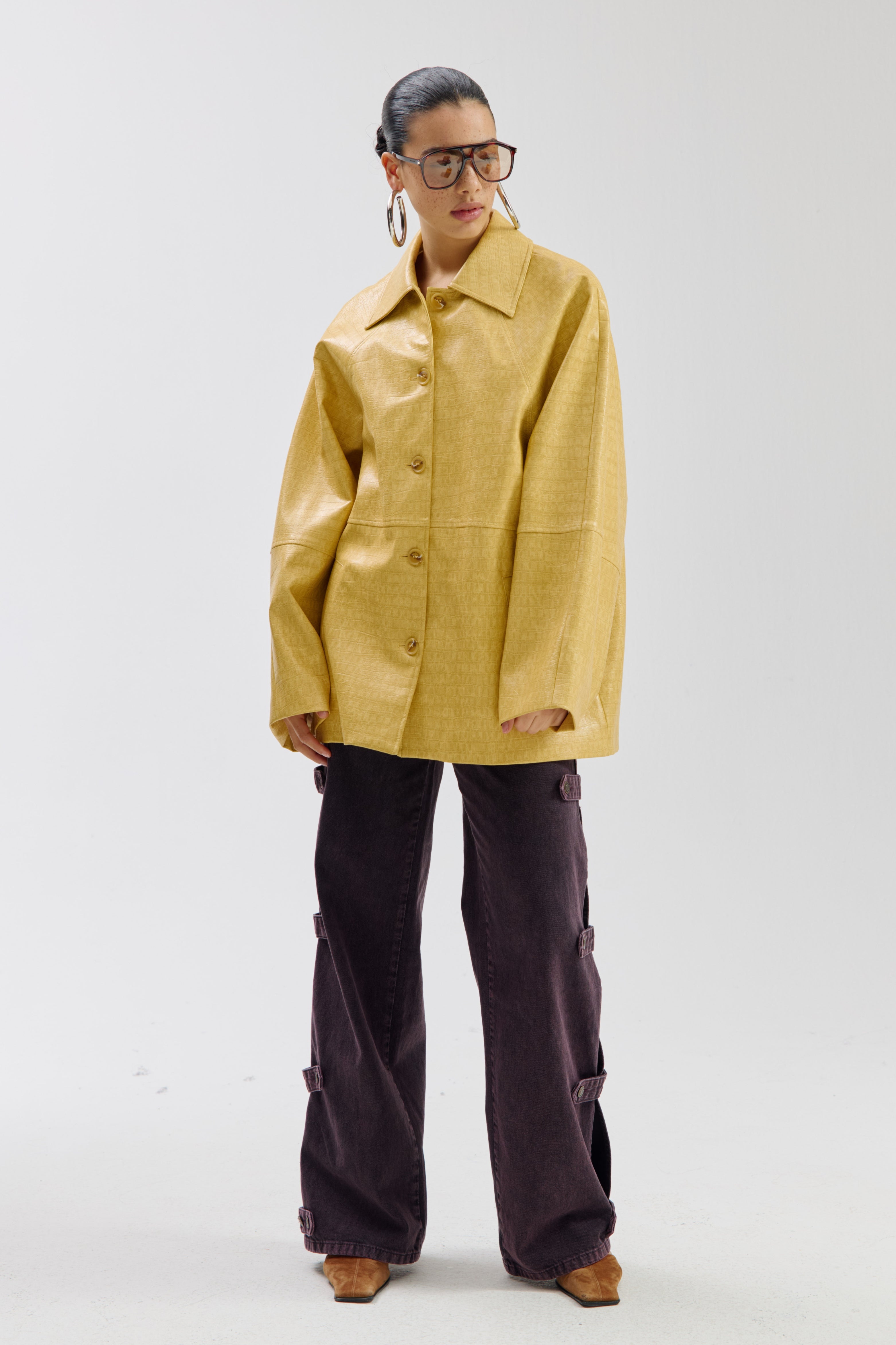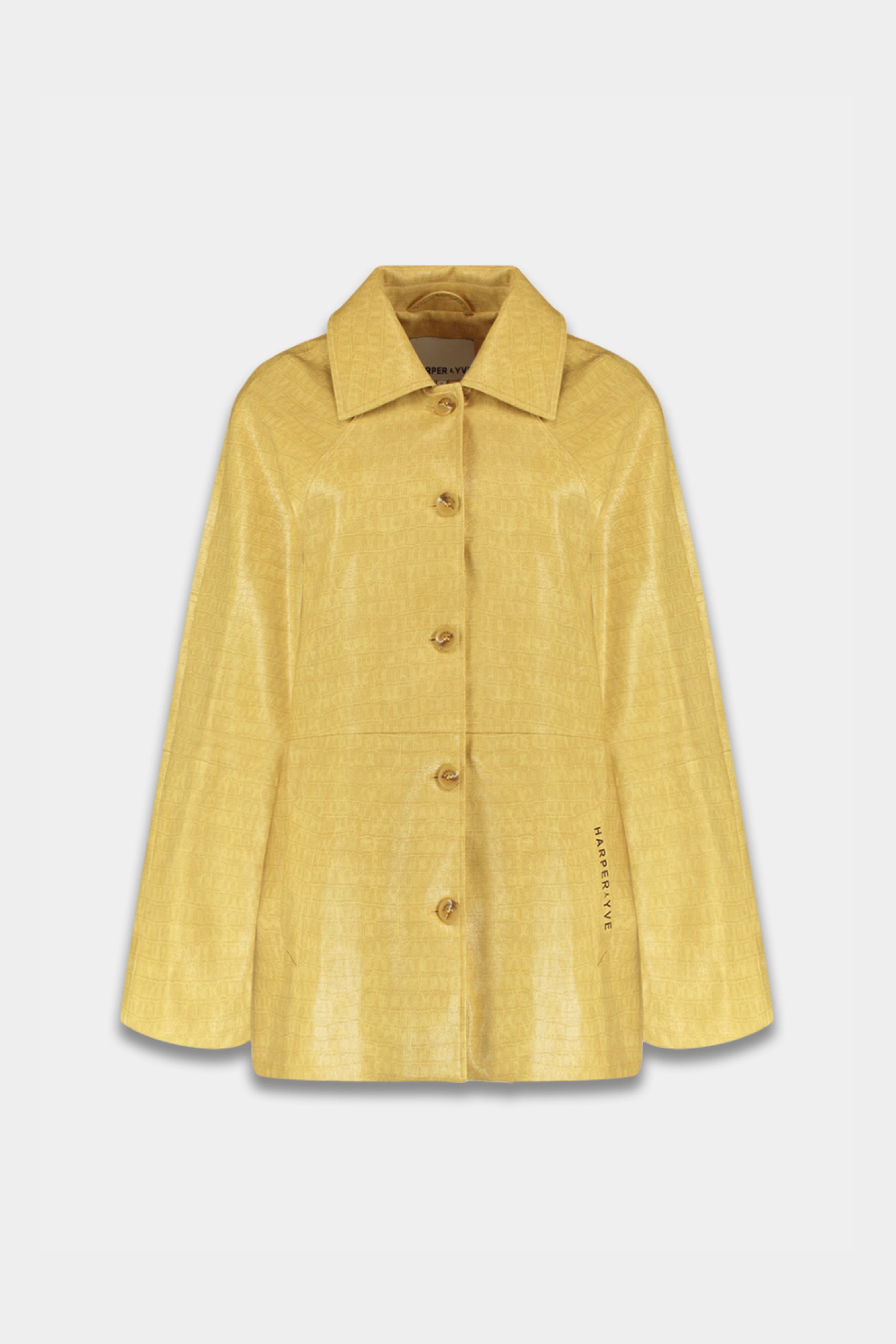 Jacket Mees Light Yellow van Harper & Yve is een stijlvolle loose-fit jas met subtiele krokodillenstructuur en glanzende coating. De wijde mouwen en minimalistische look maken het een modern statement item.