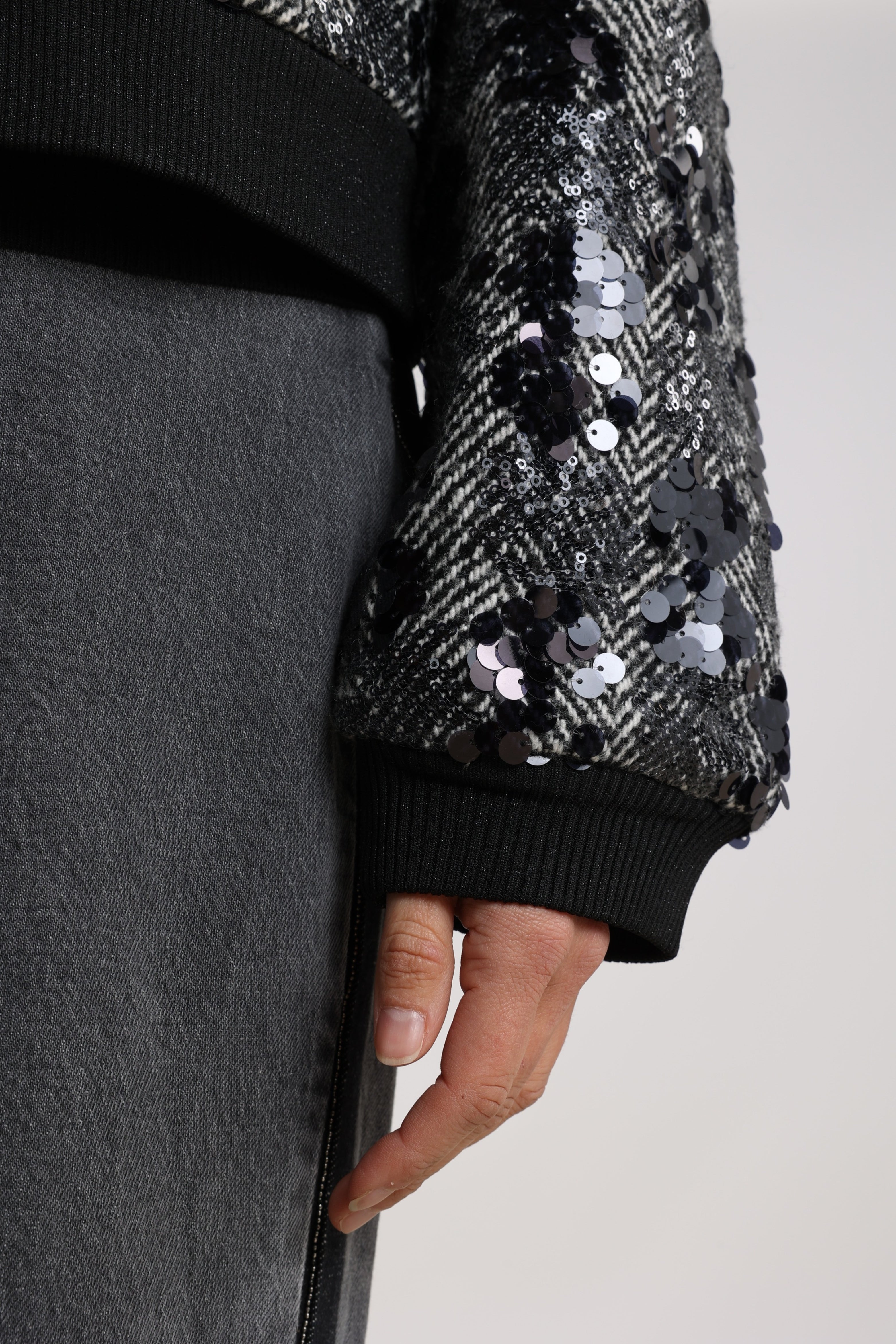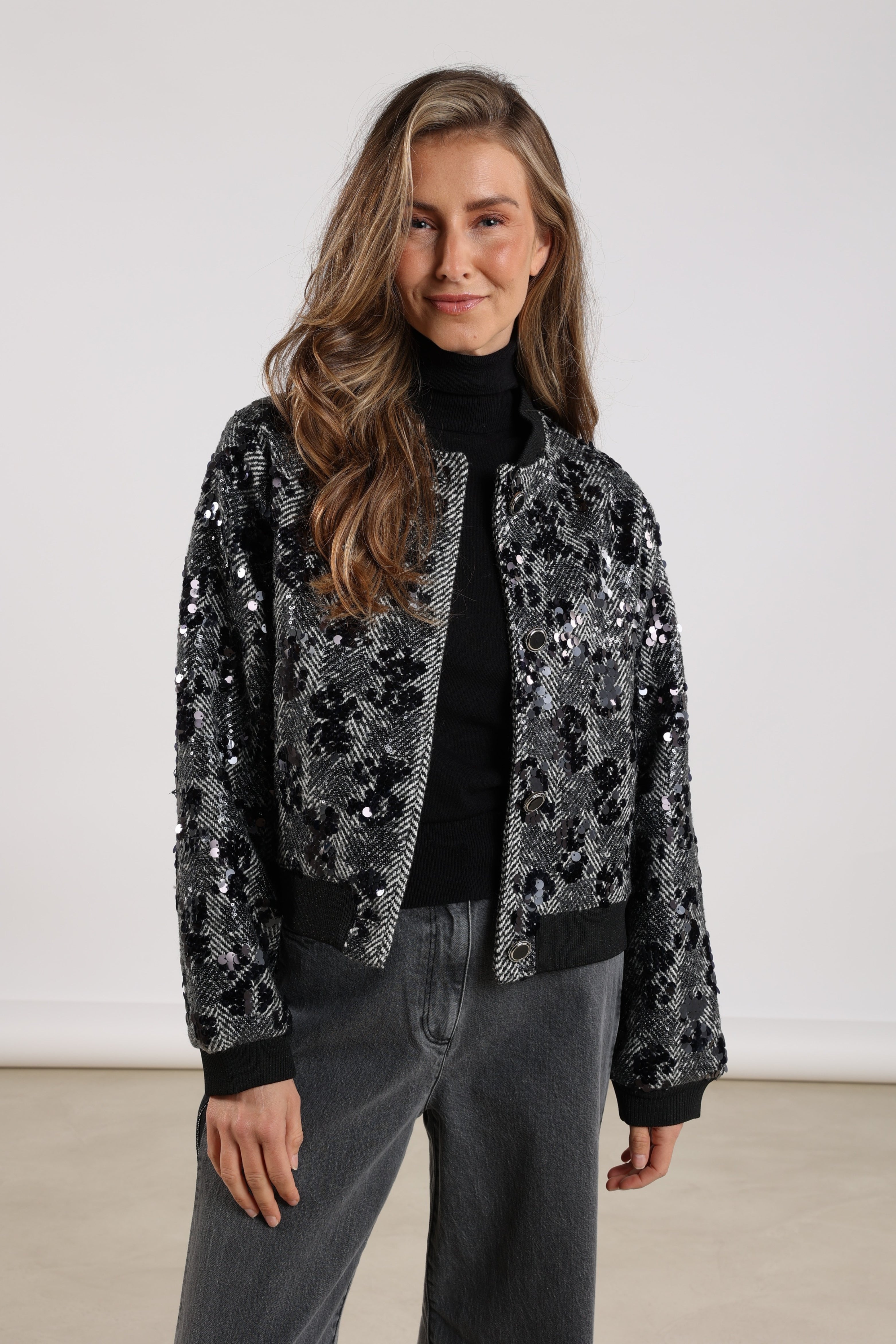 Het Mia Jacket van Nukus in Offwhite Black is een kort jasje met sprankelende pailletten. Met drukknoopsluiting en geribde boorden geeft dit stijlvolle jasje elke look een feestelijke touch.