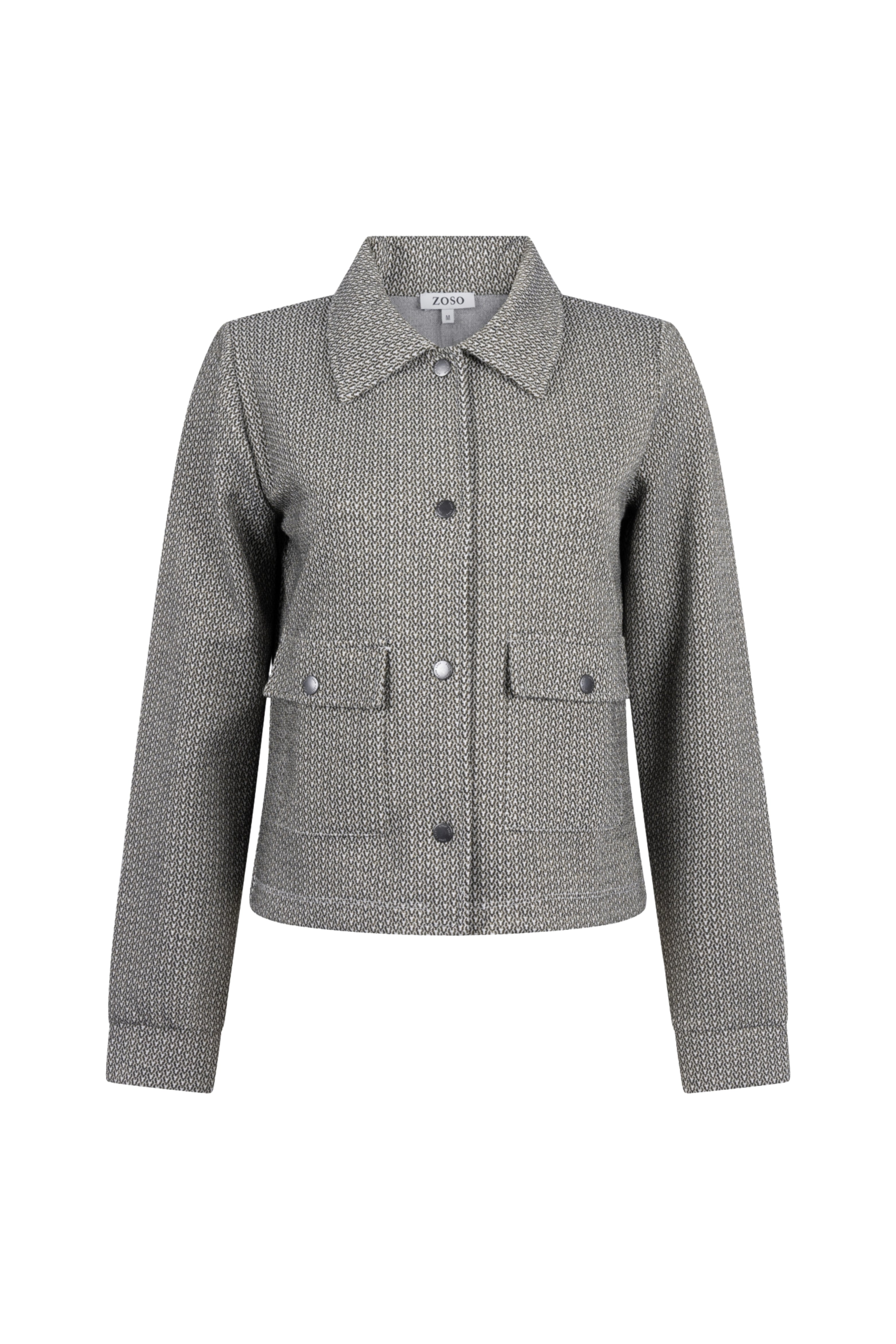 Jacket Michelle Black van Zoso is een kort jasje met klassieke kraag, klepzakken en drukknoopsluiting. Het geweven dessin in zwart en grijs geeft een klassieke uitstraling en is gemakkelijk te combineren.