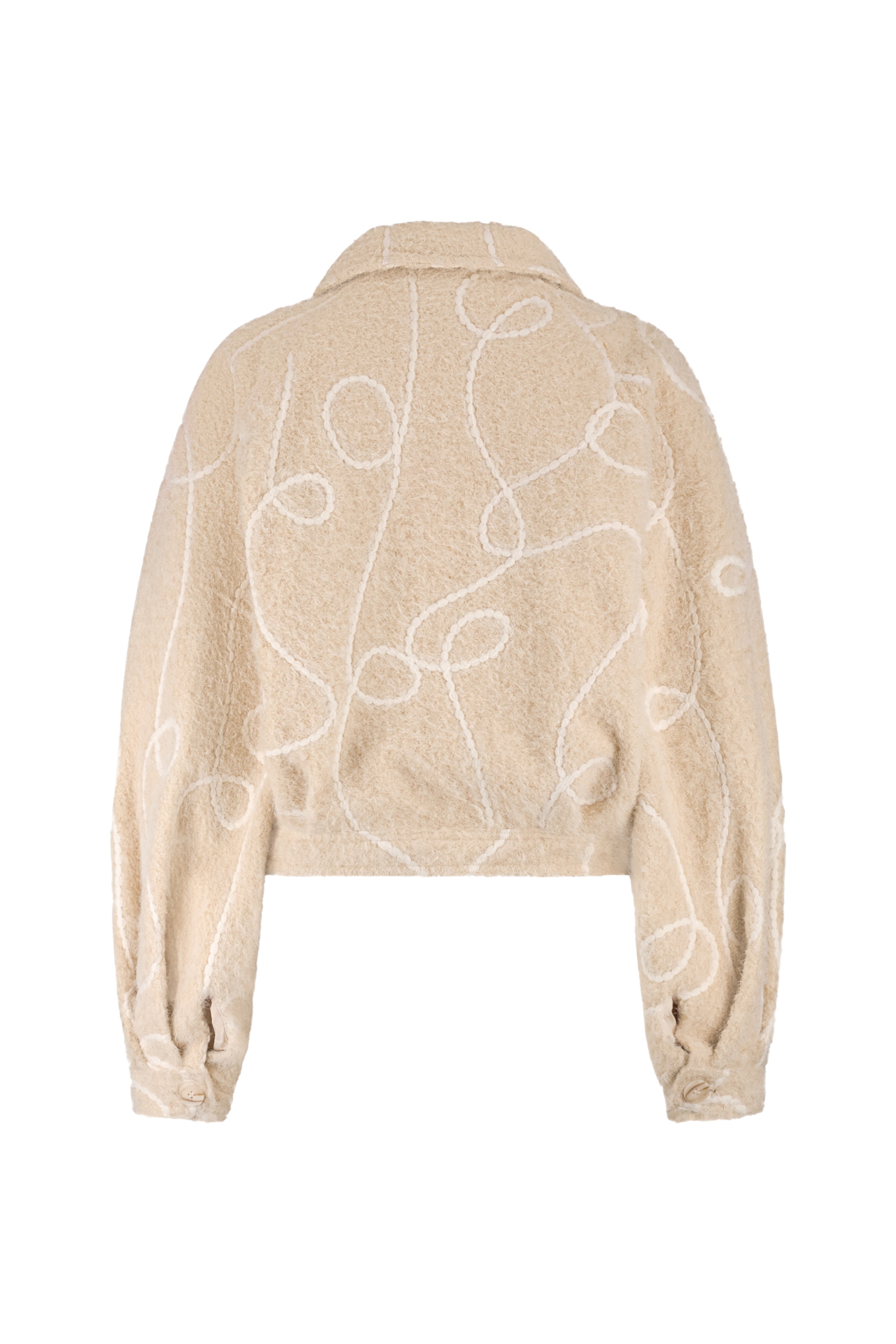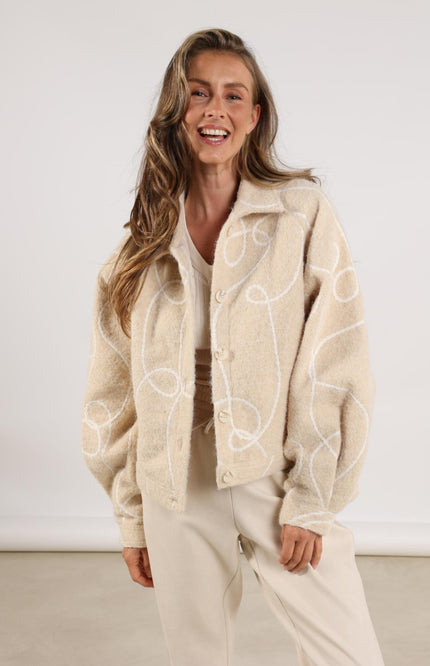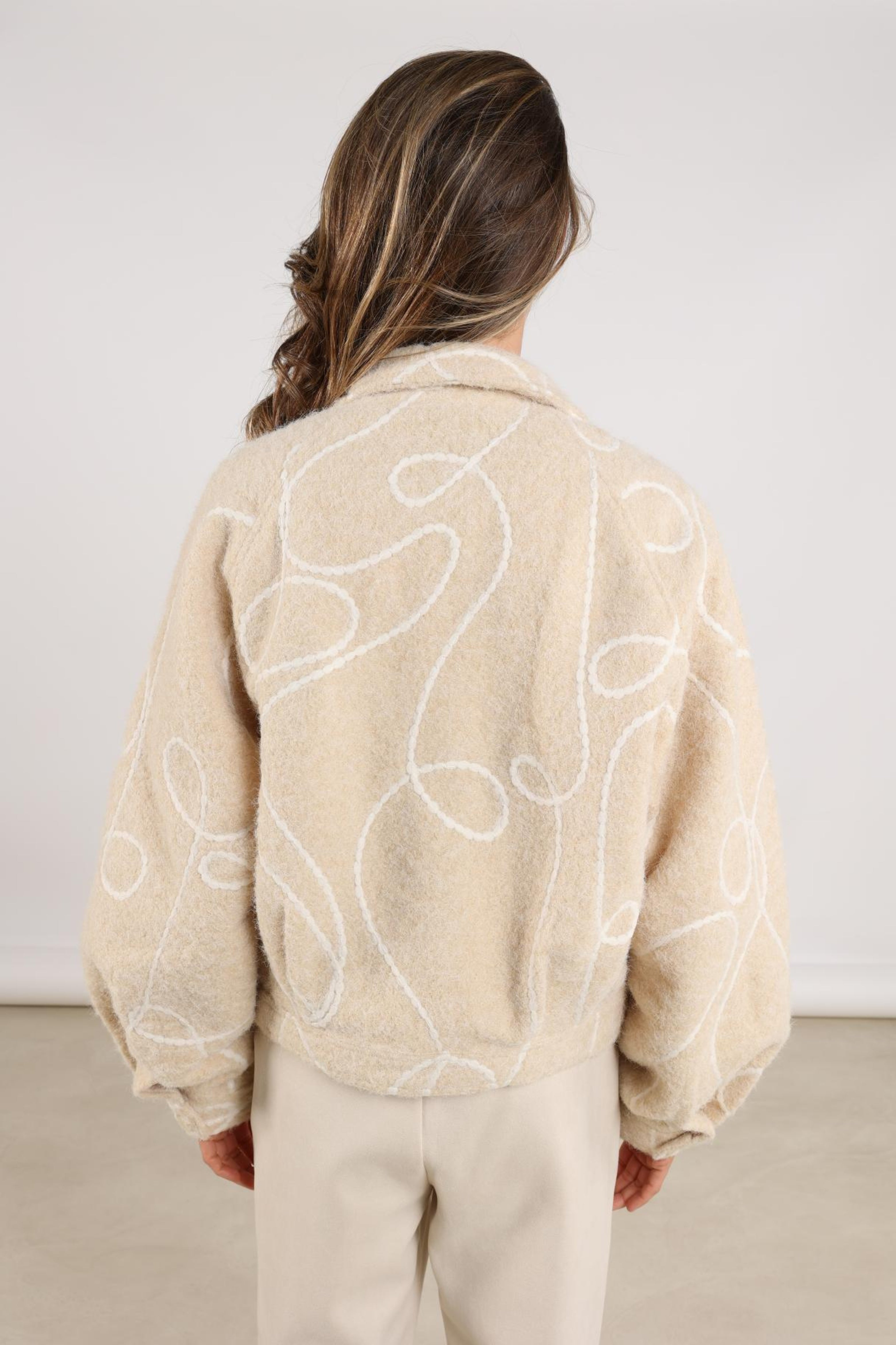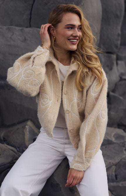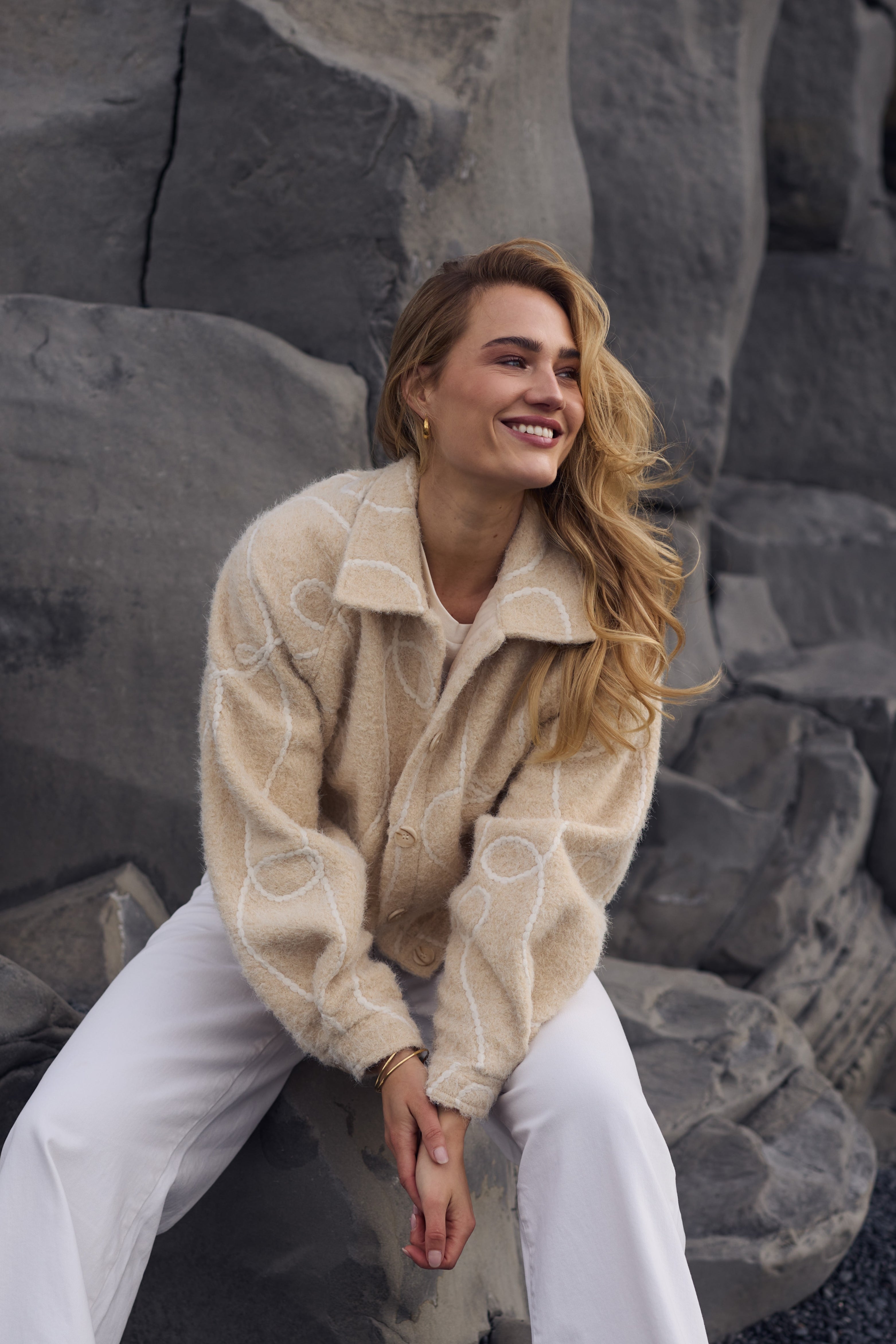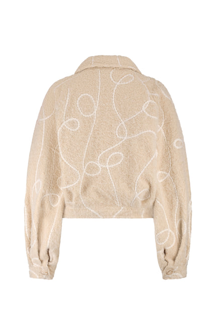 De Milou Sand jacket van Nukus is een zachte, cosy blikvanger. Het luchtige materiaal met speelse swirl-structuur en ballonmouwen geeft dit jasje een elegante, moderne look. Perfect voor herfst en winterlagen met stijl.