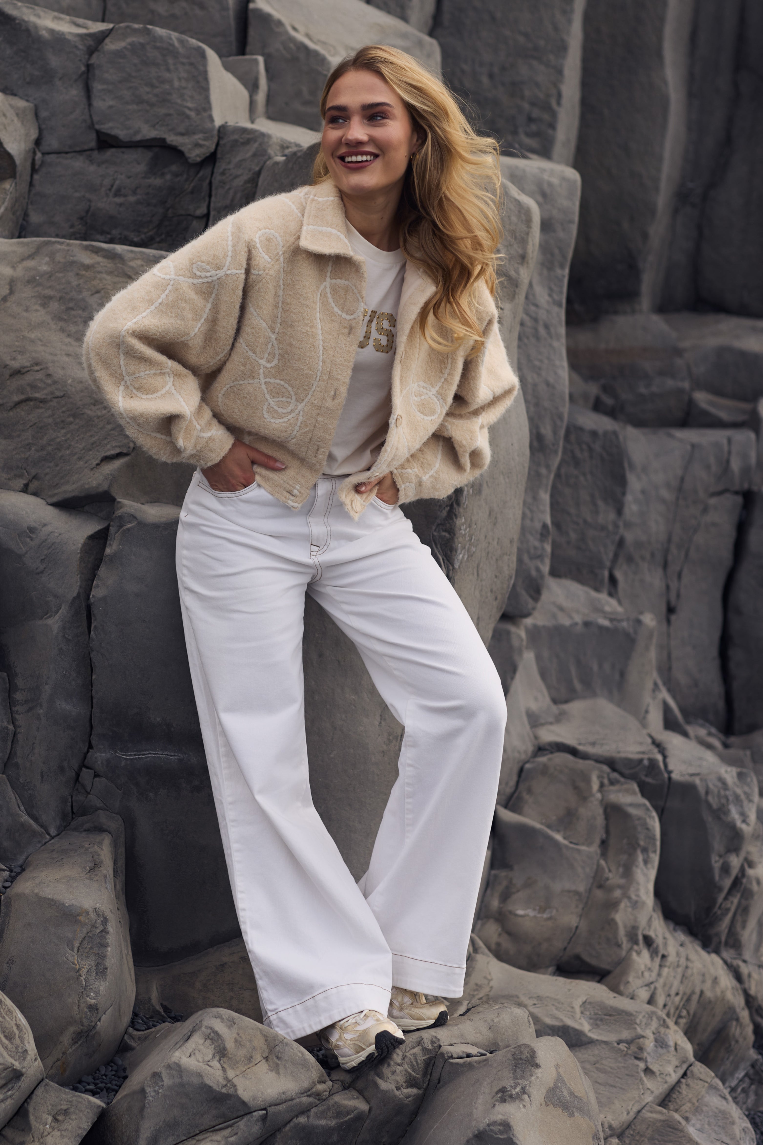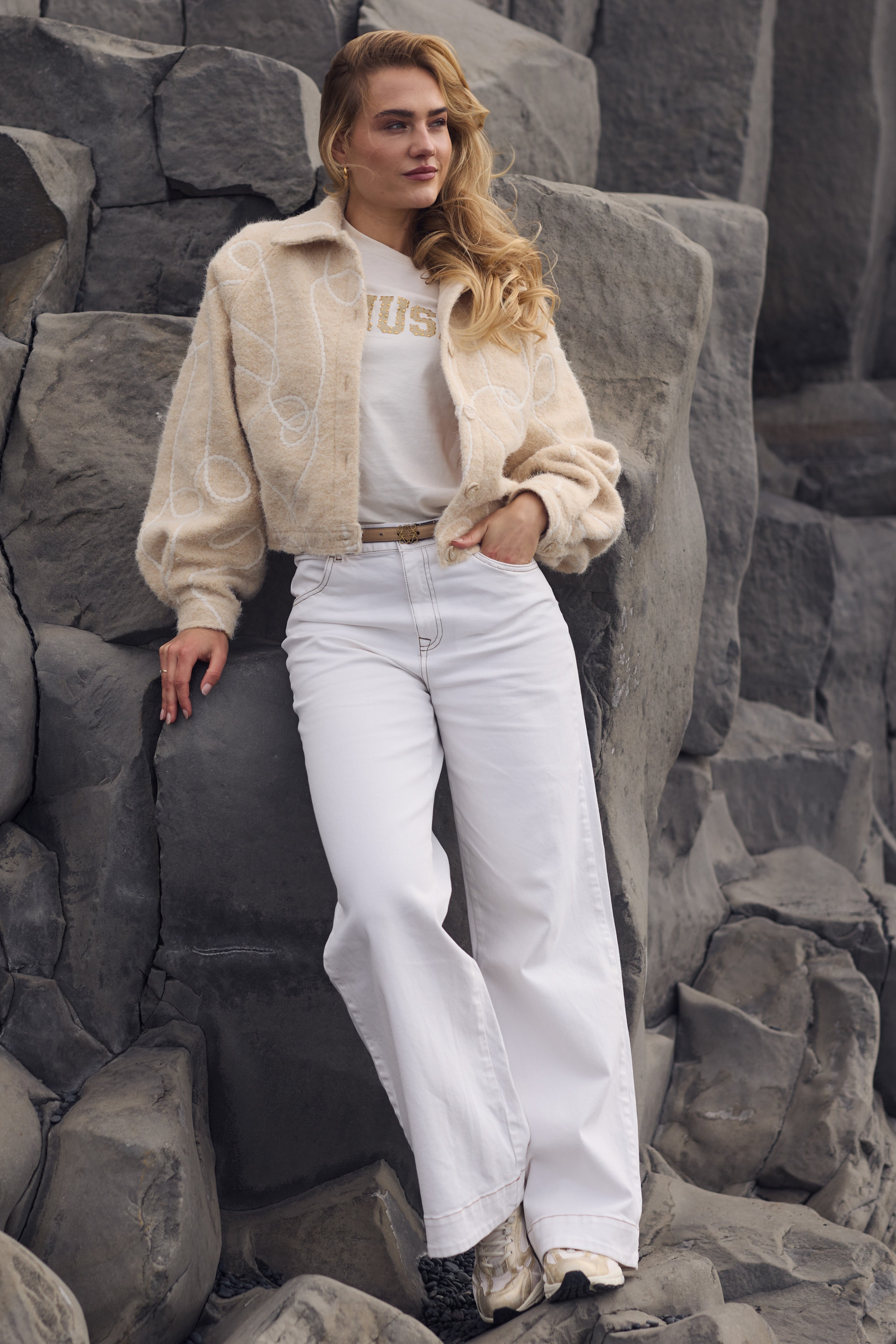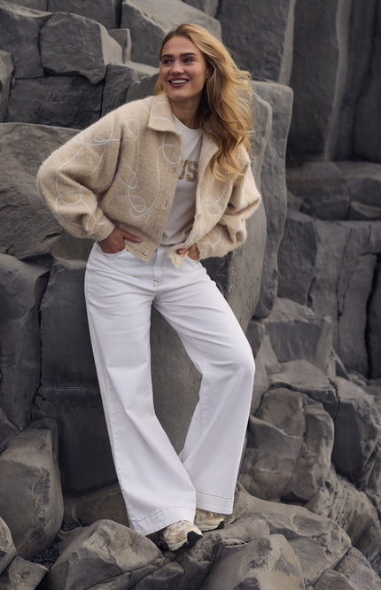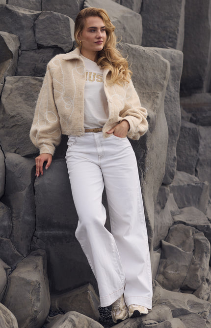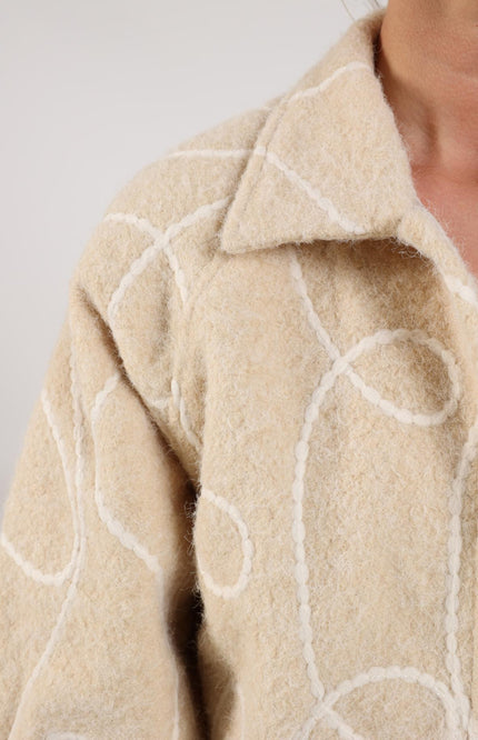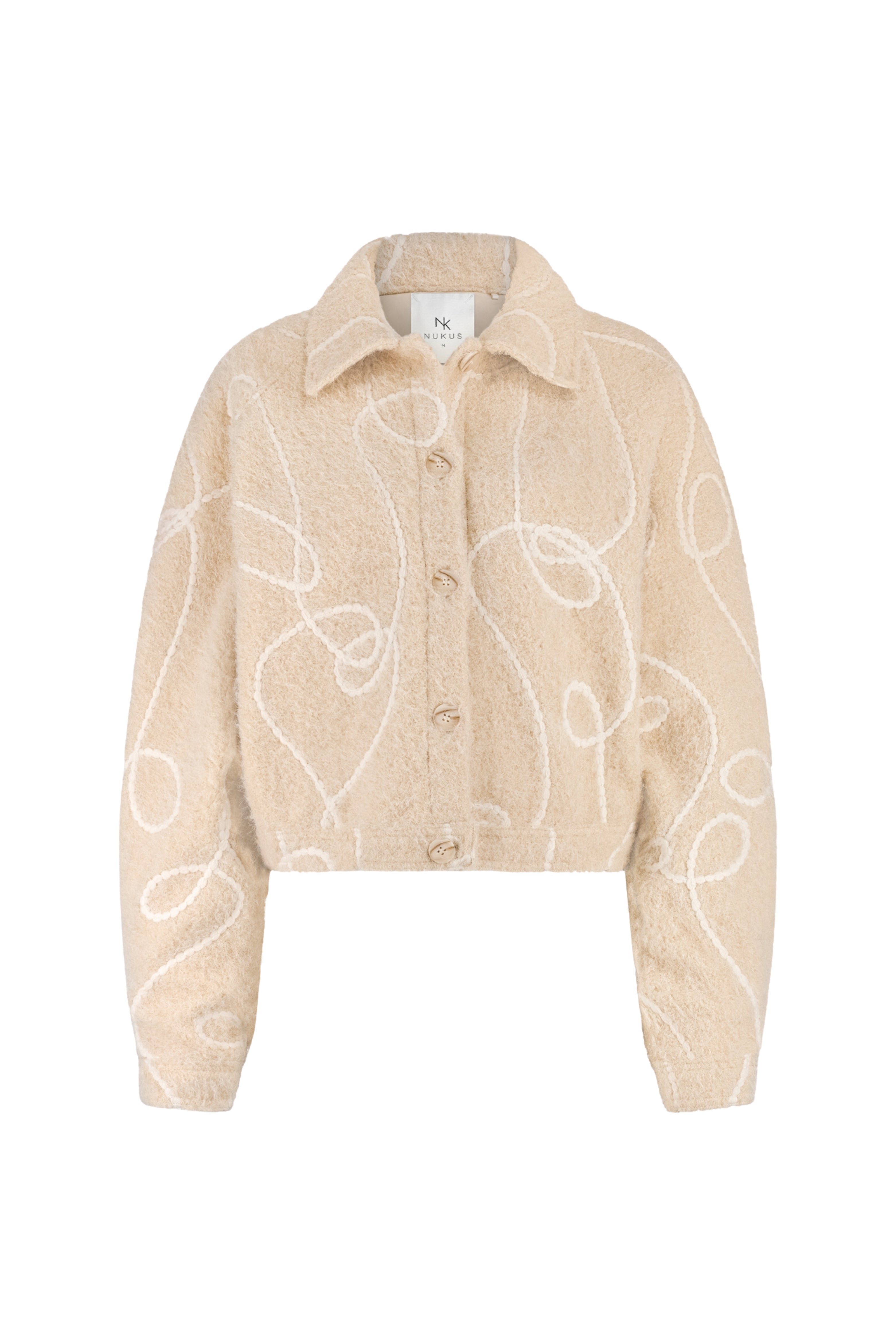 De Milou Sand jacket van Nukus is een zachte, cosy blikvanger. Het luchtige materiaal met speelse swirl-structuur en ballonmouwen geeft dit jasje een elegante, moderne look. Perfect voor herfst en winterlagen met stijl.