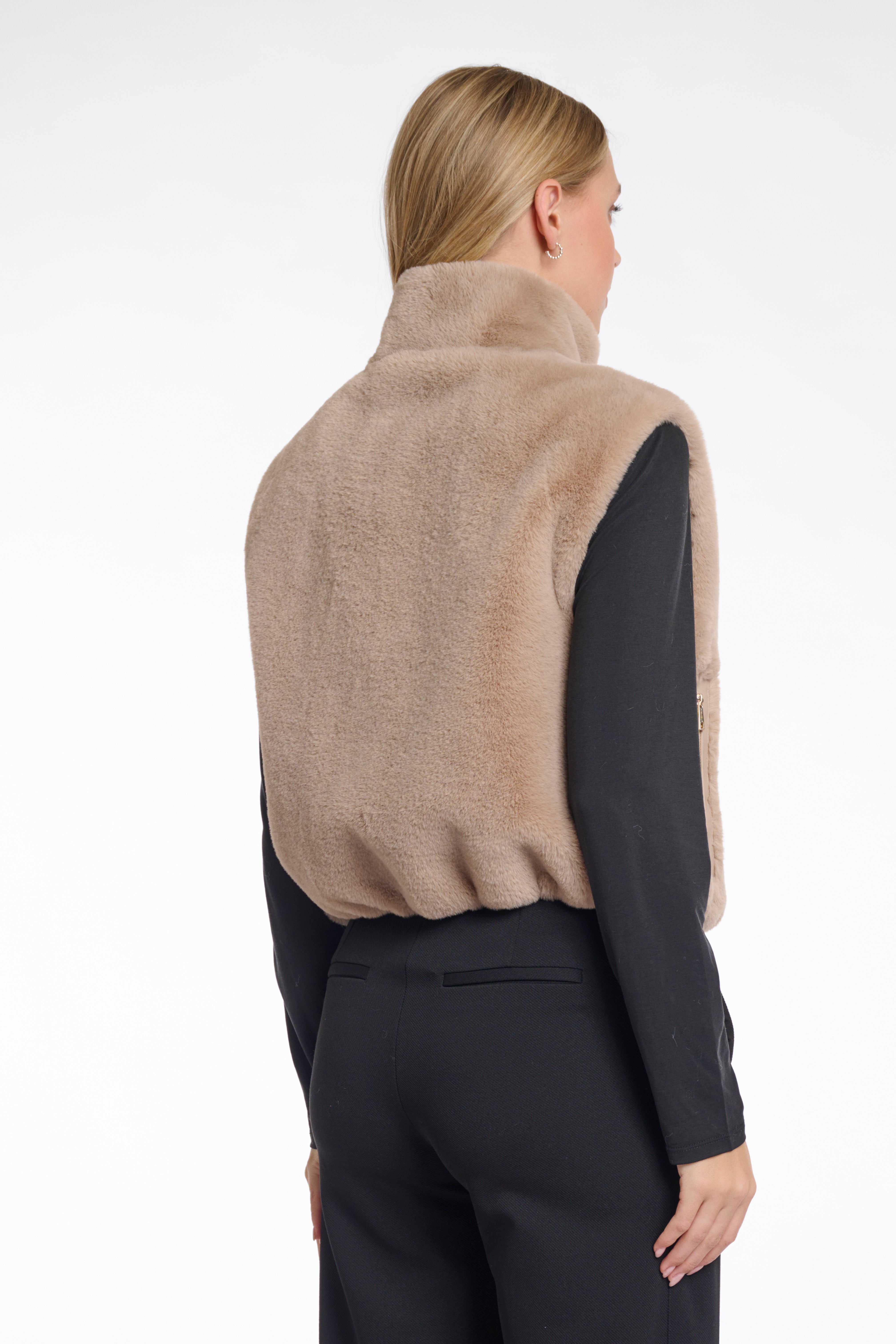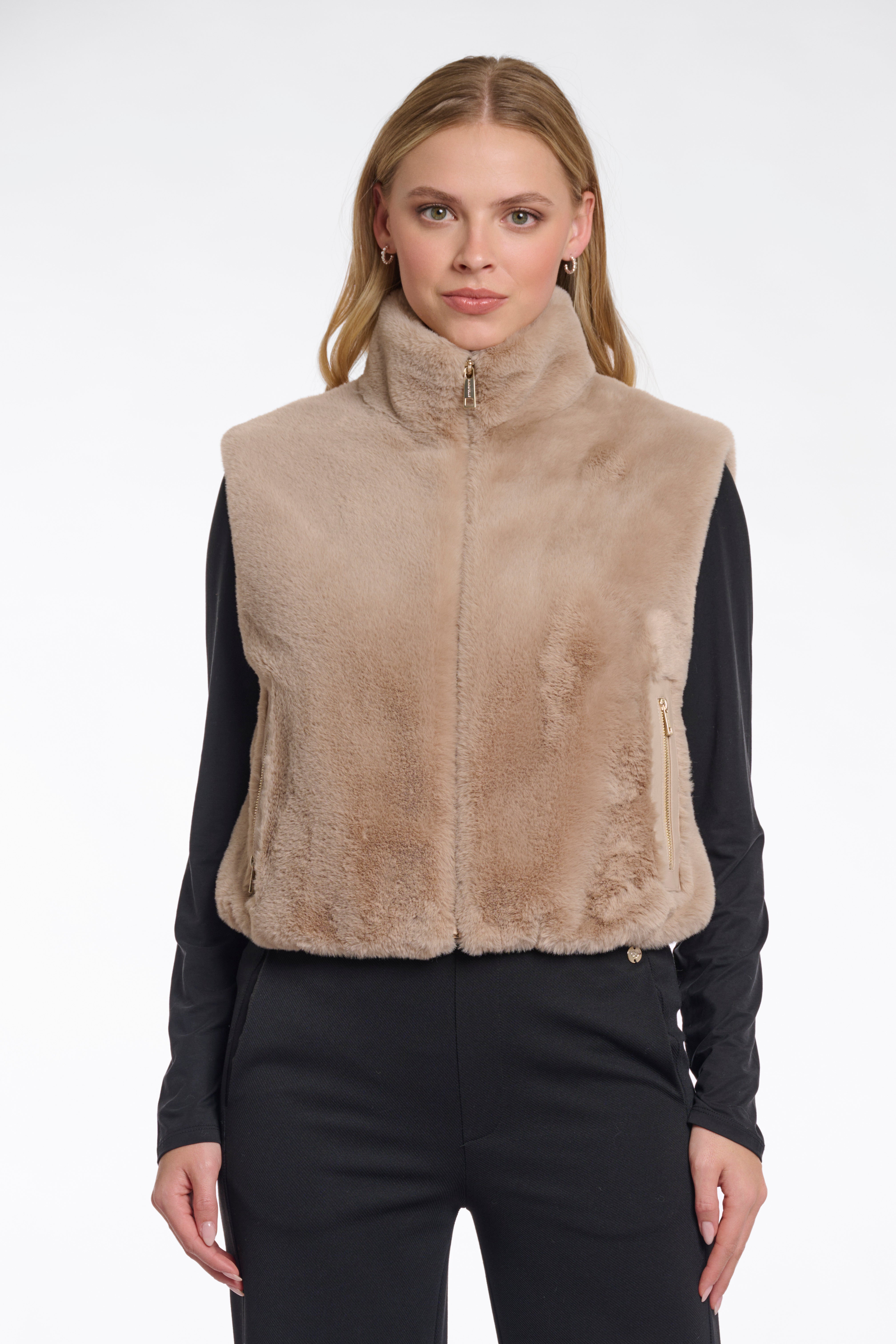 De Jacket Nikki Oat van Rino & Pelle is een elegant en veelzijdig faux-fur gilet. De warme, zachte stof en minimalistische afwerking maken dit mouwloze model ideaal om over een trui of blouse te dragen. Perfect voor een gelaagde herfst- of winterlook.