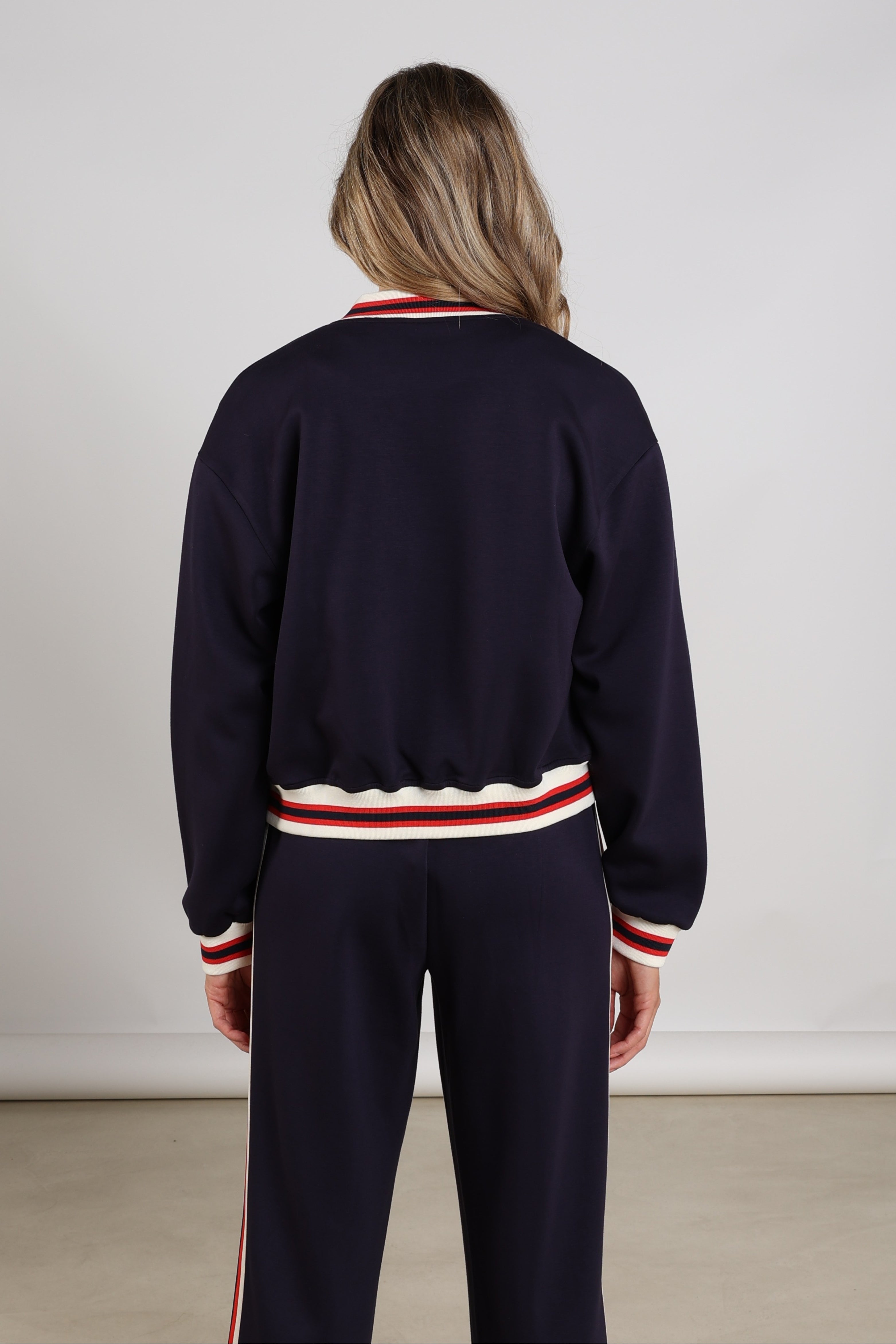 De Jacket Nina Navy van Nukus is een sportief vest met opstaande kraag. Contraststrepen in rib en een knoopsluiting geven een preppy, tijdloze look. Perfect voor casual dagen en weekend.