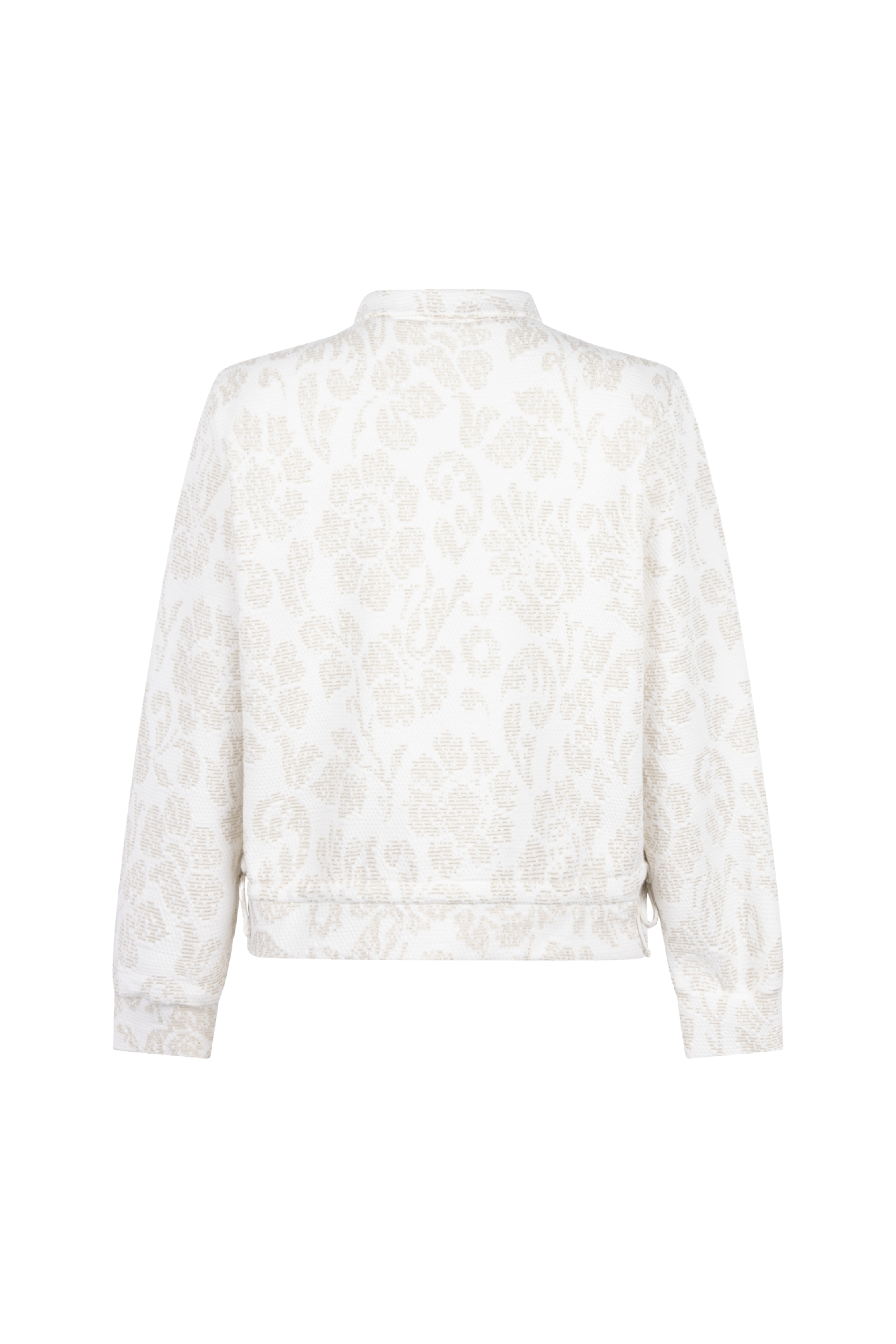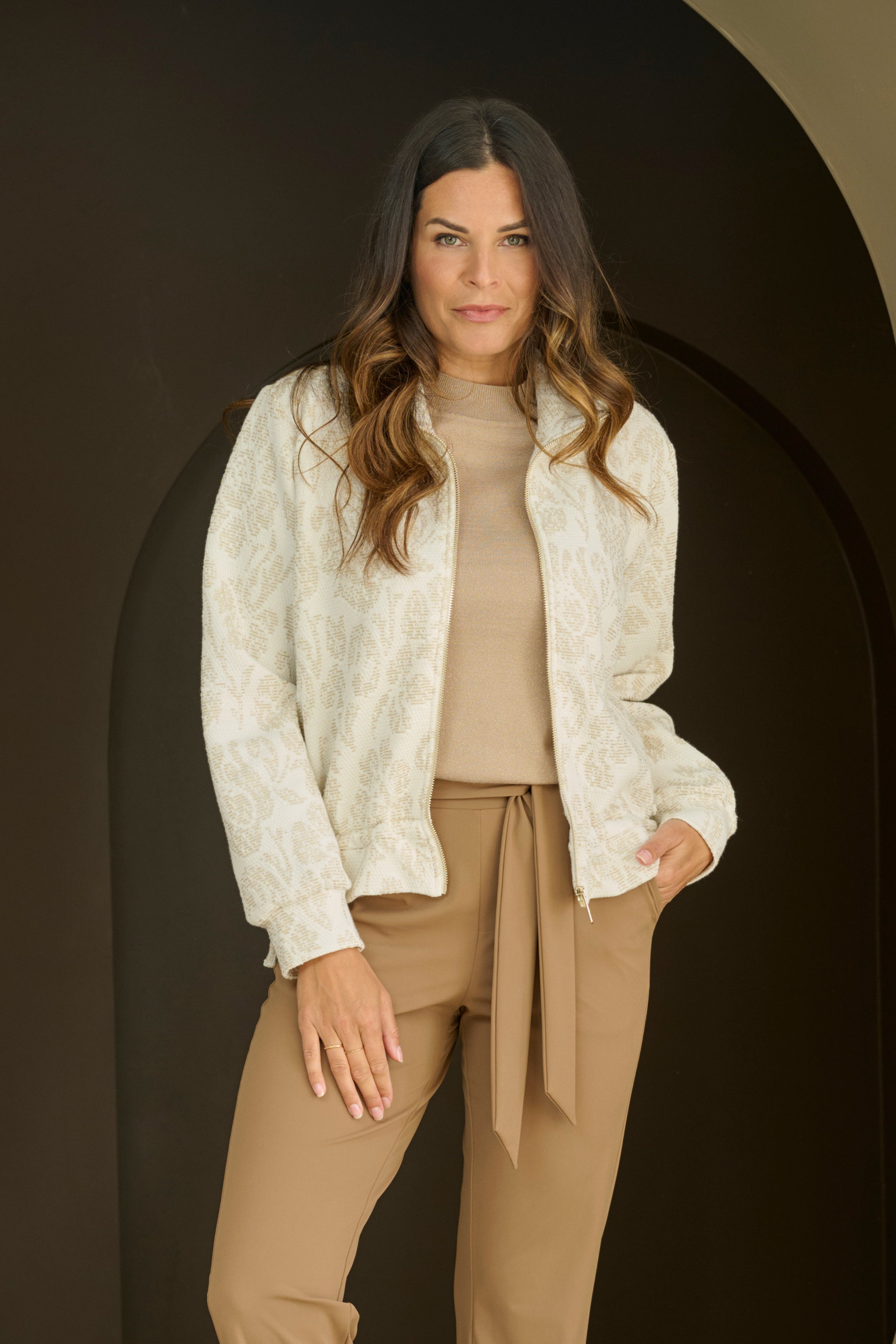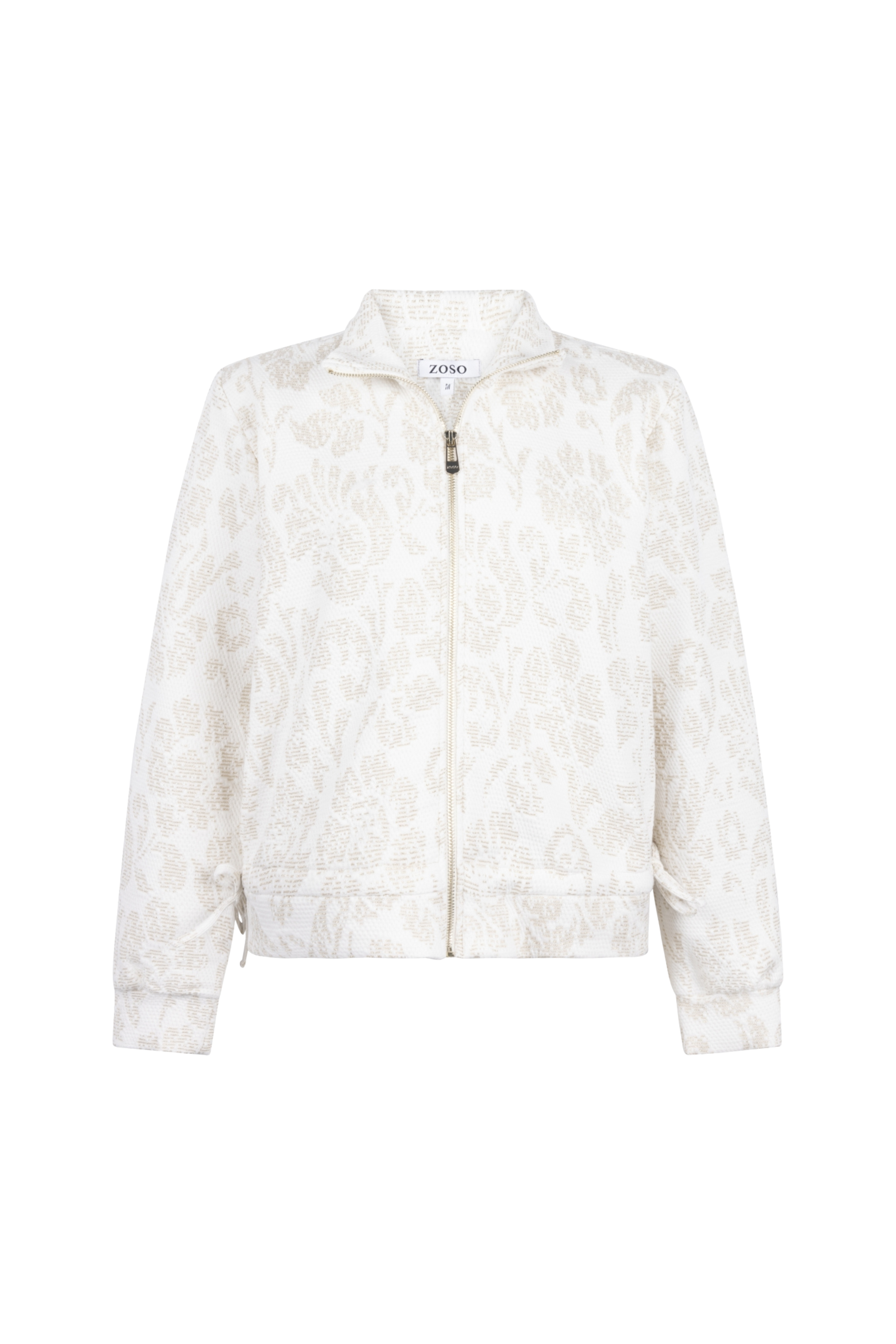 Jacket Nora Offwhite Gold van Zoso is een elegant jasje met opstaande kraag, ritssluiting en subtiele trekkoorden in de zoom. Het jacquard dessin in offwhite met gouden details geeft dit item een luxe uitstraling.