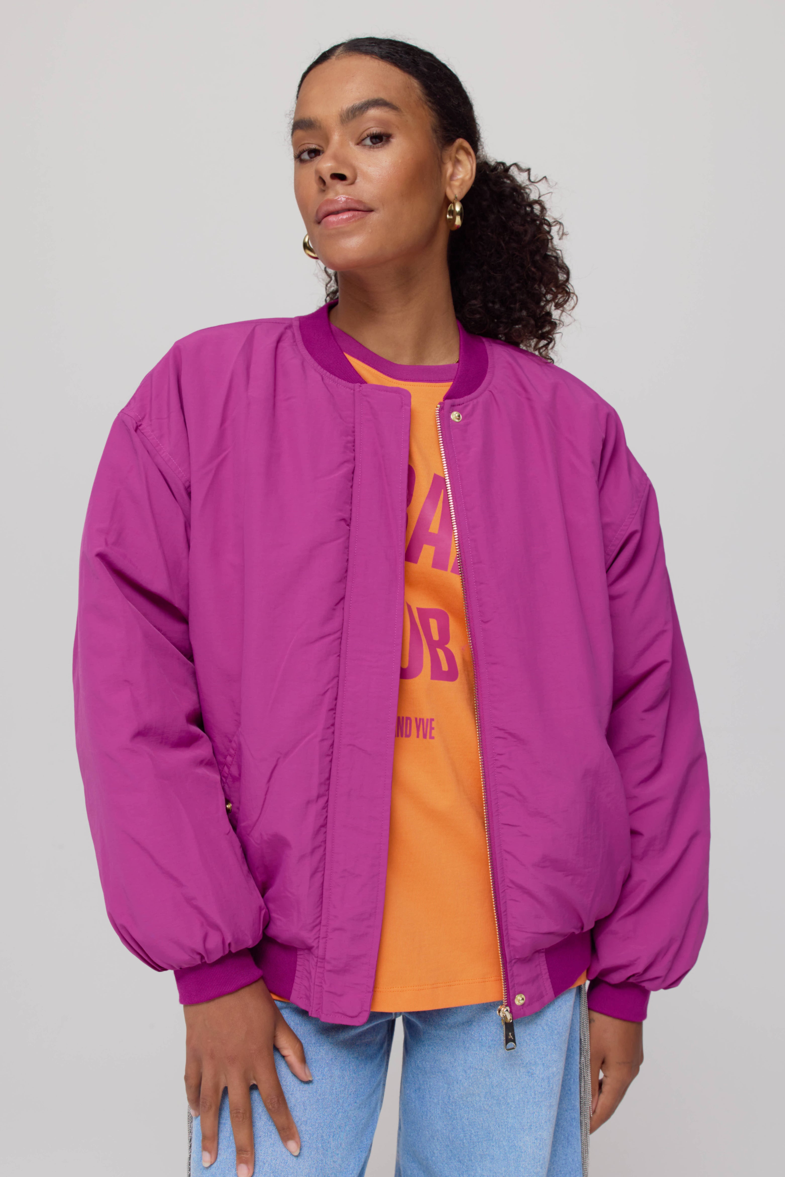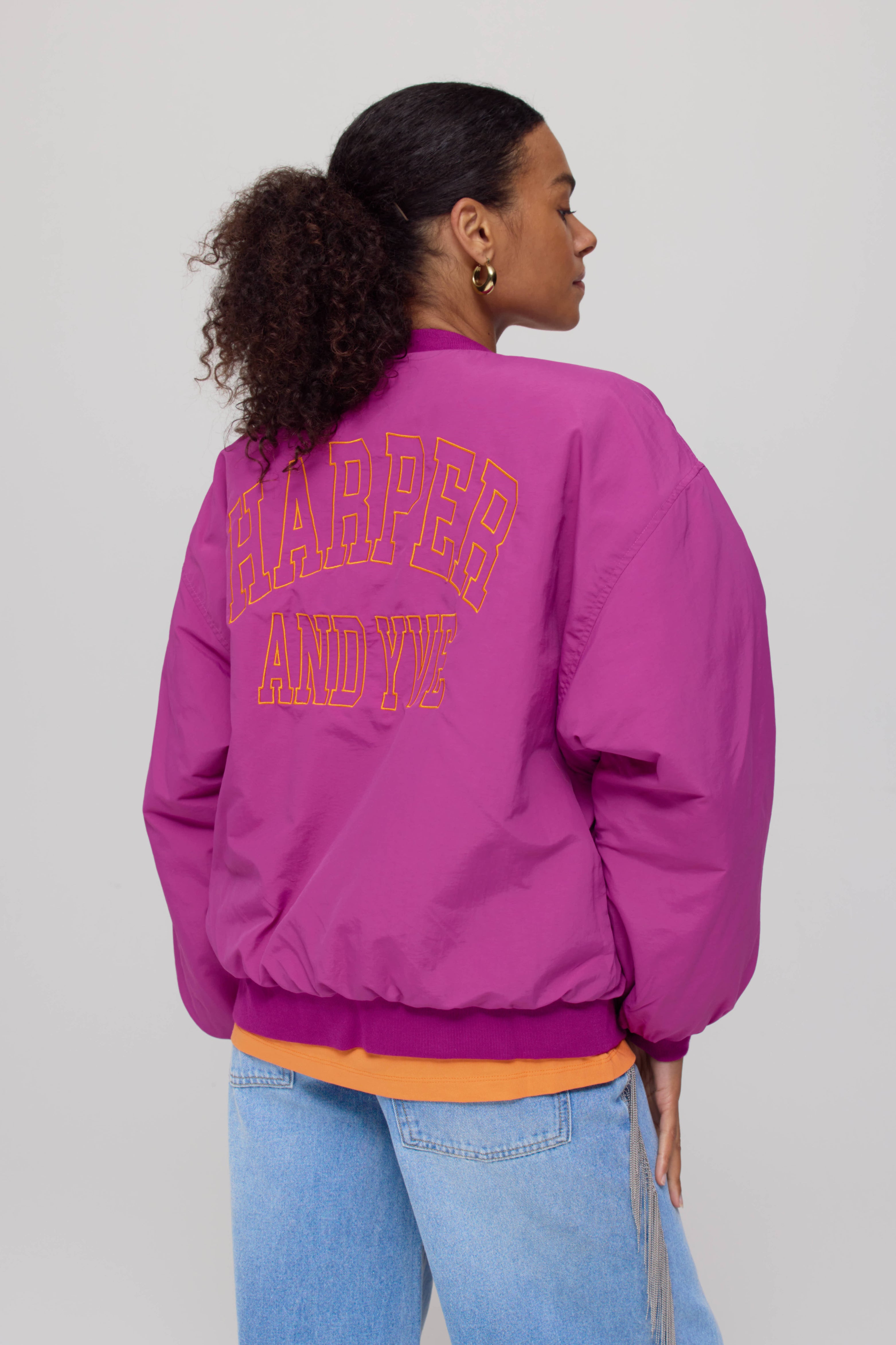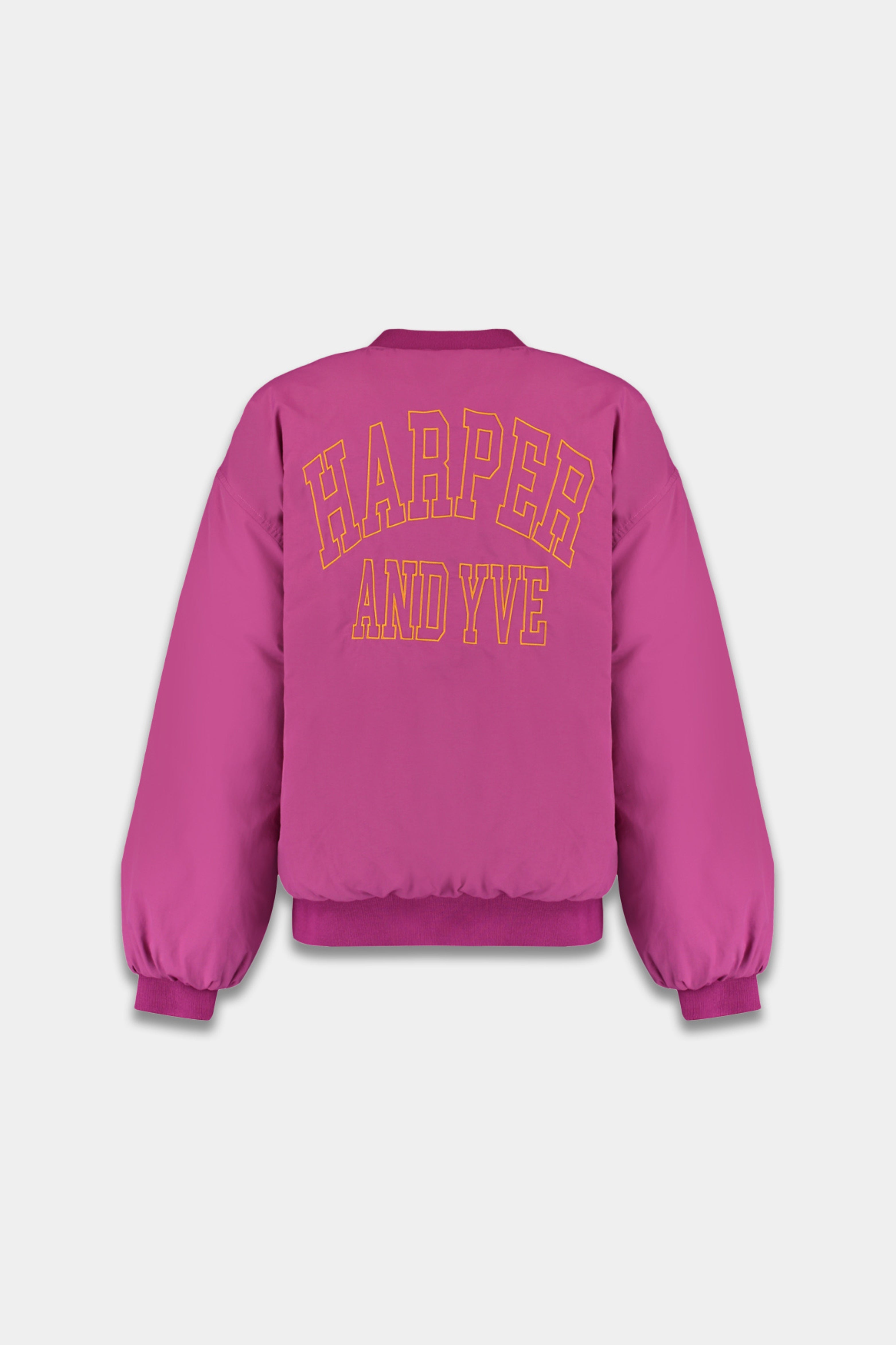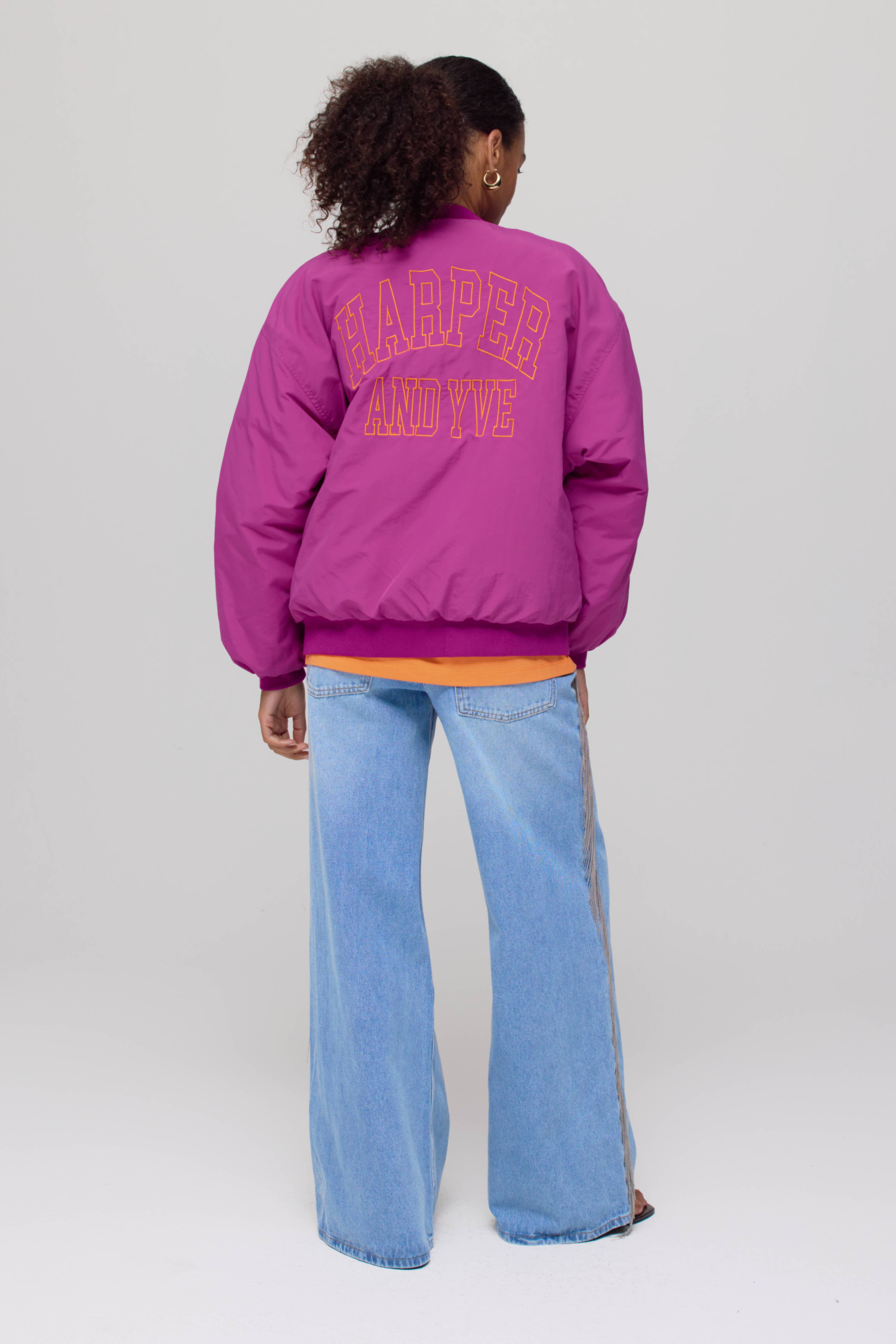 De Nora bomberjack in Wild Aster springt eruit met een opvallend roze tint en contrasterende gele “Harper and Yve” backprint. Stoer, speels en super comfortabel. De ultieme streetstyle essential voor het nieuwe seizoen.