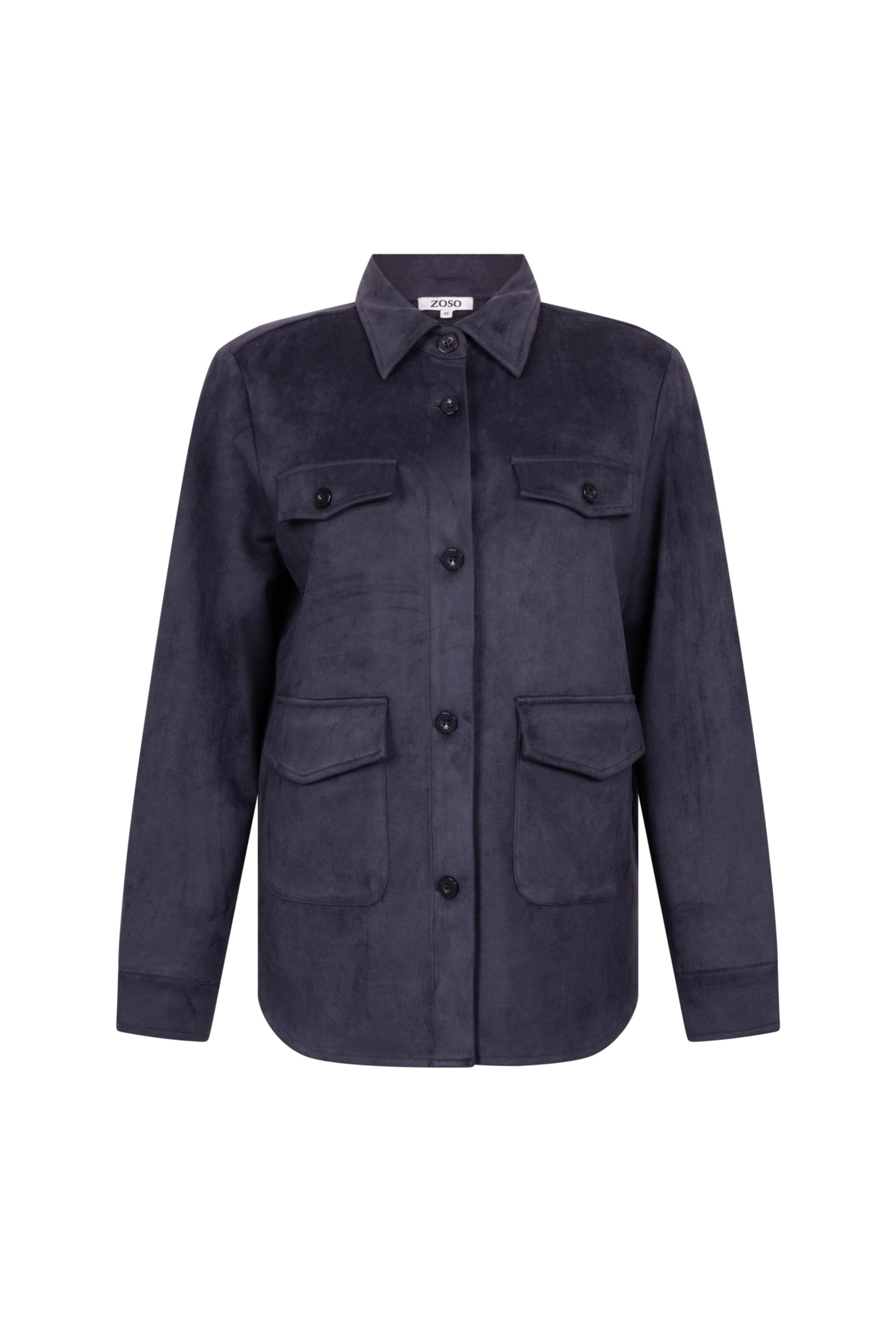 De Jacket Pamela Navy van ZOSO is een stijlvolle, veelzijdige jas met een zachte suède-look. Dit tijdloze ontwerp is uitgevoerd in een diepe navy kleur en voorzien van een klassieke kraag en knoopsluiting aan de voorzijde.