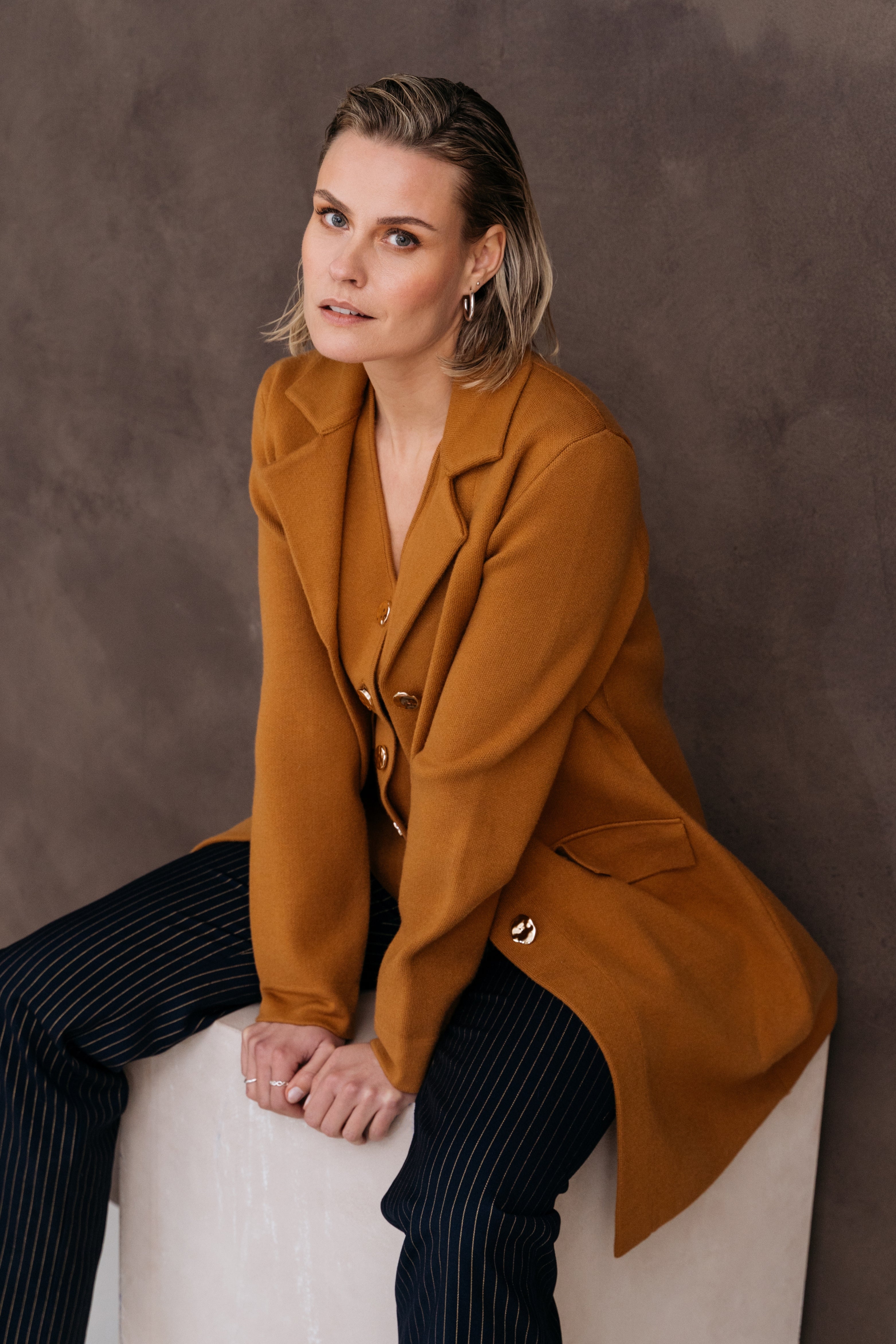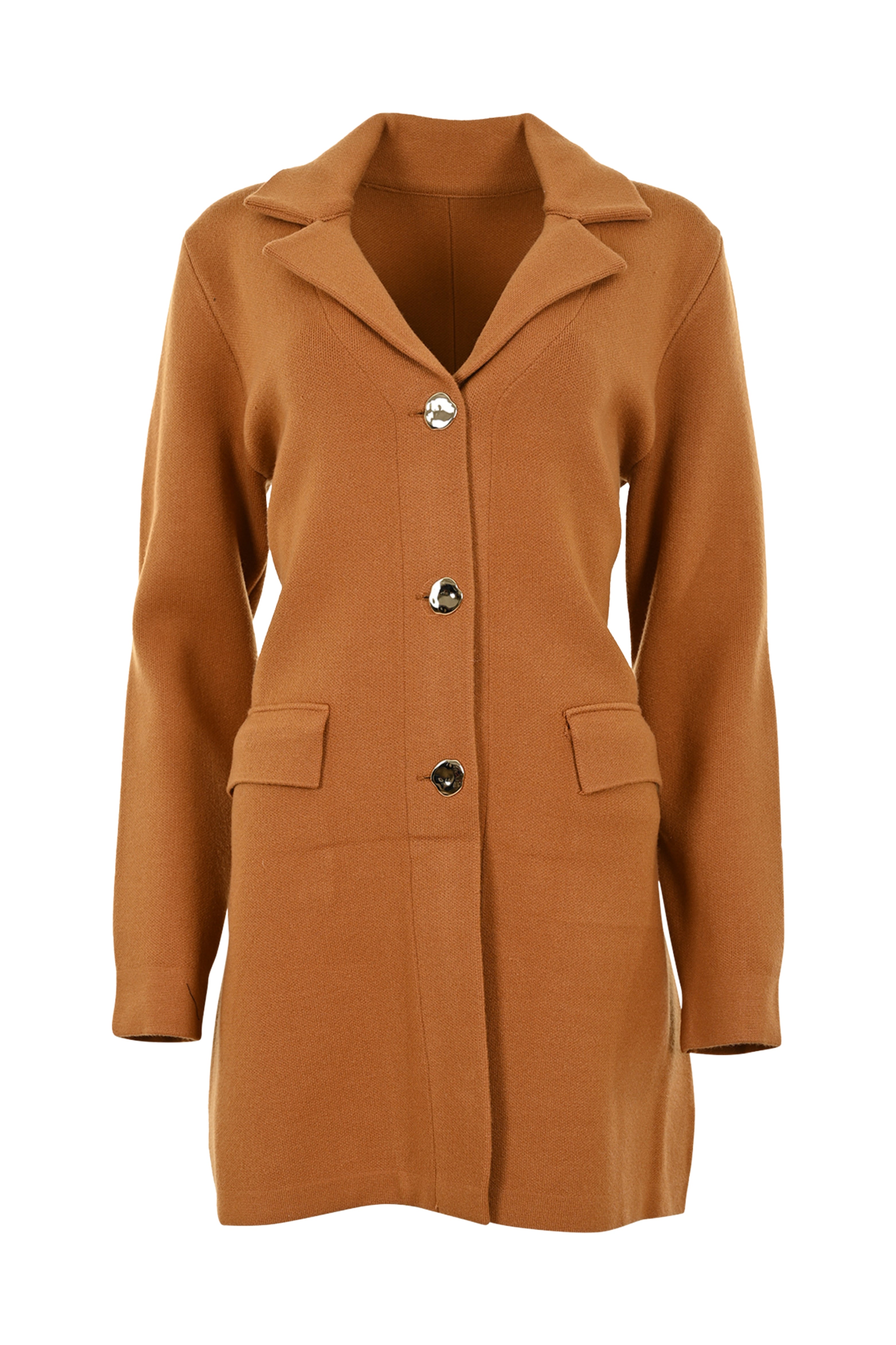Jacket Pane Apple Cinnamon van Maicazz is een stijlvolle lange blazer in een warme kaneelkleur. Met klassieke revers, elegante knopen en praktische zakken combineert dit jasje perfect draagcomfort met een chique uitstraling.
