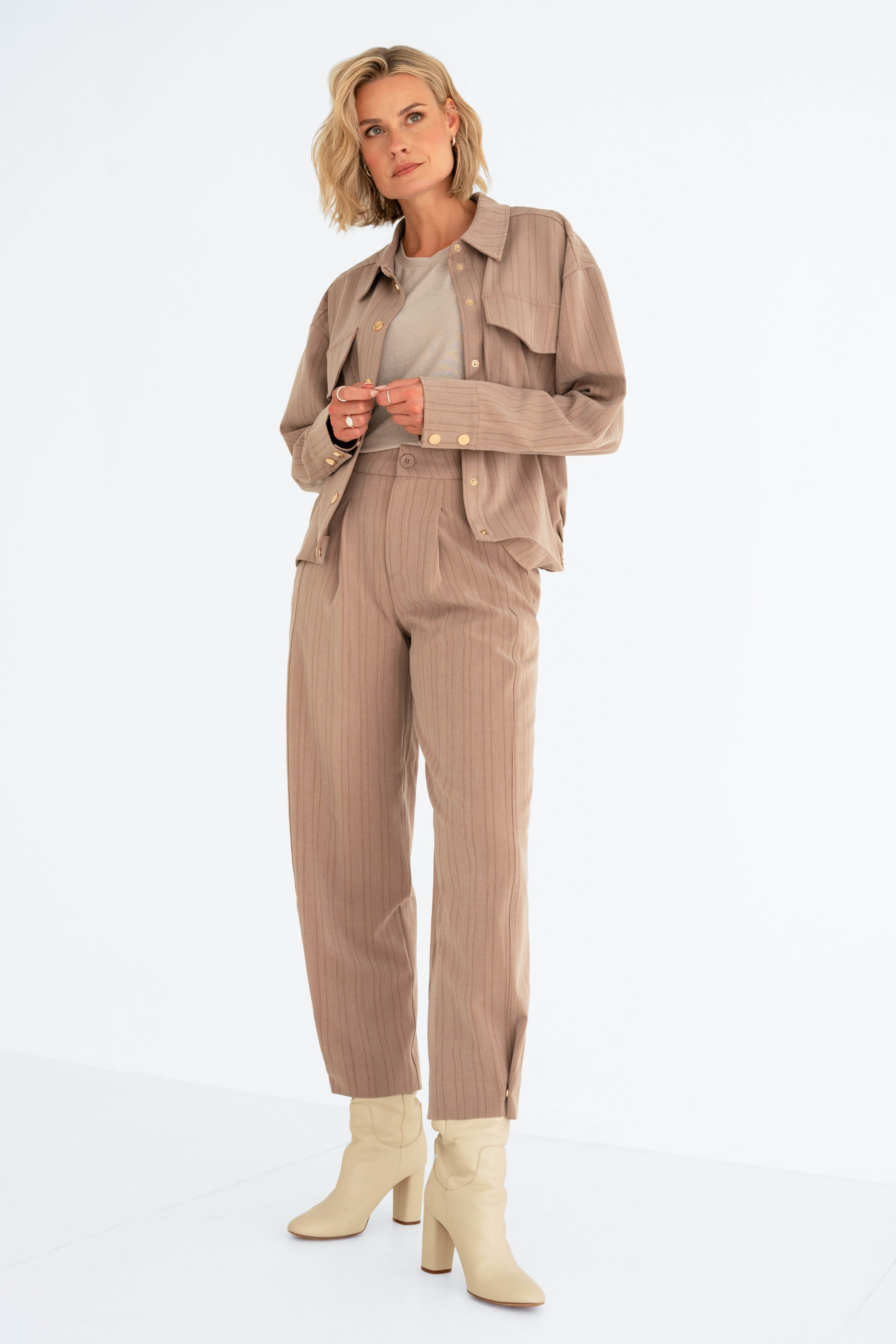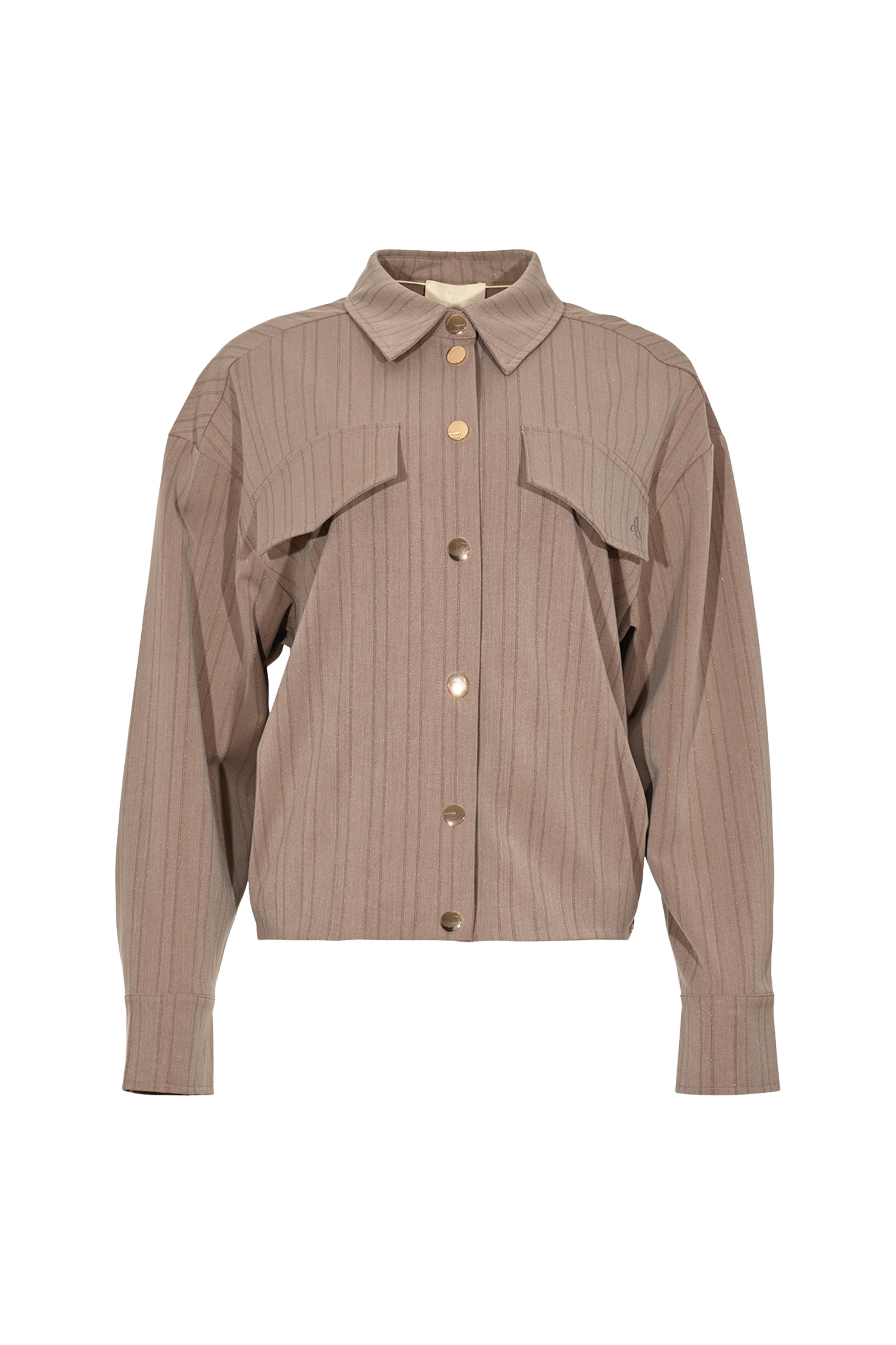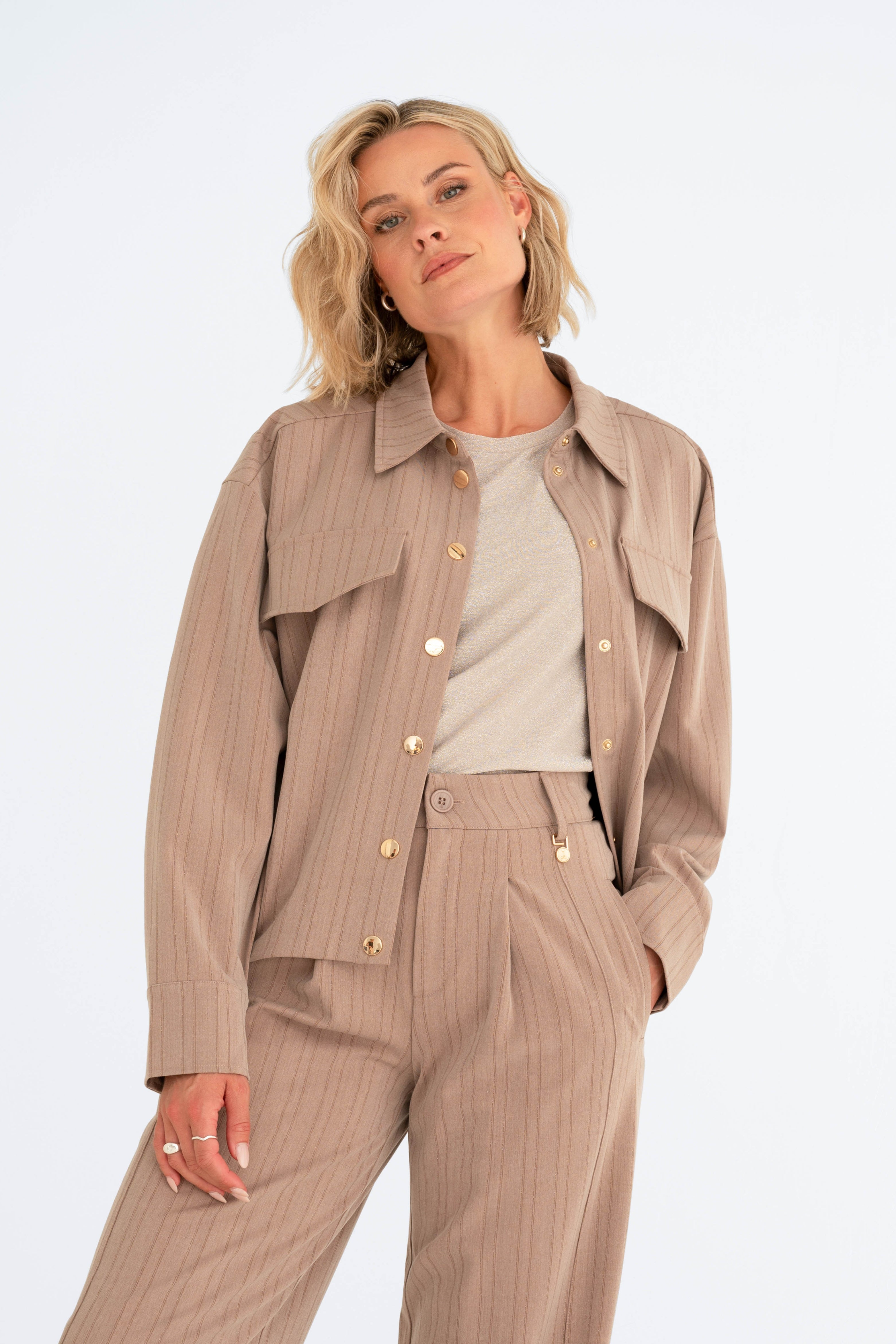 De Jacket Saley Mocca Mouse is een stijlvol kort jasje met een verfijnde uitstraling. De subtiele verticale structuur in de stof en de goudkleurige knopen geven dit item een elegante touch. Dankzij de boxy fit en zachte tint is dit jasje perfect om zowel casual als chic te combineren.