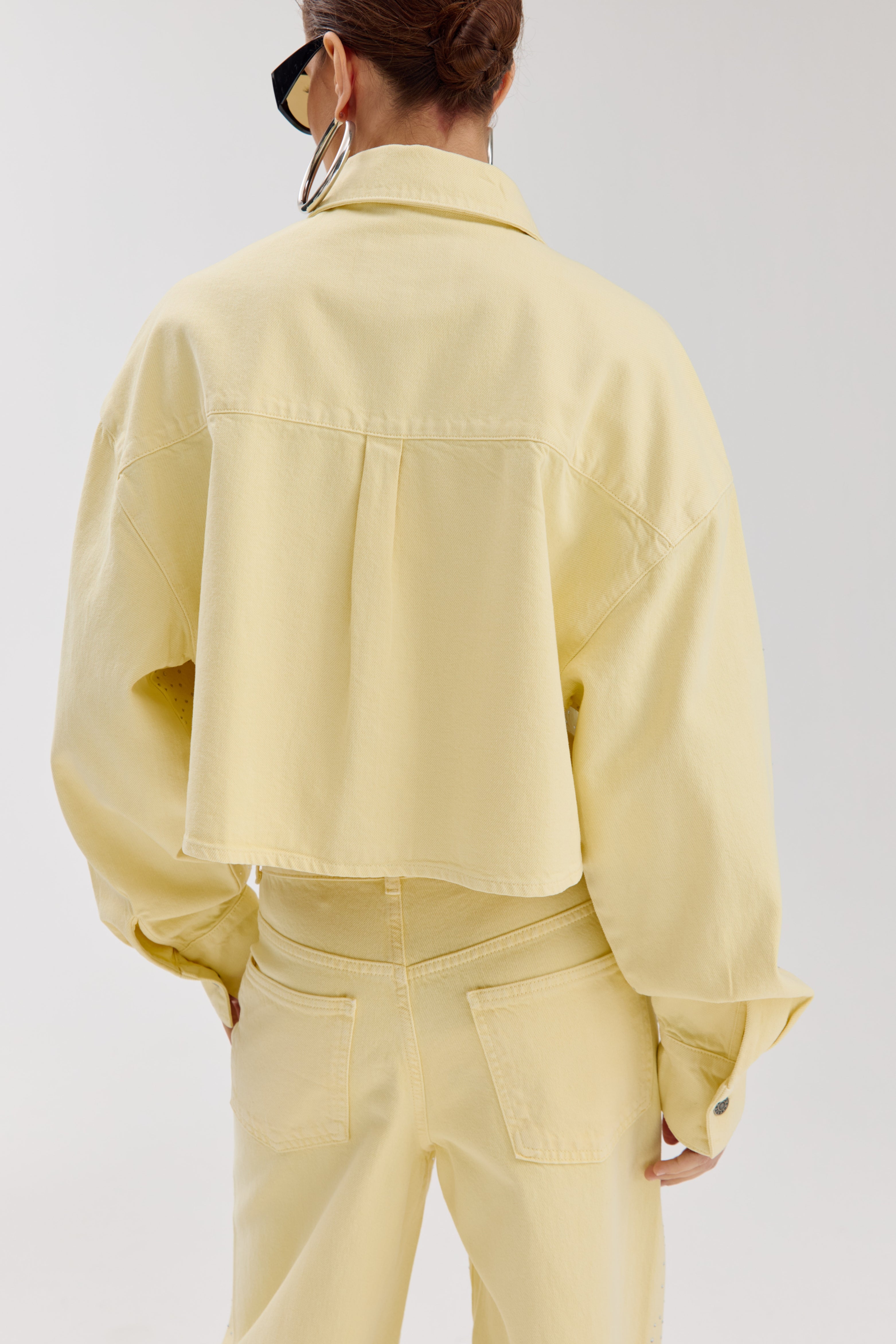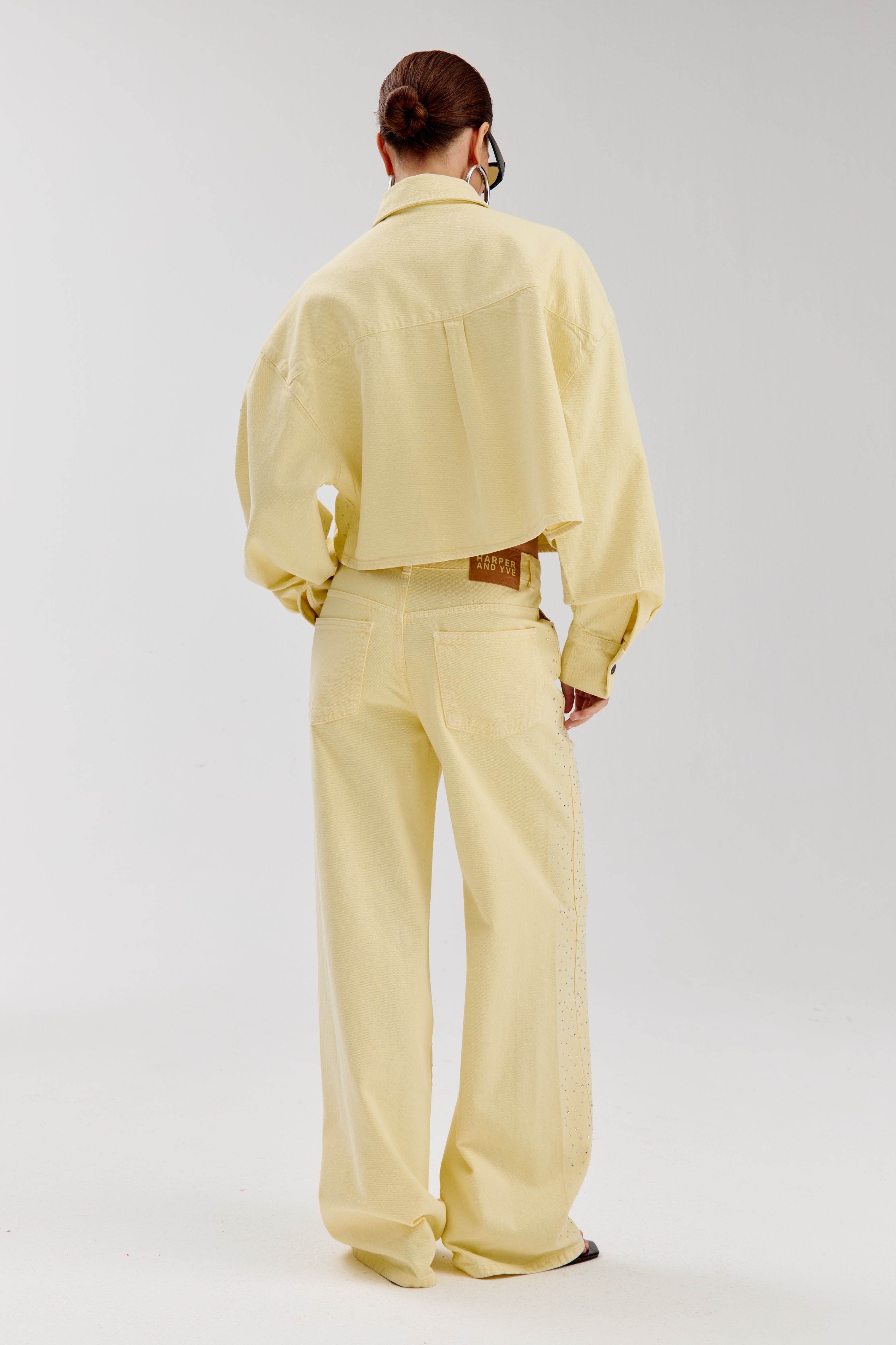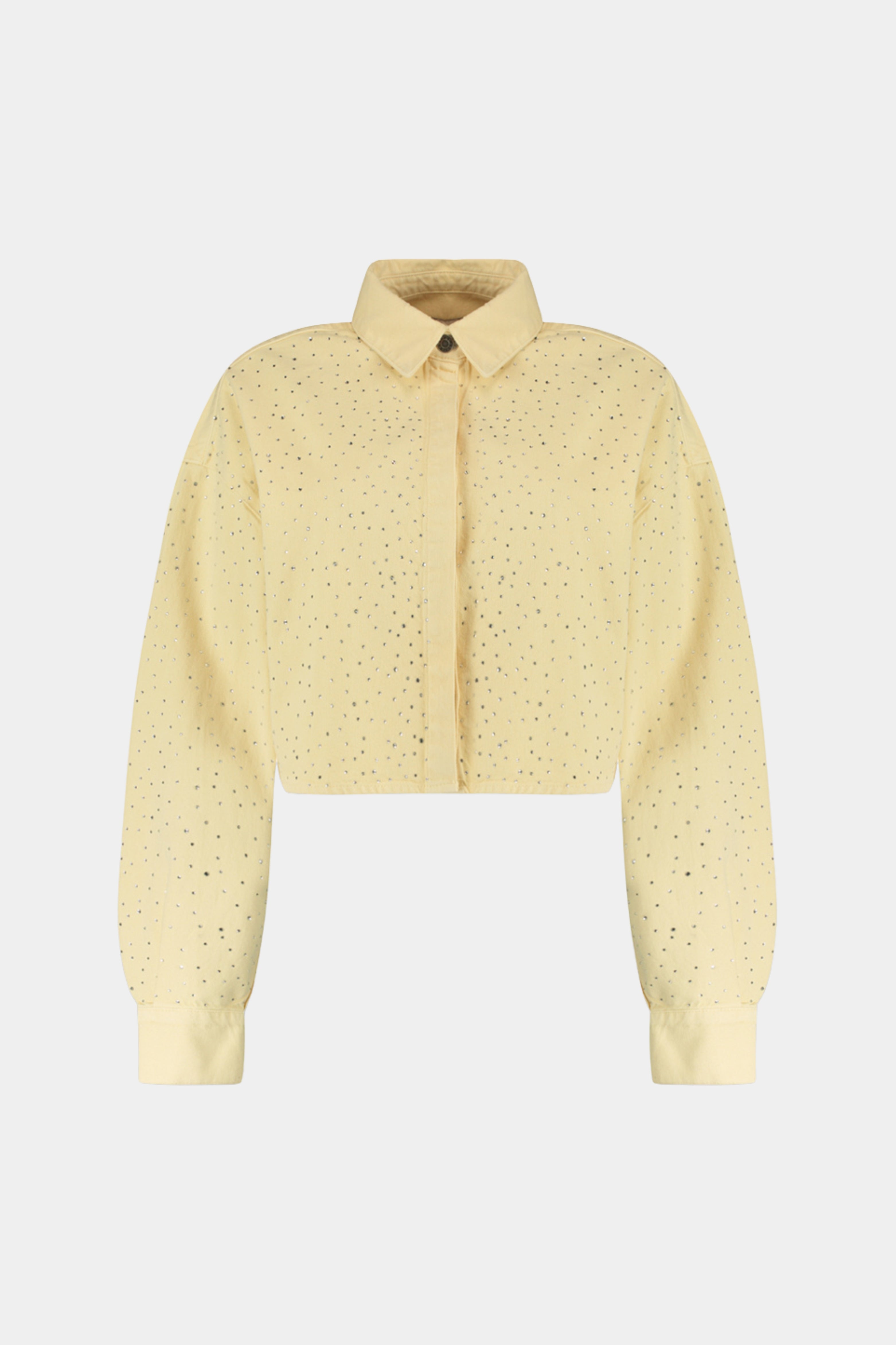 De Jacket Sam Light Yellow van Harper & Yve is een cropped jasje in zachtgeel denim, afgewerkt met studs. De boxy fit en klassieke kraag geven het item een frisse, opvallende uitstraling.