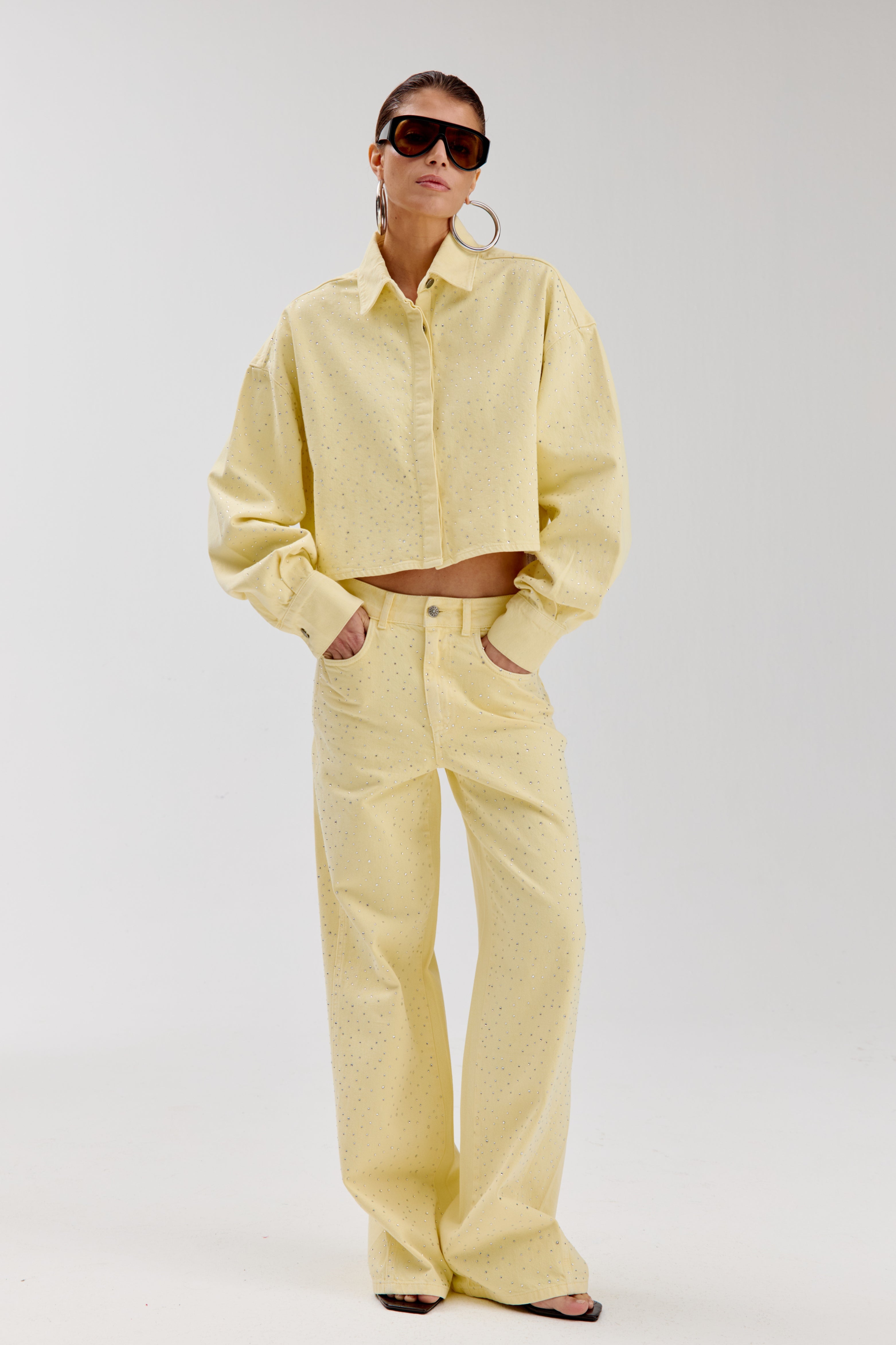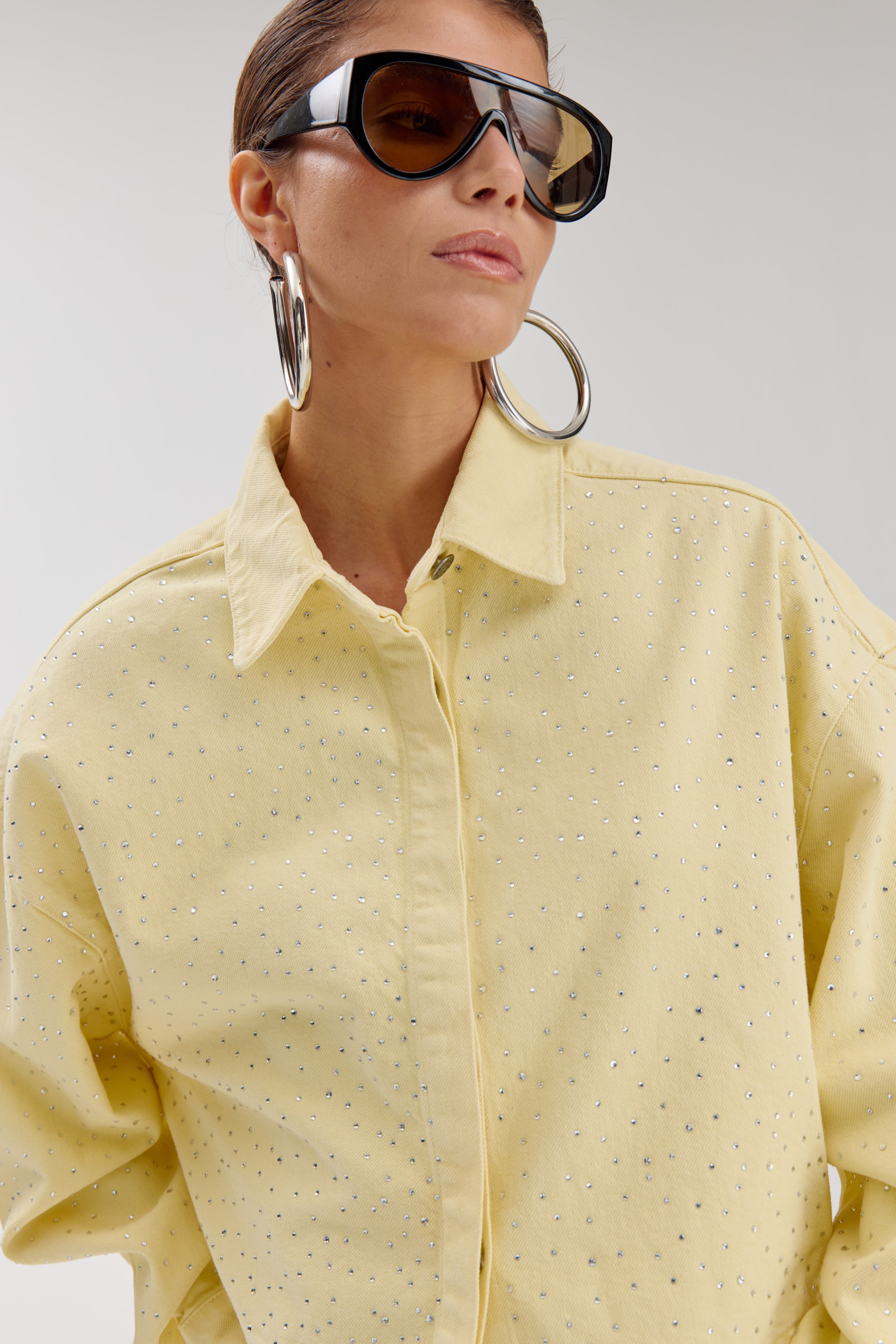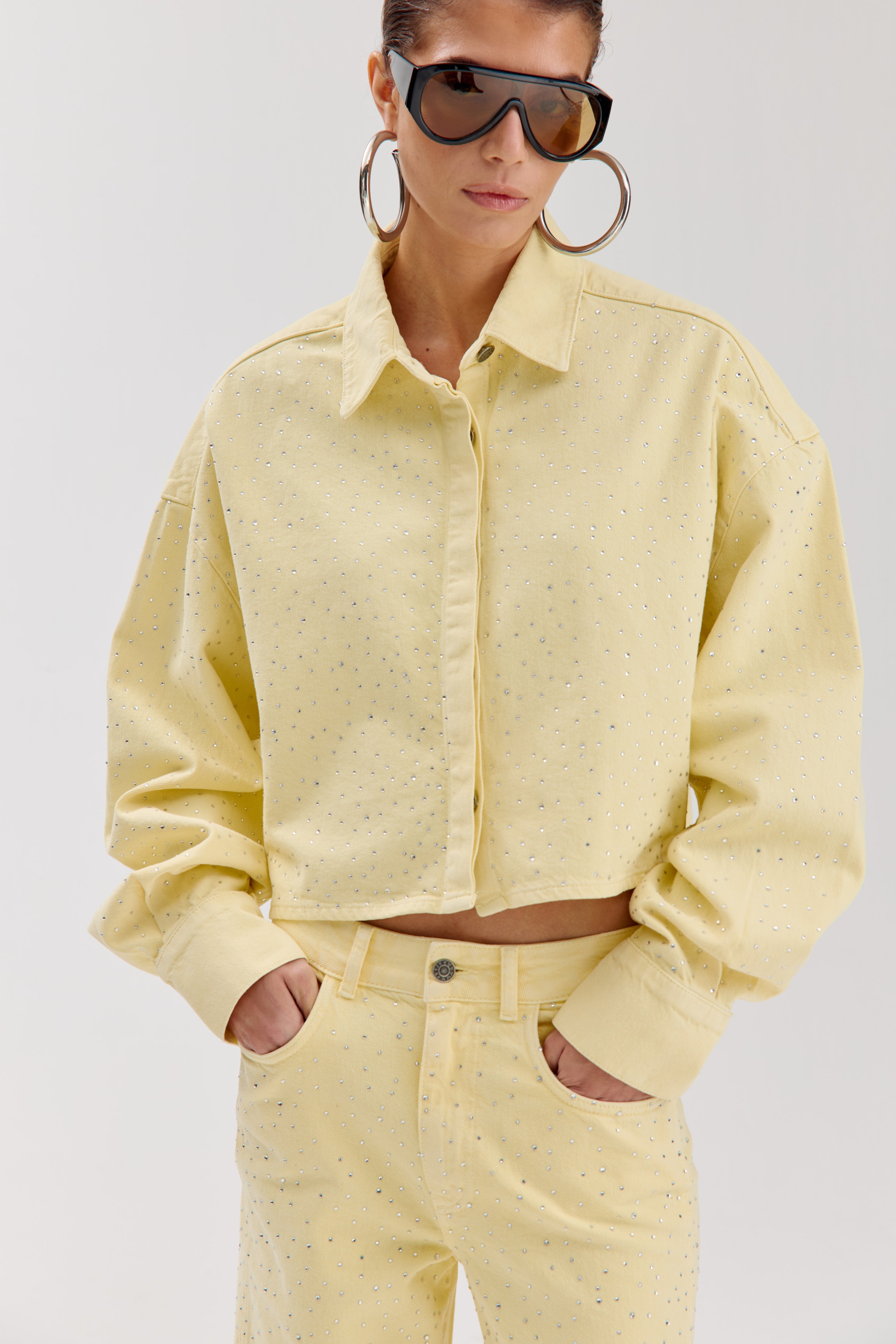 De Jacket Sam Light Yellow van Harper & Yve is een cropped jasje in zachtgeel denim, afgewerkt met studs. De boxy fit en klassieke kraag geven het item een frisse, opvallende uitstraling.