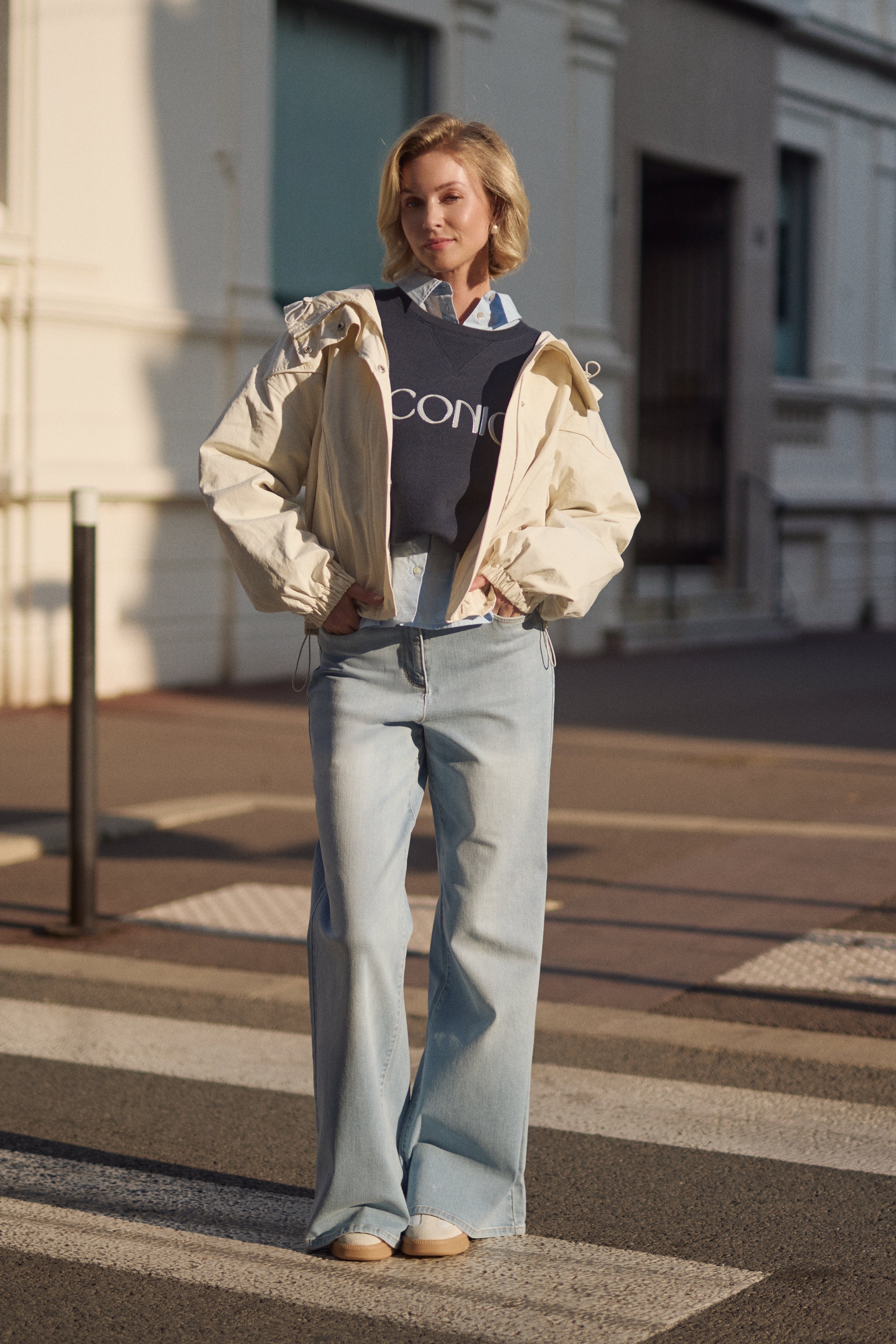 • Het ecom model is 173 cm, het campagne model is 174 cm, beiden dragen maat M