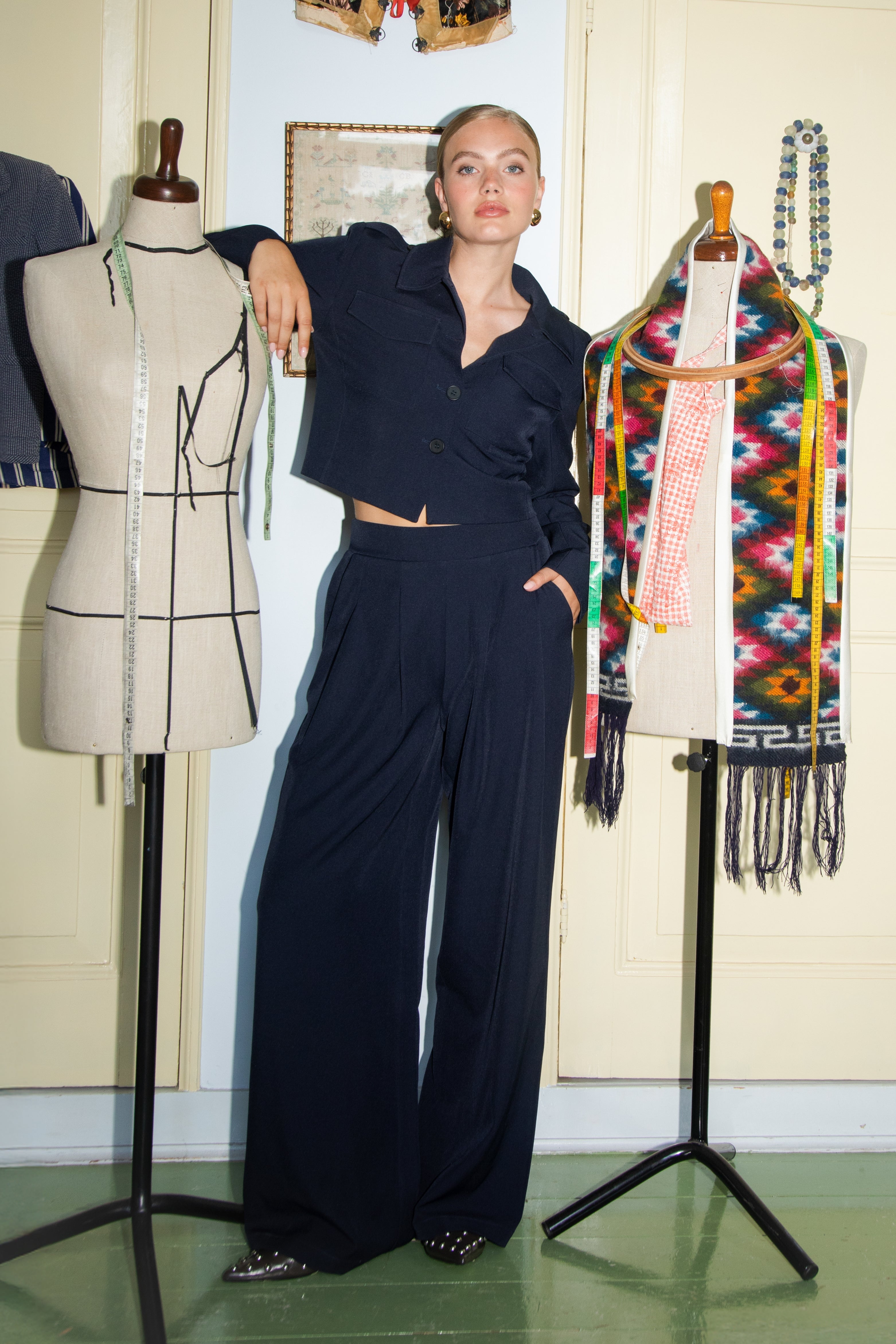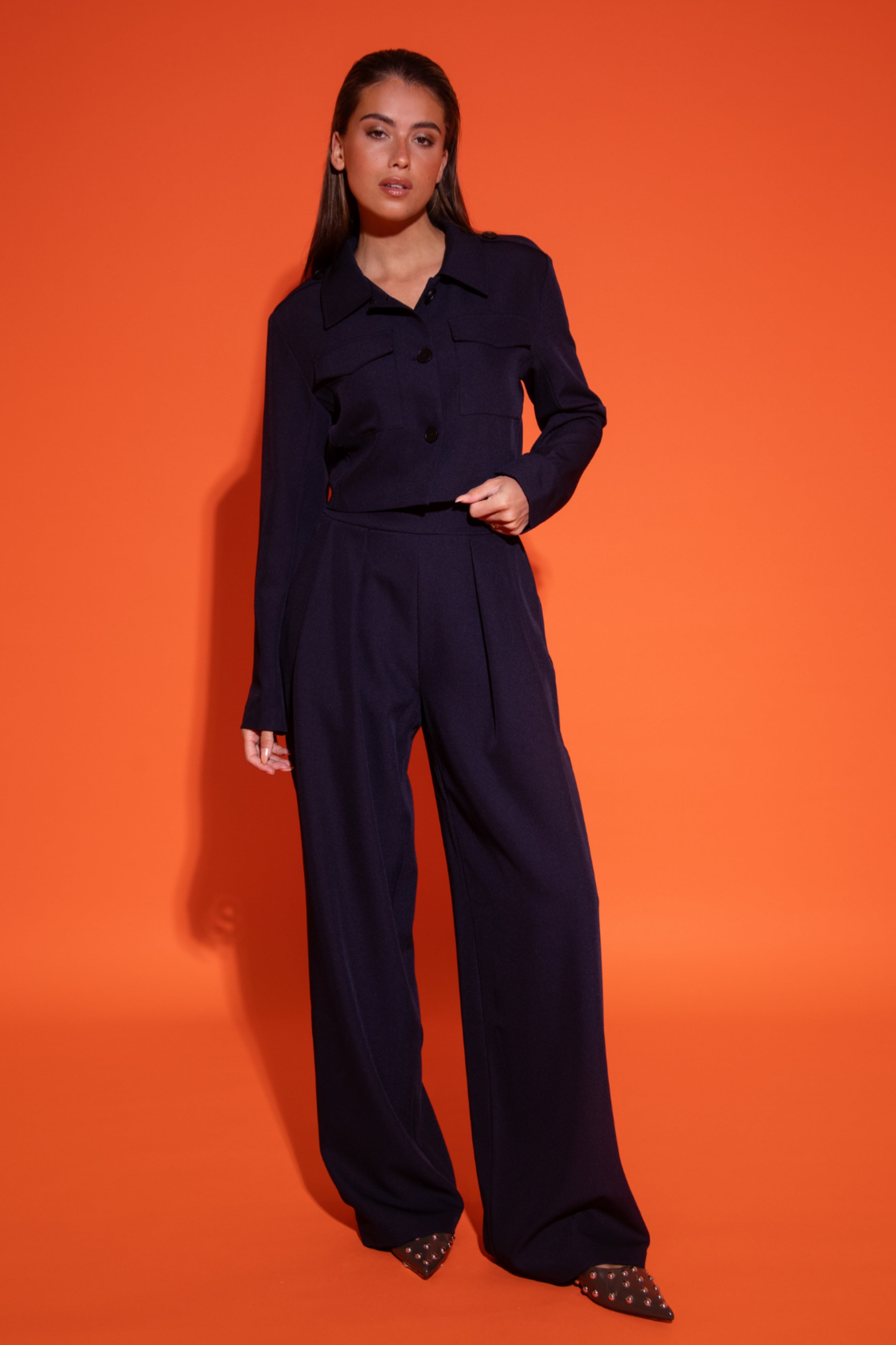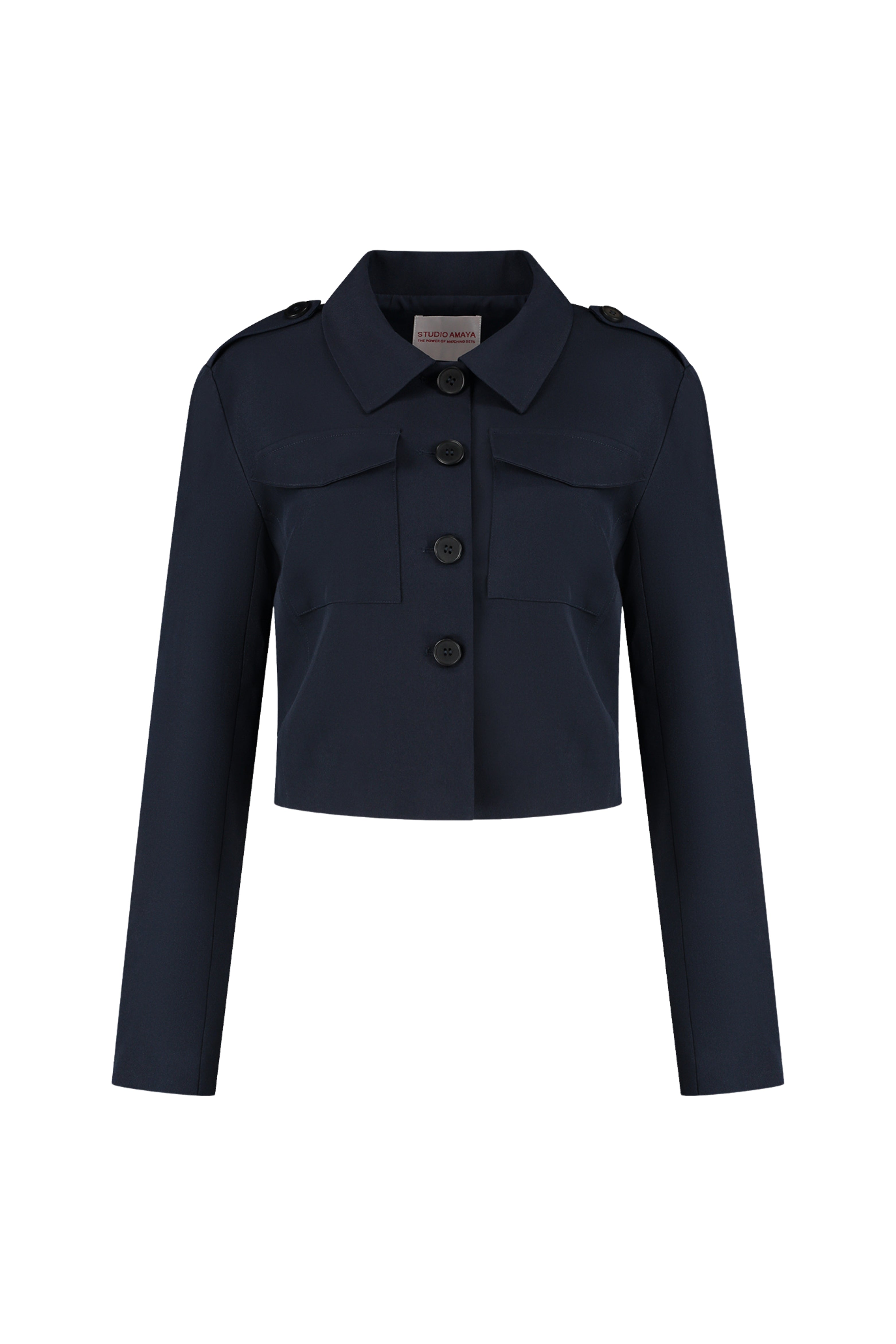 Jacket Snow Blue van Studio Amaya is een moderne utility-stijl met opgestikte zakken, grote knopen en cropped lengte. Stoer en verfijnd, ideaal te combineren met een hoge taille broek of rok voor een casual of chique look.