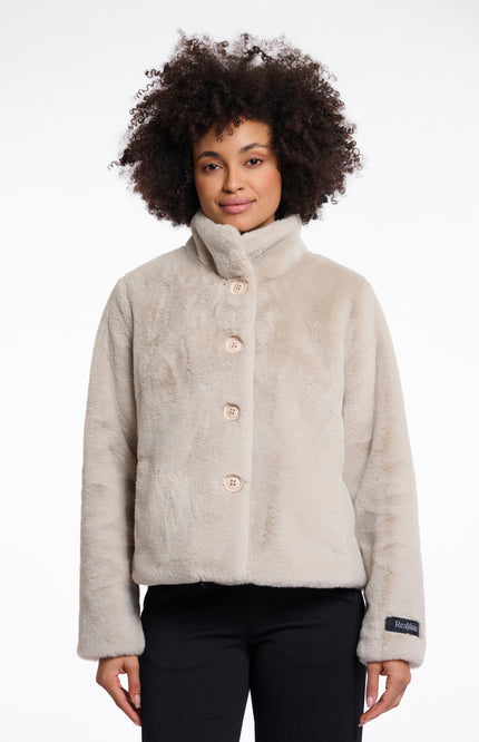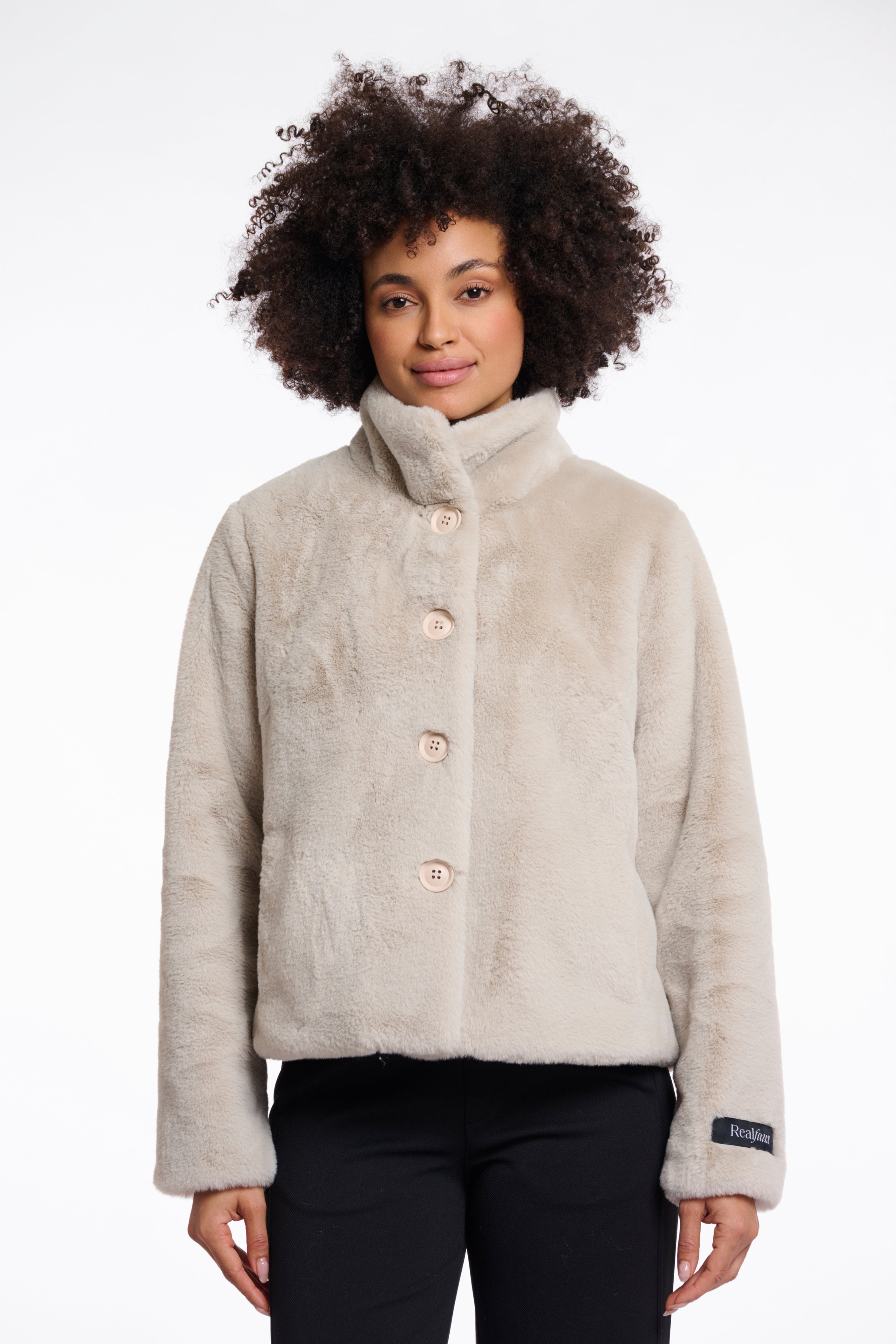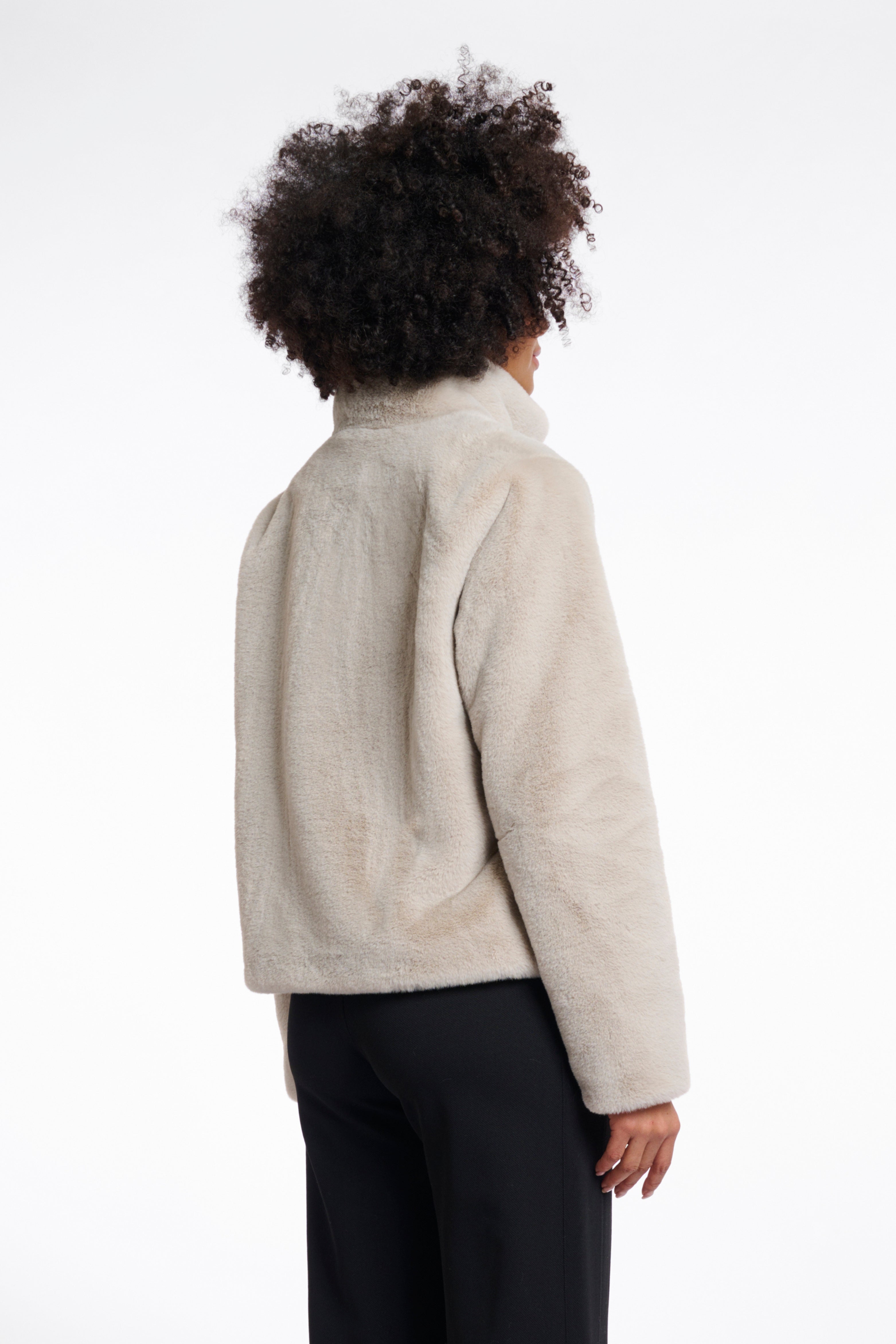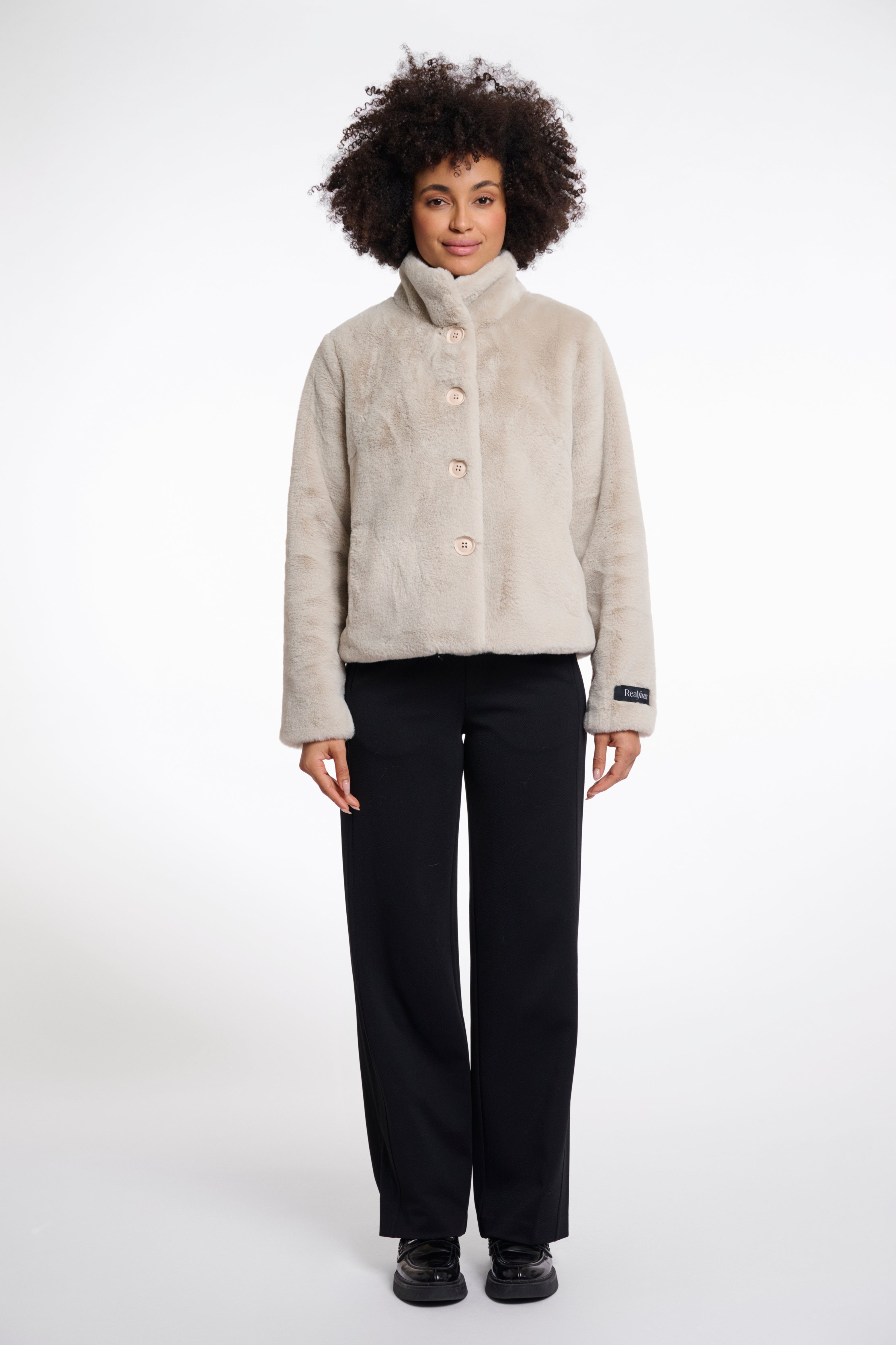 De Rino & Pelle Jacket Vie in de zachte kleur Birch is een korte cosy faux fur jas met een rechte pasvorm en opstaande kraag. Ideaal om warm én chic de deur uit te gaan.