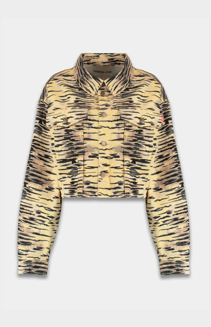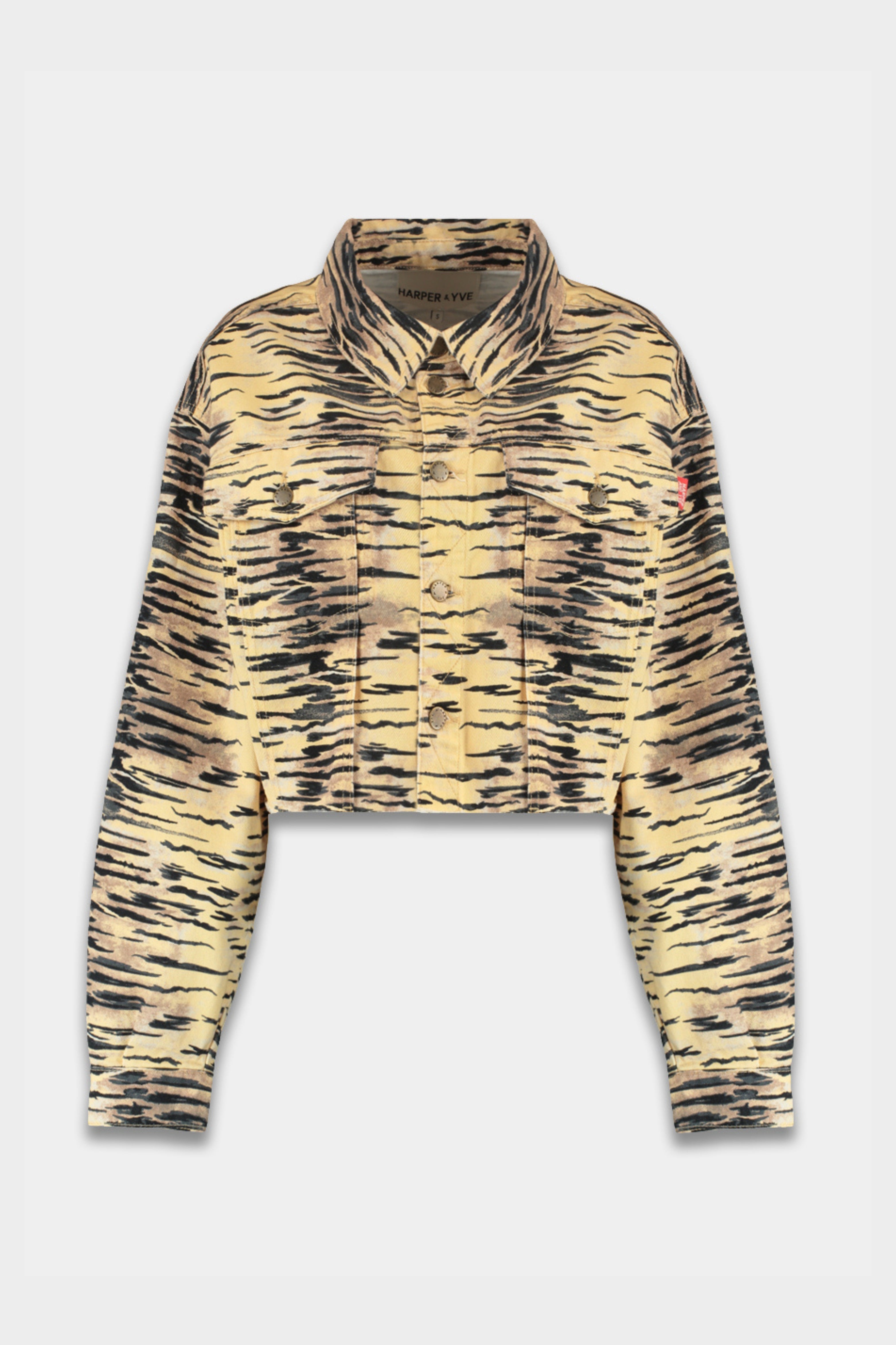 De Jacket Willow Trashy Tiger Yellow van Harper & Yve is een stoere cropped spijkerjas met een gedurfde tijgerprint. De klassieke kraag, knoopsluiting en borstzakken maken dit een statement piece voor een edgy look.