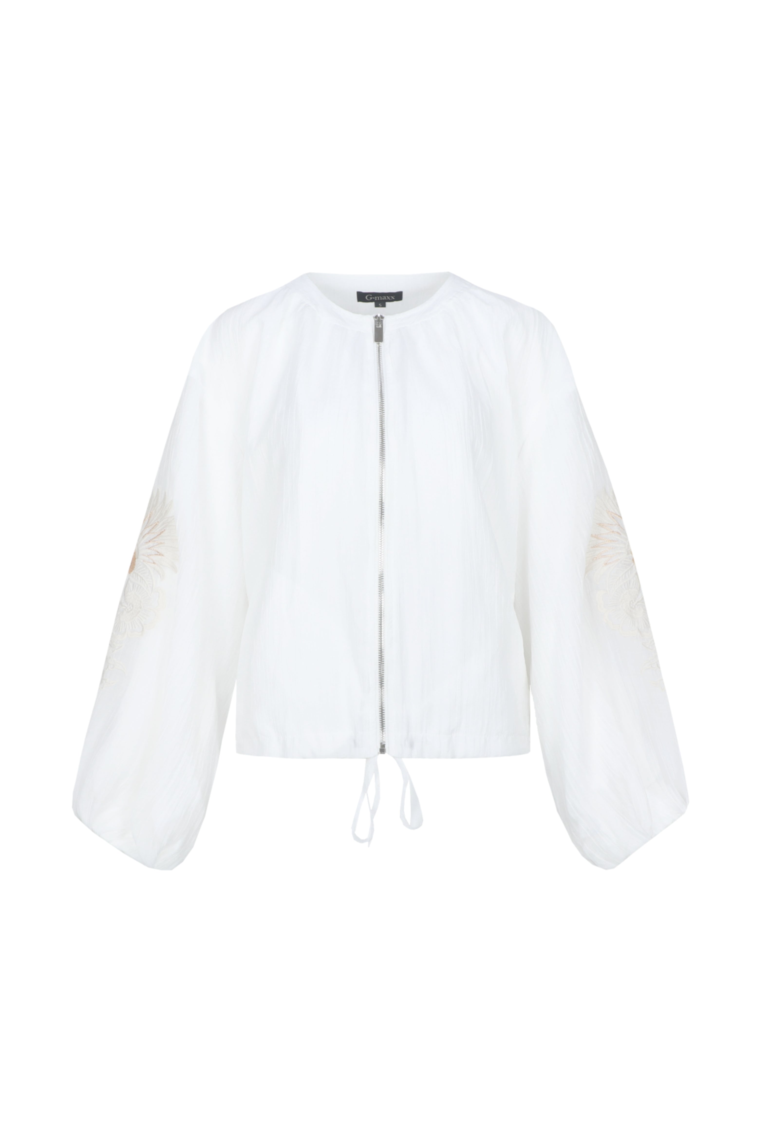 De Jacket Zaira Offwhite van G-maxx is een luchtige jas met ronde hals. De ballonmouwen en subtiele borduursels geven een chique, zomerse look. Perfect voor feestjes, etentjes en stijlvolle vakantiedagen.