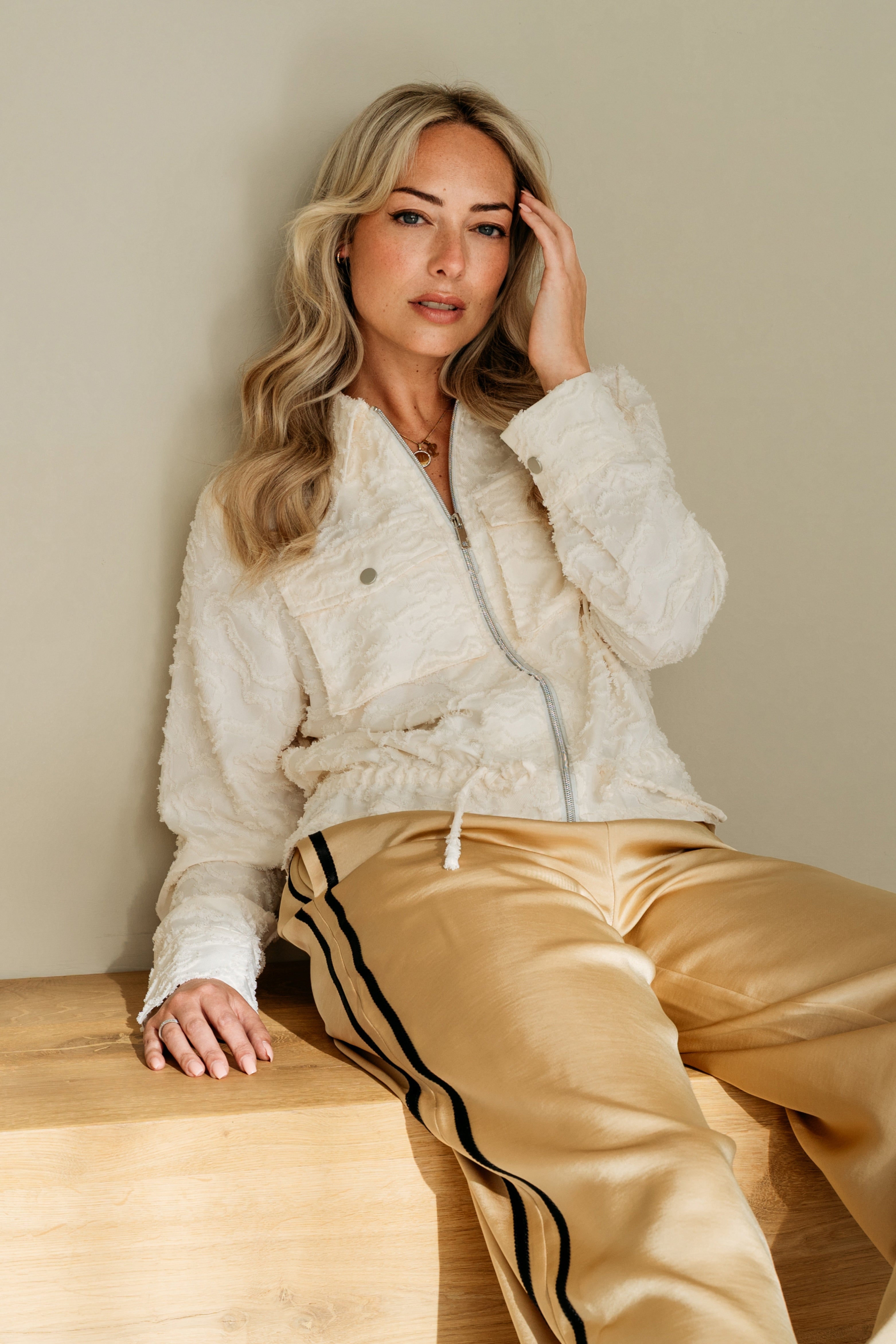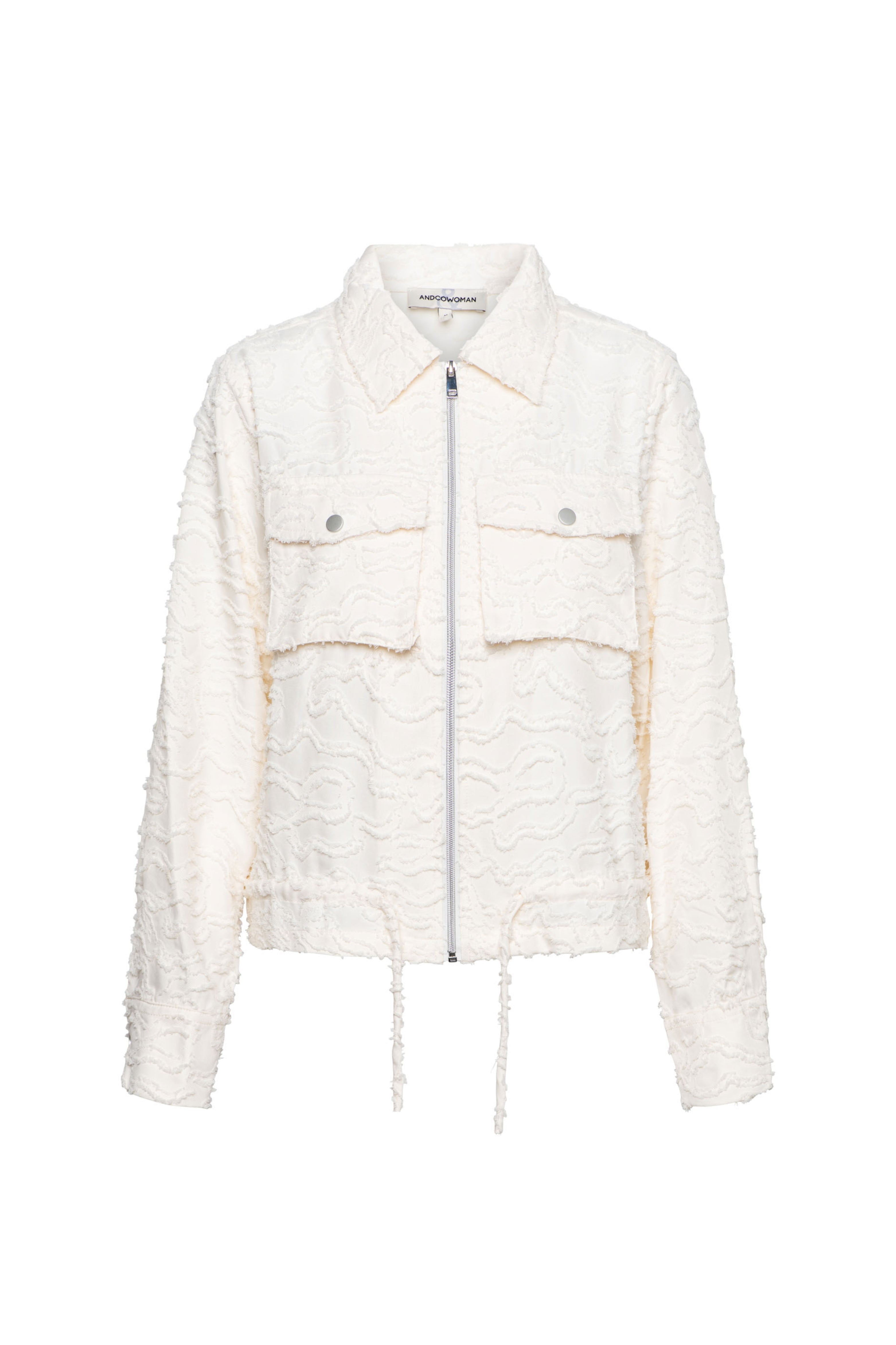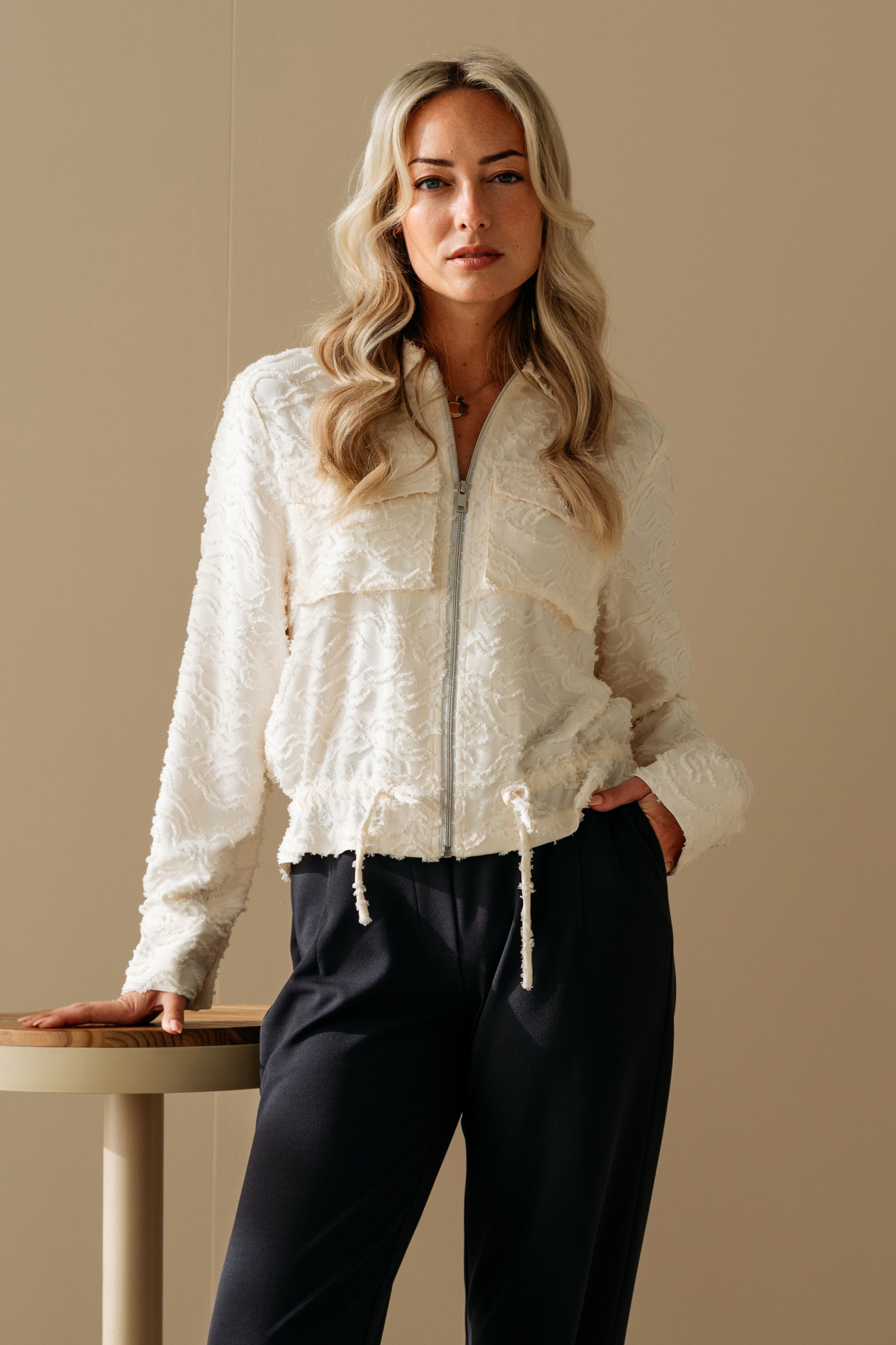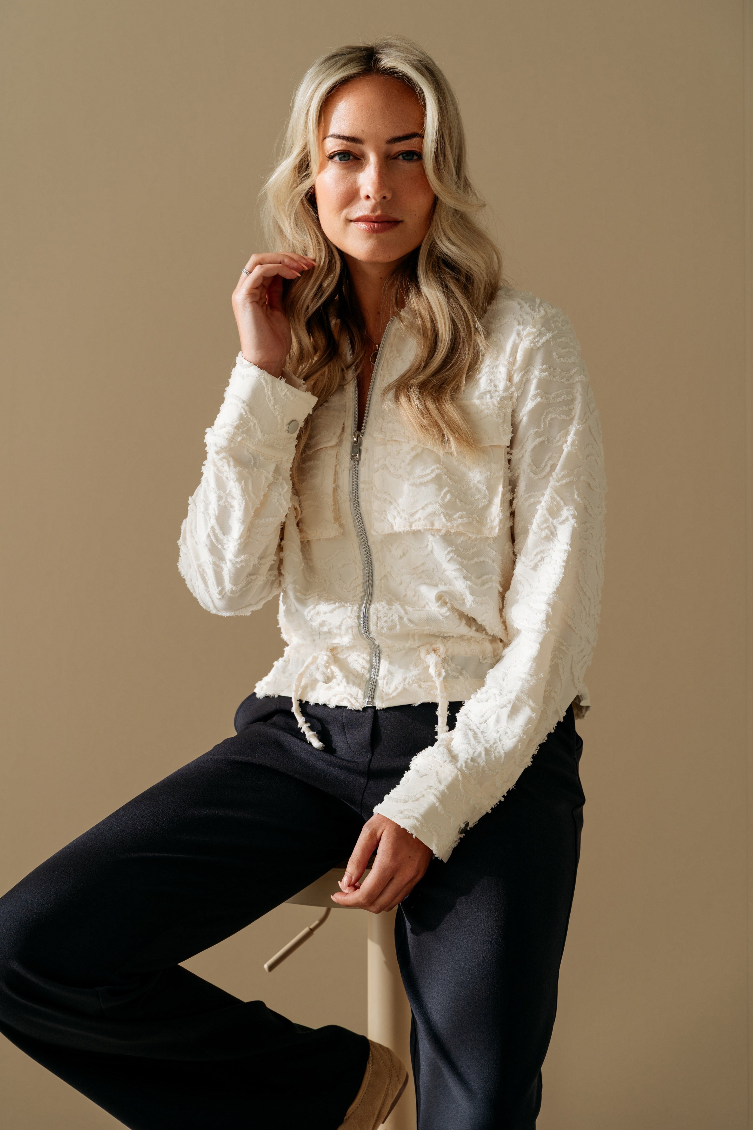De Jacket Zelie Offwhite van &Co Woman is een elegant jasje met een verfijnde structuurstof. De borstzakken, ritssluiting en koorddetail geven het ontwerp een moderne touch. Perfect om chic én comfortabel te combineren.