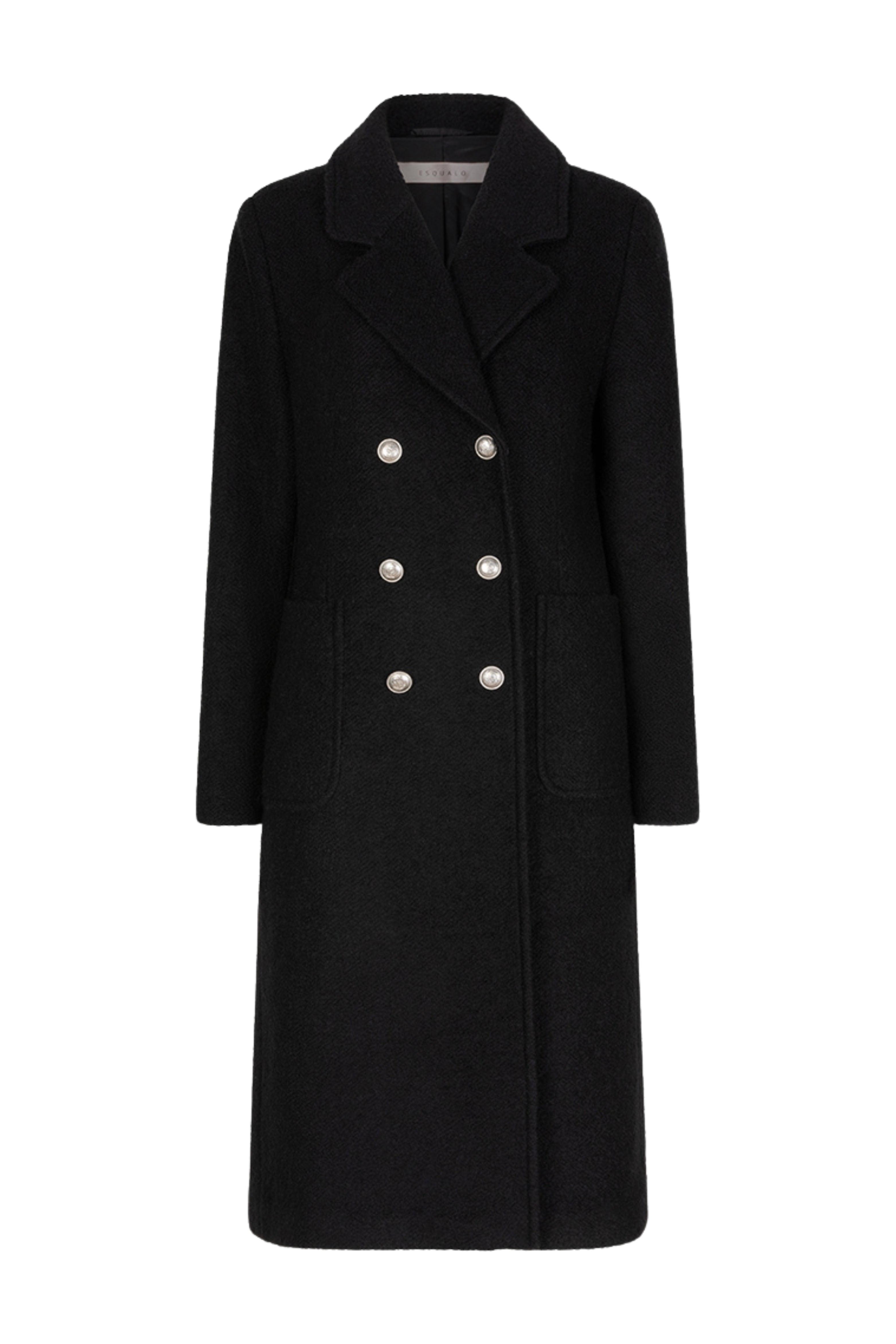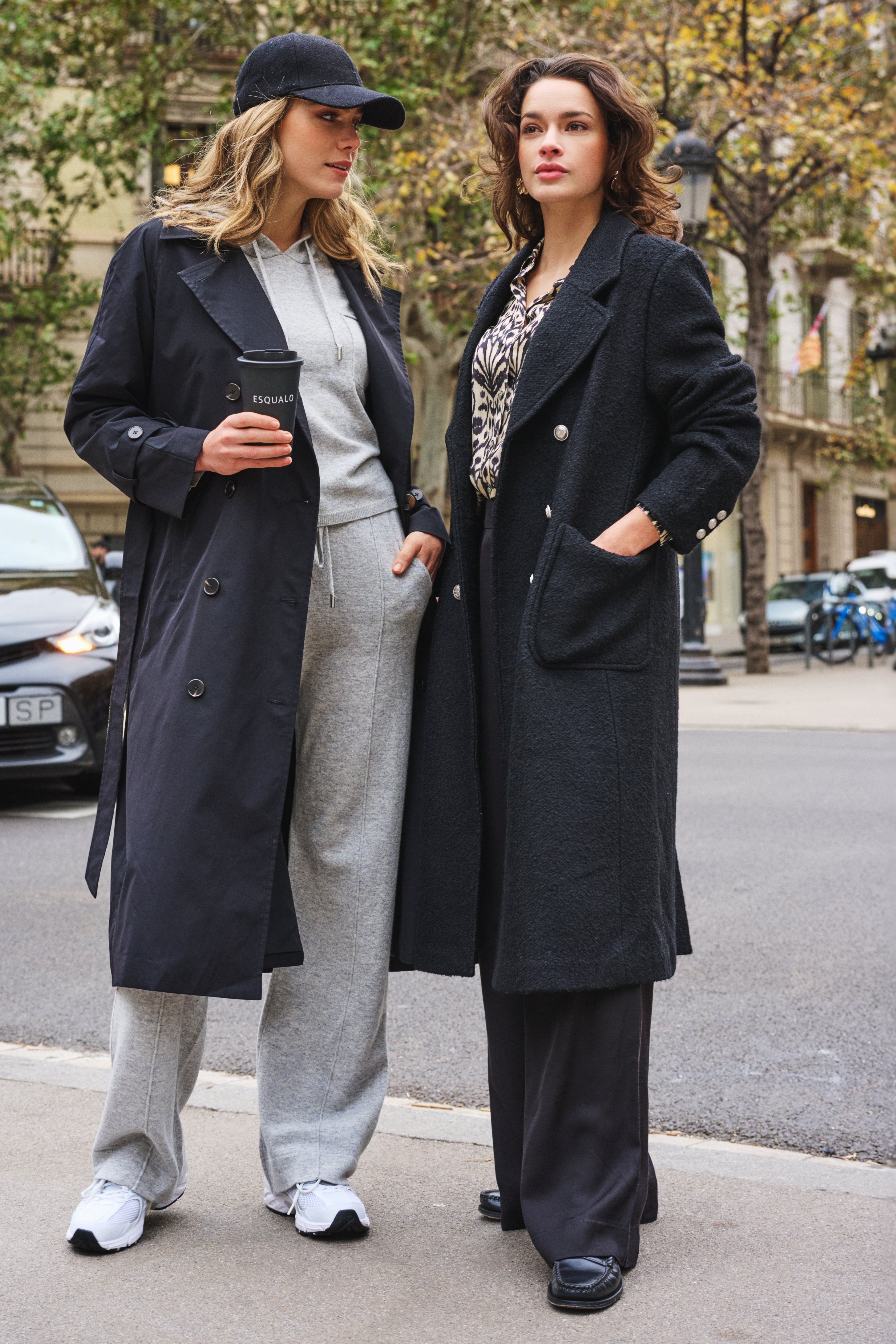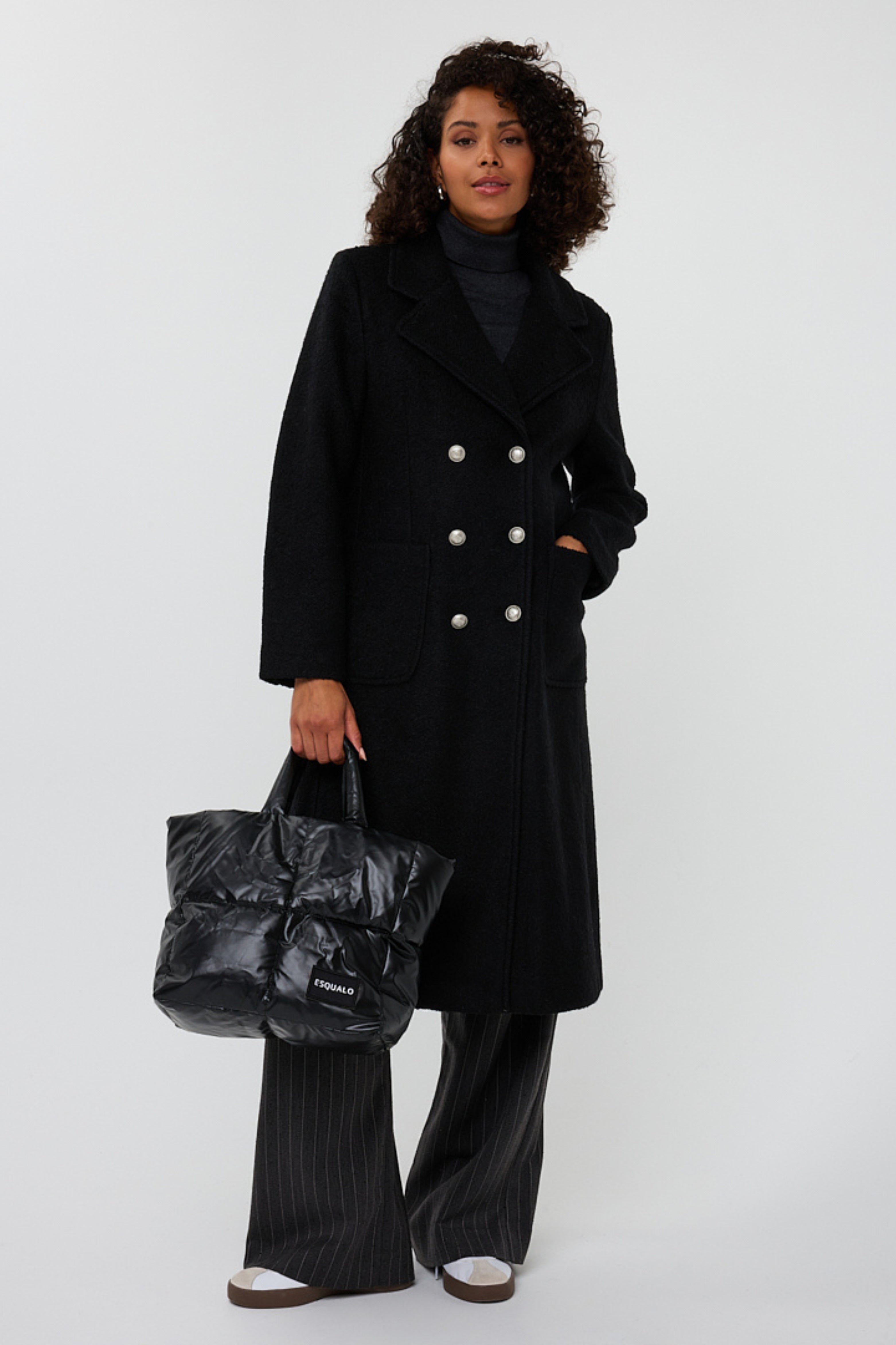 Jas Double Breasted Boucle Black van EsQualo is een stijlvolle lange mantel met een elegante boucle structuur. De dubbele rij knopen en de klassieke reverskraag maken dit een tijdloos item voor je garderobe.