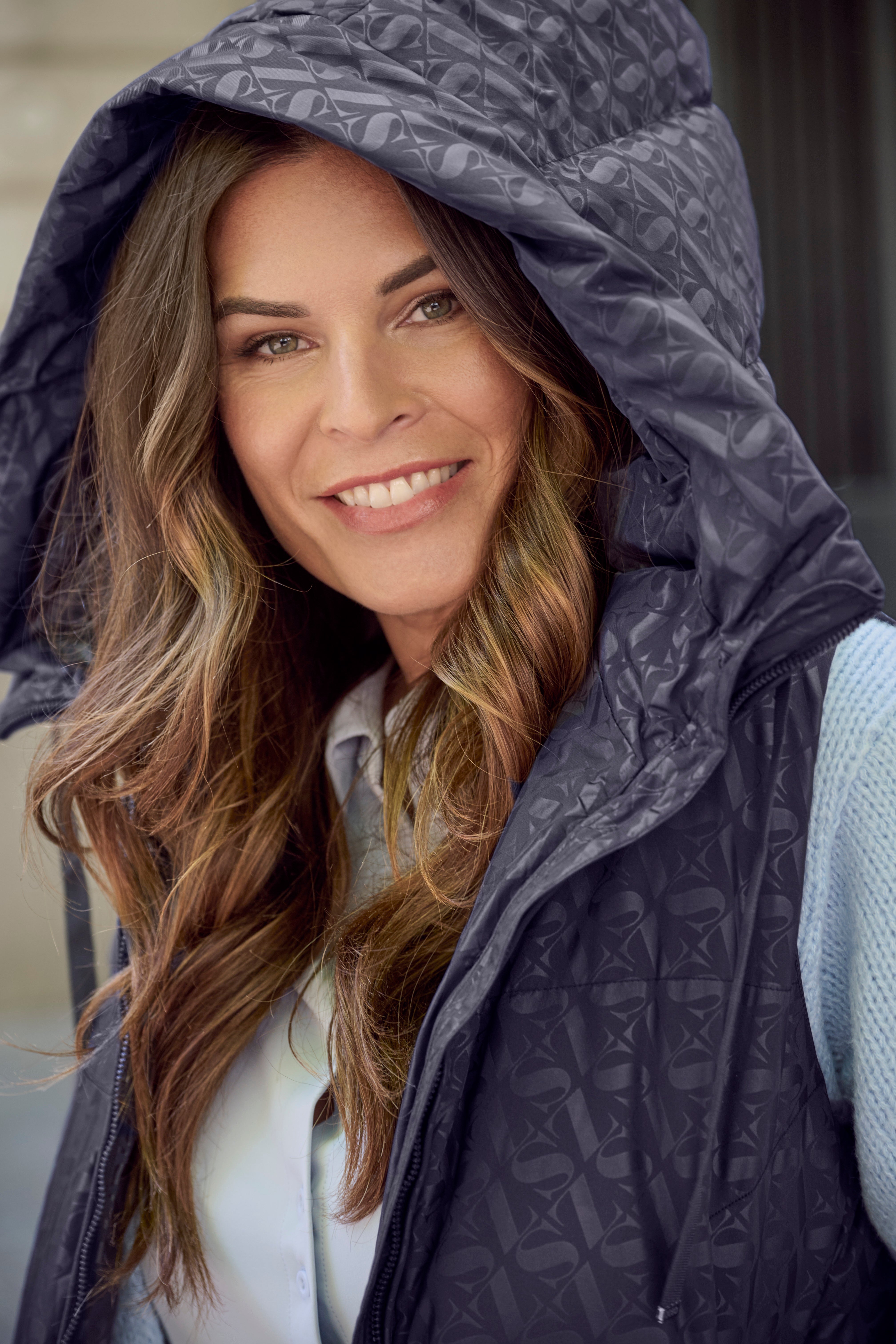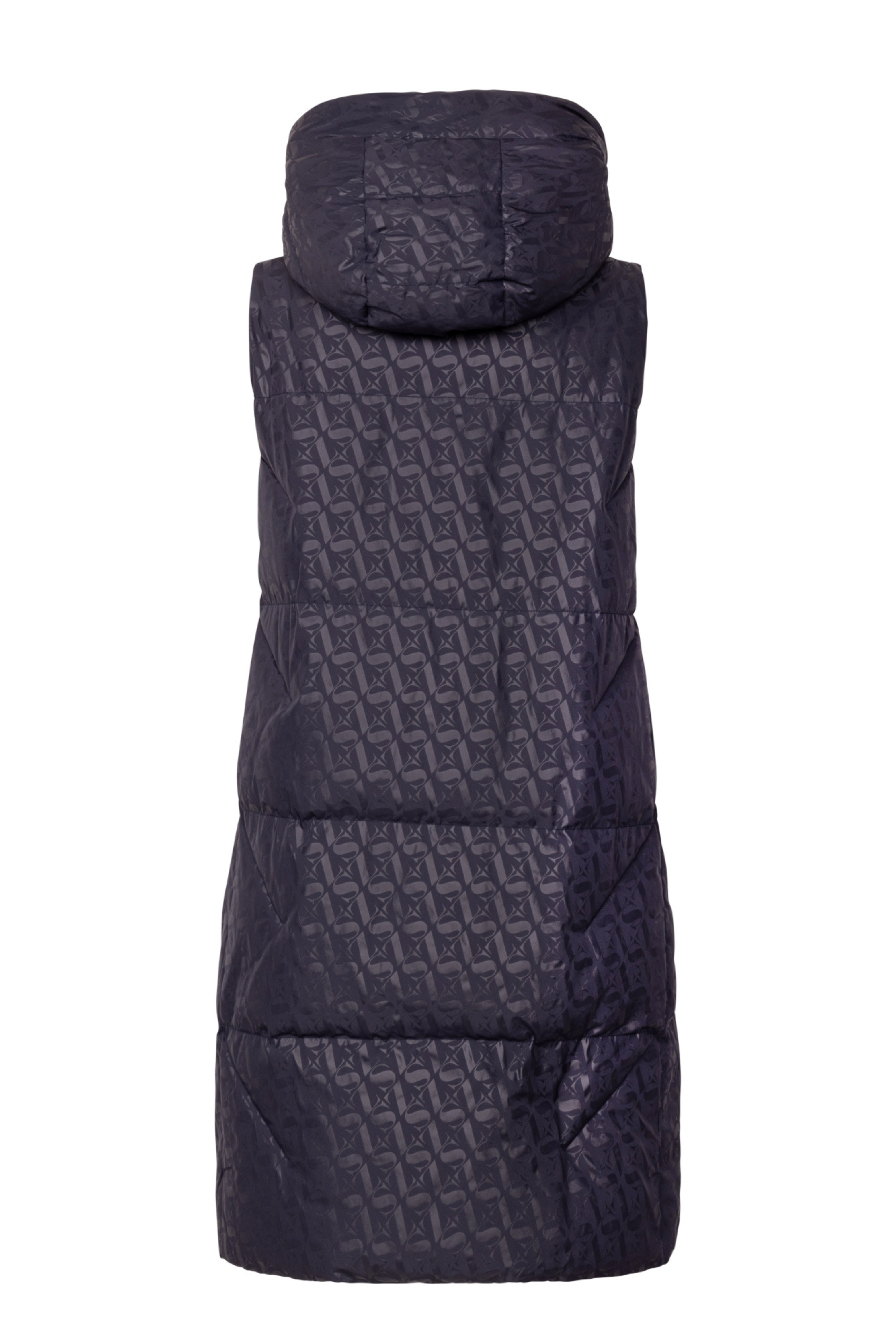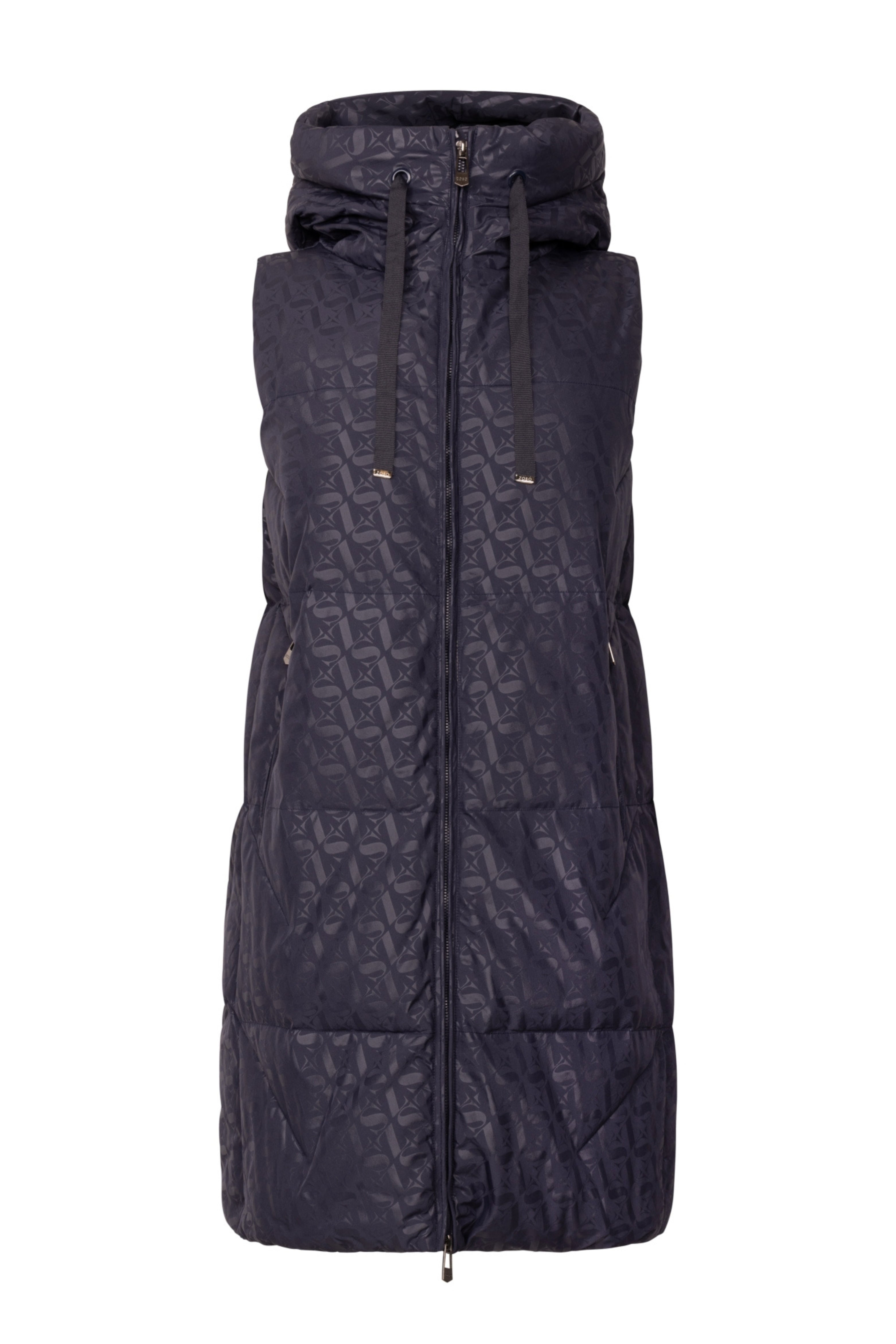 Jas Marleen Navy van Zoso is een sportieve lange bodywarmer met een subtiele glansprint. De gewatteerde stof en vaste capuchon bieden comfort en warmte, ideaal om stijlvol laagjes te creëren in het tussenseizoen.