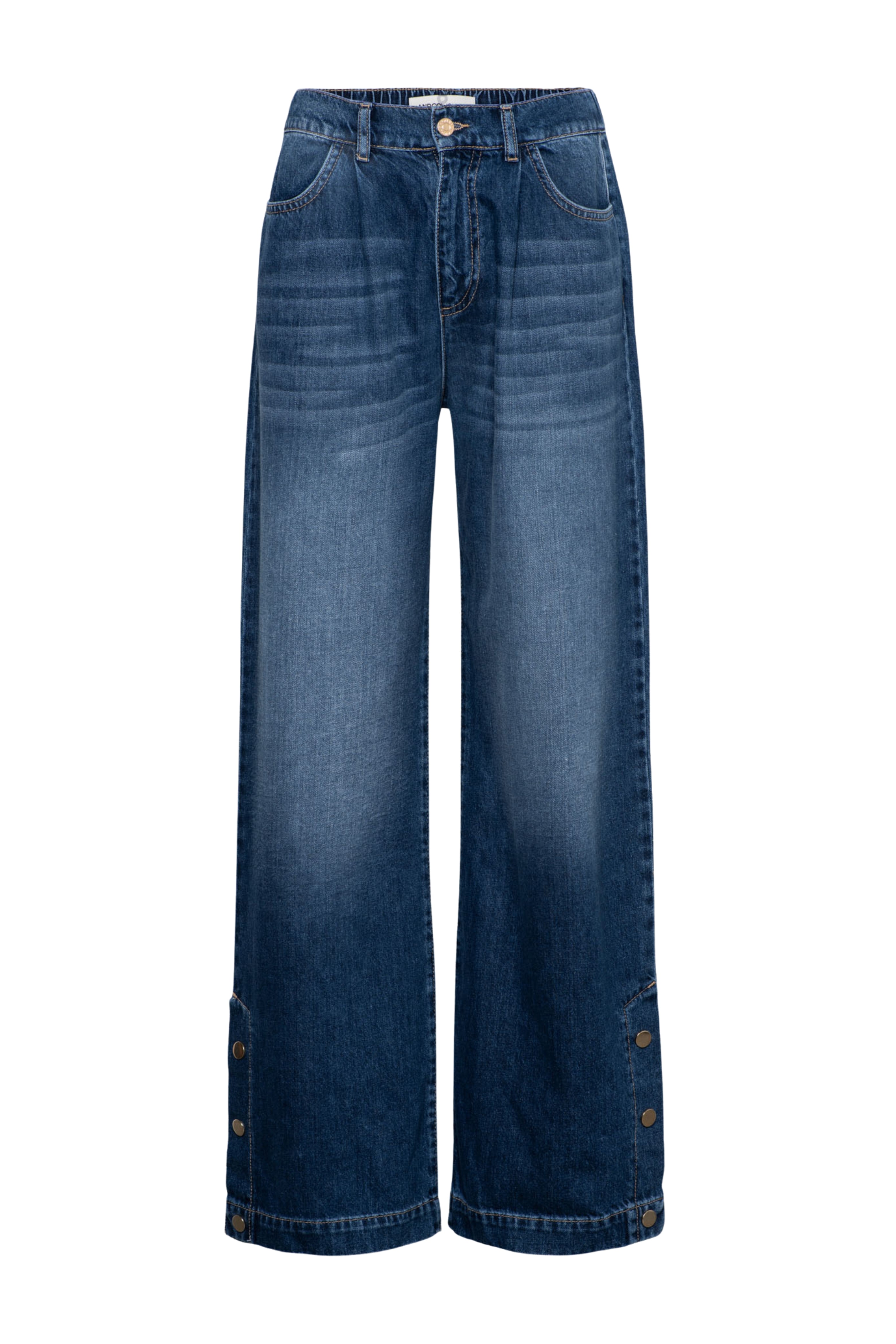 Jeans Jacey Dark Denim van &Co Woman is een eigentijdse jeans met een rechte, losvallende pijp en comfortabele mid-waist fit. De donkere denimwassing geeft de broek een tijdloze uitstraling, terwijl de goudkleurige knopen onder aan de pijpen zorgen voor een speels en stijlvol detail.