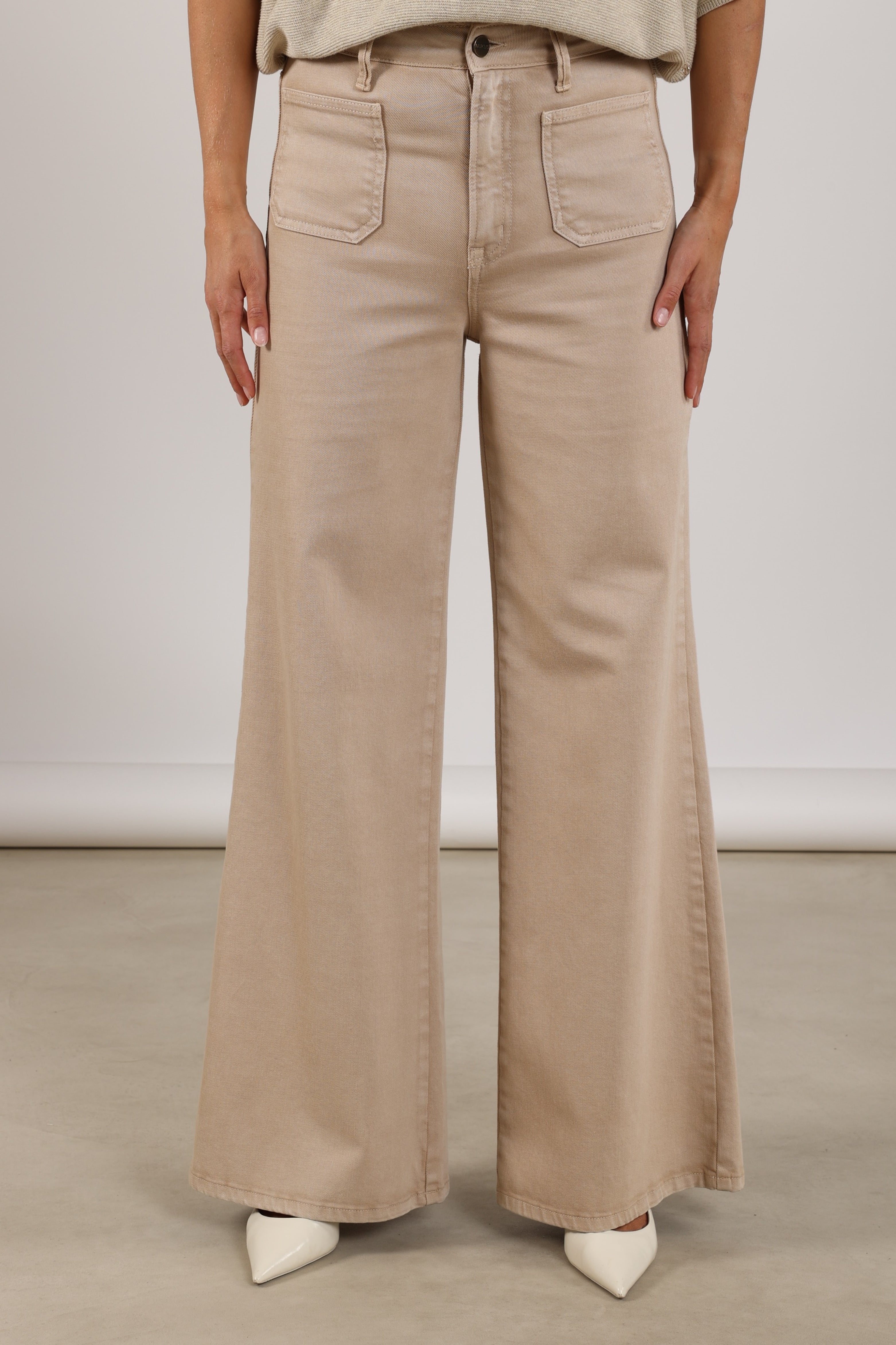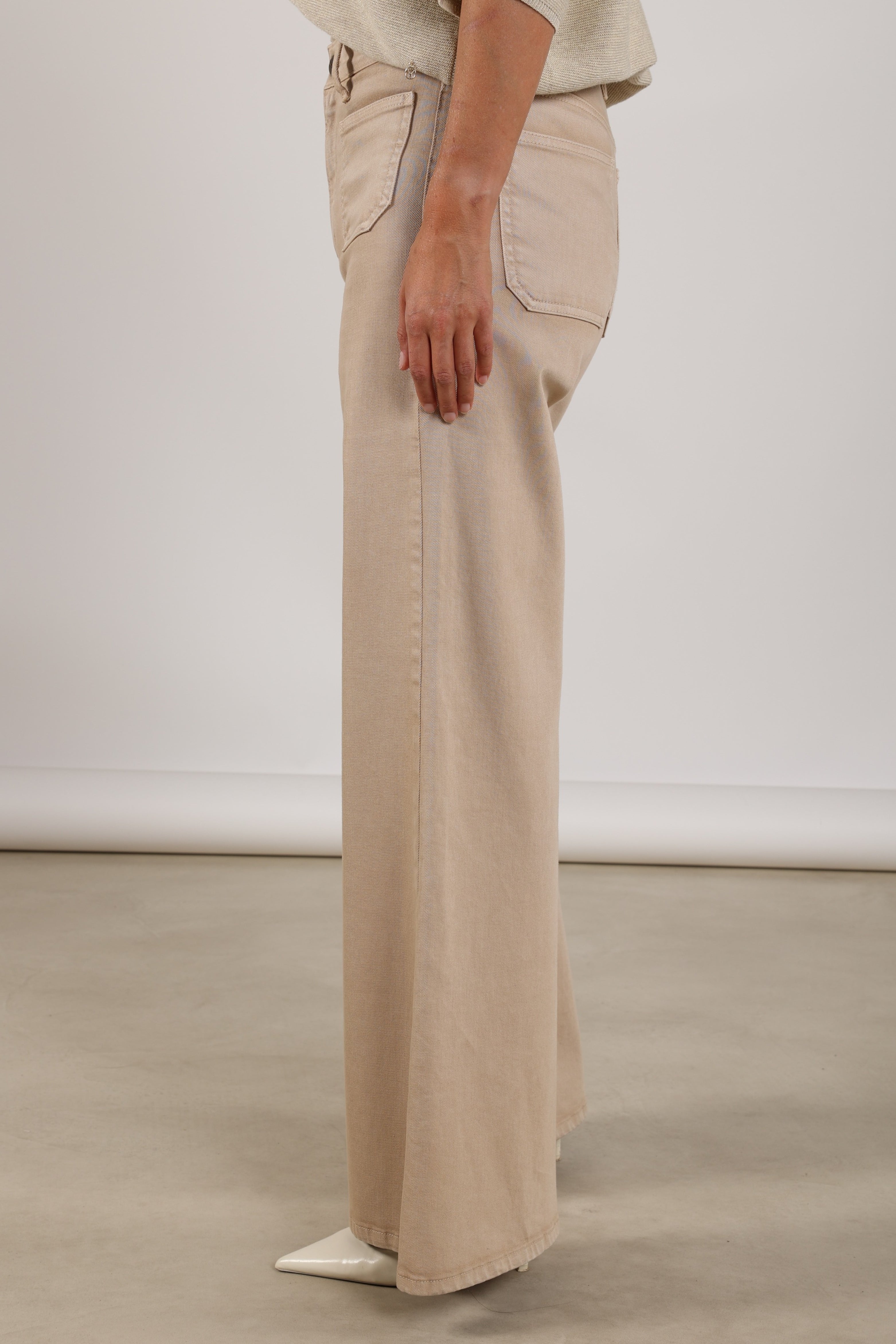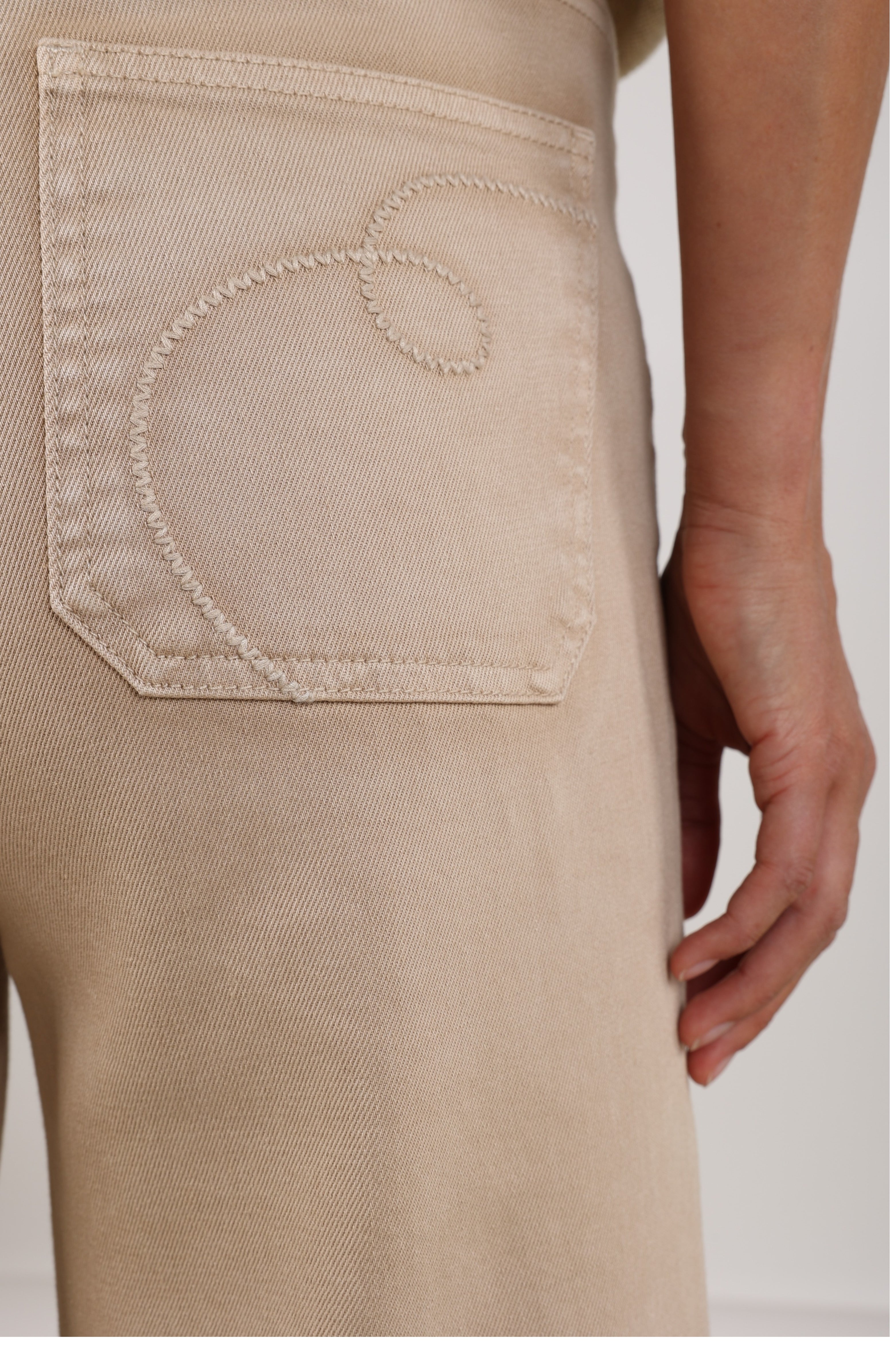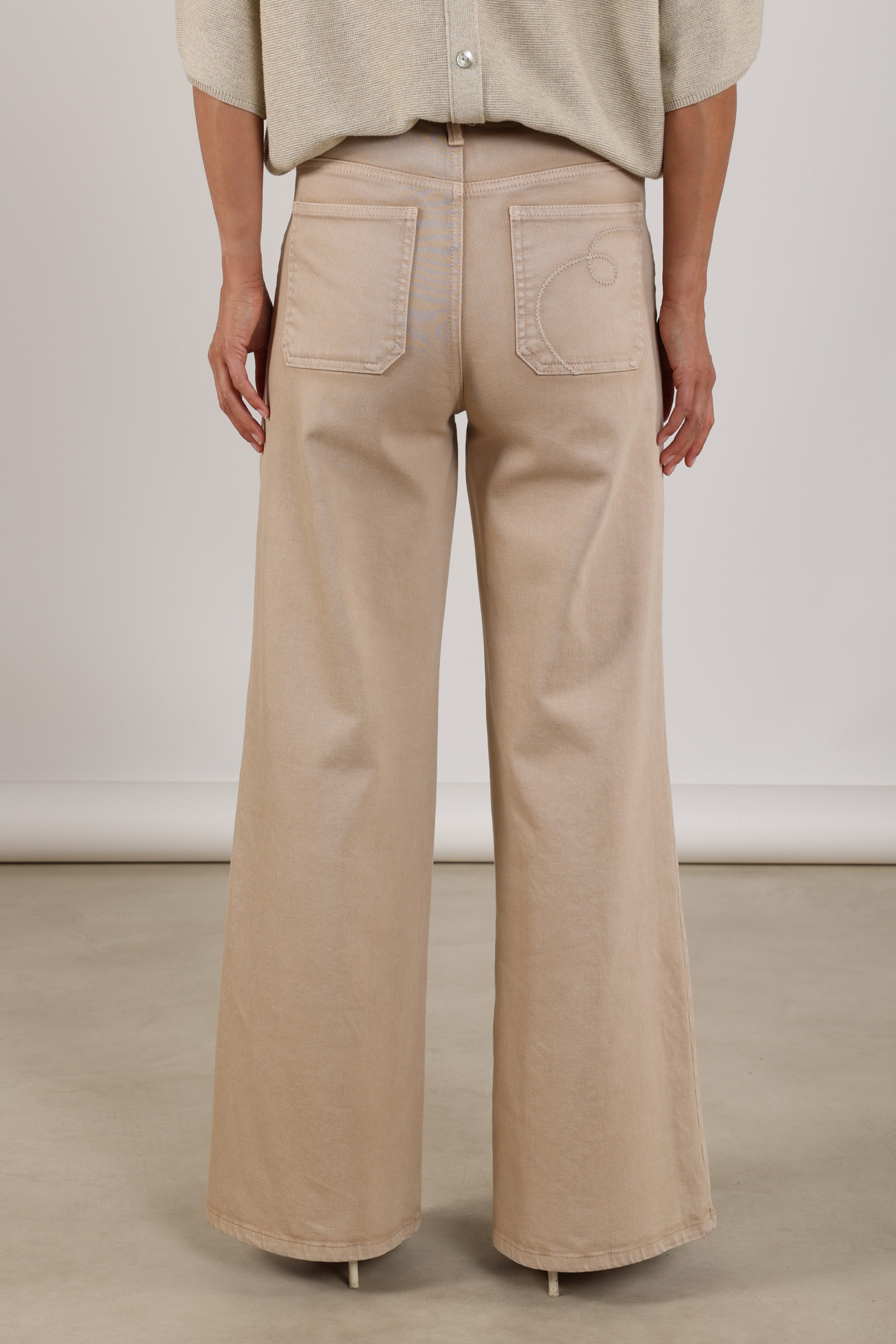 Jeans Scarlet Sand van Nukus is een stijlvolle essential met een moderne wide leg pasvorm en een tijdloze Sand tint. Subtiel detail is het borduursel op de achterzak, wat deze jeans een verfijnde en eigentijdse uitstraling geeft.