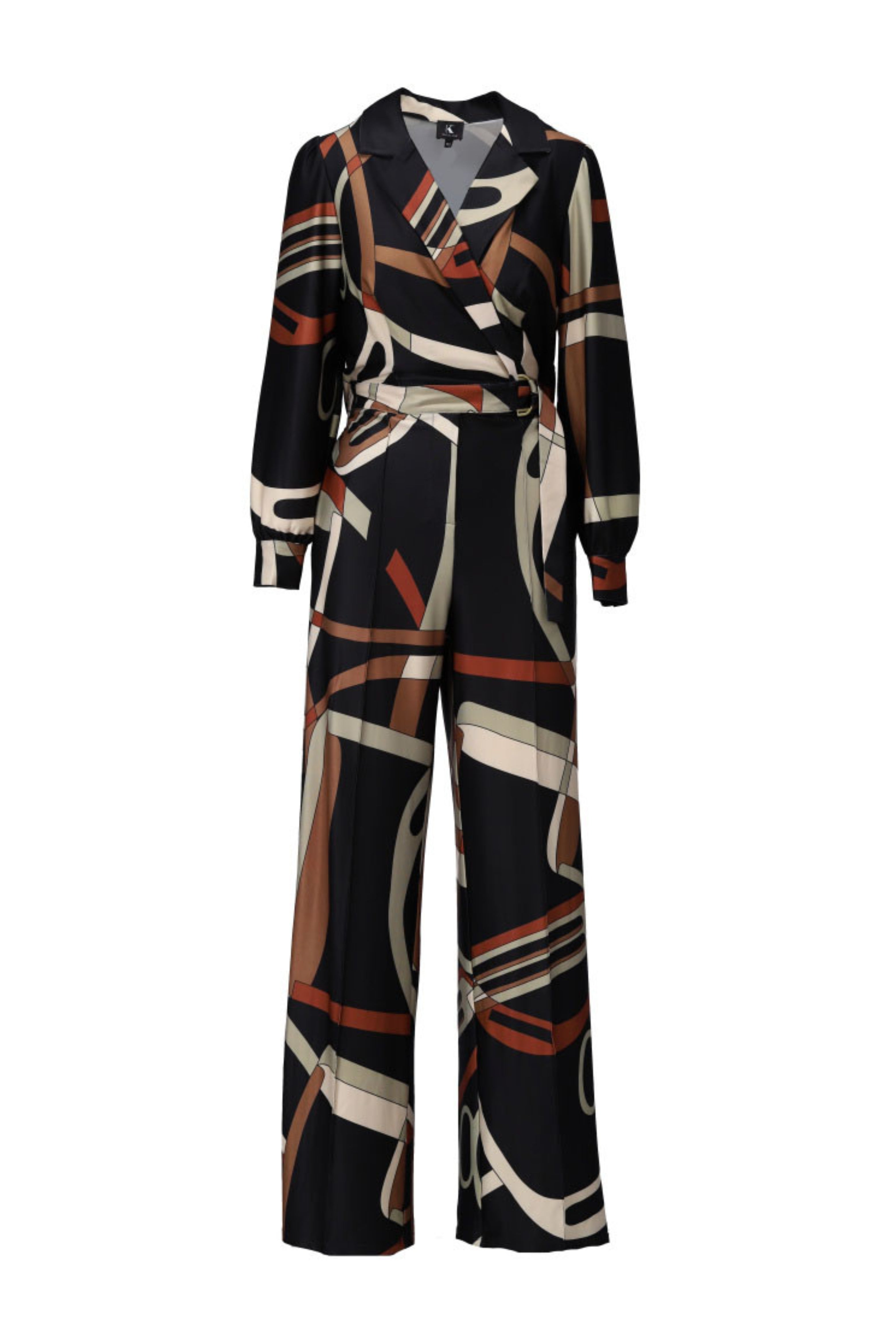 De Jumpsuit Met Design van K-design straalt klasse uit met zijn abstracte print in zwart, bruin en beige tinten. De overslagtop met reverskraag en lange mouwen geeft een chique uitstraling, terwijl de rechte pijpen en comfortabele pasvorm zorgen voor een moeiteloze look.