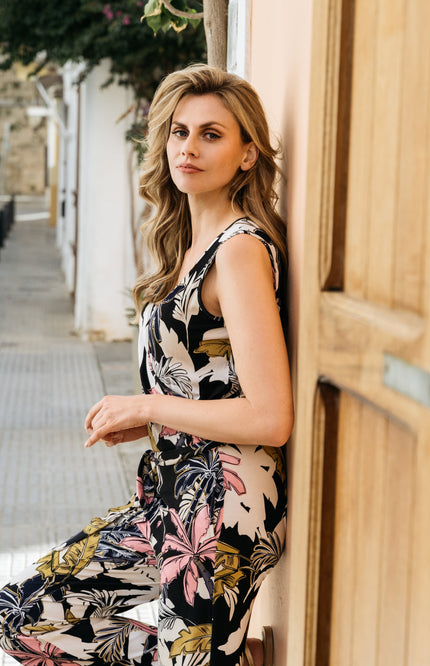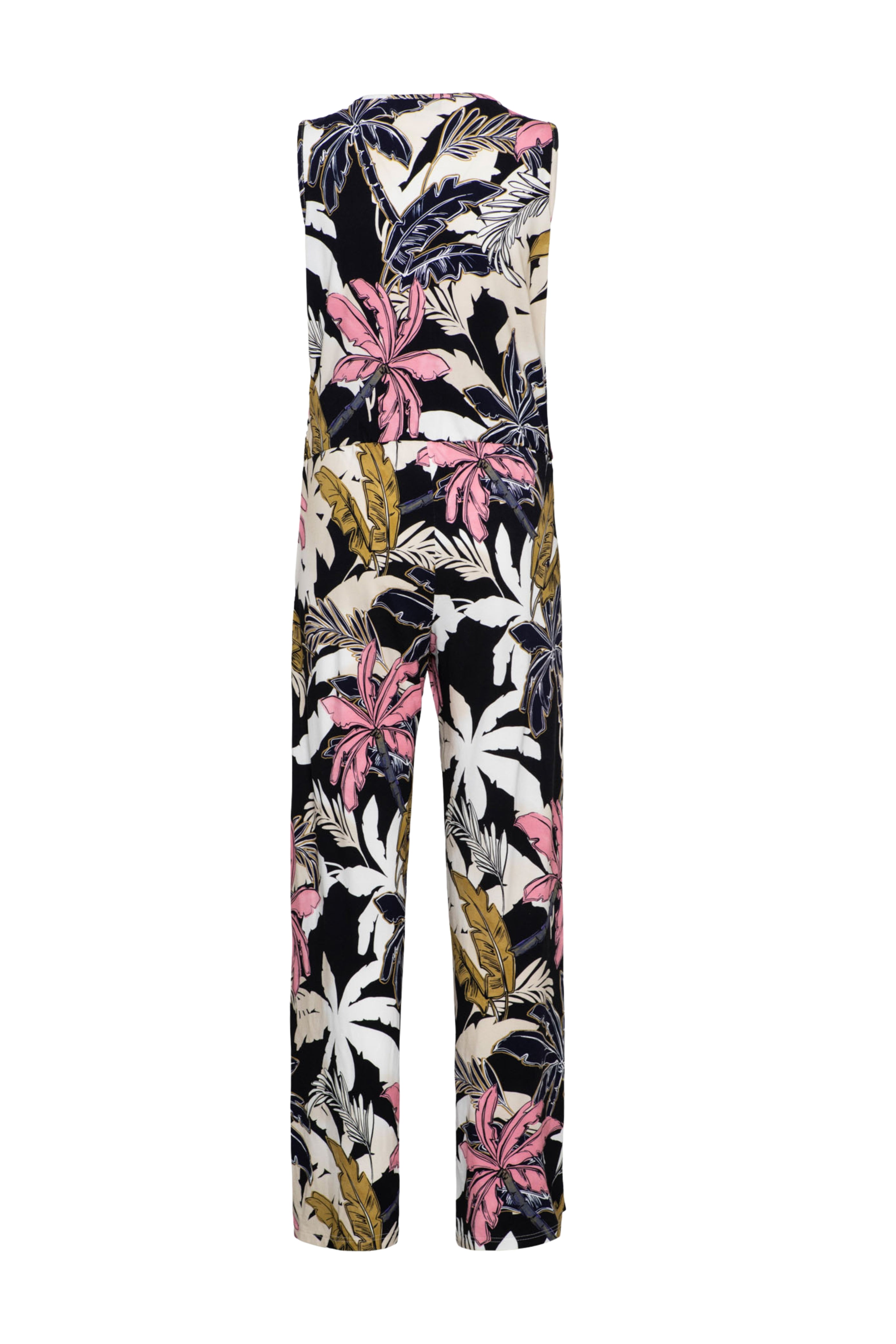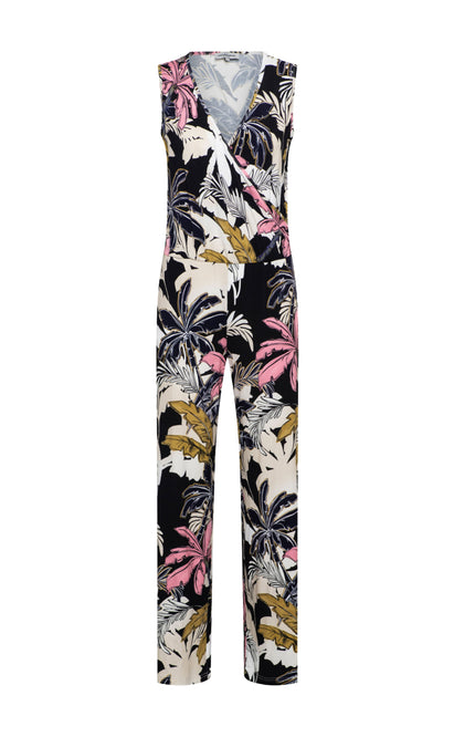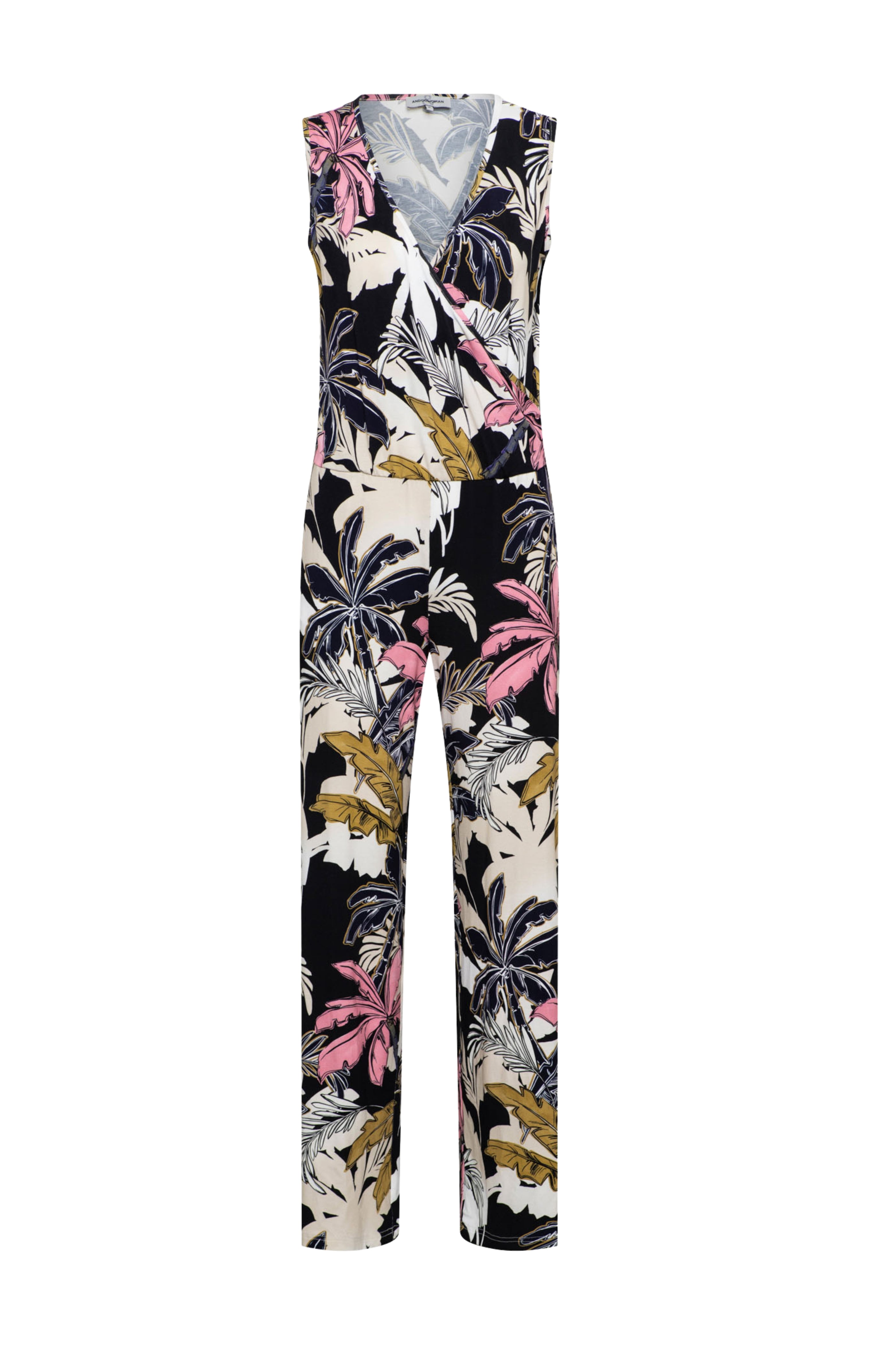 De Jumpsuit Pancha Palm Black Multi van &Co Woman is een tropische showstopper. Met een kleurrijke palmbladprint op een zwarte basis, een elegante overslagtop en wijde pijpen straalt deze jumpsuit zomerse elegantie en comfort uit in één look.