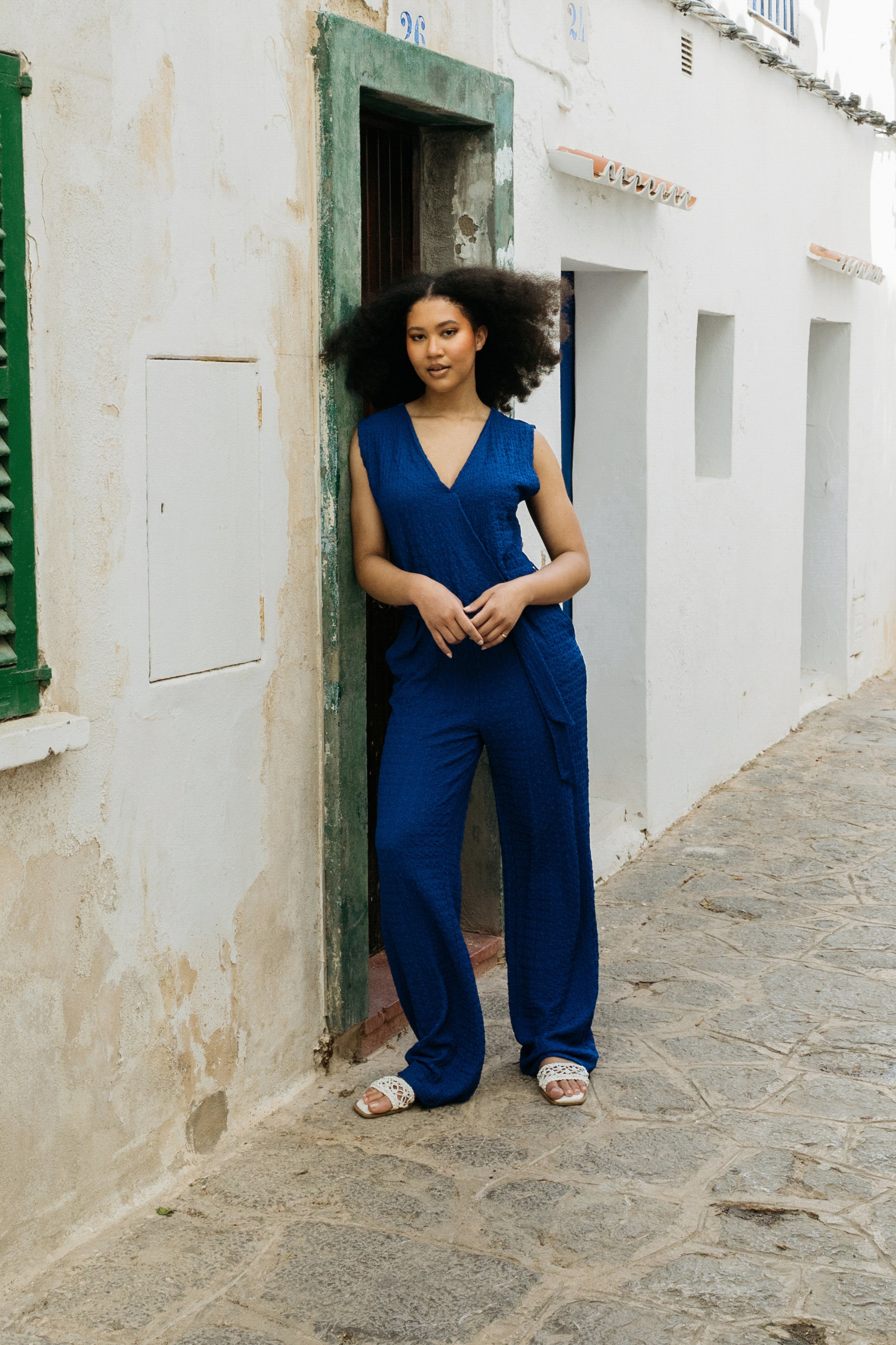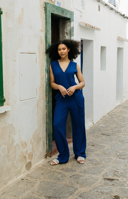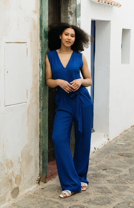De Jumpsuit Tamarinde Cobalt van &Co Woman is een stijlvolle must-have voor zomerse dagen. De diepe kobaltblauwe kleur, luchtige structuurstof en flatterende overslagtop maken deze jumpsuit perfect voor een elegante en comfortabele look.
