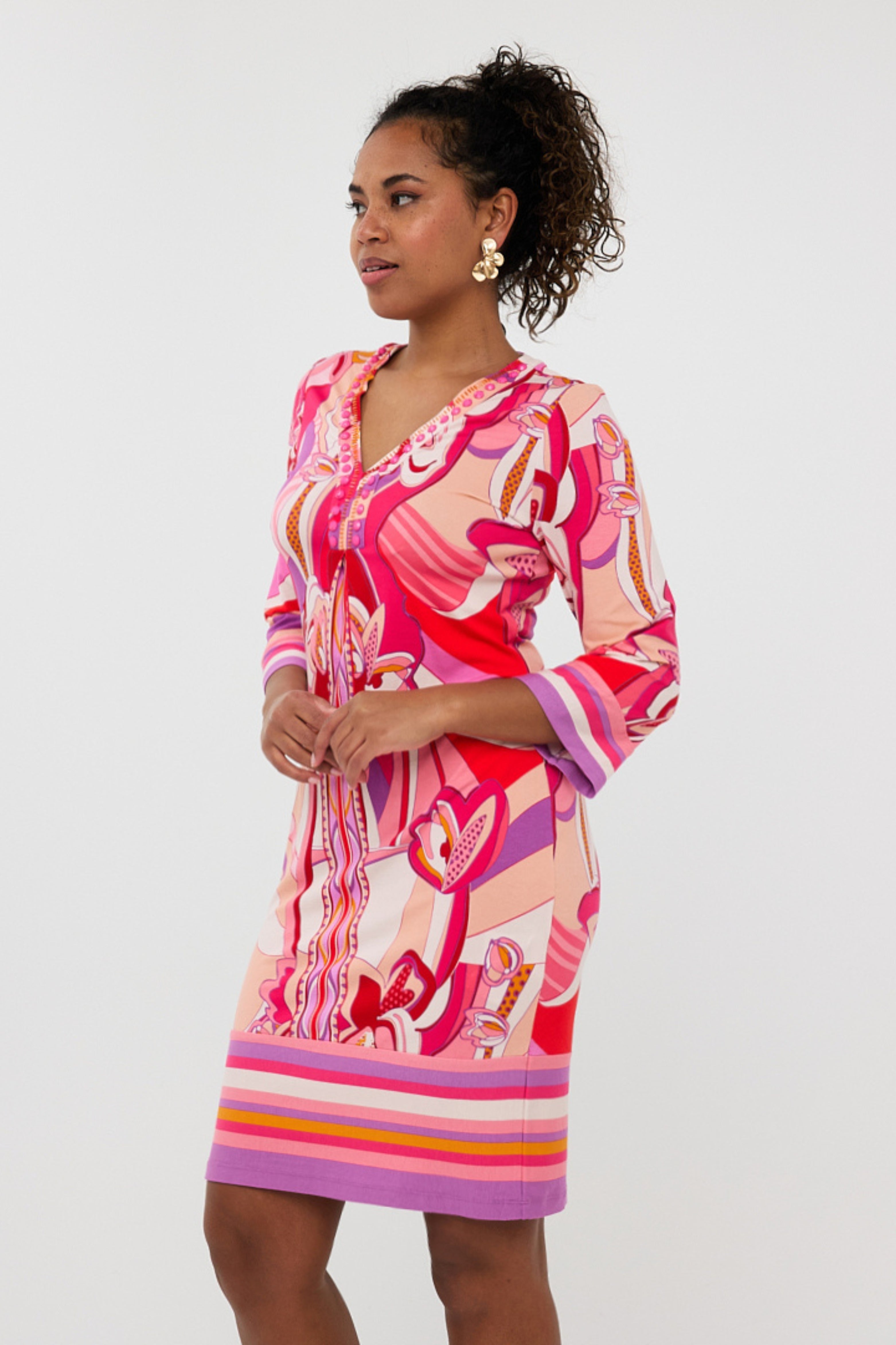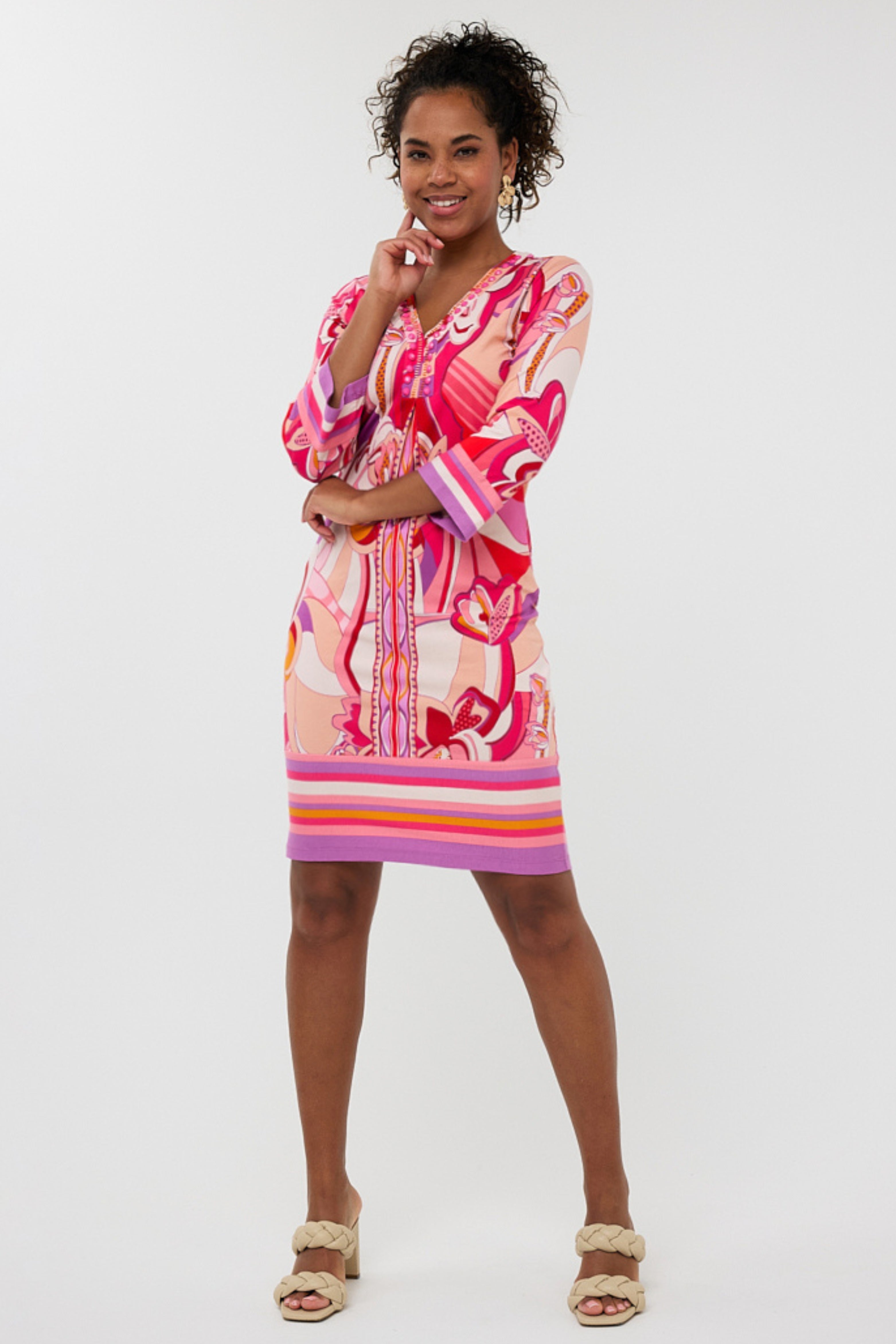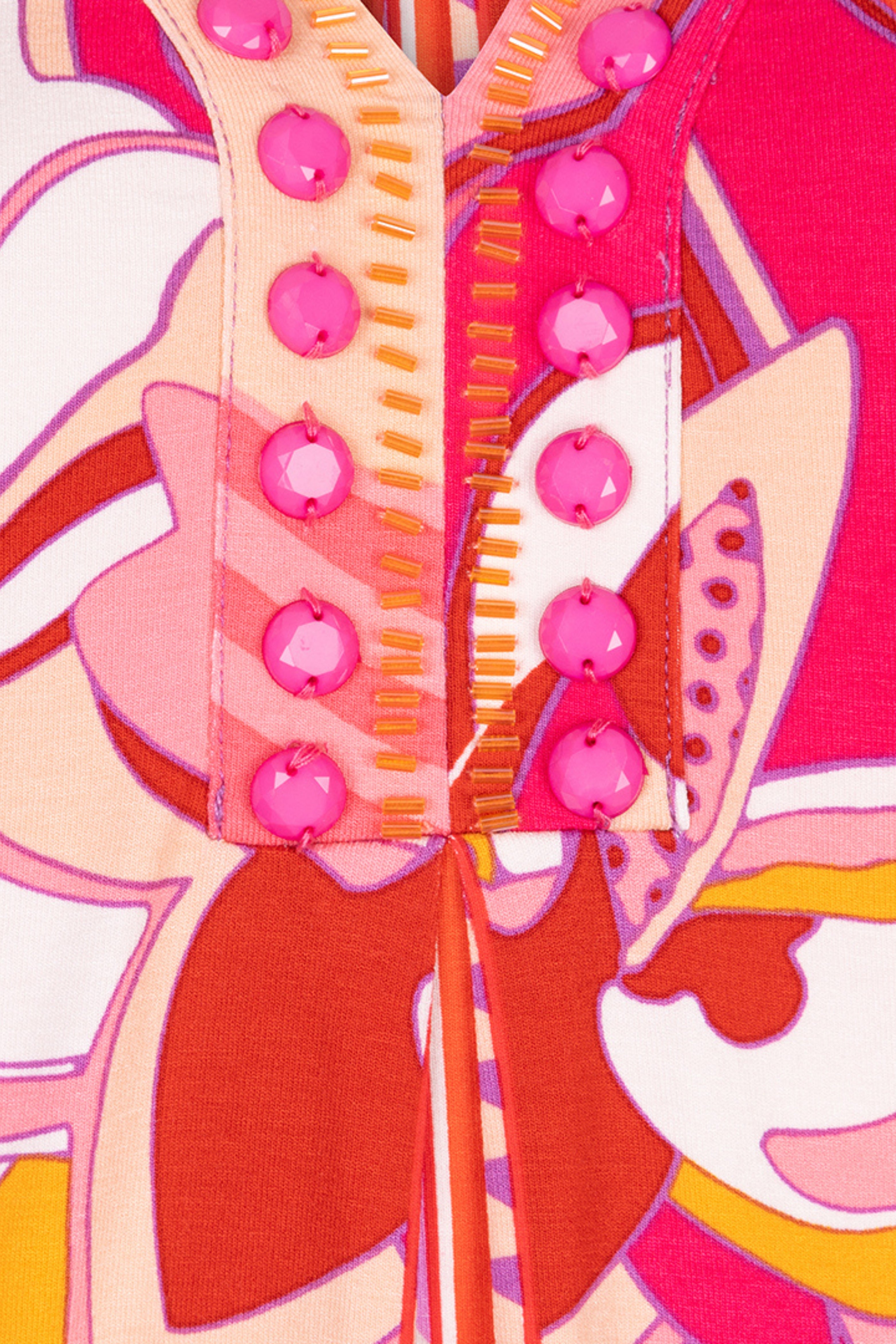 De Jurk Beads Disco Hit Print van Esqualo is een kleurrijke showstopper met een opvallende bloemenprint, kraaltjes langs de hals en driekwart mouwen. Vrolijk, vrouwelijk en ideaal voor zonnige dagen.