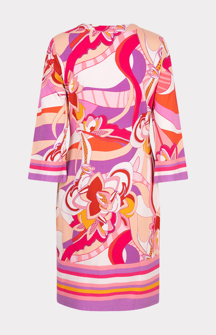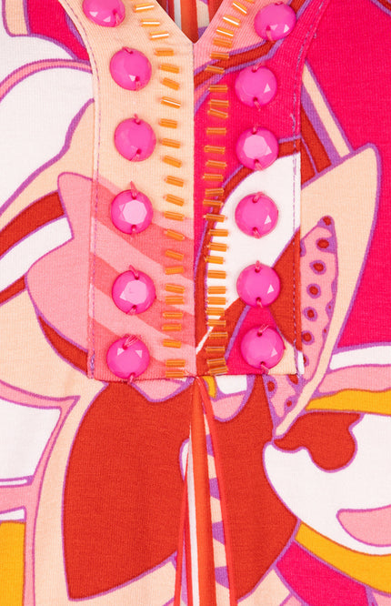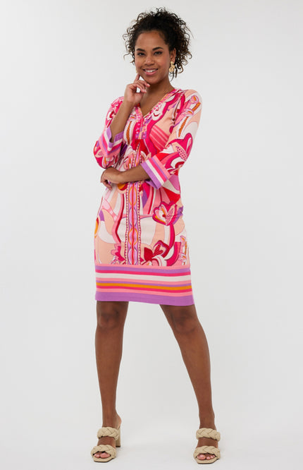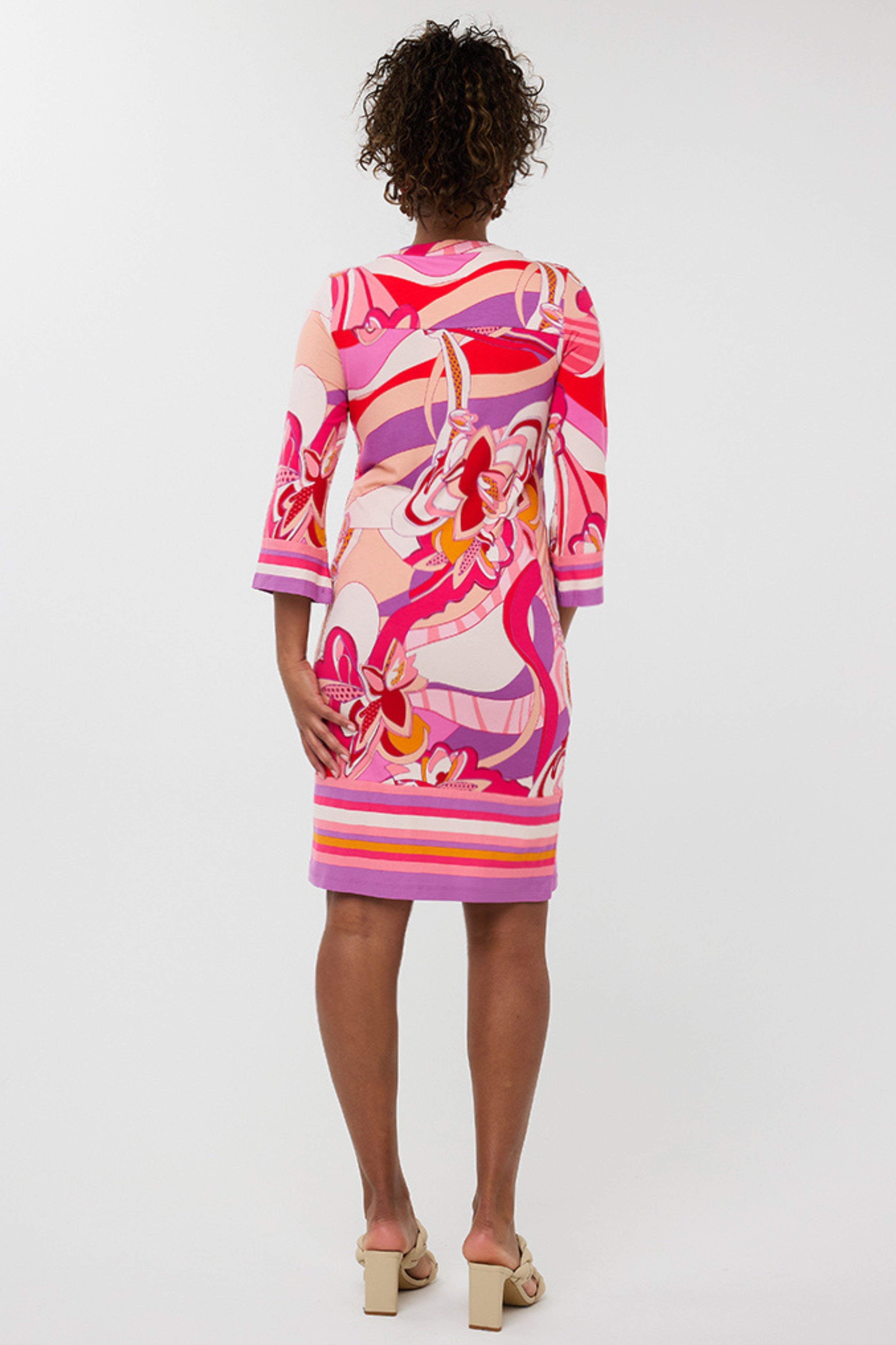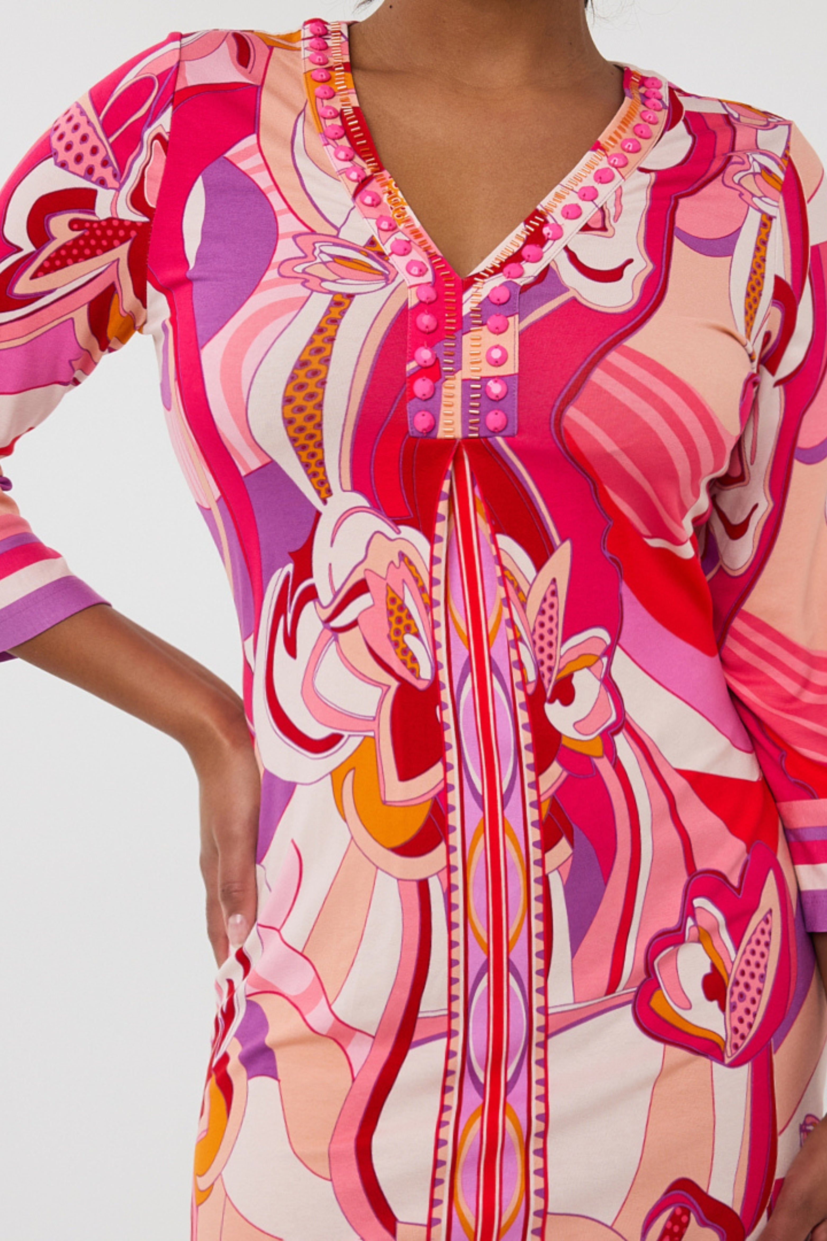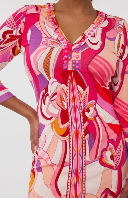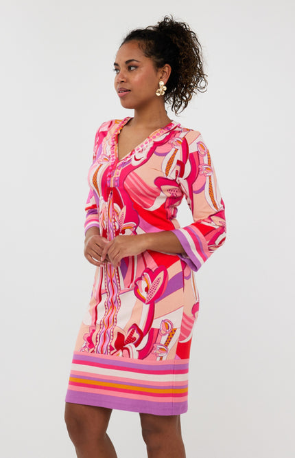 De Jurk Beads Disco Hit Print van Esqualo is een kleurrijke showstopper met een opvallende bloemenprint, kraaltjes langs de hals en driekwart mouwen. Vrolijk, vrouwelijk en ideaal voor zonnige dagen.