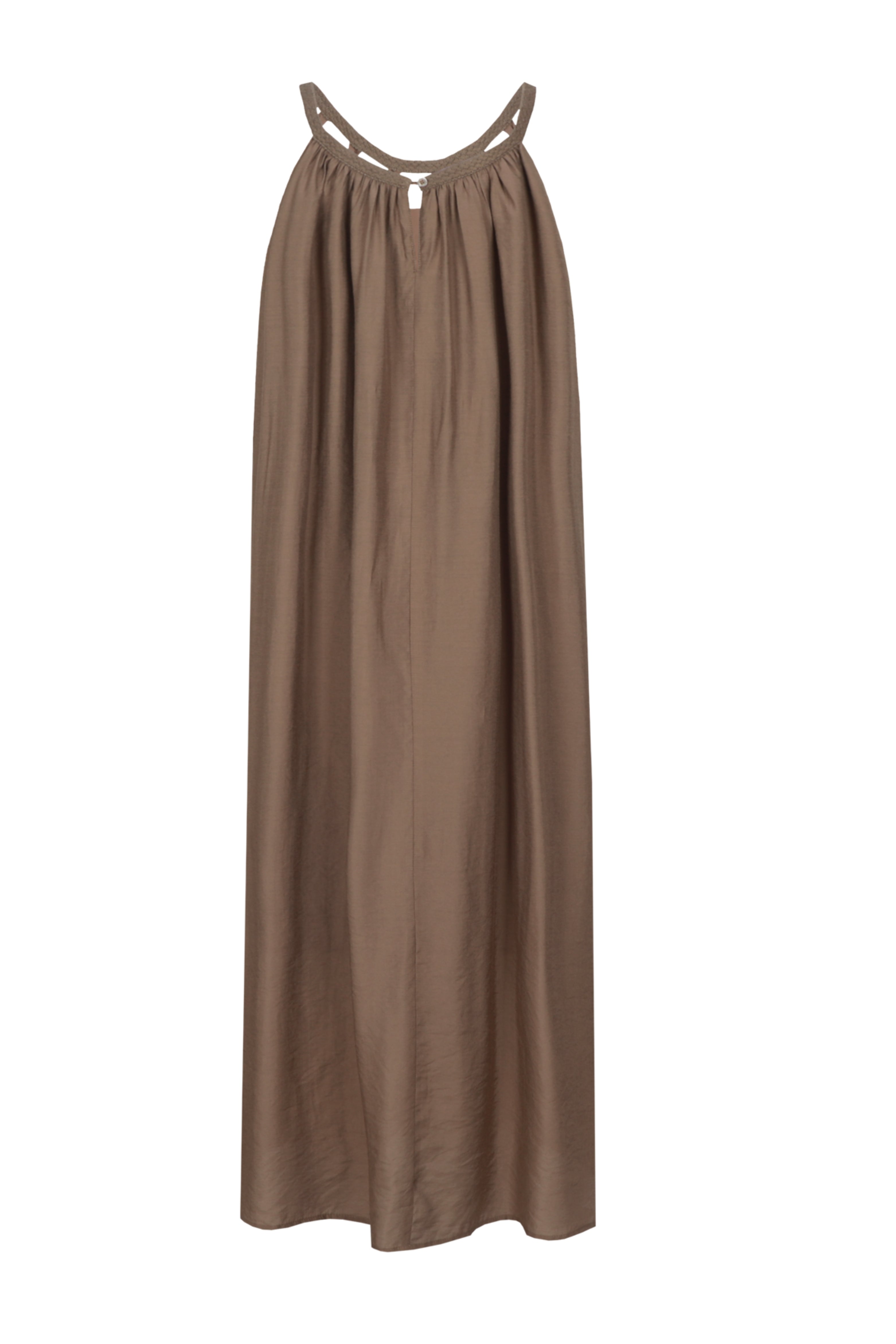 De Jurk Ilona Walnut is een elegante maxi jurk in een warme walnootbruine tint. De losse, soepelvallende pasvorm en verfijnde halsafwerking geven de jurk een vrouwelijke en stijlvolle uitstraling.