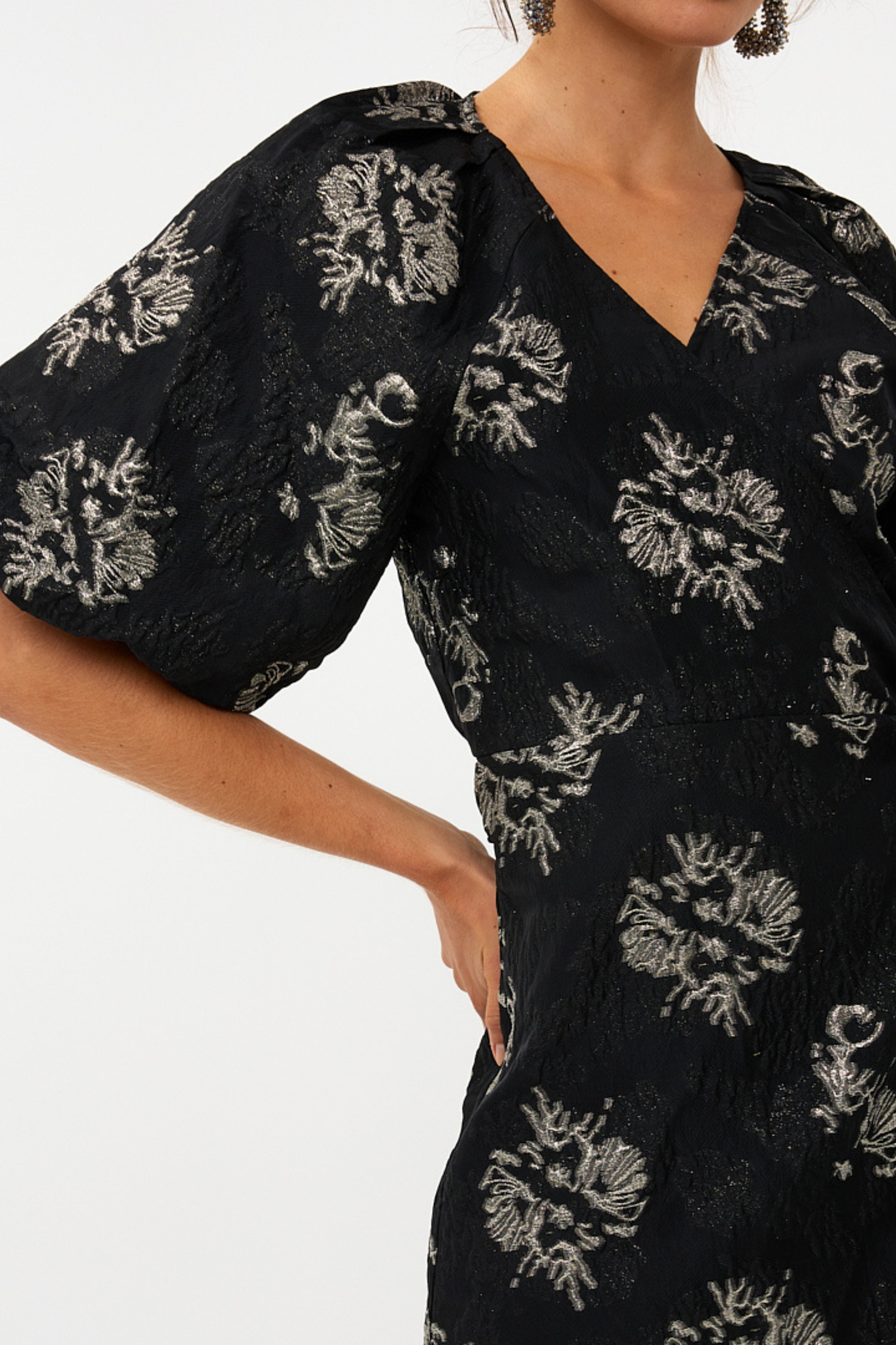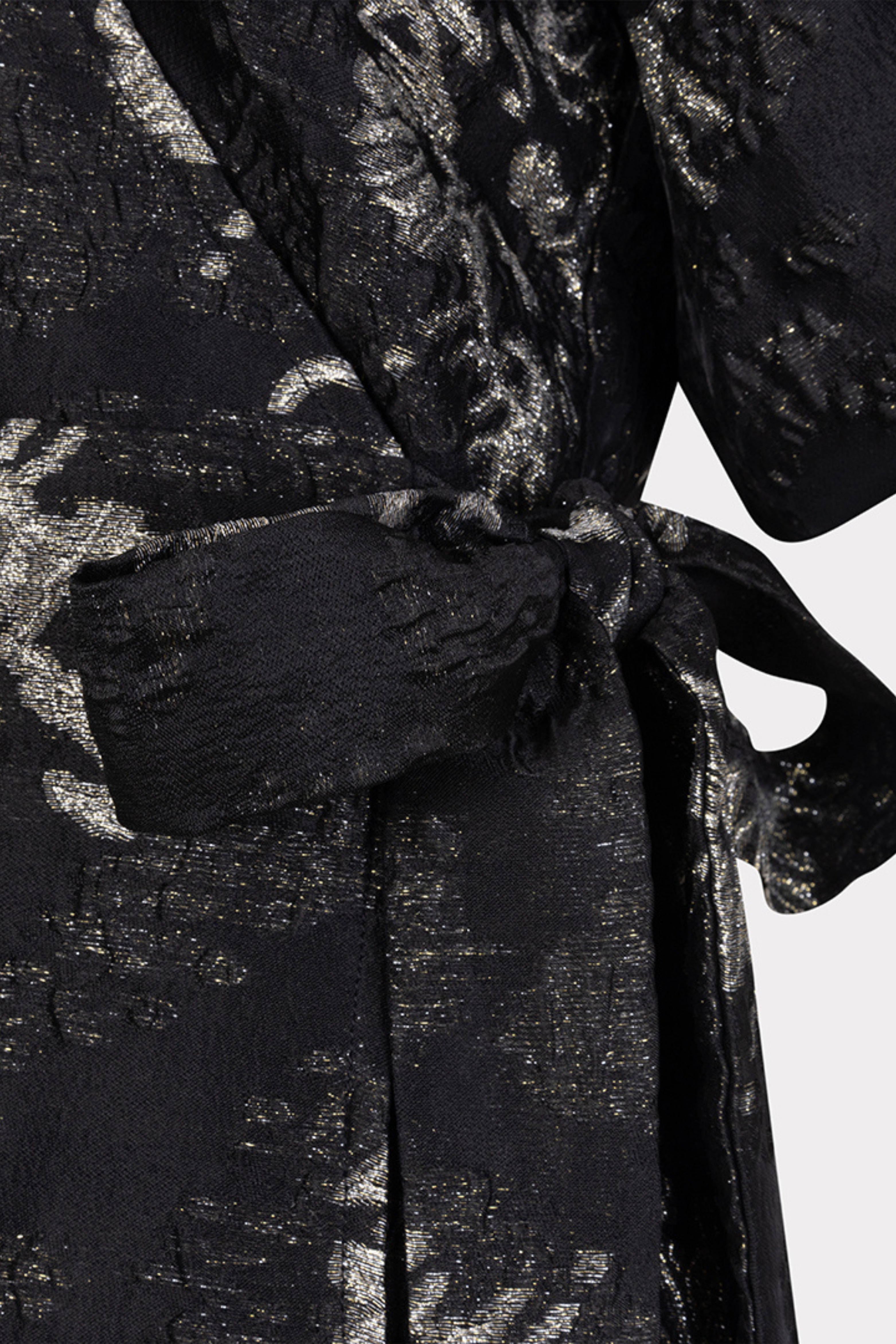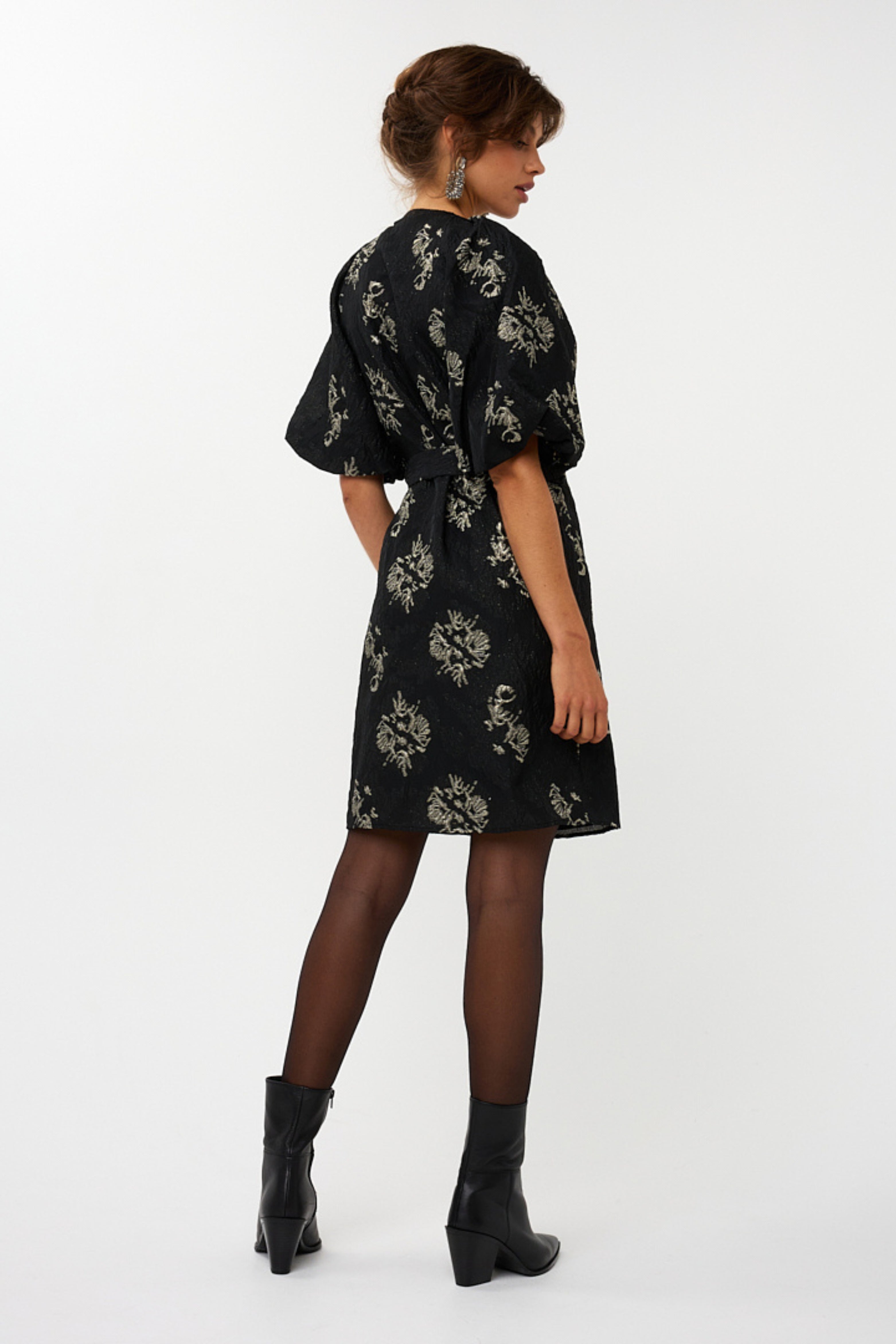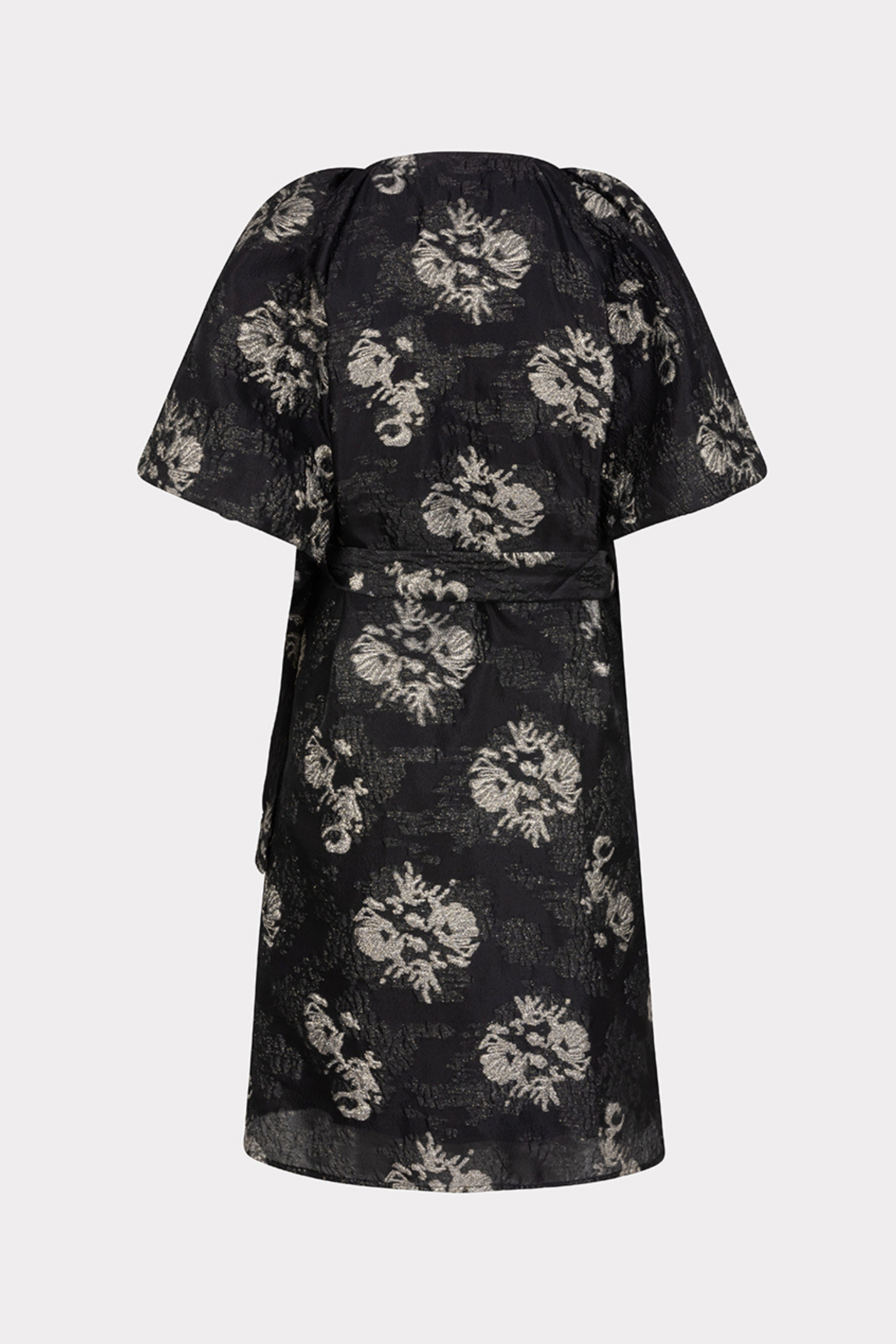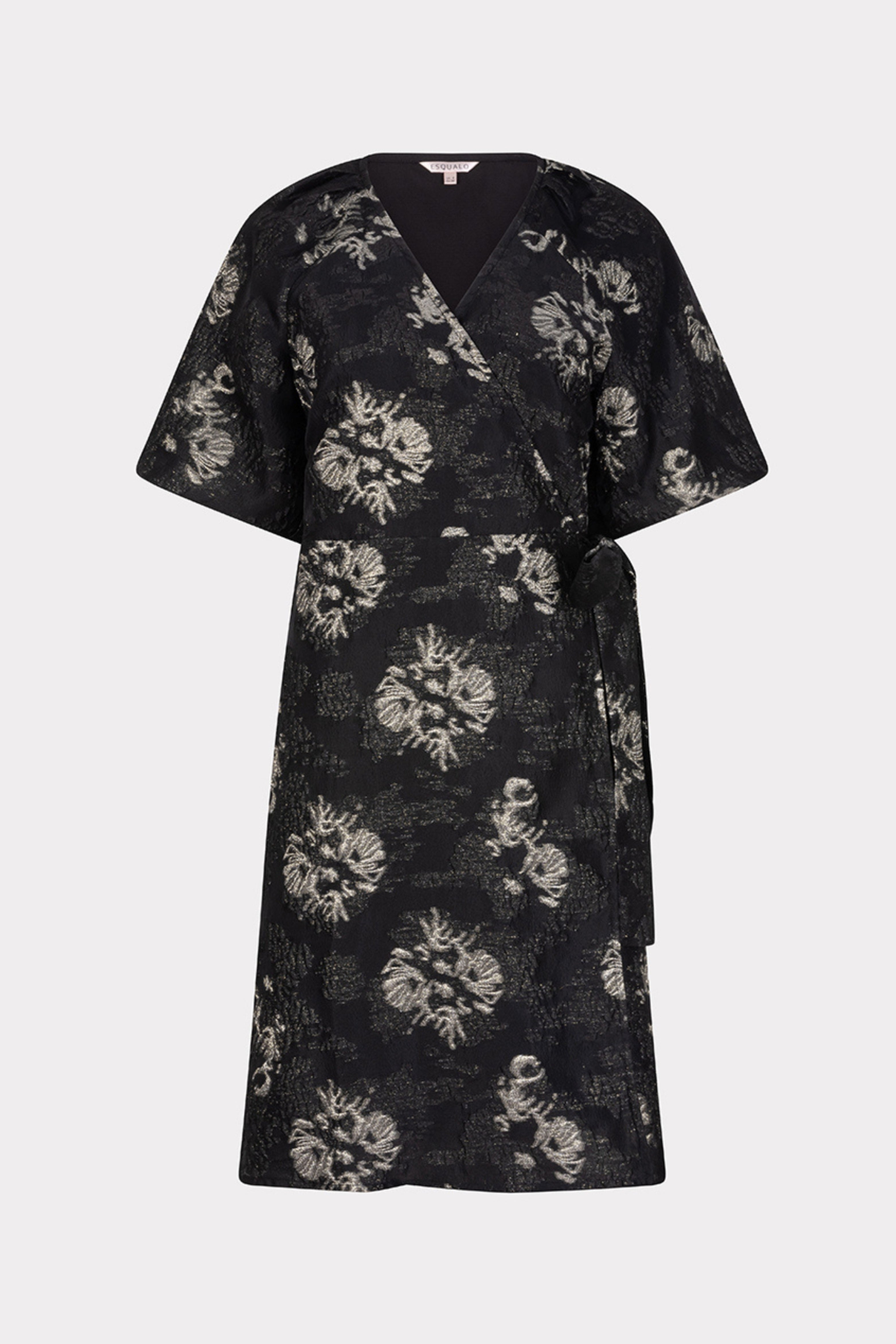 De Jurk Jacquard Black van Esqualo is een elegante wikkeljurk met een rijke jacquardstructuur. Het subtiele bloemmotief en de strikceintuur in de taille geven de jurk een stijlvolle en vrouwelijke uitstraling.