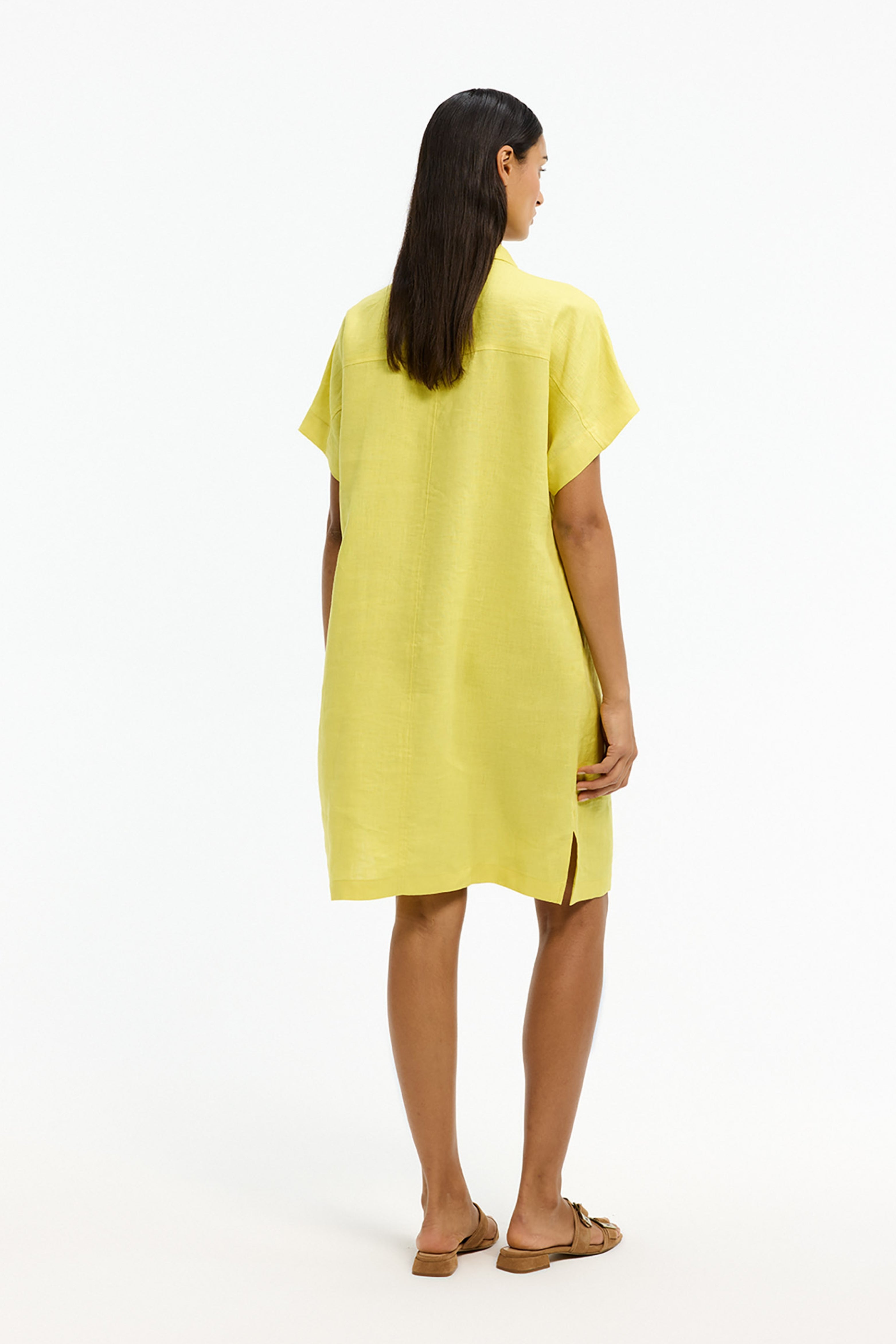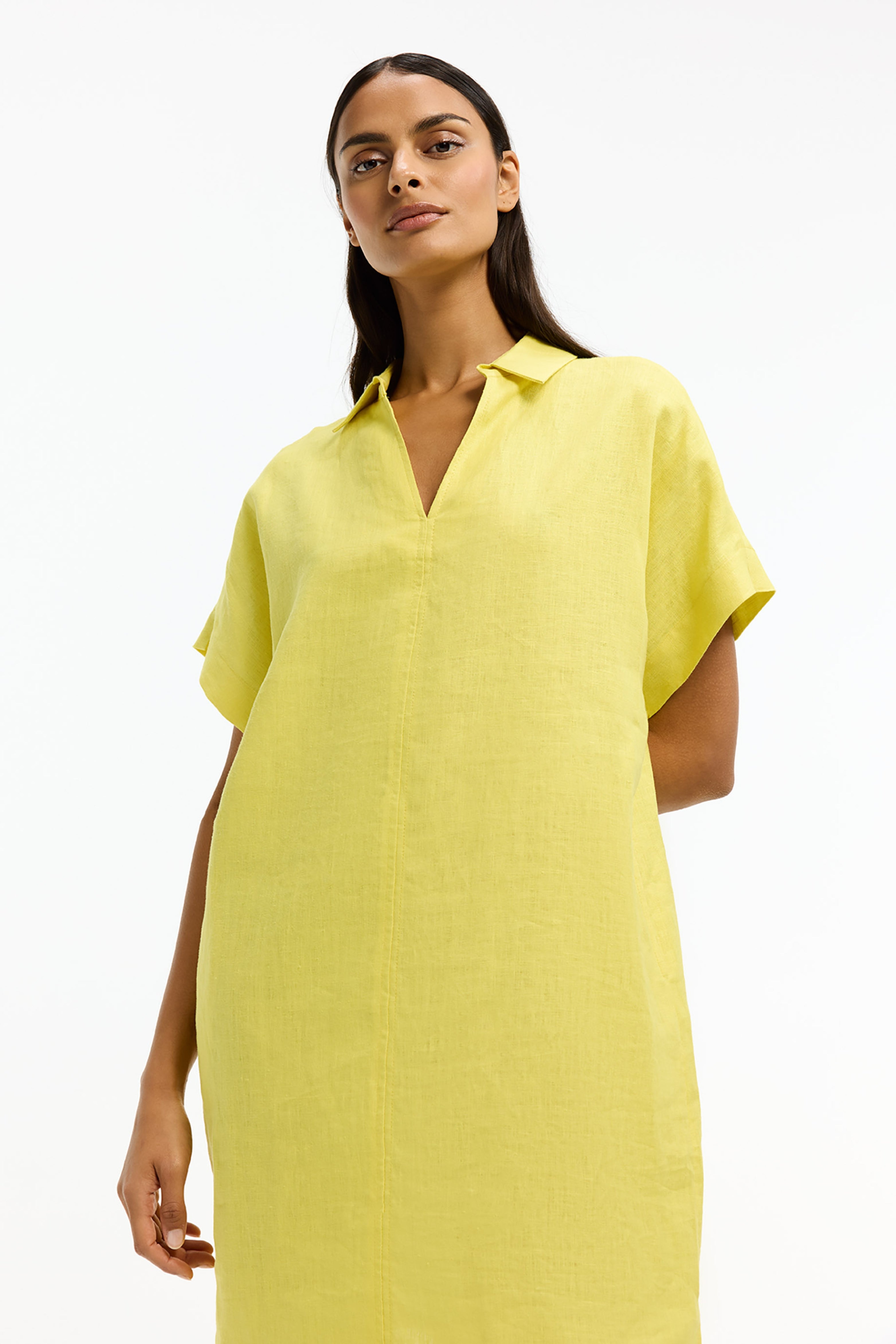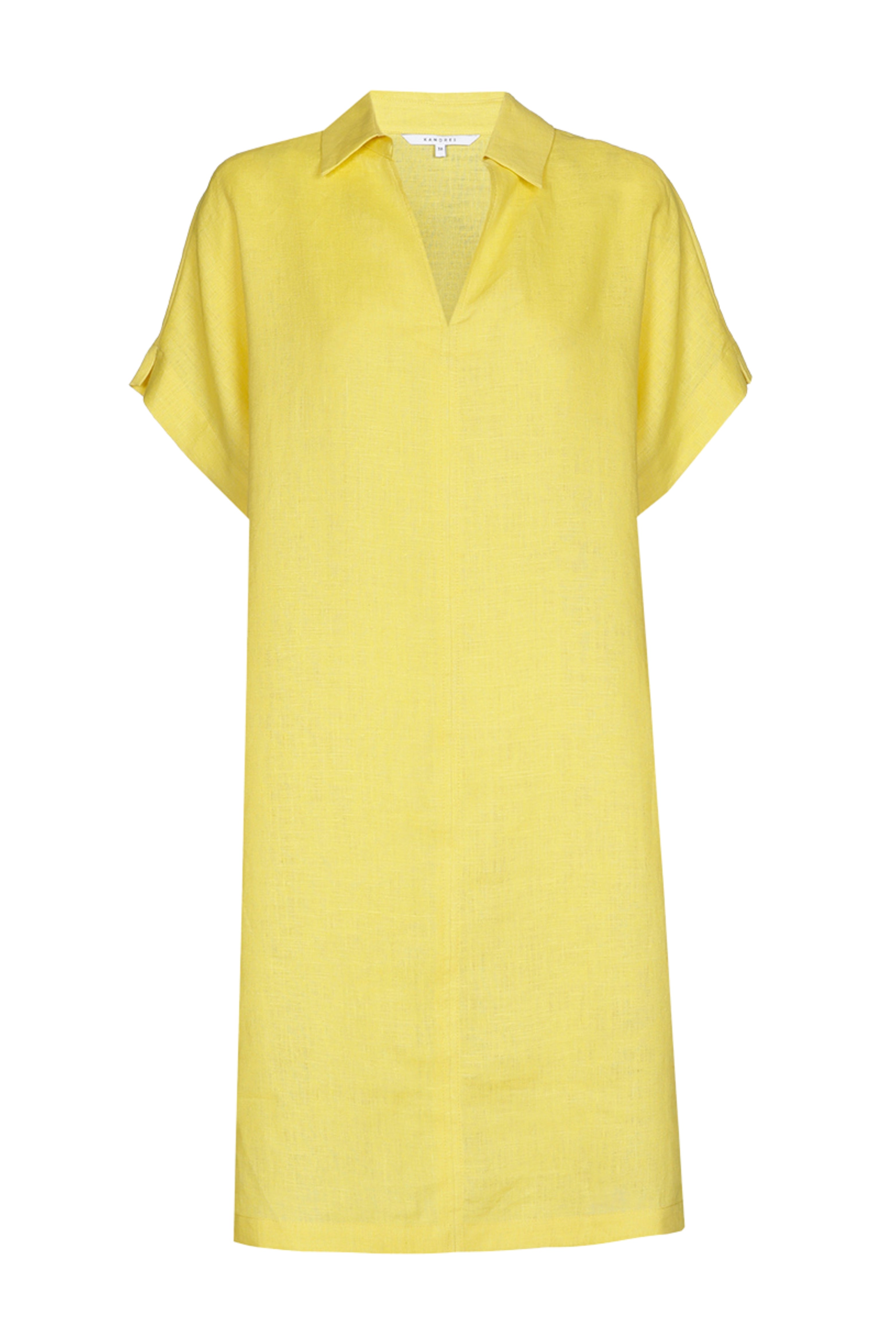 De Jurk Karian Fresh Citrus van Xandres is een luchtige jurk met V-hals en kleine kraag. Het rechte model in linnen-look met omgeslagen mouwtjes draagt heerlijk koel en valt soepel. Perfect voor zomerse dagen of vakantie.