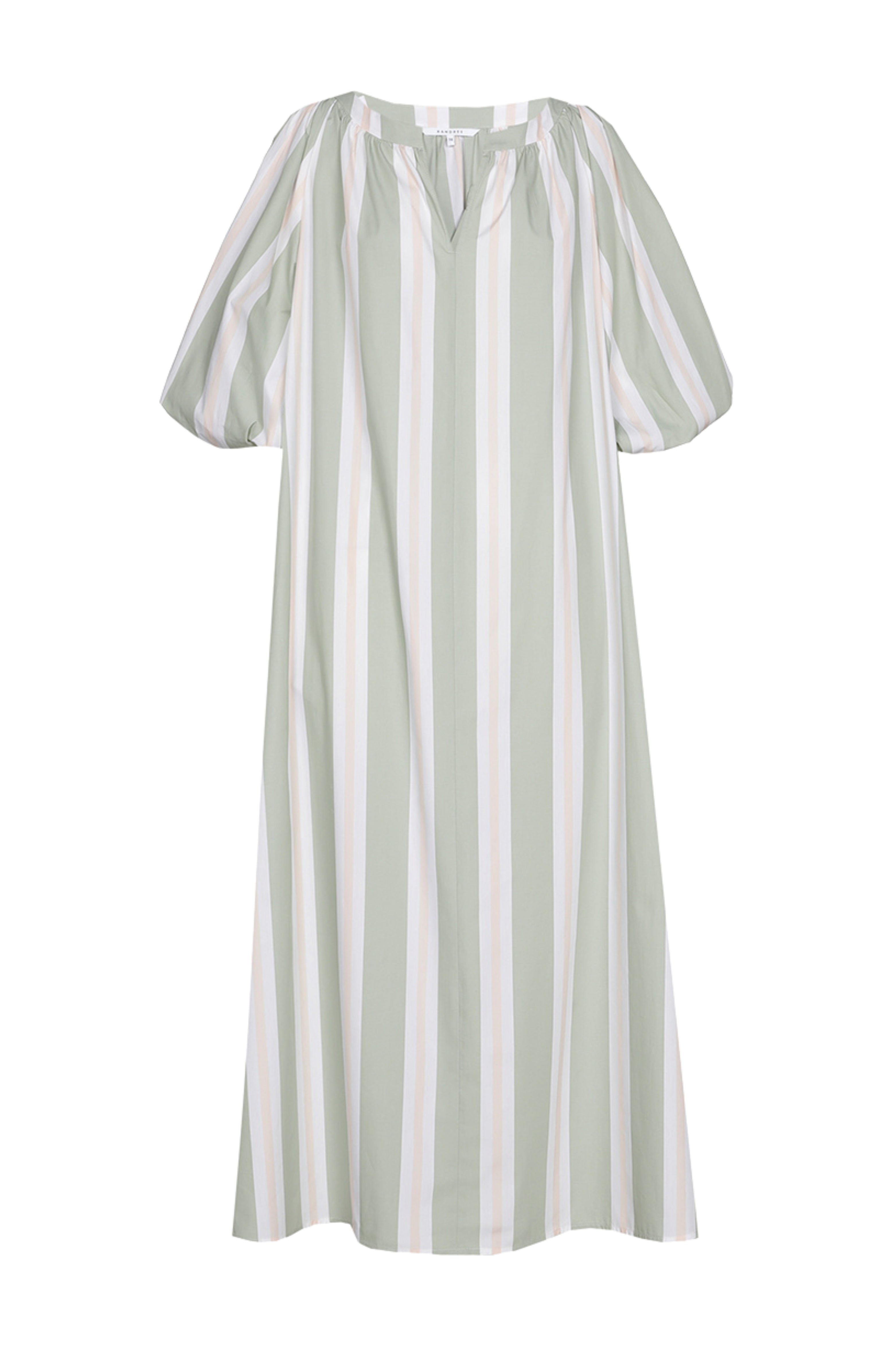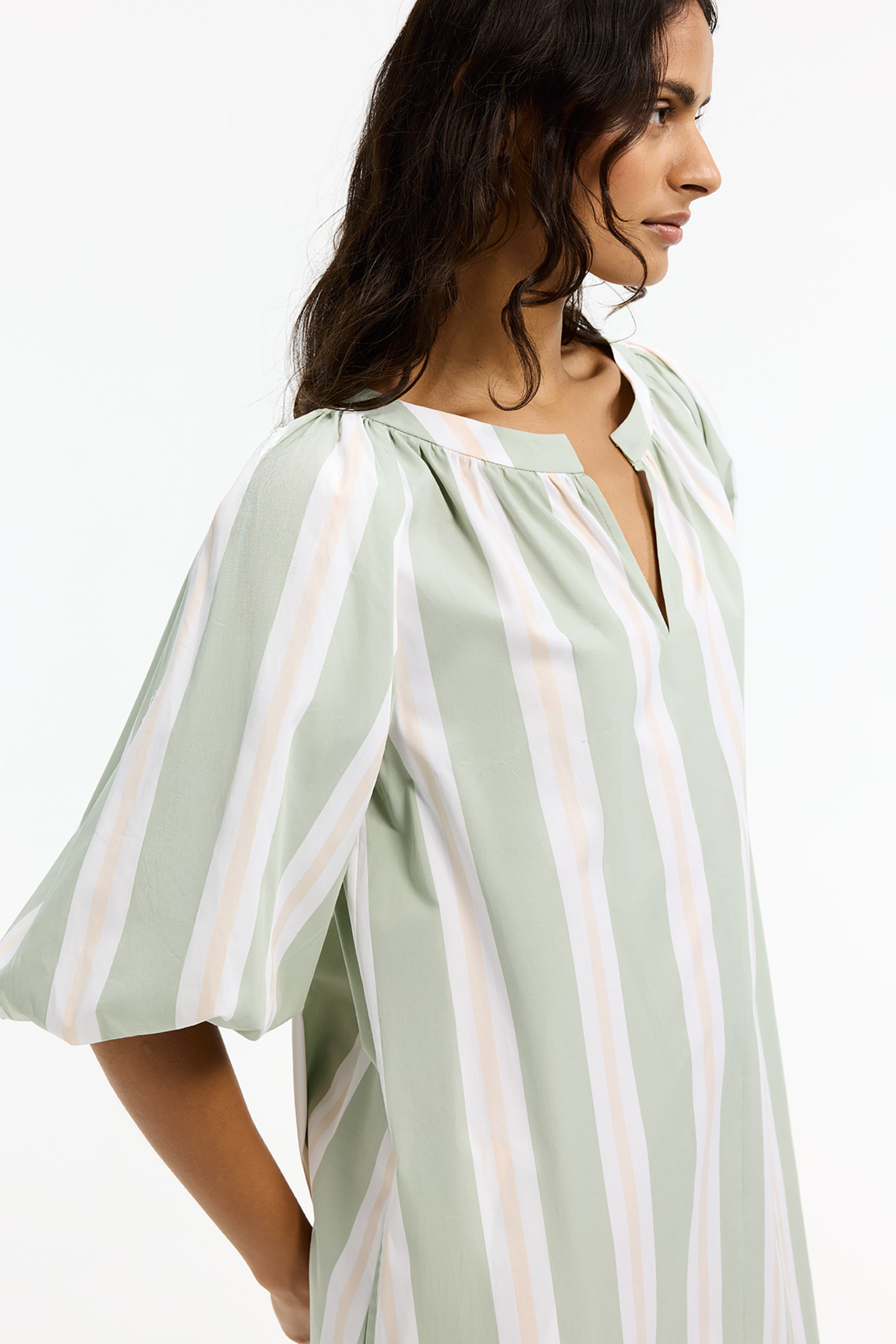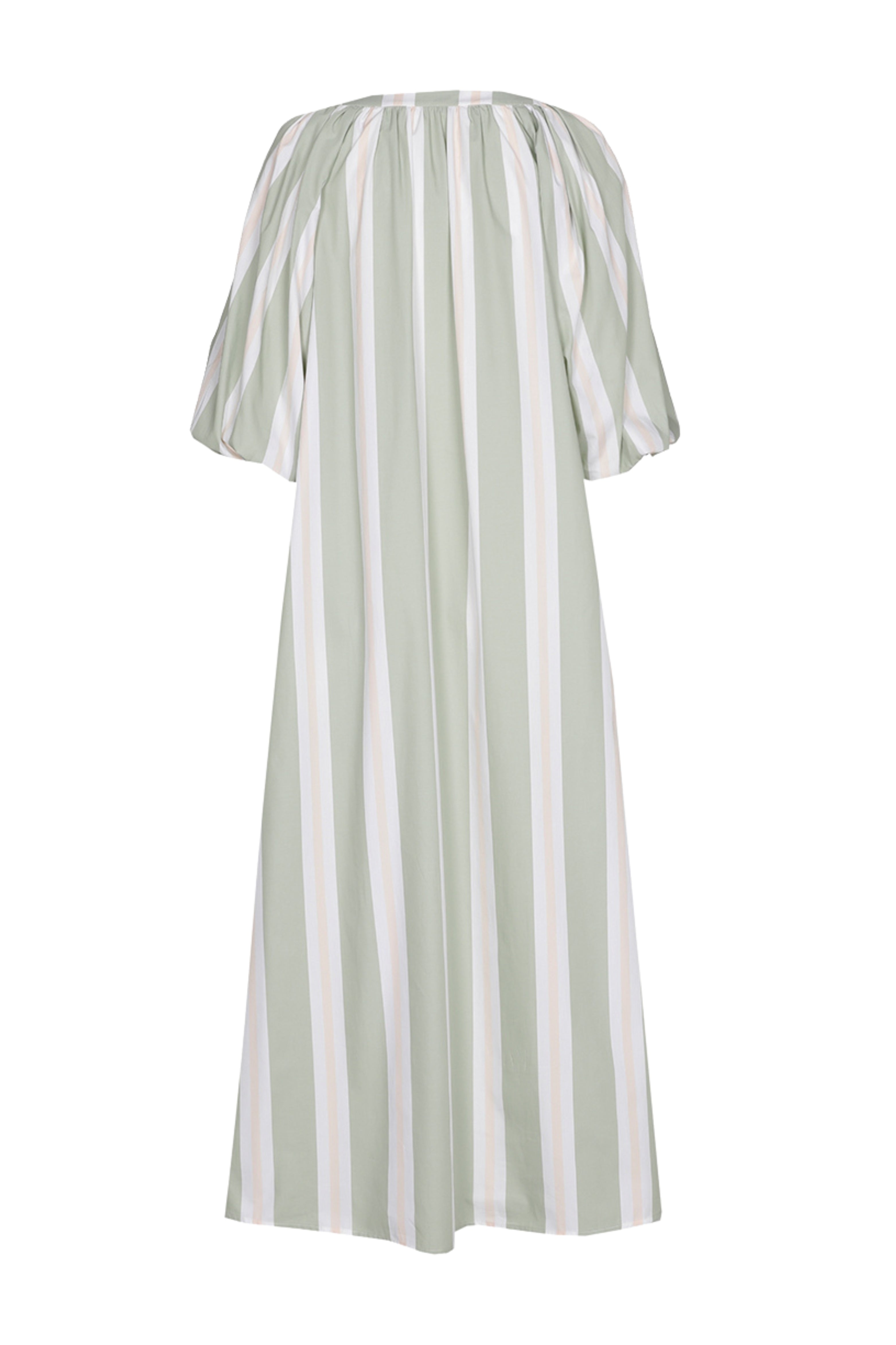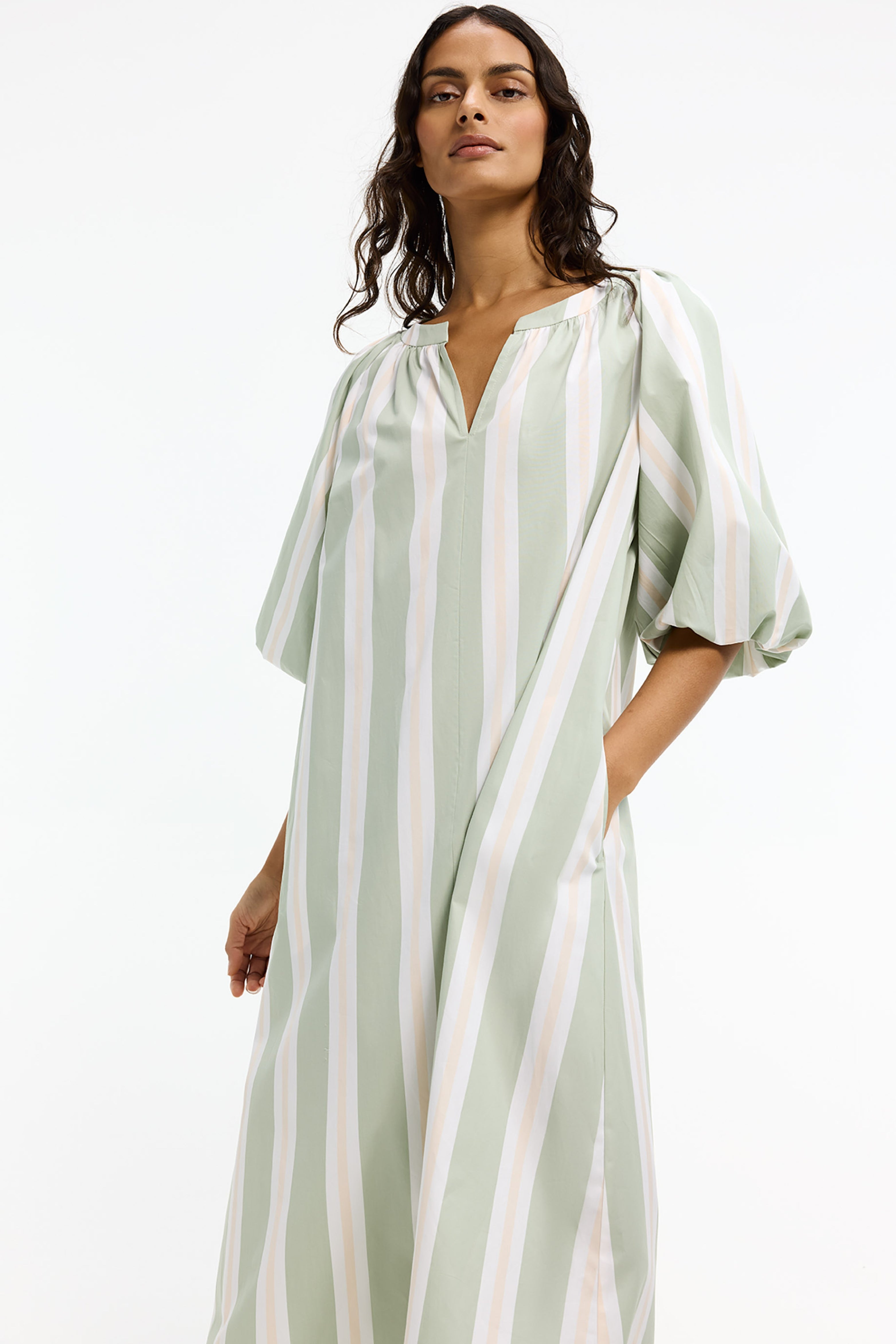 De Jurk Kyari Misty Aqua van Xandres is een luchtige, gestreepte jurk met V-hals. De wijde pofmouwen geven een comfortabele, vrouwelijke look. Perfect voor zomerse dagen en vakantie.
